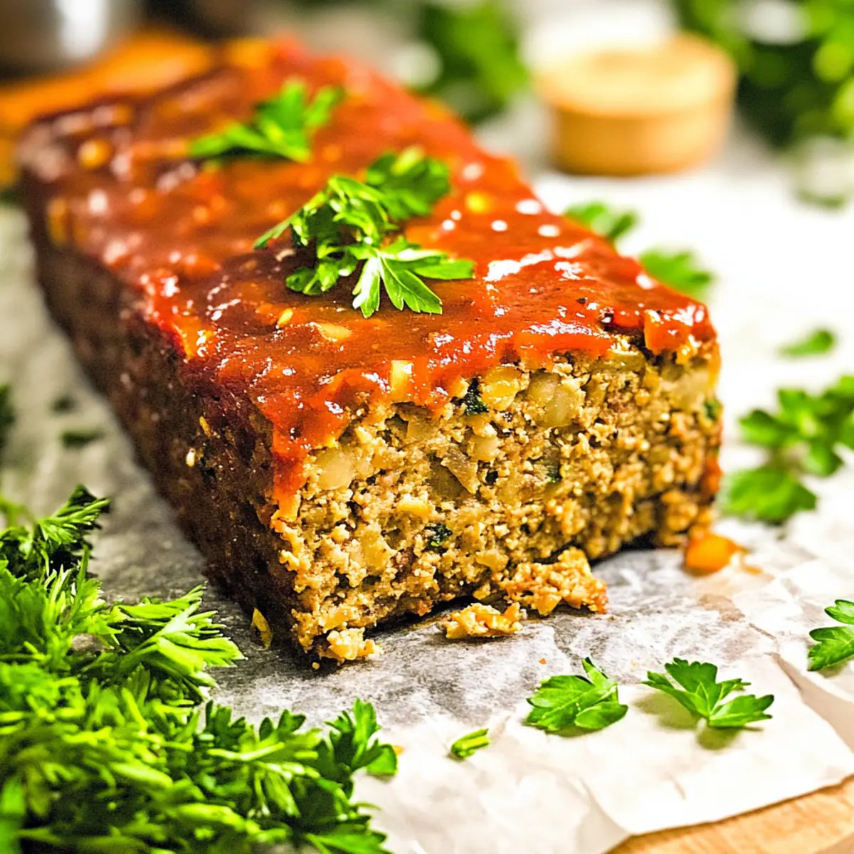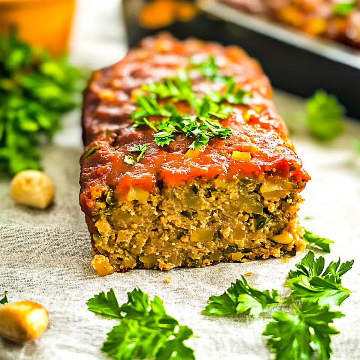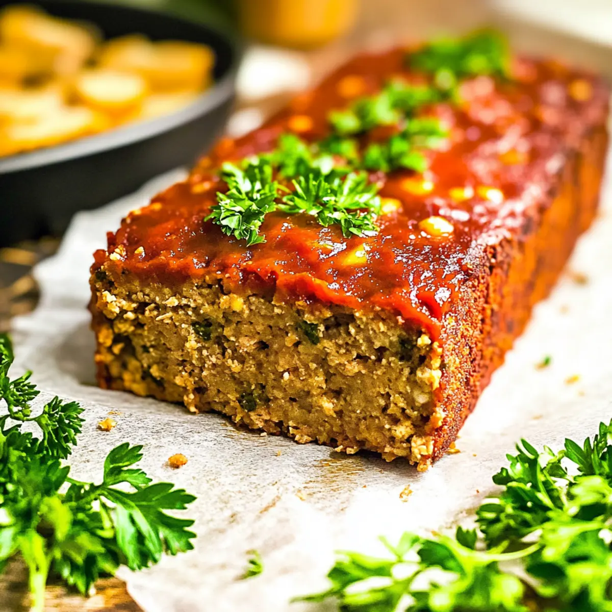 As I chopped through the colorful mix of peppers and carrots, the comforting aroma of my kitchen transported me back to family gatherings filled with laughter and warmth. This Hearty Vegetarian Meatloaf isn’t just a dish; it’s a celebration of flavors and textures that everyone will adore, whether they’re meat lovers or celebrating a plant-based lifestyle. A delightful option for a cozy weeknight meal or a centerpiece for your holiday feast, this gluten-free and vegan meatloaf is packed with wholesome ingredients that will leave you feeling satisfied and nourished. Plus, it’s surprisingly easy to prepare, making it a wonderful choice for busy home chefs looking to ditch fast food for something truly fulfilling. Are you ready to create a comforting classic that’s oh-so-good for you? Why is this meatloaf a must-try? Hearty, Satisfying Base: The use of lentils and oats creates a deliciously filling base that even meat lovers can’t resist. Nutritious and Wholesome: Packed with fiber and plant-based proteins, this vegan meatloaf is a guilt-free comfort food option. Simple Ingredients: With straightforward components, it’s a breeze to whip up at home. For more hearty dishes, check out our Hearty Olive Garden for a veggie-packed soup recipe! Flavorful Twist: Seasoned to perfection, the blend of herbs and spices elevates this dish, making it a standout on your dinner table. Versatile Serving Options: Pair with mashed potatoes or a fresh salad for a complete meal that appeals to all palates. Make-Ahead Marvel: Ideal for meal prep, leftovers are delicious too. Store them for up to five days or try slicing and freezing for a quick future meal! Hearty Vegetarian Meatloaf Ingredients For the Meatloaf • Dried Green Lentils – They serve as the hearty base for this meatloaf, providing essential protein and texture; feel free to substitute with brown lentils or canned lentils for ease. • Olive Oil – Adds rich moisture; for a different flavor, try using avocado oil or melted vegan butter instead. • Onions – Essential for sweetness and flavor; they’re a must-have in this recipe with no substitutes needed. • Red Bell Peppers – They bring vibrant color and sweetness; you can swap these with yellow or orange peppers for a different twist. • Green Bell Peppers – Provide a nice crunch, but you can opt for more red peppers if preferred. • Carrots – Their natural sweetness and nutrition are key; no substitutions necessary here! • Celery – Adds a refreshing crunch; if you’re not a fan, consider increasing the amount of carrots. • Garlic – Boosts the flavor profile wonderfully; use fresh garlic or garlic powder as per your preference. • Oats – Key for structure; ensure you use certified gluten-free oats if needed. • Oat Flour – Acts as a binding agent; grind oats in your blender to create your own flour if you don’t have any on hand. • Flaxseed Meal – This acts as an egg replacer (flax egg); non-vegans can substitute with a regular egg if desired. • Maple Syrup – Provides a hint of sweetness; feel free to swap it with agave nectar or honey for non-vegans. • Apple Cider – Adds moisture and flavor depth; you can replace this with apple juice if you like. • Ketchup – Contributes moisture and a mild tanginess; if you’re out of ketchup, use tomato sauce as an alternative. • Chipotle – Optional for a spicy kick; it can be omitted for a milder flavor if preferred. This hearty vegetarian meatloaf is the perfect blend of flavors and textures, making it a must-try meal that everyone can enjoy! Step‑by‑Step Instructions for Hearty Vegetarian Meatloaf Step 1: Rinse and Cook Lentils Begin by rinsing 1 cup of dried green lentils under cold water. In a medium pot, cover the lentils with water and bring to a boil over medium-high heat. Once boiling, reduce the heat to low and let them simmer for 15-20 minutes until tender but not mushy. Drain any excess water and reserve a bit of the cooking liquid for later use. Step 2: Sauté Vegetables In a large skillet, heat 2 tablespoons of olive oil over medium heat. Add minced garlic, chopped onions, diced red and green bell peppers, carrots, and celery. Sauté for about 8 minutes until the vegetables are tender and fragrant, stirring occasionally to prevent sticking. Set the skillet aside to cool slightly while preparing the rest of the mixture. Step 3: Prepare Flax Egg In a small bowl, combine 2 tablespoons of flaxseed meal with 5 tablespoons of water to create your flax egg, which acts as a binder. Stir the mixture well and let it sit for 7-10 minutes until it thickens and becomes gel-like. This step is crucial for ensuring your Hearty Vegetarian Meatloaf holds together perfectly. Step 4: Preheat Oven Preheat your oven to 380°F (193°C) and prepare a 9”x5” loaf pan by lining it with parchment paper. This will make it easier to remove the meatloaf after baking. While waiting for the oven, gather your cooked lentils, sautéed vegetables, oats, oat flour, and the flax egg to create a hearty mixture. Step 5: Combine Ingredients In a food processor, add the cooked lentils, sautéed vegetable mixture, 1 cup of oats, ½ cup of oat flour, and the prepared flax egg. Pulse the mixture until it achieves a texture similar to ground meat, ensuring it is well-combined but still slightly chunky. This will provide the perfect hearty texture for your meatloaf. Step 6: Adjust Consistency Check the consistency of your mixture; if it seems dry, gradually incorporate some of the reserved lentil cooking water, just enough for a moist but firm texture. Transfer the well-mixed batter into your lined loaf pan, pressing down firmly to eliminate gaps. This will ensure your Hearty Vegetarian Meatloaf maintains its shape during baking. Step 7: Create Topping Mixture In a blender, combine 2 tablespoons of maple syrup, ¼ cup of apple cider, ½ cup of ketchup, and optional chipotle for added spice. Blend until smooth. Pour this