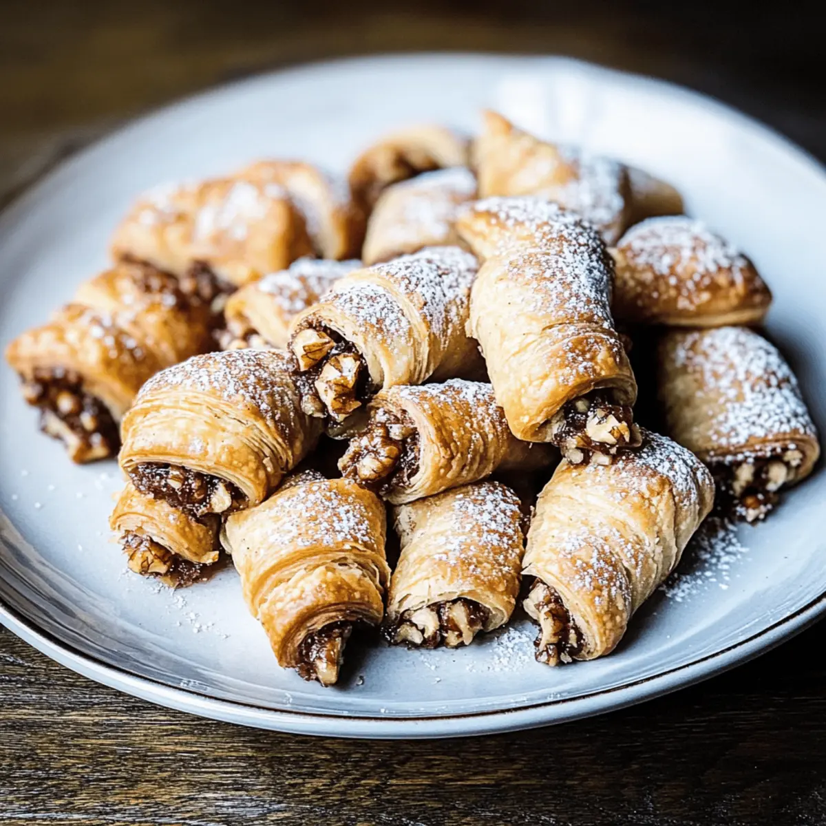 Delight in the cozy taste of Honey, Cinnamon and Walnut Rugelach, a warm pastry perfect for any occasion.