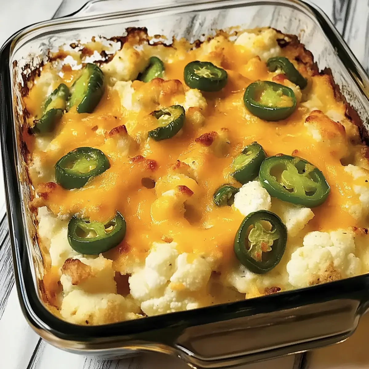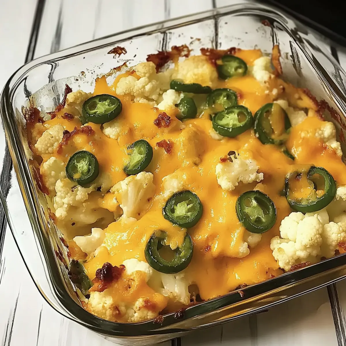 The aroma of cheesy goodness mixed with a spicy kick fills the kitchen, instantly making my mouth water. Today, I’m excited to share my recipe for Low-Carb Cheesy Jalapeno Popper Cauliflower Casserole—a delightful twist on a classic favorite! If you’re looking to lighten up your dinner routine without sacrificing flavor, this casserole is a game-changer. With its creamy texture and vibrant taste, you’ll enjoy all the indulgence of jalapeno poppers while adding nutritious cauliflower to your plate. Plus, it’s quick to whip up and perfect for meal prepping, making healthy eating a no-brainer for busy weeks. Are you ready to discover just how easy it is to create this satisfying dish? Let’s dive in! Why is this casserole a must-try? Flavor Explosion: The Jalapeno Popper ingredients bring together a perfect blend of heat and creaminess that makes every bite unforgettable. Nutrition Boost: This casserole packs in nutritious cauliflower, making it a guilt-free alternative to traditional dishes. Versatile Options: Feel free to switch up the veggies or cheeses; broccoli or pepper jack can add your personal touch! Quick and Easy: With a straightforward process, you can have this dish ready in just 30 minutes, saving you precious time during busy weeknights. Crowd Pleaser: Perfect for a family dinner or potluck, it’s sure to impress anyone craving something delicious and comforting. Check out the Savory Turkey Casserole for another crowd-pleasing dish! Jalapeno Popper Cauliflower Casserole Ingredients For the Casserole • Cauliflower – a nutritious base that adds volume and fiber; select heavy heads with tight florets for the best texture. • Cream Cheese – creates that irresistible creaminess; Greek yogurt can be used for a lighter alternative. • Salt – enhances the overall flavor; season to your personal taste. • Pepper – adds a bit of warmth; always use freshly cracked for the best flavor. • Jalapeños – delivers the spicy punch; keep the seeds for extra heat or remove them for a milder dish. • Bacon (crumbled) – infuses rich flavor; you can choose turkey bacon or omit it entirely for a vegetarian variation. • Cheddar Cheese (shredded) – offers a melty topping for that gooey goodness; mozzarella can be swapped in for a different flavor profile. Optional Seasoning • Paprika – a hint of smokiness that complements the flavors beautifully; try smoked paprika for an extra layer of taste. For Topping • Chopped Green Onions – for fresh color and a little crunch; sprinkle on right before serving for brightness. This Jalapeno Popper Cauliflower Casserole is bursting with flavor, ensuring healthy meals are never boring! Step‑by‑Step Instructions for Jalapeno Popper Cauliflower Casserole Step 1: Preheat the Oven Begin by preheating your oven to 400°F (205°C). This initial temperature will help achieve that perfect roast on the cauliflower, laying the foundation for the delicious flavors of the Jalapeno Popper Cauliflower Casserole. Set a timer for 10 minutes to ensure the oven is fully heated before you move on to prepping the cauliflower. Step 2: Roast the Cauliflower Spread the cauliflower florets evenly over a baking sheet, ensuring they have space to roast properly. Place the baking sheet in the preheated oven and roast the cauliflower for about 15 minutes. You’ll know it’s ready when the florets are just tender and slightly caramelized at the edges, enhancing their natural sweetness. Step 3: Lower the Temperature After removing the roasted cauliflower from the oven, reduce the oven temperature to 375°F (190°C). This lower temp ensures the casserole will bake gently, allowing all the flavors to meld beautifully without burning the cheese topping. For best results, you can prepare your next steps while the oven adjusts to the new temperature. Step 4: Mix the Ingredients In a large mixing bowl, combine the roasted cauliflower with cream cheese, a pinch of salt, and freshly cracked pepper. Use a spatula to mix thoroughly, ensuring that each piece is coated in that creamy goodness. This step is crucial for achieving the rich, indulgent texture that’s characteristic of the Jalapeno Popper Cauliflower Casserole. Step 5: Transfer to Baking Dish Carefully transfer the cauliflower mixture into a greased baking dish, spreading it out evenly. Make sure not to overcrowd it, which helps prevent steam buildup and ensures even cooking. The comforting aroma will take over your kitchen as you prepare for the next layer of this delicious casserole. Step 6: Add Jalapeños and Bacon Top the cauliflower mixture with your chopped jalapeños and crumbled bacon. Distribute them evenly so that every bite is packed with flavor. For those who like a milder dish, consider adjusting the amount of jalapeños or removing the seeds. This step adds that characteristic spicy kick to the casserole! Step 7: Top with Cheese Generously sprinkle shredded cheddar cheese over the top of your casserole, covering all the ingredients. This will create a beautifully melty layer once baked. Aim for a nice, even coating to ensure every bite of the Jalapeno Popper Cauliflower Casserole is indulgent and cheesy. Step 8: Bake Until Bubbling Place the baking dish back into the oven and bake for an additional 15 minutes. Keep an eye on the casserole—the cheese should be bubbly and melted, but not overly browned. This visual cue indicates it’s ready to come out, giving you that dreamy, cheesy finish you desire. Step 9: Rest Before Serving Once baked to perfection, allow your Jalapeno Popper Cauliflower Casserole to rest for 5-10 minutes. This resting period lets the flavors settle and the cheese set, making it much easier to serve. As the aromas waft through your kitchen, you’re just a few moments away from enjoying this delightful dish! Expert Tips for Jalapeno Popper Cauliflower Casserole Dry Cauliflower: Ensure that the cauliflower is completely dry after washing to prevent a watery c