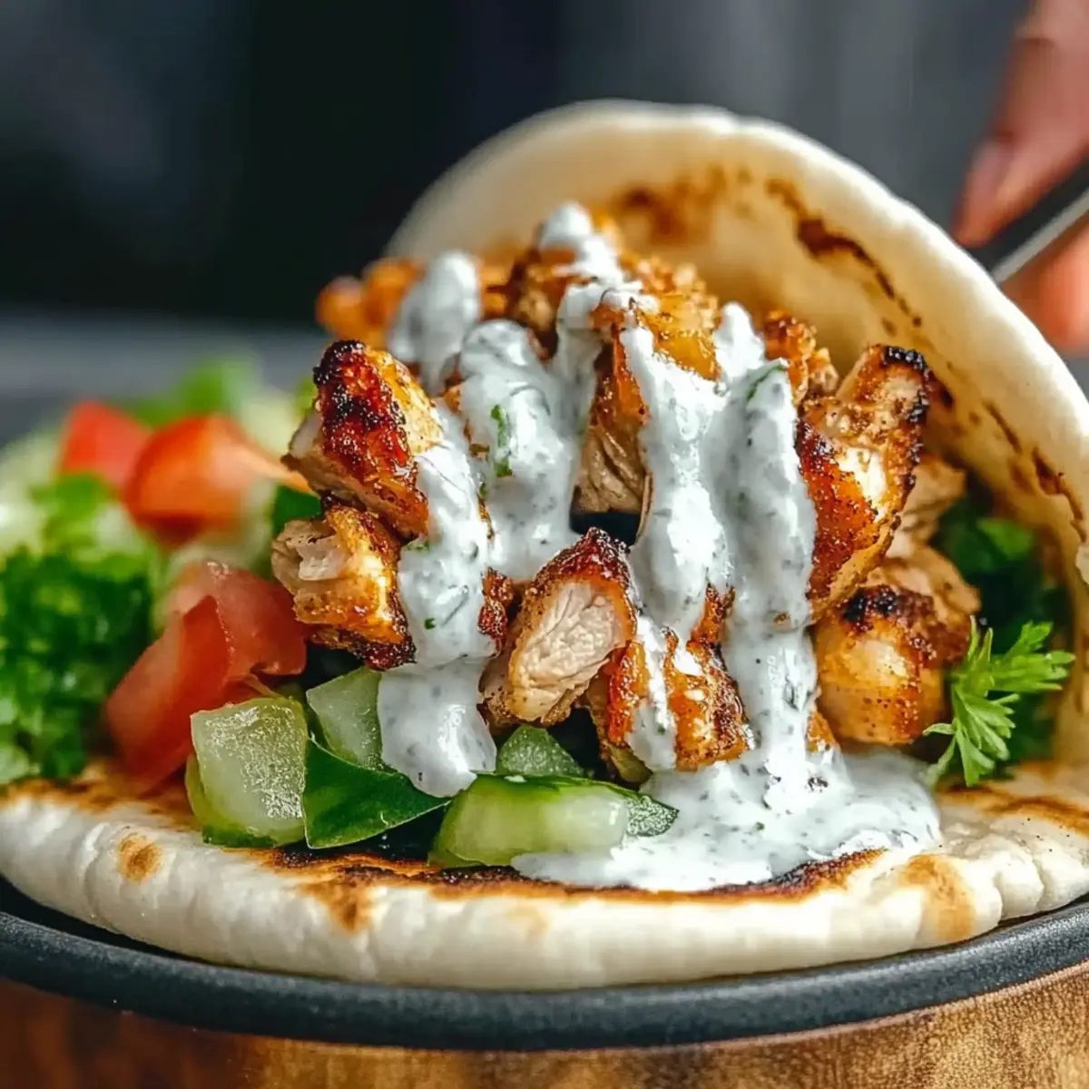 6. Once cooked, let the chicken rest for about 5 minutes, then slice and serve with garlic sauce and fresh veggies in pita bread.