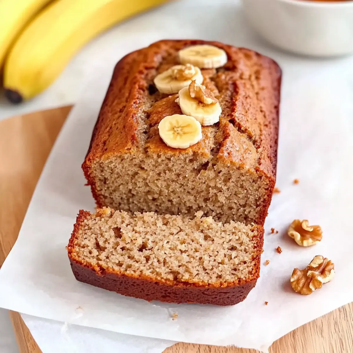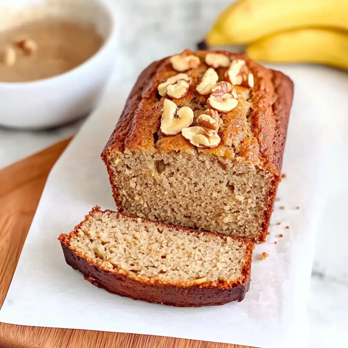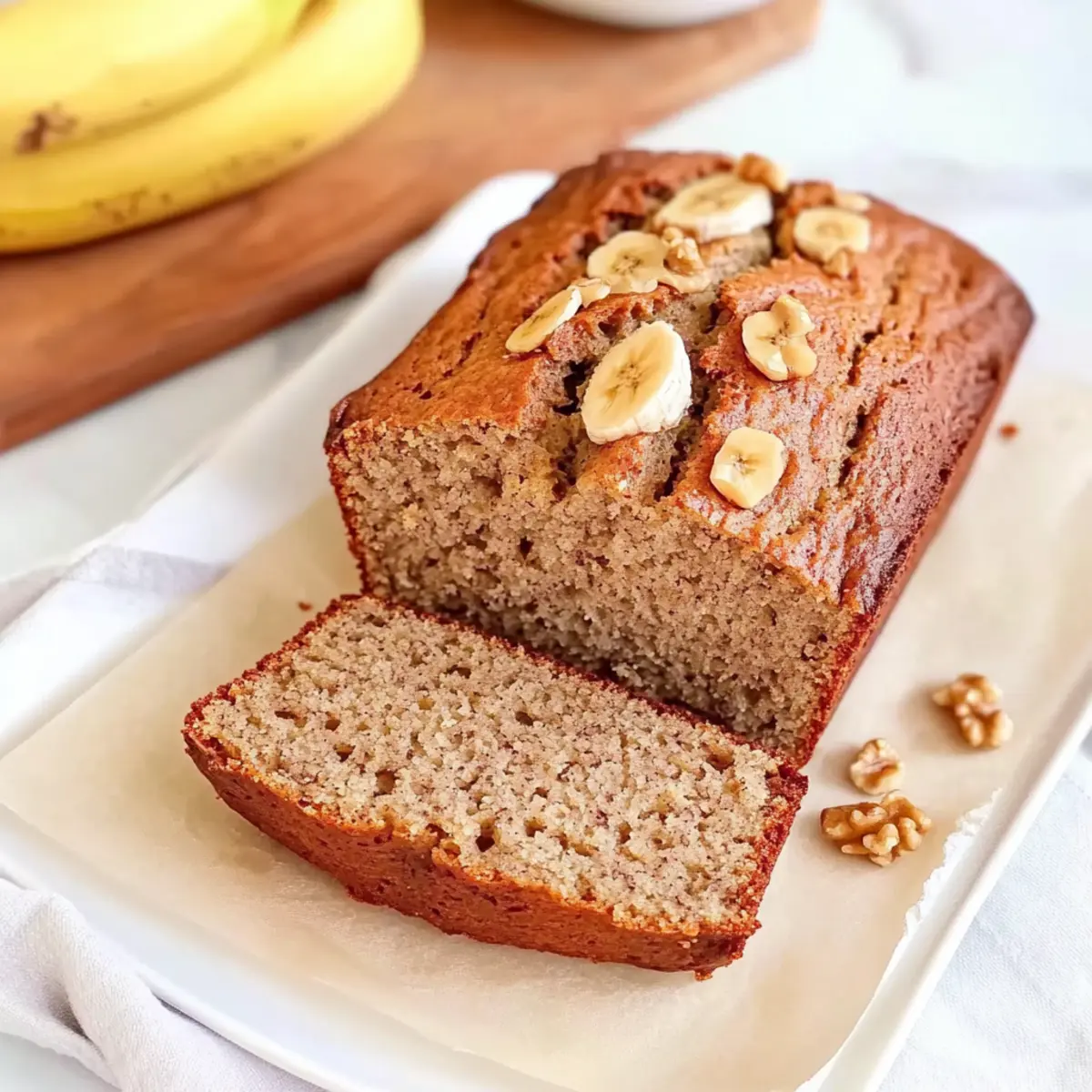 The moment the oven door swings open, a warm hug of nostalgia fills the kitchen. I can still envision the golden, fluffy Keto Banana Bread rising, a delightful sight that brings comfort with every bite. This low-carb delight is crafted with ripe bananas and almond flour, making it a guilt-free treat for breakfast or an afternoon snack. Not only does this recipe come together in no time, but it also provides a healthier twist on a classic favorite, ensuring that you can indulge without the carbs weighing you down. Imagine treating yourself to a slice that is both moist and flavorful, perfect for pairing with your favorite nut butter or cream cheese. Are you curious about creating your own guilt-free version of this beloved banana bread? Let’s dive into the recipe! Why is Keto Banana Bread so special? Irresistible Flavor: This Fluffy Keto Banana Bread manages to capture the sweet essence of traditional banana bread while being low-carb and gluten-free. Simple Ingredients: With just ripe bananas, almond flour, and basic pantry staples, it’s a fuss-free baking experience—especially great for busy weeknights. Versatile Options: Whether you prefer walnuts or chocolate chips, feel free to customize it to your taste. For extra satisfaction, pair it with Greek yogurt or try it for brunch alongside eggs! Guilt-Free Indulgence: Enjoy the pleasure of bread without the carbs weighing you down, making it a unique treat you can enjoy any time of day. Time-Saving Recipe: In under an hour, you can whip up this delightful loaf, making it a perfect go-to for unexpected guests. Check out the easy Banana Pudding Rice for another quick and delicious option! Keto Banana Bread Ingredients • For that delightful fluffiness, you’ll want the best ingredients. For the Batter Ripe Bananas – The star of your Keto Banana Bread, ensure they are very ripe and brown-spotted for maximum sweetness. Eggs – Critical for structure and moisture; room temperature eggs work best for a smooth blend. Melted Butter – This adds richness to your bread; alternatively, coconut oil can be used for a dairy-free option. Almond Flour – The primary low-carb flour substitute that brings a wonderful nutty flavor to your bread. Erythritol (or Sweetener) – A fantastic low-carb sweetener that won’t spike your sugar; adjust amount to preference. Cinnamon – Adds warmth and spice; feel free to adjust according to your taste. Baking Powder – Helps your bread rise; check for freshness to avoid dense results. Crushed Walnuts – Optional but adds a delightful texture; you can swap for pecans or omit altogether if you prefer. Step‑by‑Step Instructions for Keto Banana Bread Step 1: Preheat the Oven Begin by preheating your oven to 180°C (356°F). This ensures a perfectly baked Keto Banana Bread with that delightful rise. While the oven warms up, gather your ingredients and equipment, including a loaf tin lined with parchment paper. Get ready for those irresistible banana bread aromas to fill your kitchen! Step 2: Combine Wet Ingredients In a large mixing bowl, beat together 3 ripe, mashed bananas, 2 room-temperature eggs, and 1/3 cup of melted butter. Whisk these ingredients until they form a smooth blend, about 1-2 minutes. Make sure there are no lumps; this step is crucial for achieving the fluffy texture of your Keto Banana Bread. Step 3: Mix Dry Ingredients In a separate bowl, combine 1 ½ cups of almond flour, 1/2 cup of erythritol, 1 teaspoon of ground cinnamon, and 1 teaspoon of baking powder. Stir these dry ingredients together until evenly mixed, roughly 1 minute. This ensures that your bread rises beautifully and has a well-balanced flavor, essential for a delicious keto treat. Step 4: Combine Wet and Dry Mixtures Gradually pour the dry mixture into the wet ingredients while mixing gently. Use a spatula to fold them together until just combined, taking care not to overmix. You’ll notice the texture becoming thick but smooth—this is your cue that the batter is ready. Step 5: Add Texture with Walnuts Fold in 1/2 cup of crushed walnuts for added crunch and nutty flavor, reserving a few to sprinkle on top later. This step brings extra depth to your Keto Banana Bread. Ensure the walnuts are evenly distributed throughout the batter for delightful bites in every slice. Step 6: Prepare the Loaf Tin Pour the batter into the prepared loaf tin, smoothing the top with a spatula. Sprinkle the reserved crushed walnuts on top for a lovely presentation. This simple step adds a finishing touch that makes your Keto Banana Bread not only tasty but visually appealing too. Step 7: Bake to Perfection Place the loaf tin in your preheated oven and bake for about 40 minutes. Check for doneness at the 30-minute mark; if the top is browning too quickly, cover it loosely with foil. Your house will soon be filled with a warm aroma as the Keto Banana Bread bakes perfectly! Step 8: Check for Doneness After 40 minutes, insert a toothpick into the center of the bread. It should come out clean or with a few crumbs, indicating it’s done. If you notice wet batter, give it a few extra minutes of baking. This final check ensures a perfectly baked Keto Banana Bread that’s fluffy and inviting. Step 9: Cool Before Slicing Let the bread cool in the tin for at least 30 minutes before transferring it to a wire rack. Cooling it completely in the pan helps maintain its structure. Once cooled, slice your Keto Banana Bread and enjoy the delicious, moist texture that awaits! Storage Tips for Keto Banana Bread Room Temperature: Store wrapped in plastic or in an airtight container for up to 3 days. This keeps the Keto Banana Bread fresh while preserving its delightful moisture. Fridge: Keeps well in an airtight container for up to a week. Refrigeration enhances the flavors while maintaining the fluffy texture—perfect for a week’s worth of guilt-free snacks! Freezer: Slice and wrap portions in plastic, then store in a freezer bag for up to 3 months. Tha
