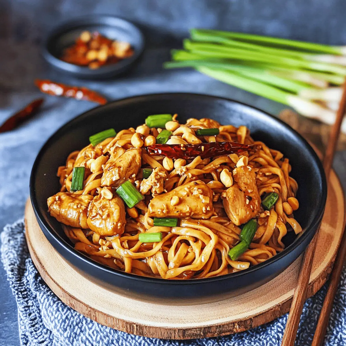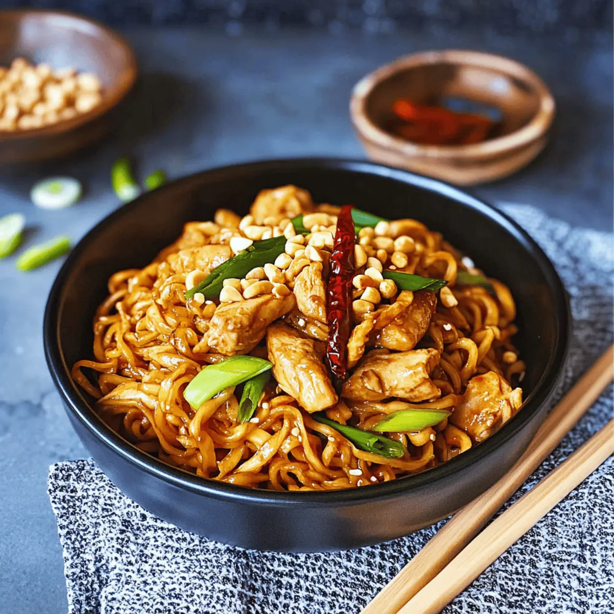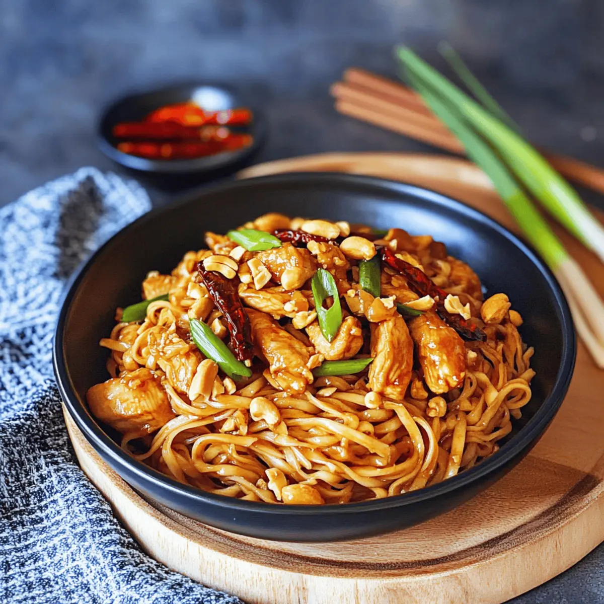 While hunting for a quick yet exciting weeknight dinner, I stumbled upon the vibrant world of Kung Pao Chicken Noodles, and let me tell you—this dish is a game changer. With its tender chicken, chewy noodles, and crunchy peanuts, it’s a feast for the senses that’s made in just 30 minutes. The blend of spicy and savory flavors, thanks to a kick from Sichuan peppercorns and a hint of sweetness, makes these noodles anything but ordinary. Plus, you can easily customize it by swapping out the chicken for shrimp or tofu, catering to any taste preference. If you’re looking to elevate your dinner routine, you’ll want to stick around and learn how to whip up this irresistible meal! What unique twist will you add to your Kung Pao adventure? Why is Kung Pao Chicken Noodles a Must-Try? Quick & Easy: This recipe is a breeze to prepare, making it an ideal weeknight solution for busy schedules. Flavor Bomb: Each bite explodes with the dynamic combination of spicy, savory, and slightly sweet flavors that make Chinese cuisine so beloved. Customizable: Feel free to swap the chicken for shrimp or tofu, allowing you to cater to various dietary preferences effortlessly. Wholesome & Satisfying: Packed with protein and vibrant veggies, it’s a nutritious meal that keeps hunger at bay. Perfect for Leftovers: Enjoy the delightful flavors again with reheated leftovers that taste almost as good as day one! Pair it with a refreshing salad, like Sesame Chicken Cabbage, for a well-rounded feast. Crowd-Pleaser: This dish is sure to impress family and friends, making any dinner a special occasion! Kung Pao Chicken Noodles Ingredients • Dive into the delightful symphony of flavors with these Kung Pao Chicken Noodles! For the Chicken Boneless Chicken Breast (9 oz / 250 g) – This is your main protein source and can be swapped with shrimp or tofu for variations. Salt (½ tsp) – Enhances the overall flavor of the dish. Black Pepper (½ tsp) – Adds a hint of spice to the chicken. Cornstarch (1 tbsp) – Coats the chicken for added crispiness when cooked. For the Sauce Soy Sauce (1 tsp) – Provides essential umami flavor and moisture. All-purpose Soy Sauce (2 tbsp) – This is crucial for the dish’s authentic taste. Dark Soy Sauce (2 tsp) – Adds depth and sweetness to the sauce. Oyster Sauce (1 tbsp) – Enhances savory richness; consider mushroom sauce as a vegetarian option. Sriracha Sauce (1 tbsp) – Introduces heat; feel free to adjust for your spice preference. White Vinegar (1 tbsp) – Balances sweetness; lemon juice makes a suitable substitute. Brown Sugar (1 tbsp) – Sweetness to counterbalance the heat; honey is an alternative. Chicken Bouillon Powder (1 tsp) – Lifts the flavor; use vegetable bouillon for a vegetarian version. Water (⅓ cup / 80 ml) – Thins the sauce for a glossy finish. For the Noodles and Vegetables Noodles (7 oz / 200 g) – The dish’s base; consider using udon or rice noodles for variety. Garlic (2 cloves, minced) – Adds an aromatic base that enhances flavor. Ginger (1 tsp, finely chopped) – Infuses warmth and depth into the dish. Scallions (2) – Offers freshness; use white parts in cooking and green parts for garnishing. Dried Red Chilies (8-10) – Adjust the heat to your liking; fresh chilis can add extra pungency. Sichuan Peppercorns (1 tsp, lightly crushed) – Provides floral spiciness; optional for those who prefer milder flavors. Roasted Peanuts (¼ cup / 30 g) – A crunchy topping that adds delightful texture. Get ready to cook up a whirlwind of flavor with these Kung Pao Chicken Noodles! Step‑by‑Step Instructions for Kung Pao Chicken Noodles Step 1: Marinate the Chicken Begin by cutting the boneless chicken breast into bite-sized pieces. In a bowl, combine the chicken with salt, black pepper, soy sauce, and cornstarch. Stir well to ensure the chicken is evenly coated. Allow it to marinate for 10–15 minutes; this will enhance the flavor and tenderness of the chicken, setting the base for your delicious Kung Pao Chicken Noodles. Step 2: Prepare the Noodles While the chicken marinates, bring a pot of water to a boil over medium-high heat. Add your chosen noodles and cook according to package instructions until they’re al dente, which usually takes around 4–6 minutes. Once cooked, drain the noodles in a colander and set them aside, allowing any excess moisture to escape. You’ll want these noodles ready to soak up the savory sauce later. Step 3: Whisk the Sauce In a separate bowl, take the time to whisk together the soy sauce, oyster sauce, dark soy sauce, Sriracha, white vinegar, brown sugar, chicken bouillon powder, and water. Make sure everything is fully combined and there are no lumps from the sugar or cornstarch. This sauce is the heart of the Kung Pao Chicken Noodles, bringing all the flavors together in a harmonious balance of spice and sweetness. Step 4: Cook the Chicken Heat 1 tablespoon of olive oil in a large pan or wok over medium-high heat. Once the oil is shimmering, add the marinated chicken in a single layer to allow for even cooking. Stir-fry the chicken for about 5–7 minutes or until it is golden brown and cooked through. Once done, remove the chicken from the pan and set it aside while keeping the heat on for the next steps. Step 5: Sauté Aromatics In the same pan, add another tablespoon of olive oil. Reduce the heat to medium and toss in the minced garlic, finely chopped ginger, scallion whites, and dried red chilies. Sauté for 2–3 minutes until fragrant and slightly softened. This step builds a flavorful foundation, infusing the oil with aromatic goodness just right for your Kung Pao Chicken Noodles. Step 6: Toast the Peanuts Add the roasted peanuts to the sautéed aromatics and toast them for another 2–3 minutes until they turn golden brown. Stir frequently to prevent burning. The peanuts will add a delightful crunch to your dish, enhancing the texture of the Kung Pao Chicken Noodles and making every bite mor