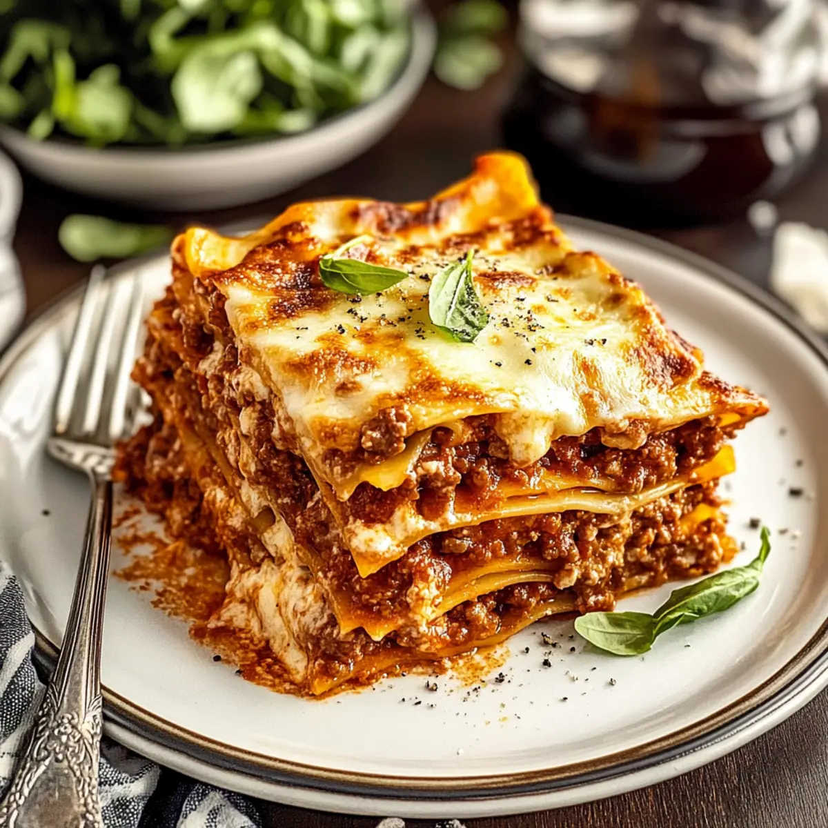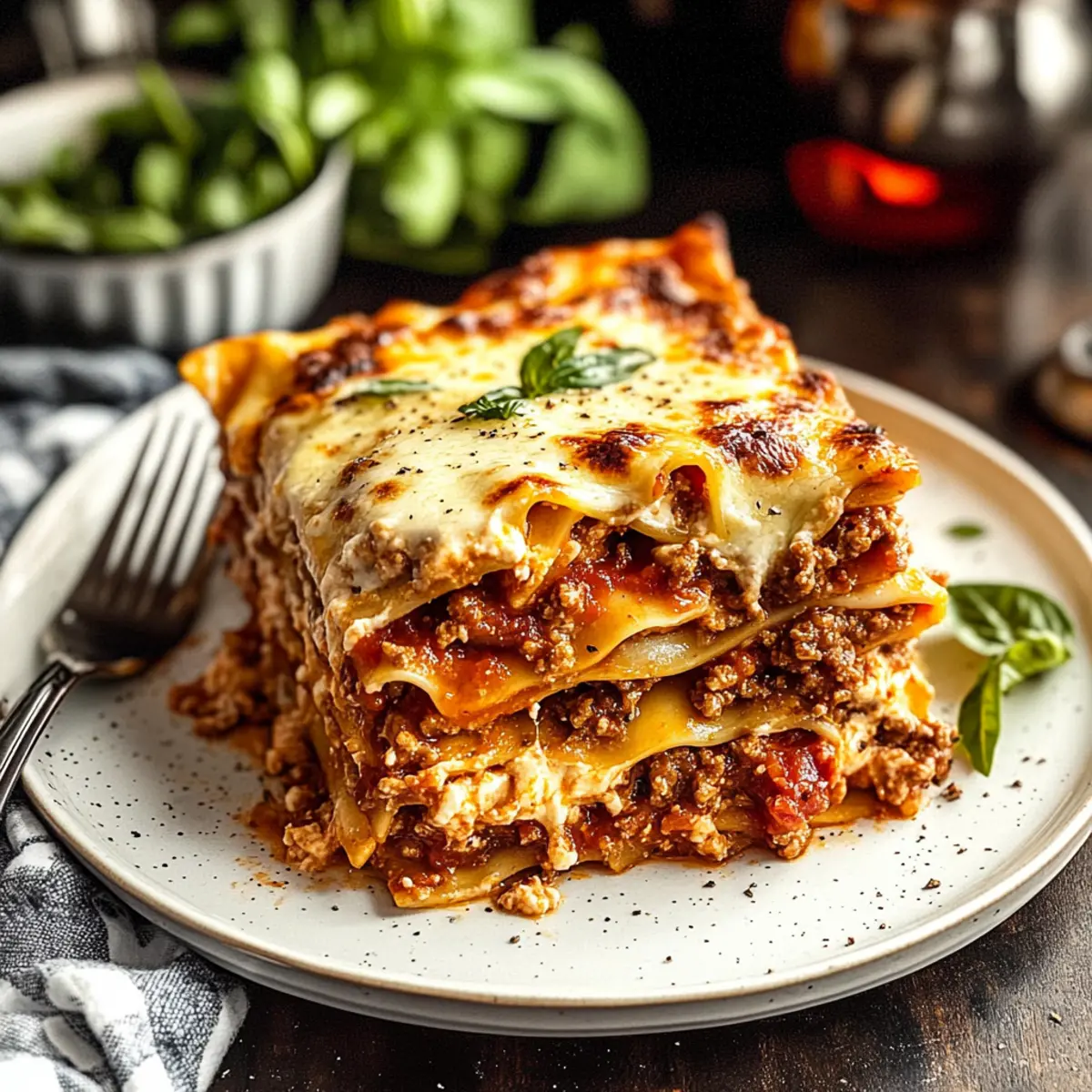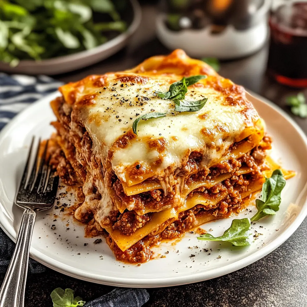 The aroma of simmering sauce wafts through the kitchen, transporting me to a sunlit Italian trattoria. The heart of this experience lies in my favorite recipe: Lasagna Bolognese. This dish doesn’t just fill your belly; it fills your home with warmth and love, perfect for gatherings or cozy nights in. With its homemade egg pasta and layers of rich, slow-cooked Bolognese sauce and creamy béchamel, this classic Italian comfort food is incredibly satisfying and surprisingly easy to prepare ahead of time. Imagine serving a slice of indulgence that not only impresses your guests but also captures the essence of a holiday meal. Are you ready to dive into this delicious culinary journey? Why is Lasagna Bolognese So Appealing? Comforting Layers: Each bite combines tender noodles, rich Bolognese sauce, and creamy béchamel, making it a dish everyone cherishes. Make-Ahead Magic: Perfect for busy days, you can prepare it in advance, allowing the flavors to meld beautifully overnight. Crowd-Pleaser: Whether it’s a holiday feast or a casual dinner, this lasagna impresses without fail—perfect when paired with a fresh salad like Kale Caesar! Versatile Variations: Want to lighten things up? Swap in ground turkey or mushrooms for a delicious twist. Culinary Journey: This recipe celebrates Italian tradition, bringing authentic flavors to your table and making every occasion memorable! Lasagna Bolognese Ingredients For the Bolognese Sauce Ground Sirloin – 1 lb (90/10), the main meat in the sauce, ensures a hearty flavor. Ground Italian Sausage – 1 lb, adds richness and depth to the overall taste. Pancetta – 6 oz, diced, provides a savory, smoky nuance that elevates the sauce. Yellow Onion – 1, roughly chopped, forms the flavor base; finely mincing saves prep time. Carrots – 2, peeled and chopped, brings natural sweetness to balance the acidity. Celery – 2 ribs, chopped, adds freshness and crunch to the Bolognese. Garlic – 4 cloves, minced, an essential aromatic that enhances flavor. Olive Oil – 1 tablespoon, used for cooking, adds richness to the sauce. Butter – 1 tablespoon, for browning pancetta and vegetables, infusing richness. Tomato Paste – 6 oz, intensifies the tomato flavor; cook until darkened for best results. Canned Crushed Tomatoes – 28 oz, choose a high-quality brand for vibrant flavor. Medium-bodied Red Wine – 1 1/2 cups, enhances complexity—use a wine you enjoy. Whole Milk – 1 cup (for Bolognese), balances acidity and tenderizes the meat. Bay Leaves – 2, impart a subtle herbal note to the sauce. Parmesan Rind – 1, adds an umami depth while simmering. Kosher Salt & Freshly Cracked Pepper – To taste, essential for seasoning. For the Homemade Pasta Egg Lasagna Noodles – 20 sheets, the backbone of this dish, allowing for perfect sauce absorption. For the Béchamel Sauce Unsalted Butter – 5 tablespoons, creates a rich base for the béchamel. All-Purpose Flour – 1/4 cup, thickens the sauce for a creamy texture. Whole Milk – 4 cups, warmed, guarantees a luscious béchamel consistency. Freshly Grated Nutmeg – 1/8 tsp, adds warmth and depth to the béchamel flavor. Freshly Grated Parmesan Cheese – 2 1/2 cups (divided), provides salty depth and enhances flavors. For the Toppings Fresh Mozzarella Cheese – 16 oz, diced, enhances creaminess with a gooey texture. Extra Parmesan Cheese – For topping, sprinkle for added flavor and richness. Dive into the heartwarming world of Lasagna Bolognese with these delicious ingredients! Step‑by‑Step Instructions for Lasagna Bolognese Step 1: Prepare the Bolognese Sauce In a Dutch oven, heat one tablespoon of olive oil and one tablespoon of butter over medium heat. Once melted, crisp 6 ounces of diced pancetta for about 3-4 minutes, then remove it from the pot. Using a food processor, finely mince one chopped yellow onion, two chopped carrots, two chopped celery ribs, and four minced garlic cloves until they’re finely chopped and almost a paste-like consistency. Step 2: Brown the Meat In the same Dutch oven, add 1 pound of ground sirloin and 1 pound of ground Italian sausage over low heat. Cook until browned and no longer pink, which takes around 10-12 minutes, stirring occasionally. Next, add the minced vegetable mixture back into the pot and sauté for another 5-7 minutes, until the vegetables are softened and translucent. Step 3: Build Flavor in the Sauce Stir in 6 ounces of tomato paste, cooking for about 2-3 minutes until it darkens slightly. Then, pour in 1 1/2 cups of medium-bodied red wine, scraping any brown bits stuck to the bottom. Allow the wine to simmer for about 5 minutes until it reduces slightly and evaporates the alcohol. Step 4: Simmer the Bolognese Sauce Add 28 ounces of canned crushed tomatoes, 1 cup of whole milk, 2 bay leaves, the removed pancetta, and a parmesan rind into the pot. Season with kosher salt and freshly cracked pepper to taste. Bring the sauce to a gentle simmer, cover partially, and let it cook on low for 2.5 to 3 hours, stirring occasionally. Step 5: Cook the Lasagna Noodles While the sauce simmers, bring a large pot of salted water to a boil. Cook 20 sheets of egg lasagna noodles until al dente, about 5-7 minutes. Once cooked, drain and place the noodles on oiled parchment paper, ensuring they don’t stick together, and set aside. Step 6: Make the Béchamel Sauce In a saucepan, melt 5 tablespoons of unsalted butter over medium heat. Whisk in 1/4 cup of all-purpose flour and cook for 2 minutes to eliminate the raw taste. Gradually add in 4 cups of warmed whole milk, whisking continuously until the mixture thickens and bubbles gently, which should take about 8-10 minutes. Stir in a pinch of freshly grated nutmeg for an aromatic finish. Step 7: Assemble the Lasagna Lightly grease a 9×13 baking dish. Begin layering by spreading a thin layer of béchamel on the bottom, followed by a layer of noodles. Next, add a layer of the Bolognese sauce, more béchamel, then top with