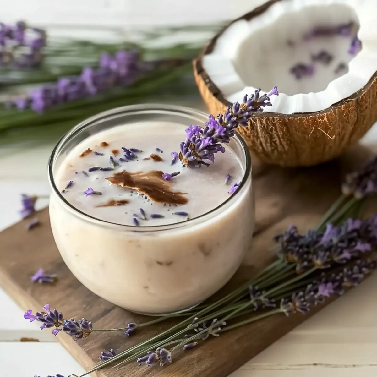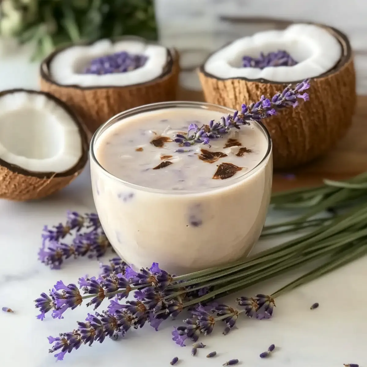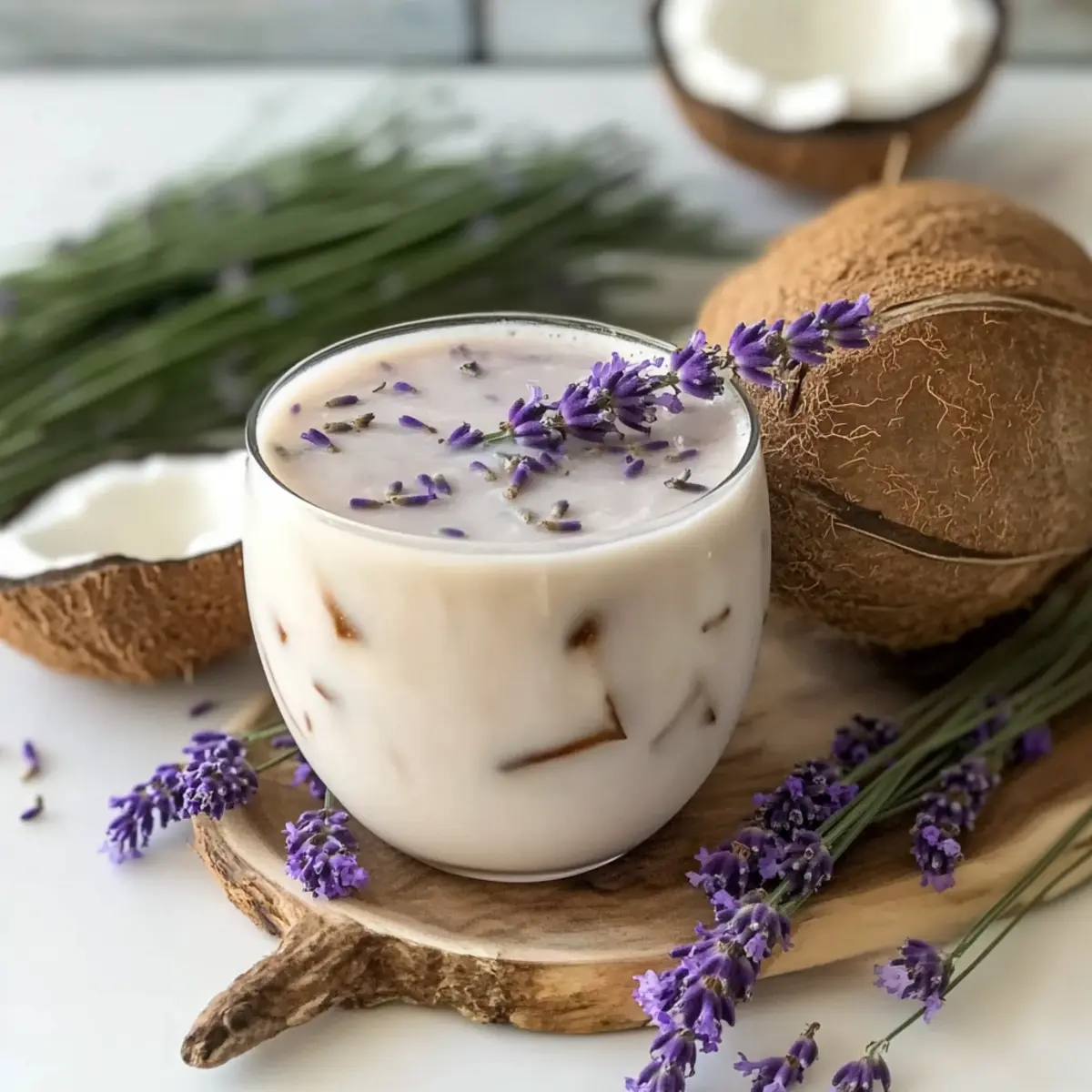 As I savored the last sip of my morning coffee, I thought, “Why not make mornings feel a little more luxurious?” Enter the Lavender Coconut Iced Latte, a delightful fusion of rich coconut milk and fragrant lavender syrup that transports your taste buds straight to a sunlit café. This plant-based, dairy-free beverage is not only super quick to whip up, but it also offers a refreshing twist that replaces your usual coffee routine. Perfect for warm days, this iced latte promises a sophisticated flair that will impress your friends and elevate your afternoons. Are you ready to join me in turning ordinary coffee moments into extraordinary experiences? Want to elevate your coffee routine? Luxurious mornings await you with this delightful Lavender Coconut Iced Latte! Refreshing and floral, it’s the perfect remedy for mundane coffee moments. Quick and easy to make, you’ll find that it’s not just a drink—it’s an experience. Versatile enough to customize with different milk alternatives or flavor adjustments, it caters to all palates. Pair it with a light snack or enjoy it as an afternoon treat, and you’ll see why this latte is a favorite! And if you enjoy floral flavors, be sure to try my Mango Coconut Panna for another refreshing dessert! Lavender Coconut Iced Latte Ingredients • Indulge in the exquisite flavors! For the Latte Coconut Milk – Offers a wonderfully creamy texture that enhances the latte’s richness; remember to shake the can well before opening! Lavender Syrup – Imparts a delicate floral essence, essential for the unique character of the Lavender Coconut Iced Latte; homemade syrup can elevate the flavor even more! Espresso – Provides a robust coffee base that balances the sweetness; brewing it hot helps blend with the coconut milk smoothly for a harmonious drink. For Serving Ice Cubes – Use plenty for that refreshing chill; crushed ice makes for an ideal choice in blended versions. Lavender Sprig (optional) – A lovely garnish that adds an elegant touch; it also intensifies the lavender aroma in your drink. Sip, savor, and enjoy this luxurious Lavender Coconut Iced Latte that brings a touch of café culture right into your home! Step‑by‑Step Instructions for Lavender Coconut Iced Latte Step 1: Brew the Espresso Begin by brewing 1 ounce of espresso using your preferred espresso machine or stovetop moka pot. Aim for a rich, bold extraction that typically takes about 25 to 30 seconds. Once brewed, set it aside to cool for a few minutes, allowing the heat to dissipate while you prepare the other ingredients for your Lavender Coconut Iced Latte. Step 2: Combine Espresso and Lavender Syrup In a tall glass, pour the cooled espresso and add 1/4 cup of lavender syrup. Stir gently with a spoon to blend the flavors seamlessly, creating a sweet and floral foundation for your latte. As you mix, watch for a slight sheen on the surface, indicating the syrup is perfectly incorporated, setting the stage for a delightful Lavender Coconut Iced Latte. Step 3: Add Chilled Coconut Milk Next, pour in 1/2 cup of chilled coconut milk, allowing the creamy goodness to cascade into the espresso and syrup mixture. Use a spoon to stir the ingredients together until well-combined, creating a luxurious, velvety drink with a beautiful lavender hue. The coconut milk will add a rich texture, making your Latte truly indulgent. Step 4: Serve Over Ice Fill a separate glass with ice cubes to the brim, ensuring it’s nice and chilled. Then carefully pour your Lavender Coconut Iced Latte mixture over the ice, watching it swirl beautifully. The cold ice will create an inviting contrast with the creamy latte, and you’ll feel the refreshing coolness coming through as it fills your glass. Step 5: Optional Blended Version For a frothier, blended delight, combine the espresso, lavender syrup, and chilled coconut milk in a cocktail shaker filled with ice. Shake vigorously for about 20 seconds until well-blended and slightly frothy, then strain the mixture into a glass filled with fresh ice. This method provides a fun twist to your Lavender Coconut Iced Latte, perfect for warm days. Step 6: Garnish and Enjoy For an elegant touch, consider garnishing your Lavender Coconut Iced Latte with a sprig of lavender on top. This not only enhances the visual appeal but also boosts that lovely floral aroma as you sip. Take a moment to admire your creation before diving in, as this luxurious drink is now ready to elevate your coffee experience! Tips for the Best Lavender Coconut Iced Latte Balance is Key: Start with less lavender syrup and gradually adjust to your taste. This avoids overpowering the latte with floral sweetness. Blend for Froth: For a smooth and frothy texture, shake the coconut milk and espresso vigorously with ice. This method elevates your Lavender Coconut Iced Latte to café-quality. Ice Matters: Use good-quality ice cubes or crushed ice to keep your latte cold without diluting the flavor. This ensures a refreshing drink right to the last sip. Ingredient Temperature: Ensure the espresso is hot when mixing with other ingredients. This helps them blend seamlessly into the rich, creamy latte you crave. Garnish Delight: A lavender sprig is not just pretty—it’s aromatic! It enhances the drinking experience with an inviting floral note as you sip your latte. Lavender Coconut Iced Latte Variations Feel free to make this delightful drink your own with these fun swaps and tweaks! Milk Alternatives: Substitute coconut milk with almond or oat milk for different flavor profiles that still maintain creaminess. Sweetness Level: Adjust the lavender syrup’s amount according to your taste; less syrup for a subtler floral essence and more for a sweeter kick. Vanilla Twist: For an extra flavor boost, add a splash of vanilla extract or even a dollop of vanilla bean ice cream for a delightful creamy touch. Ice Cream Addition: Turn your latte into a decadent dessert by blending in a scoop of your favori