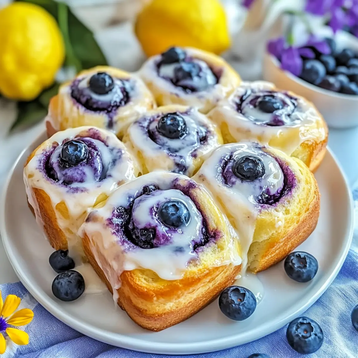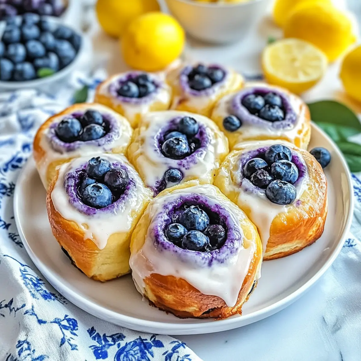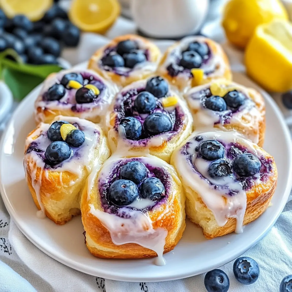The scent of zesty lemon and sweet blueberries wafting from your oven can turn an ordinary morning into a cozy brunch experience. As I pulled out my latest creation—Lemon Blueberry Cream Cheese Rolls—my heart raced with excitement. These fluffy rolls are not just a delightful treat; they’re the perfect customizable addition to your breakfast table. With a rich cream cheese filling and the option to swap in various fruit jams or vegan alternatives, you can cater to any dietary preference. Plus, they come together quickly, making them an easy choice to impress friends and family. Curious about how to whip up these crowd-pleasers? Let’s dive into the recipe! Why are these rolls a breakfast favorite? Elevating brunch: These Lemon Blueberry Cream Cheese Rolls are a wonderful way to transform a typical brunch into something special, bringing cheer to any gathering. Customizable delight: Feel free to swap the blueberry jam for your favorite fruit, like raspberry or even playful chocolate drizzle; the possibilities are endless! Quick and easy: With straightforward steps, even beginner bakers can succeed, allowing you to impress guests effortlessly! Make-ahead friendly: Prep the blueberry jam or cream cheese filling in advance, making it easy to assemble right before baking, saving you precious time in the mornings. Pair these with a refreshing Greek yogurt parfait or a side of herbed scrambled eggs for a complete brunch spread! Lemon Blueberry Cream Cheese Rolls Ingredients The delightful essentials you’ll need For the Blueberry Jam Blueberries – Use fresh or frozen for a juicy burst of flavor; if using frozen, add directly without thawing. White Granulated Sugar – Adds just the right amount of sweetness; feel free to substitute with less sweet alternatives if desired. Cornstarch – A key thickener for the blueberry jam, ensuring it has the perfect consistency. For the Cream Cheese Filling Cream Cheese – Make sure it’s softened for easy mixing; a great dairy-free alternative can be used if needed. Lemon Zest & Juice – Essential for that bright citrus flavor that elevates the rolls. Powdered Sugar – Sweetens the filling and contributes to a smooth icing texture. Sea Salt – Balances sweetness in the filling; opt for fine salt for even distribution. Vanilla Extract – Boosts flavors in the cream cheese; almond extract is a lovely substitute. For the Dough Whole Milk – Hydrates the dough; almond or non-dairy milk can be swapped for a dairy-free option. Unsalted Butter – Adds richness and flavor; margarine can serve as a dairy-free alternative. Large Eggs – Binds the dough together; substitutes like flaxseed meal or applesauce work well for a vegan version. Instant Yeast – Acts as the leavening agent for a fluffy rise; ensure freshness for best results. All-Purpose Flour – Provides the structure needed for the rolls; gluten-free flour can be experimented with but may alter texture. For Baking and Finishing Touches Cream or Half-and-Half – Pour over rolls before baking for luxurious moisture and flavor. Optional Icing – Whisk powdered sugar with lemon juice to drizzle over warm rolls for a perfect finish. With these Lemon Blueberry Cream Cheese Rolls ingredients, you’re all set to create a delightful and customizable brunch treat that will have everyone coming back for more! Step‑by‑Step Instructions for Lemon Blueberry Cream Cheese Rolls Step 1: Prepare the Blueberry Jam In a medium saucepan, combine fresh or frozen blueberries with granulated sugar over medium heat. Stir frequently for about 5–7 minutes, until the mixture thickens and begins to bubble. Once thickened, whisk a cornstarch slurry (cornstarch mixed with a little water) into the jam, remove from heat, and allow it to cool completely while preparing the filling and dough. Step 2: Make the Cream Cheese Filling In a mixing bowl, blend softened cream cheese using an electric mixer until smooth. Add the lemon zest, lemon juice, powdered sugar, sea salt, and vanilla extract; mix until creamy and well combined. This luscious cream cheese filling will add a delightful tang to your Lemon Blueberry Cream Cheese Rolls, so set it aside when done. Step 3: Prepare the Dough In a large bowl, whisk together granulated sugar, lemon zest, warm milk (around 110°F), melted unsalted butter, large eggs, and sea salt until well combined. Sprinkle the instant yeast over the mixture, followed by gradually adding all-purpose flour, mixing until a soft dough forms that pulls away from the sides of the bowl, usually about 5 minutes of mixing. Step 4: Knead the Dough On a floured surface, turn out the dough and knead for 5–7 minutes until it becomes smooth and elastic. Make sure to dust your hands and the surface with flour if the dough is sticky. Once kneaded, cover the dough with a clean kitchen towel or plastic wrap and let it rest for 15–20 minutes in a warm area, allowing it to rise. Step 5: Roll and Fill the Dough After resting, roll the dough into a large rectangle, about ¼ inch thick. Spread an even layer of the cream cheese filling across the surface, then top it with an even layer of the prepared blueberry jam. Carefully roll the dough into a tight log, ensuring the fillings stay inside, then slice the log into 12 equal pieces using a sharp knife. Step 6: Allow the Rolls to Rise Place the cut rolls into a greased baking dish, ensuring they’re not too crowded. Cover the dish with a kitchen towel and let the rolls rise in a warm spot for 45 minutes to 1 hour, or until they have doubled in size and appear puffed and fluffy, preparing them perfectly for baking. Step 7: Bake the Rolls Preheat your oven to 350°F (175°C). Once the rolls have risen, pour cream or half-and-half evenly over the top. Bake the rolls in the preheated oven for 35–40 minutes, or until they are golden brown and the tops are lightly crisp. Keep an eye on them towards the end of baking to prevent overbaking. Step 8: Drizzle with Ic