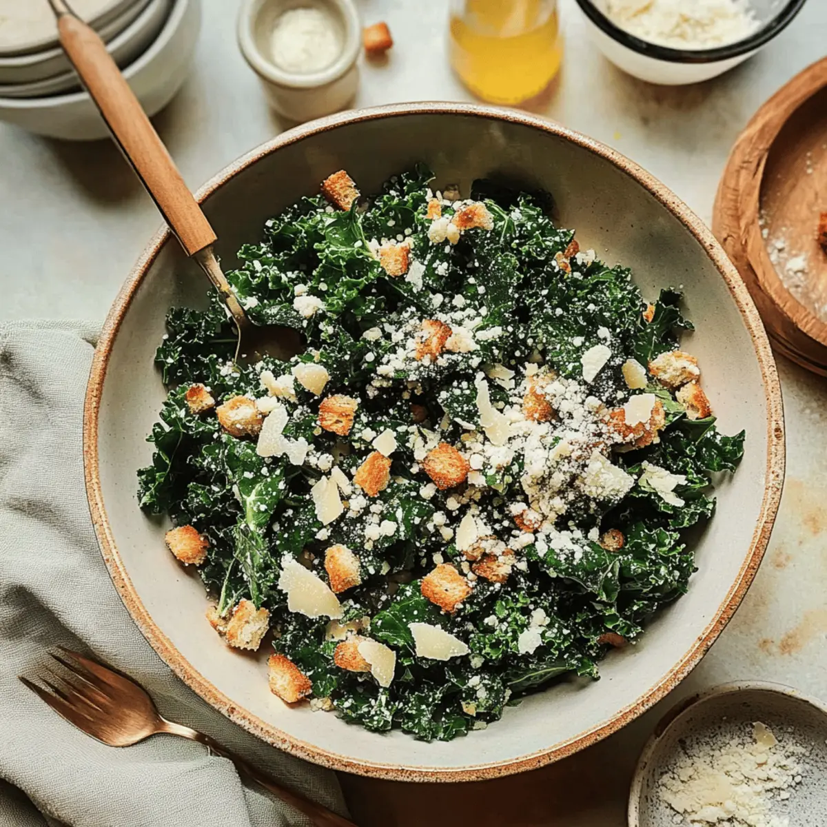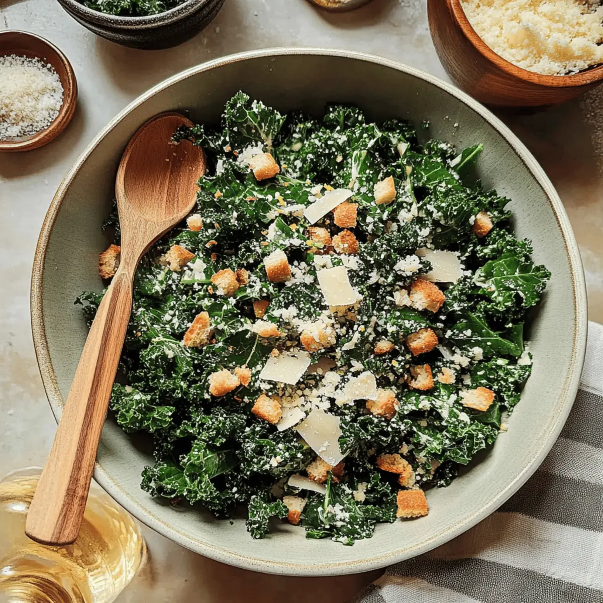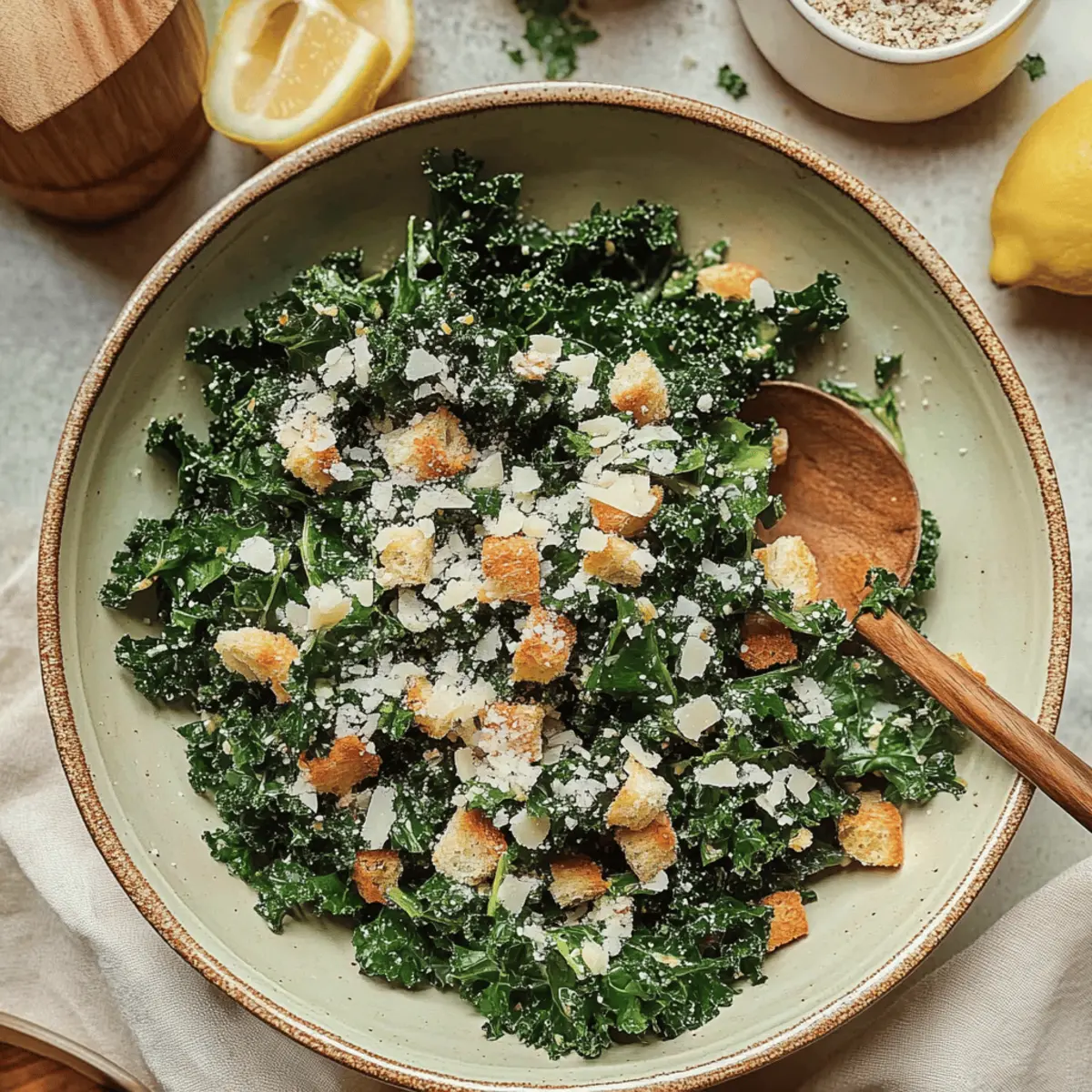 Summer is the season for vibrant flavors and refreshing salads, making it the perfect time to whip up my delightful Lemony Parmesan Kale Salad. This easy salad recipe brings together the zesty brightness of lemon and the rich creaminess of parmesan, turning healthy eating into an absolute joy. With just 8 simple ingredients and a mere 15 minutes of prep time, it’s your go-to dish for warm days and gatherings. Not only is it gluten-free and refined sugar-free, but it’s also a fantastic way to sneak in some greens for the whole family. Imagine serving this colorful salad alongside your favorite grilled meats, or even enjoying it as a light lunch with a protein boost! What’s your favorite summer salad combination? Why is this salad a summer favorite? Unmatched Freshness: The Lemony Parmesan Kale Salad bursts with vibrant flavors that are perfect for summer days. Quick & Easy: With just 8 simple ingredients and a 15-minute prep time, it’s a hassle-free option for any meal or gathering. Healthy & Wholesome: This dish is not only gluten-free and refined sugar-free, but also packed with nutrients from kale, making it a guilt-free indulgence for everyone. Versatile Delight: Serve this salad as a delightful side with grilled chicken or seafood, or enjoy it alone for a light lunch—all while adding your favorite protein for a filling twist! Crowd-Pleasing Appeal: Its vibrant presentation and unique flavor profile make it a guaranteed hit, ensuring your family will come back for seconds! Pair this salad with a refreshing Cucumber Strawberry Salad for a summer feast, and elevate your meal with a delightful balance of flavors! Lemony Parmesan Kale Salad Ingredients For the Salad • Curly Kale – Provides a nutritious and hearty structure; can substitute with Tuscan kale for a different texture. • Croutons – Adds crunchy texture; for a gluten-free option, substitute with nuts. • Freshly Grated Parmesan Cheese – Contributes creaminess and umami flavor; Pecorino Romano works well for a sharper taste. For the Dressing • Olive Oil – Acts as the dressing base, delivering healthy fats; use a light oil to avoid overpowering flavors. • Lemon Juice – Enhances brightness and acidity, balancing cheese richness; freshly squeezed juice is best for flavor. • Garlic – Adds aromatic depth; fresh minced garlic is recommended, but garlic powder can be used for convenience. Seasoning • Sea Salt – Enhances all flavors; adjust based on preference and use kosher salt if desired. • Black Pepper – Offers a delightful bite; freshly cracked pepper provides the best flavor, but can be omitted for a milder taste. Craft this delicious Lemony Parmesan Kale Salad and relish in the refreshing summer flavors that will have everyone asking for the recipe! Step‑by‑Step Instructions for Lemony Parmesan Kale Salad Step 1: Prepare the Kale Begin by rinsing the curly kale under cold running water to remove any dirt or grit. Ensure you dry the leaves thoroughly using a salad spinner or by patting them gently with a kitchen towel. Once clean, strip the stems away from the leaves, discarding the tough parts, and tear the kale into bite-sized pieces. Place the prepared kale in a large salad bowl. Step 2: Massage the Kale Sprinkle a pinch of sea salt over the kale in the bowl. Using your hands, gently massage the kale for about 1-2 minutes until the leaves start to soften and darken in color. This process breaks down the tough fibers, making the kale more palatable and enhances its overall flavor, preparing it perfectly for the Lemony Parmesan Kale Salad. Step 3: Prepare the Croutons If using store-bought croutons, crush them into smaller pieces to incorporate better with the salad. Alternatively, for homemade croutons, you can toast cubed bread in the oven at 375°F (190°C) for about 10 minutes until golden and crisp. Once ready, add the croutons to the bowl with the massaged kale, creating a delightful crunch in your salad. Step 4: Make the Dressing In a small mixing bowl, whisk together a few tablespoons of olive oil and freshly squeezed lemon juice. Add in minced garlic and freshly cracked black pepper to taste. Continue whisking until the dressing is well combined and emulsifies slightly. This zesty dressing will brighten up your Lemony Parmesan Kale Salad and harmonizes beautifully with the kale and cheese. Step 5: Combine the Salad Pour the homemade dressing over the kale and crouton mixture, ensuring an even distribution. Use salad tongs or your hands to gently toss everything together until the kale is fully coated in the dressing. Then, generously sprinkle freshly grated parmesan cheese on top, allowing it to blend into the kale for added creaminess and flavor. Step 6: Serve Immediately Your Lemony Parmesan Kale Salad is ready to shine! Serve it immediately to keep the croutons crisp and the kale fresh. This delicious salad pairs wonderfully with grilled meats or can be enjoyed on its own as a light meal. If there are leftovers, store them in an airtight container in the refrigerator for up to 2-3 days, but be aware that the croutons will soften over time. What to Serve with Lemony Parmesan Kale Salad This vibrant dish is a delightful addition to any meal, perfectly balancing flavor and freshness. Grilled Chicken: The juicy, charred flavors of grilled chicken provide a hearty contrast to the bright, zesty salad, creating a well-rounded plate. Baked Salmon: A flaky, rich salmon fillet pairs beautifully, with its natural oils complementing the salad’s lemony brightness for a healthful yet indulgent meal. Quinoa Bowl: For a nutritious twist, serve the kale salad atop a bowl of fluffy quinoa. The nuttiness adds a satisfying base while enhancing the dish’s overall texture. Roasted Vegetables: Bring in a medley of roasted seasonal vegetables for earthiness, balancing the salad’s fresh elements with hearty roasted charm. Refreshing Lemonade: Sip on a chilled glass of homemade lemonade to enha