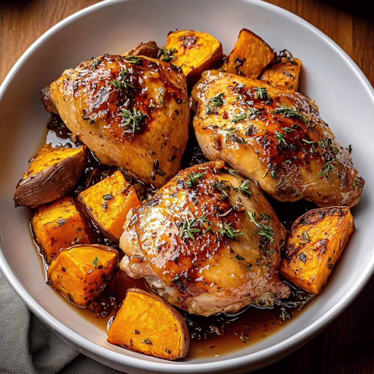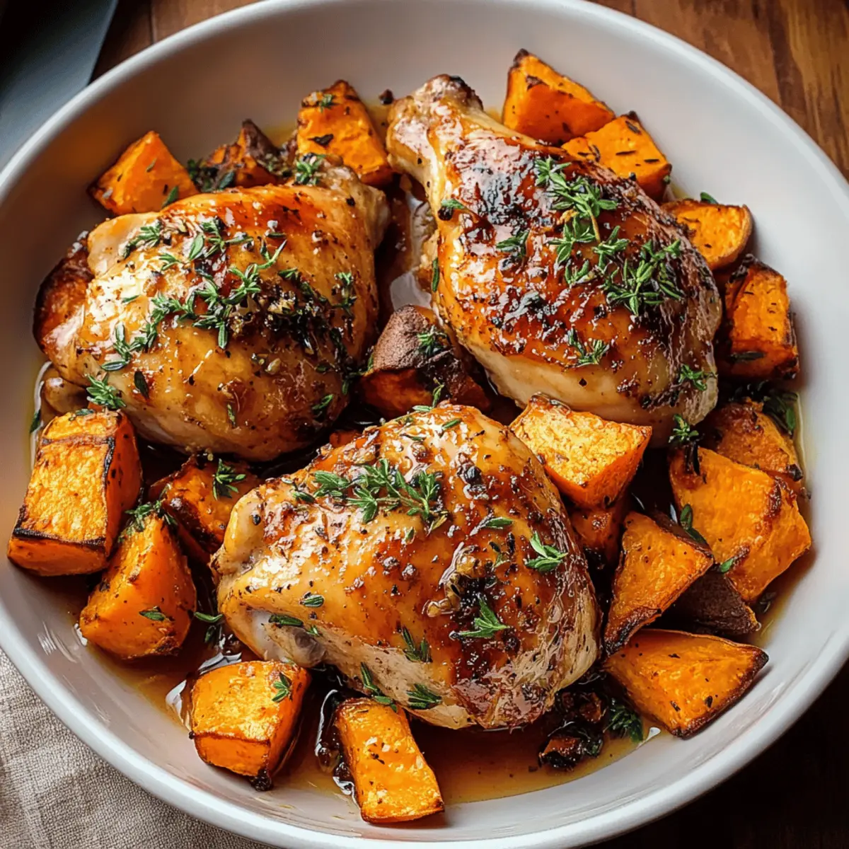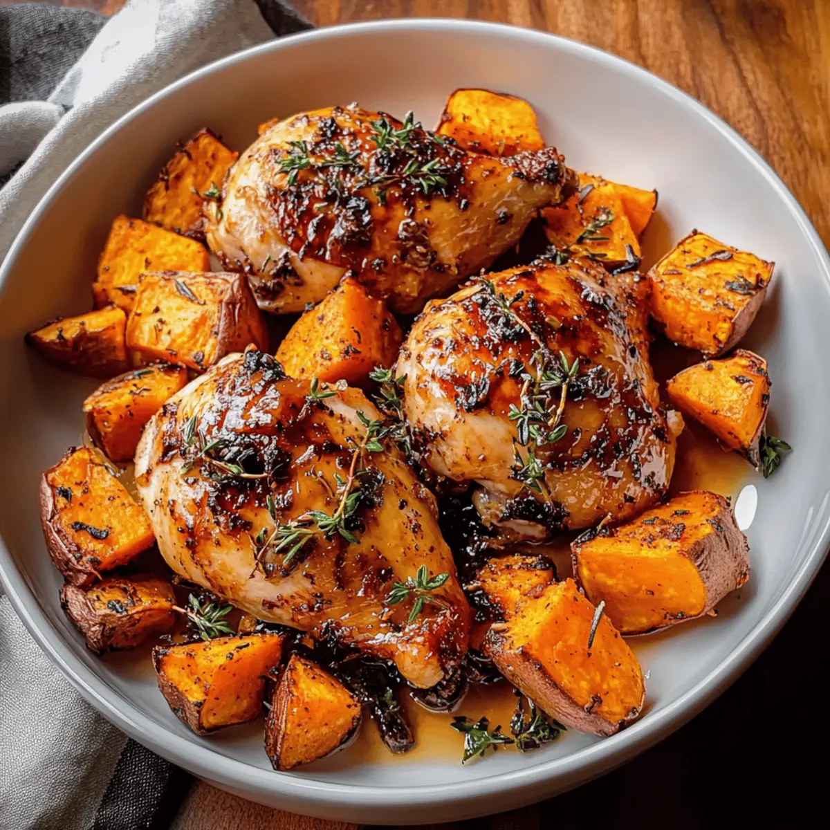 As I was preparing dinner last night, a sudden craving hit me for something that captured both warmth and comfort. That’s when I remembered the magic of Maple-Glazed Chicken with Sweet Potatoes—a dish that never fails to delight my taste buds. With its juicy chicken glistening under a luscious maple syrup glaze and tender roasted sweet potatoes offering a perfect, caramelized contrast, this meal is a culinary embrace on a plate. Not only is it beginner-friendly, requiring just 15 minutes of prep, but it’s also a healthy option that’s naturally gluten-free. Whether you’re entertaining friends or simply looking for a cozy dinner for one, this recipe transforms everyday ingredients into something truly spectacular. Ready to bring a little sweetness to your table tonight? Why is this recipe a must-try? Simplicity at its Core: With just 15 minutes of prep, anyone can master this dish without stress! Bold, Irresistible Flavors: The sweet and savory combination of maple syrup and tender chicken creates a flavor profile that will have everyone asking for seconds. Versatile Side Pairing: Roasted sweet potatoes perfectly complement the maple-glazed chicken, adding a comforting layer of sweetness and texture, making each bite delightful. Ideal for Any Occasion: Whether it’s a weeknight dinner or a small gathering, this recipe elevates your kitchen game effortlessly, much like my Cilantro Lime Chicken does! Health-Conscious Option: Naturally gluten-free and packed with wholesome ingredients, this dish caters to various dietary needs without sacrificing taste. Nourishing and Filling: Each serving delivers a balanced meal with approximately 450 calories, perfect for those cozy nights when you crave comfort without the guilt. Maple-Glazed Chicken with Sweet Potatoes Ingredients Unlock the deliciousness of this dish with these simple ingredients! For the Chicken Boneless, Skinless Chicken Breasts – The foundation of this dish, yielding juicy and tender results. Pure Maple Syrup – The star of the show, providing that sticky, glossy glaze; honey makes a great substitute if needed. Apple Cider Vinegar – Adds the perfect touch of acidity to balance the dish’s sweetness; white vinegar works in a pinch. Olive Oil – Used to coat both the chicken and veggies for even roasting; melted coconut oil is a suitable replacement. Garlic Powder – Provides flavor depth effortlessly; onion powder is a useful alternative. For the Sweet Potatoes Sweet Potatoes – Naturally sweet and creamy when roasted; yams can be substituted for a similar taste. Salt and Pepper – Essential for enhancing flavors; adjust according to your preference. For the Garnish Fresh Thyme – Offers an aromatic touch; dried thyme can be used—1 tsp of dried equals ¼ cup of fresh. Butter – Adds richness when toasting optional pecans. Chopped Pecans (optional) – A nutty, crunchy contrast that can be omitted for a nut-free version. Fresh Parsley – Brightens the dish with freshness and color; feel free to swap with cilantro for a different take. Step‑by‑Step Instructions for Maple-Glazed Chicken with Sweet Potatoes Step 1: Preheat Your Oven Start by preheating your oven to 400°F (200°C). This temperature is perfect for roasting both the chicken and sweet potatoes, allowing them to caramelize and develop rich flavors. While waiting for the oven to heat, prepare a baking sheet by lining it with parchment paper, ensuring an effortless cleanup later. Step 2: Season the Sweet Potatoes In a large bowl, toss your diced sweet potatoes with 2 tablespoons of olive oil, garlic powder, salt, and pepper until evenly coated. This seasoning will enhance their natural sweetness. Once thoroughly mixed, spread the sweet potatoes out on one half of the prepared baking sheet, ensuring they’re in a single layer for even roasting. Step 3: Prepare the Chicken Mix In the same bowl, add your boneless, skinless chicken breasts, along with the remaining olive oil, maple syrup, apple cider vinegar, fresh thyme, salt, and pepper. Mix well, ensuring each piece of chicken is coated in the luscious marinade. This blend creates the delightful glaze for your Maple-Glazed Chicken, infusing it with sweet and savory notes. Step 4: Arrange on the Baking Sheet Place the marinated chicken breasts on the other half of the baking sheet, ensuring they don’t overlap. This step is crucial for optimal roasting. The chicken will absorb the flavors from the maple syrup while roasting, creating a beautiful glaze. Both chicken and sweet potatoes should have enough space to roast evenly. Step 5: Roast Until Perfect Transfer the baking sheet to your preheated oven and roast for 25 to 30 minutes. Keep an eye on the chicken; it should reach an internal temperature of 165°F (75°C), while the sweet potatoes become tender and slightly golden. The aromas wafting from your oven will be a delightful hint of the comfort meal awaiting you! Step 6: Toast the Pecans While everything is roasting, melt 2 tablespoons of butter in a skillet over medium heat. Once melted, add your chopped pecans and toast them for 3 to 4 minutes, stirring occasionally, until they are fragrant and slightly browned. This step adds a nutty crunch to your Maple-Glazed Chicken with Sweet Potatoes. Step 7: Finish and Serve Once the chicken is cooked through and the sweet potatoes are caramelized, remove the baking sheet from the oven. Sprinkle the toasted pecans over the sweet potatoes for added texture. Plate the succulent chicken alongside the roasted sweet potatoes, and if desired, garnish with freshly chopped parsley for a vibrant finish! Maple-Glazed Chicken with Sweet Potatoes Variations Feel free to get creative with your Maple-Glazed Chicken to make this dish a personal favorite! Bone-In Chicken: Swap for bone-in chicken pieces for richer flavor. Just note that cooking times will increase! Herb Infusion: Experiment by adding fresh rosemary or sage for an aromatic twist that elevates the flav