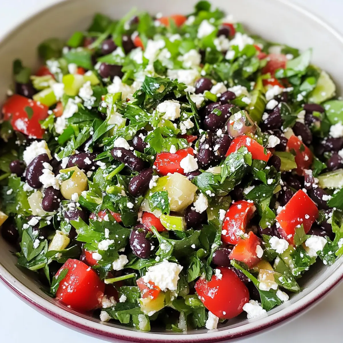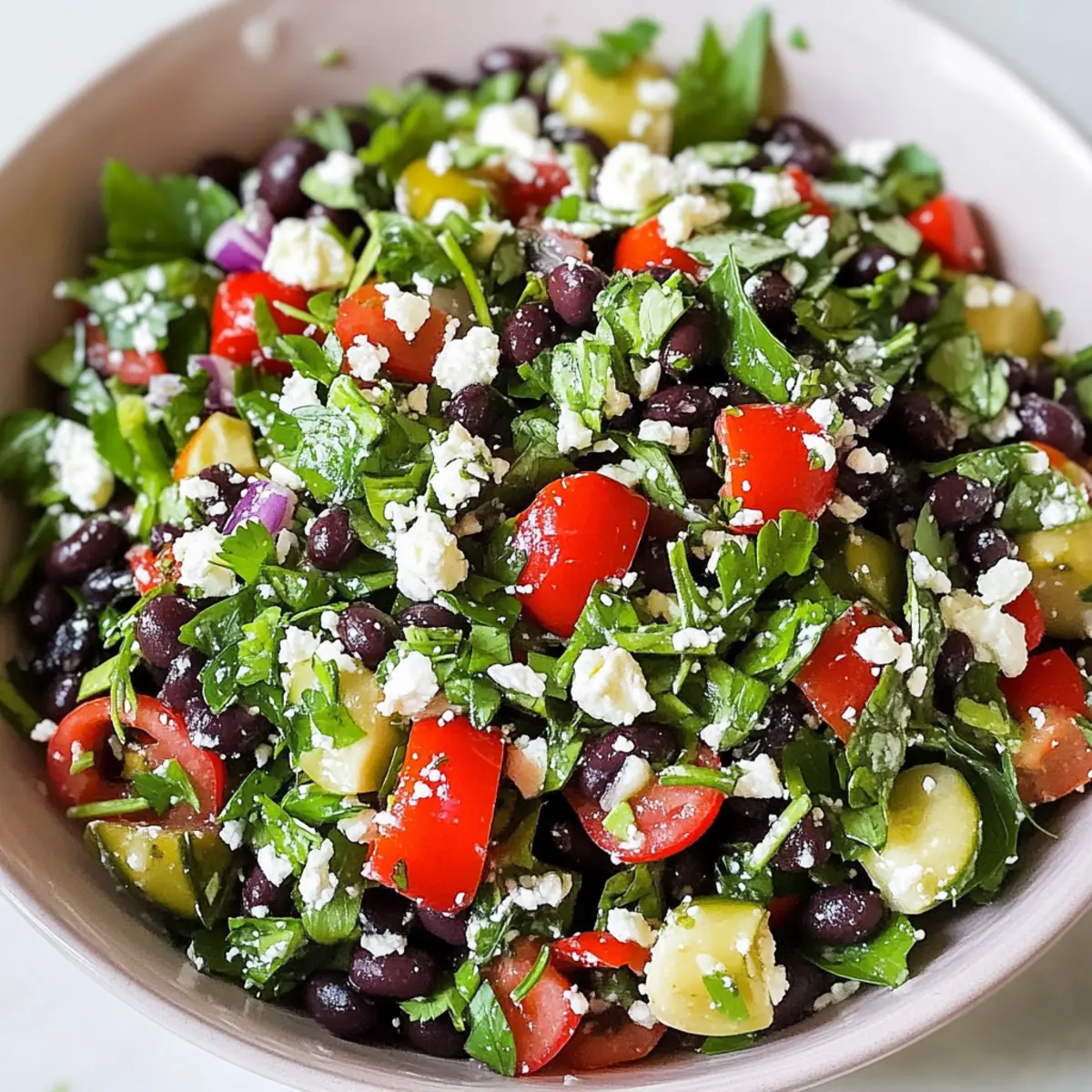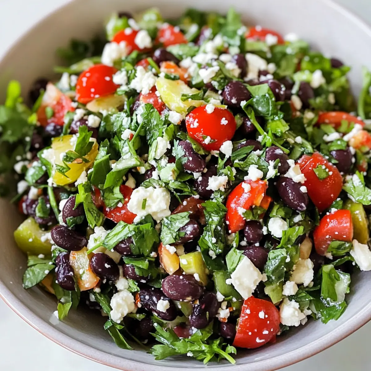 The aroma of sun-ripened tomatoes and fragrant herbs instantly transports me to bustling Mediterranean markets, where vibrant flavors reign supreme. Today, I’m excited to share my take on a Mediterranean Black Bean Salad with Herbs & Feta—a dish that comes together in just 10 minutes! This salad beautifully melds the earthy richness of black beans with the tangy creaminess of feta and bright, fresh herbs. Not only is it a fantastic option for a quick, healthy meal, but it’s also gluten-free, nut-free, and grain-free, making it perfect for anyone watching their dietary needs. Whether you’re enjoying it as a refreshing lunch or serving it as a vibrant side at dinner, this salad is sure to impress. Curious about what other delicious surprises you can add? Let’s dive in and discover the magic of Mediterranean flavors together! Why Choose This Mediterranean Salad? Quick Preparation: With just 10 minutes of prep time, this salad is the perfect solution for busy days when you crave something fresh and flavorful. Bursting with Flavor: The contrast of earthy black beans and tangy feta, combined with aromatic herbs, creates a taste explosion that’s simply irresistible. Diet-Friendly: This recipe is not only gluten-free, nut-free, and grain-free, but also caters to vegetarians, making it a versatile dish for everyone at your table. Customizable Options: Feel free to get creative! Add some diced cucumbers or cherry tomatoes for extra crunch and sweetness. Crowd-Pleaser: Serving this salad at your next gathering? It’s sure to impress guests and is ideal alongside grilled meats or as a light meal. For more tasty salad ideas, check out my Mediterranean Chickpea Salad and Cheesecake Fruit Salad for varied flavor profiles! Mediterranean Black Bean Salad Ingredients • Dive into the components of this vibrant dish! For the Salad Black Beans – Rich in protein and fiber; use canned for convenience or cook from scratch for a homemade touch. Feta Cheese – Adds a tangy creaminess; sub crumbled goat cheese for a different flavor dimension. Fresh Herbs (e.g., parsley, basil) – Bring a burst of freshness; opt for dill or cilantro for unique flavor variants. For the Dressing Olive Oil – Enhances richness; use high-quality extra virgin for the best flavor infusion. Lemon Juice – Provides acidity; swap in vinegar for a different zest if desired. Salt & Pepper – Essential for seasoning; adjust according to personal taste and dietary needs. This Mediterranean Black Bean Salad with Herbs & Feta is ready to be brought to life in your kitchen! Step‑by‑Step Instructions for Mediterranean Black Bean Salad With Herbs & Feta Step 1: Prepare Ingredients Start by rinsing and draining one can of black beans under cold water. Set them aside in a mixing bowl. Next, finely chop a handful of fresh herbs—like parsley and basil—for a fragrant kick. Crumble about half a cup of feta cheese into smaller pieces for easy mixing. Have all your ingredients ready for the Mediterranean Black Bean Salad to ensure a smooth assembly. Step 2: Mix the Salad In a large mixing bowl, combine the prepared black beans, crumbled feta, and chopped herbs. Gently fold the ingredients together with a spatula to ensure even distribution. You should see a lovely mix of colors and textures—a hearty, earthy blend of black beans paired with vibrant herbs and creamy feta. This is the foundation of your Mediterranean Black Bean Salad. Step 3: Dress the Salad Drizzle about three tablespoons of extra virgin olive oil over the bean mixture. Squeeze the juice of one fresh lemon for bright acidity, and sprinkle in salt and pepper to taste. Use a spoon to gently combine all the ingredients, making sure the oil and lemon juice coat everything evenly. The dressing will enhance the flavors of your Mediterranean Black Bean Salad. Step 4: Toss Carefully toss the salad with a spatula, ensuring all components are well-coated without breaking the feta too much. You want a nice mix where the beans remain intact, and the feta adds pops of creaminess. Taste and adjust the seasoning as needed—a little more salt or lemon juice can elevate your Mediterranean Black Bean Salad to perfection. Step 5: Serve Immediately Transfer the salad to a beautiful serving bowl to showcase its vibrant colors. The Mediterranean Black Bean Salad can be enjoyed straight away; it’s best served chilled or at room temperature. This makes for an ideal quick lunch or a stunning side dish. Embrace the refreshing flavors of your creation! What to Serve with Mediterranean Black Bean Salad with Herbs & Feta This vibrant salad pairs beautifully with various sides and drinks, creating a delightful meal experience. Grilled Chicken Skewers: The smokiness from charred chicken complements the fresh flavors of the salad, making a well-rounded dish. Quinoa Pilaf: A light and fluffy grain that adds texture and absorbs flavors, heightening the Mediterranean theme of your meal. Stuffed Bell Peppers: Filled with rice or legumes, these peppers offer a hearty and colorful side that contrasts nicely with the salad’s freshness. Roasted Vegetables: A medley of seasonal vegetables brings earthiness and warmth to the table, enhancing the overall dining experience. Hummus and Pita Chips: A creamy dip with a crunchy side, perfect for sharing, that brings additional Mediterranean vibes to your meal. White Wine Spritzer: This refreshing drink balances the salad’s flavors and adds a touch of elegance to your meal. Lemon Sorbet: A light and zesty dessert that cleanses the palate while echoing the citrus notes in the salad. With these pairings, you can elevate your Mediterranean Black Bean Salad into a full-fledged feast that family and friends will love! Expert Tips for Mediterranean Black Bean Salad Flavor Fusion: Let the salad sit for 10 minutes after mixing. This allows the Mediterranean Black Bean Salad’s flavors to meld beautifully, enhancing the taste. Careful Mixing: Be gentle when t