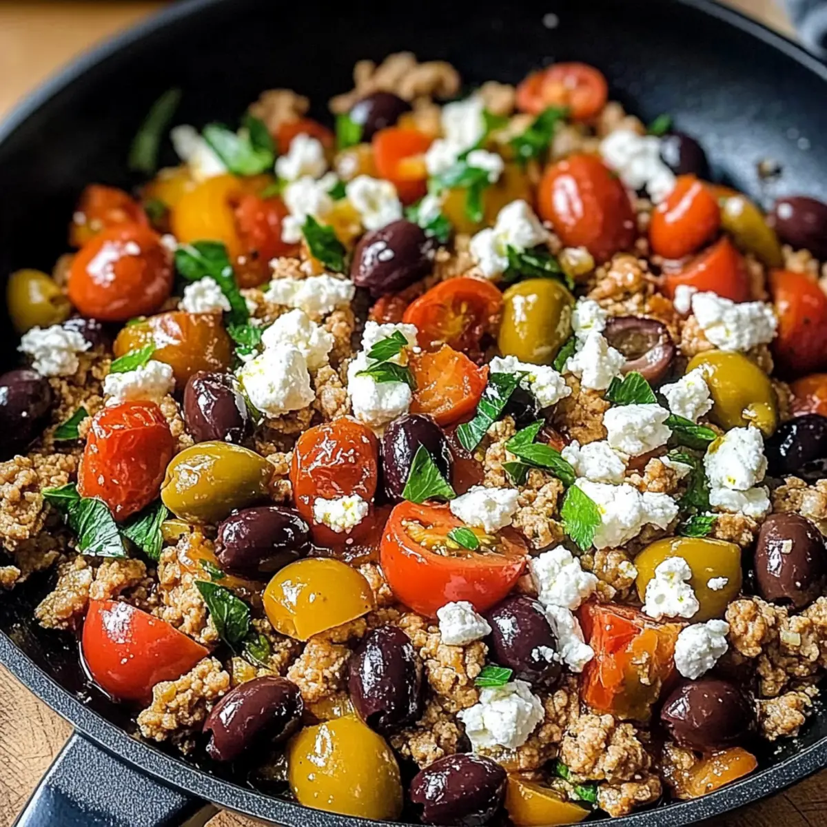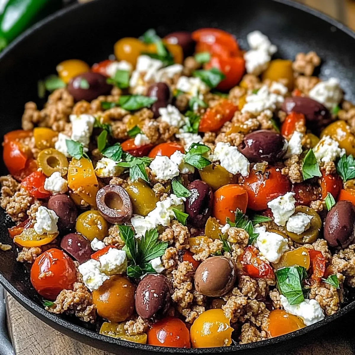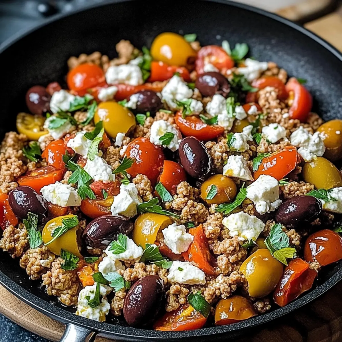 As I stood in my kitchen, the enticing aromas of sizzling garlic and browned chicken danced around me, instantly transporting me to a sunlit Mediterranean terrace. This Mediterranean Keto Ground Chicken Skillet with Olives and Feta is my go-to quick dinner for busy nights, combining the vibrant flavors of fresh ingredients with the comforting essence of a warm meal. Not only is this dish incredibly easy to whip up, but it also doubles as a perfect meal prep solution for the week ahead. Packed with protein and healthy fats, each bite is a nourishing delight that your family will adore. Ready to bring a taste of the Mediterranean to your table? Let’s dive into this satisfying skillet recipe! Why is This Skillet Recipe a Must-Try? Simplicity: With just a few fresh ingredients and straightforward steps, this dish is a breeze to prepare, perfect for those hectic weeknights. Flavor Explosion: Each bite is bursting with the rich flavors of the Mediterranean, from the creamy feta to the briny olives, making dinner truly exciting. Versatile: Feel free to swap out proteins with ground turkey or even beef, or add your favorite vegetables like zucchini to keep things fresh and interesting. Meal Prep Friendly: This dish stores beautifully, making it an ideal choice for healthy meal prep—just pack it away for quick meals throughout the week. Crowd-Pleasing: Whether you’re serving family or friends, the Mediterranean Keto Ground Chicken Skillet is sure to impress with its vibrant colors and delicious aromas, perfect alongside a light Greek salad or cauliflower rice. Get ready to enjoy a meal that’s not just healthy but also brimming with comforting flavors! Mediterranean Keto Ground Chicken Skillet Ingredients For the Skillet • Olive Oil – Adds healthy fat and flavor; you can swap it with avocado oil if desired. • Ground Chicken – The main protein, providing a hearty base; ground turkey offers a leaner option. • Onion – Adds sweetness and depth when sautéed; yellow or sweet onions work great here. • Garlic – Essential for that Mediterranean flavor; feel free to adjust the amount based on preference. • Bell Pepper – Introduces sweetness and vibrant color; substitute with zucchini or spinach for added nutrition. • Dried Oregano – Infuses the dish with herbal notes, a staple of Mediterranean cooking; Italian seasoning can be used in its place. • Smoked Paprika – Gives a wonderful depth; use regular paprika if that’s what you have, but it will lack smokiness. • Cumin – Imparts warmth and earthiness; coriander is an acceptable substitute, though the taste will differ. • Salt & Pepper – Essential for bringing out all the flavors; adjust as needed for personal taste. • Cherry Tomatoes – Adds juiciness and freshness; diced canned tomatoes work in a pinch. • Kalamata Olives – Provides that briny, Mediterranean touch; green olives can also be a tasty option. • Feta Cheese – Offers creaminess that balances the flavors perfectly; goat cheese is a lovely alternative. • Fresh Parsley – Brightens the dish’s flavors with its refreshing herbaceous note; cilantro can be used instead. • Lemon Juice – Adds acidity and freshness; lime juice can substitute nicely. This Mediterranean Keto Ground Chicken Skillet with Olives and Feta is not just a treat for your taste buds; it’s a nourishing dish that the whole family will love! Step‑by‑Step Instructions for Mediterranean Keto Ground Chicken Skillet with Olives and Feta Step 1: Heat the Oil Begin by heating 2 tablespoons of olive oil in a large skillet over medium heat. Allow the oil to shimmer slightly, signaling that it’s ready. This step sets the foundation for your Mediterranean Keto Ground Chicken Skillet, ensuring the ingredients will cook evenly and absorb the rich flavors of the oil. Step 2: Brown the Chicken Add 1 pound of ground chicken to the skillet, breaking it apart with a spatula as it cooks. Sauté for about 6 to 8 minutes, or until the chicken turns golden brown. Look for a few crispy bits, which enhance the overall flavor of the dish. Stir occasionally to ensure even cooking. Step 3: Sauté Aromatics Once the chicken is browned, stir in 1 diced onion and 3 minced garlic cloves. Sauté this mixture for 2 to 3 minutes, observing the onion’s transformation to a translucent, soft texture. The aromatic blend will fill your kitchen, preparing you for the delightful flavors of the Mediterranean Keto Ground Chicken Skillet. Step 4: Add Veggies and Spices Incorporate 1 diced bell pepper, 1 teaspoon of dried oregano, 1 teaspoon of smoked paprika, and 1 teaspoon of cumin into the skillet. Season with salt and pepper to taste. Cook for an additional 3 to 4 minutes, allowing the bell pepper to soften. This colorful combination not only enhances flavor but also visual appeal. Step 5: Mix in Tomatoes and Olives Add 1 cup of halved cherry tomatoes and 1/2 cup of Kalamata olives to the skillet, gently mixing everything together. Let this cook for 5 minutes, or until the tomatoes soften and begin to release their juices. This step enriches the Mediterranean Keto Ground Chicken Skillet with exquisite flavor and moisture. Step 6: Top with Feta Sprinkle 1/2 cup of crumbled feta cheese over the skillet mixture. Allow it to melt slightly for about 2 minutes without stirring. The creamy feta beautifully binds all the flavors while adding a tangy richness to your dish. You’ll know it’s ready when the cheese starts to soften and ooze into the warm ingredients. Step 7: Stir in Fresh Ingredients Remove the skillet from heat and stir in a handful of freshly chopped parsley and the juice of half a lemon. This final step adds a burst of freshness and brightens the overall flavor of your Mediterranean Keto Ground Chicken Skillet. The colors and aromas will invite everyone to the table! Step 8: Taste and Serve Taste the skillet and adjust the seasonings as necessary, adding extra salt, pepper, or lemon juice i