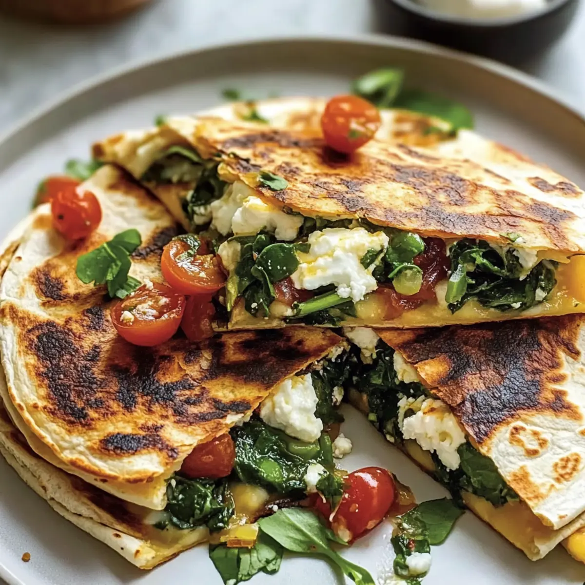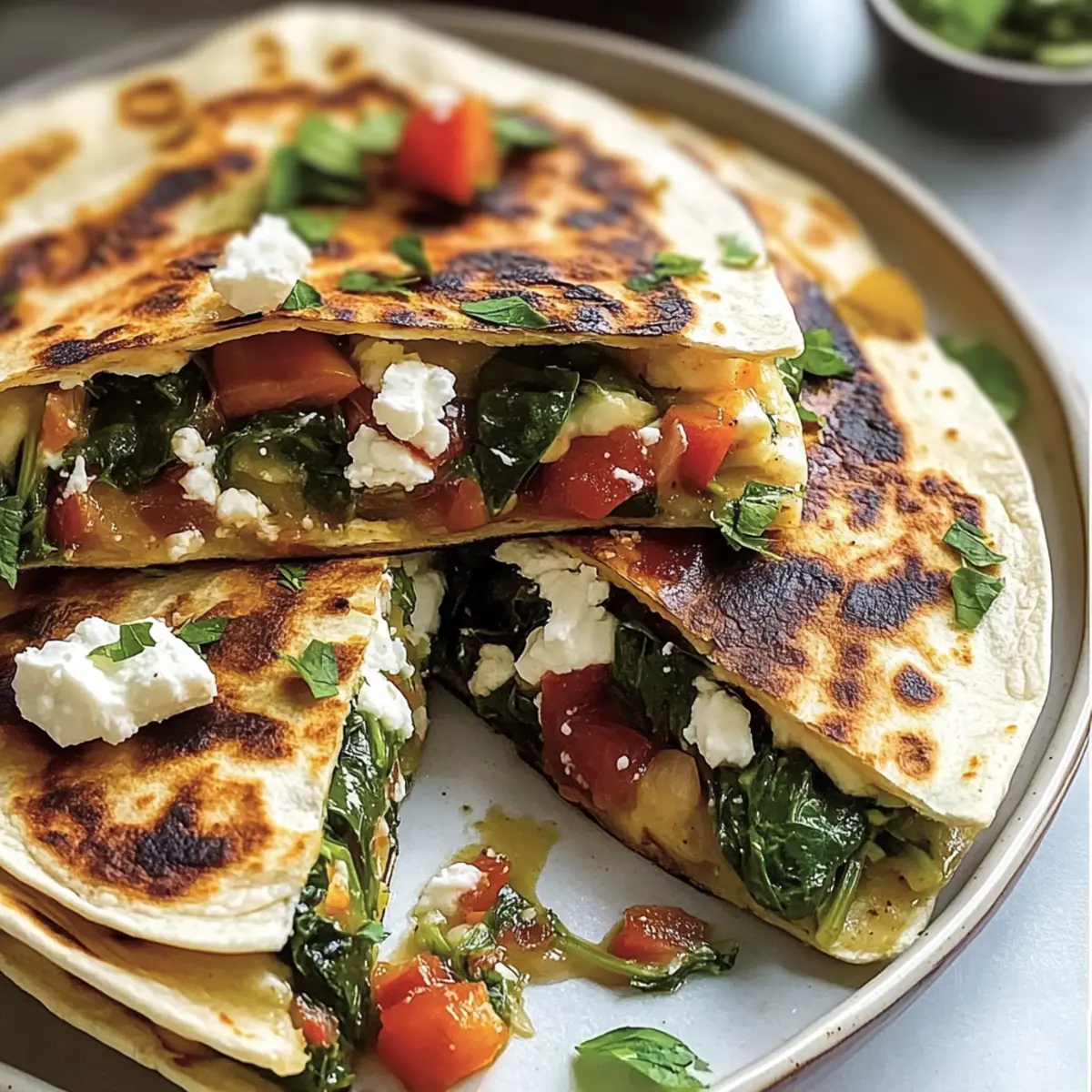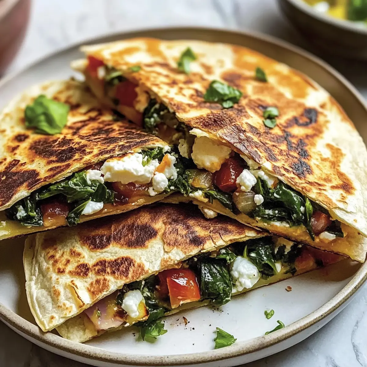 As I flipped through my collection of beloved recipes, a little lightbulb moment hit me—what if I combined the warm, comforting quesadilla with the vibrant flavors of the Mediterranean? And thus, the Mediterranean Quesadillas with Spinach, Feta, and Mozzarella were born! These beauties are not only a burst of color and flavor, but they also bring together a delightful mix of crispy tortillas, melty cheese, and savory vegetables—all ready in just 15 minutes. Perfect for busy weeknights or a leisurely lunch, this dish is a guaranteed crowd-pleaser and offers vegetarian (and even vegan!) options for those who seek a healthier twist. Are you ready to dive into a taste of the Mediterranean without leaving your kitchen? Let’s get cooking! Why Are Mediterranean Quesadillas a Must-Try? Versatile Flavors: These quesadillas effortlessly blend the fresh Mediterranean essence with the warmth of comfort food. Quick Preparation: With just 15 minutes from start to finish, they’re your go-to for a speedy yet delicious meal. Customizable Options: Whether you’re vegan or craving extra protein, you can adapt the filling to your liking. Crowd-Pleasing: Perfect for family dinners or gatherings, they’re sure to impress everyone at the table. If you’re looking for even more veggie-packed goodness, check out our delightful Mediterranean Chickpea Salad as a side dish! Mediterranean Quesadilla Ingredients For the Quesadilla • Flour Tortillas – The essential base that provides structure; substitute corn tortillas for a gluten-free option. • Fresh Spinach (1 cup, chopped) – Adds vibrant color and nutrition; remember to wash and dry it well. • Mozzarella Cheese (½ cup, shredded) – Brings a creamy and melty texture; for a vegan version, try dairy-free mozzarella. • Feta Cheese (½ cup, crumbled) – Infuses salty and tangy notes; goat cheese can also be a delightful substitute. • Tomato (1 small, diced) – Adds juiciness and brightness; Roma tomatoes are recommended, but any fresh tomato works! • Red Onion (¼ cup, thinly sliced) – Offers a sweet crunch; green onions provide a milder flavor if preferred. • Black Pepper (¼ teaspoon) – Enhances the overall flavor; feel free to adjust according to your spice preference. • Olive Oil (1 tablespoon) – Used for frying to achieve a crispy finish; you can substitute with avocado oil or butter. Step‑by‑Step Instructions for Mediterranean Quesadillas Step 1: Prepare the Filling In a mixing bowl, combine the shredded mozzarella, crumbled feta, chopped fresh spinach, diced tomato, thinly sliced red onion, and black pepper. Stir these ingredients together until evenly mixed and vibrant in color, ensuring that each component is well distributed. This filling will offer a burst of Mediterranean flavor once cooked. Step 2: Assemble the Quesadilla Lay one flour tortilla flat on a clean surface and spoon one-fourth of the prepared filling onto one half of the tortilla, leaving a small border for easy folding. Gently fold the tortilla over the filling to create a half-moon shape. Press it down lightly to seal the edges, ensuring that the mixture doesn’t escape during cooking. Step 3: Heat the Skillet Preheat a large skillet over medium heat and add one tablespoon of olive oil. Allow the oil to heat until shimmering but not smoking, which typically takes about 1-2 minutes. This step is crucial for achieving a perfectly crispy exterior on your Mediterranean quesadillas, making the most of that lovely, golden-brown finish. Step 4: Cook the Quesadilla Carefully place the filled tortilla in the hot skillet. Cook for about 3-4 minutes, or until the bottom is golden brown and the cheese begins to melt. Use a spatula to gently press down on the quesadilla, allowing the heat to evenly distribute and enhance the melting of the cheese. Step 5: Flip and Finish Cooking Once the first side is perfectly crispy, flip the quesadilla with the spatula. Cook for an additional 3-4 minutes on the other side until it reaches a similar golden-brown color and the cheese is fully melted. Keep an eye on it to avoid burning, and adjust the heat if necessary for perfect crispiness. Step 6: Slice and Serve Remove the quesadilla from the skillet and let it cool for a minute on a cutting board. Using a sharp knife, slice it into wedges for easy serving. The Mediterranean quesadilla can be served warm with your favorite dips such as salsa or guacamole, or even alongside a fresh side salad for a delightful meal. Expert Tips for Mediterranean Quesadillas • Preheat Your Pan: Ensure your skillet is fully heated to achieve a crispy golden-brown crust. A hot pan makes all the difference! • Don’t Overfill: While it’s tempting to load up on filling, overstuffing can lead to soggy quesadillas. Stick to just enough for the perfect balance! • Use Fresh Ingredients: Fresh spinach, ripe tomatoes, and quality cheeses elevate the flavor significantly. Opt for the best ingredients you can find! • Press While Cooking: Gently pressing down with a spatula helps the cheese melt evenly and ensures a well-cooked quesadilla both inside and out. • Bake Option: For a healthier choice, bake at 375°F for 10-15 minutes. Flip halfway for an evenly crispy finish without frying. What to Serve with Mediterranean Quesadillas? Elevate your Mediterranean Quesadillas into a complete meal with delightful sides and beverages that enhance their vibrant flavors. Salsa Fresca: The bright acidity of fresh tomato salsa cuts through the creaminess, adding a refreshing kick that complements each bite beautifully. Pair it with a splash of lime for an extra zing! Guacamole: Silky and smooth, guacamole brings a rich creaminess that balances the crispy texture of the quesadilla. This classic dip with its buttery avocado and hints of lime elevates the whole experience. Mixed Green Salad: A light salad with peppery arugula, crunchy cucumbers, and a tangy vinaigrette provides a perfect contrasting texture
