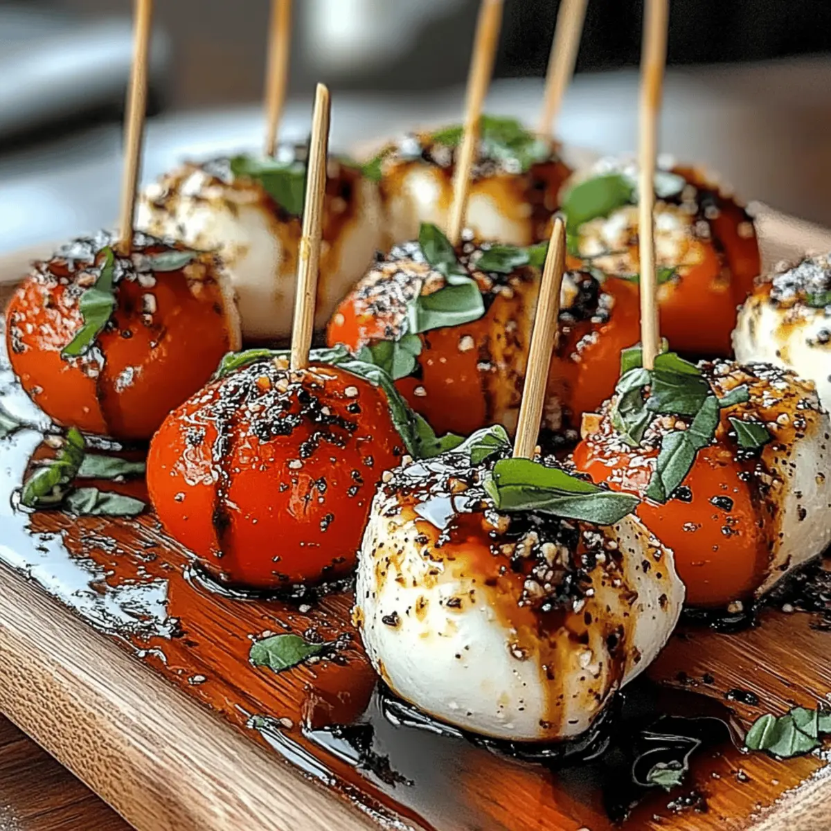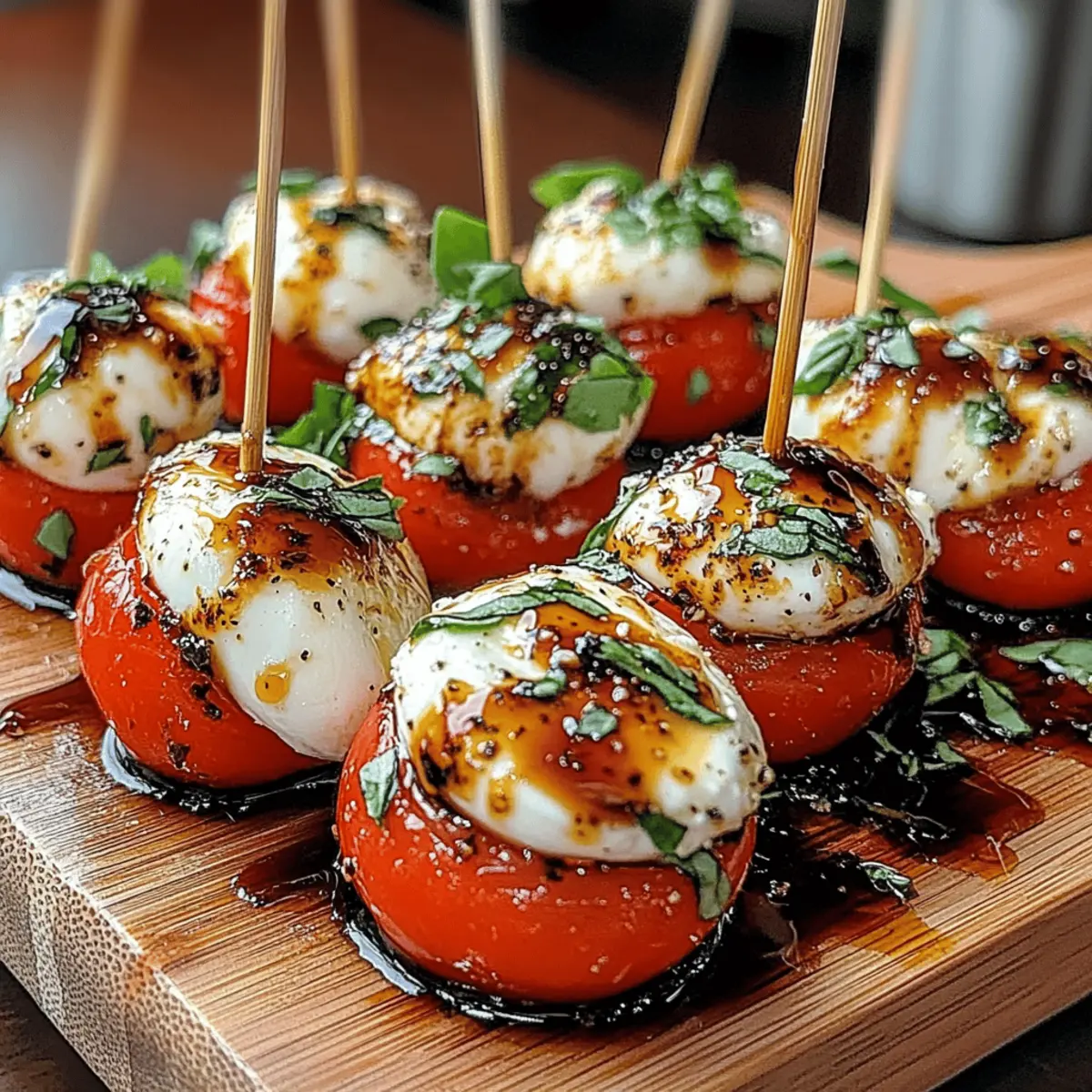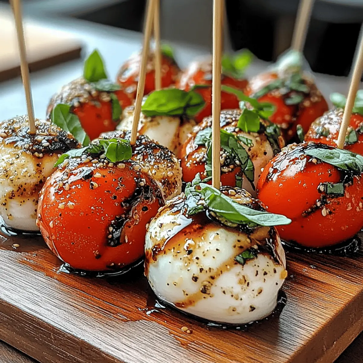 As I was preparing for a summer gathering, I stumbled upon a vibrant plate of Mini Caprese Bites that instantly transported me to a sun-drenched Italian patio. These delightful, bite-sized appetizers blend juicy cherry tomatoes, creamy mozzarella, and fragrant basil with a drizzle of tangy balsamic glaze, making them not only visually stunning but also a breeze to prepare. Perfect for impressing guests or celebrating quieter moments, these Mini Caprese Bites are a health-conscious snack option that is gluten-free and low-carb. Whether you’re hosting a lively party or enjoying a quiet evening with loved ones, these flavorful bites will undoubtedly steal the show. Curious about how to whip them up and bring a taste of Italy to your kitchen? Let’s dive in! Why Are Mini Caprese Bites a Must-Make? Deliciously Fresh: Each bite bursts with the vibrant flavors of summer, combining juicy tomatoes, creamy mozzarella, and aromatic basil. Effortless Assembly: This no-fuss recipe requires minimal prep, making them perfect for last-minute gatherings or relaxed weekends. Versatile Appeal: Whether you’re a vegetarian, gluten-free eater, or just someone looking for healthy snacks, these bites cater to various dietary needs. Crowd-Pleasing Gourmet: Impress your friends and family with these visually stunning appetizers that look gourmet yet are incredibly easy to make. Perfect Pairing: Enjoy them alongside a refreshing drink, like a crisp white wine or sparkling citrus-infused water for the full experience. Don’t miss out on other delightful recipes; check out these Cheesy Mashed Bites for a tasty side option! Mini Caprese Bites Ingredients For the Bites Cherry Tomatoes – Provide juiciness and sweetness; substitute with grape tomatoes if unavailable. Fresh Basil Leaves – Adds aromatic freshness and flavor; use other herbs like mint for a twist. Mozzarella Balls (Bocconcini) – Offers creamy texture and mild flavor; substitute with cubed fresh mozzarella or low-fat varieties. For the Drizzle Balsamic Glaze – Provides sweet and tangy notes; you can use a homemade balsamic reduction by simmering balsamic vinegar until thickened. Olive Oil – Enhances richness and flavor; opt for high-quality extra virgin olive oil for the best taste. Salt and Pepper – Essential for enhancing the flavors of the ingredients; use sea salt or freshly cracked black pepper for a superior taste. For Assembly Toothpicks or Small Skewers – Required for assembly; choose colorful skewers for a fun and visual appeal when serving. These delightful Mini Caprese Bites are the perfect combination of flavors, making for a snack that’s as healthy as it is delicious! Step‑by‑Step Instructions for Mini Caprese Bites Step 1: Prepare the Tomatoes Begin by washing your cherry tomatoes under cool running water. For an elevated flavor, preheat your oven to 400°F (200°C) and roast the tomatoes for 15-20 minutes until they blister and release their juices. This enhances their sweetness and adds a delightful depth, making your Mini Caprese Bites even more irresistible. Step 2: Prepare the Mozzarella While the tomatoes are roasting, drain and dry the mozzarella balls to avoid excess moisture that could make your bites soggy. If they are larger than your cherry tomatoes, slice them in half for uniformity. This will help ensure a perfect balance of flavors and textures in each Mini Caprese Bite you create. Step 3: Assemble the Bites Once your tomatoes have cooled slightly, it’s time to assemble your Mini Caprese Bites. Take a toothpick or small skewer and thread on one cherry tomato, followed by a fresh basil leaf, and finish with a mozzarella ball. Repeat for additional bites. Feel free to mix in variations or keep it simple, as each combination will still deliver delightful flavor. Step 4: Drizzle and Season After assembling all the bites, arrange them neatly on a serving platter. Drizzle a generous amount of high-quality extra virgin olive oil and balsamic glaze over the tops to enhance the flavors. Sprinkle with sea salt and freshly cracked black pepper to taste, elevating the taste of your Mini Caprese Bites for an even more enjoyable experience. Step 5: Chill and Serve For the best flavor, refrigerate the assembled Mini Caprese Bites for 10-15 minutes to allow the ingredients to meld together. Serving them chilled or at room temperature allows the vibrant flavors of the tomatoes, mozzarella, and basil to shine. Enjoy these easy-to-make appetizers at your next gathering or snack time! How to Store and Freeze Mini Caprese Bites Fridge: Store leftover Mini Caprese Bites in an airtight container; they’ll stay fresh for up to 2-3 days. Enjoy them cold for the best flavor! Freezer: While not ideal for freezing, if you must, place the bites in a single layer on a baking sheet, freeze until solid, then transfer them to a freezer bag. Consume within a week for optimal taste. Reheating: Reheating isn’t recommended, as it can alter the texture. Instead, serve chilled or at room temperature to enjoy the vibrant flavors. Meal Prep: For easy assembly, prep ingredients ahead of time, but assemble the bites fresh to ensure the tomatoes and basil maintain their crunch and flavor. What to Serve With Mini Caprese Bites The perfect accompaniments can elevate your delightful bites to a stunning meal experience. Crispy Garlic Bread: The crunchy edges and soft center complement the refreshing Mini Caprese Bites exquisitely—perfect for sopping up any remaining balsamic glaze. Mixed Green Salad: A light, peppery arugula or kale salad will bring a fresh contrast to the creamy mozzarella and juicy tomatoes, enhancing the overall meal. Grilled Veggies: Charred bell peppers and zucchini add warmth and a smoky flavor that balances the freshness of the bites beautifully. Italian Antipasto Platter: Pair them with olives, salami, and marinated artichokes to add a variety of textures and flavors, creating a colorful spread that dazzles the eye. Sp