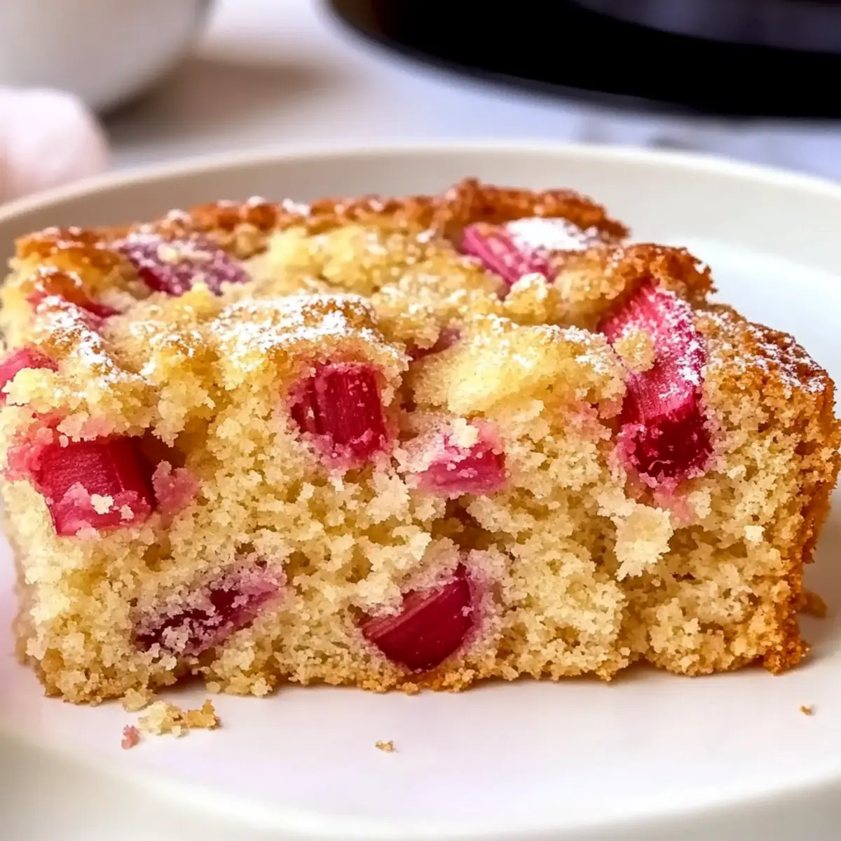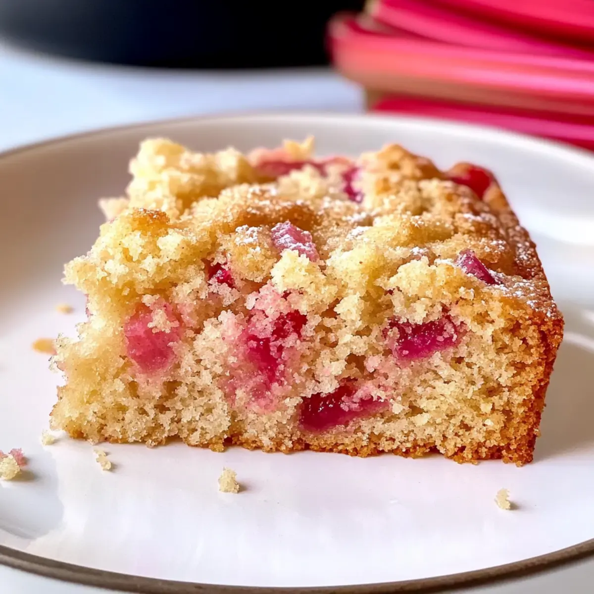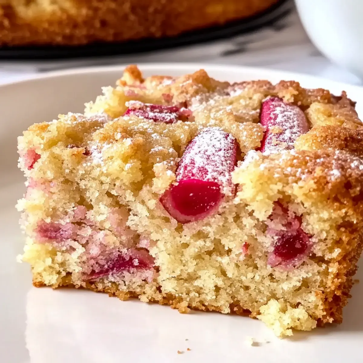 The aroma of spring fills the air as the vibrant green stalks of rhubarb peek through the thawing soil. This Moist Rhubarb Cake captures that very essence, blending the tangy zest of rhubarb with a touch of sweetness that defines the season. Not only is this cake a delightful balance of flavors, but it’s also incredibly easy to prepare, making it a perfect choice for both bustling weekdays and leisurely weekend gatherings. Its tender crumb ensures a satisfying slice every time, and it pairs beautifully with a dollop of whipped cream or a scoop of vanilla ice cream for extra indulgence. Are you ready to whisk up a piece of spring on your plate? Why is This Cake a Spring Must-Make? Simplicity: This Moist Rhubarb Cake comes together effortlessly, making it ideal for both novice bakers and seasoned pros. Fruity Vibrance: The tart rhubarb sings alongside a touch of sweetness, creating a dessert that’s as colorful as it is flavorful. Versatile Pairings: Enjoy it with whipped cream, a scoop of ice cream, or a drizzle of warm custard to elevate your dessert experience. Perfect for Any Occasion: Whether you’re hosting a spring gathering or simply craving a sweet treat, this cake fits all occasions beautifully. Make-Ahead Friendly: You can whip it up in advance, with easy storage options allowing you to savor it for days to come. For more delightful spring flavors, check out this Cheesecake Fruit Salad or indulge in a slice of Bourbon Peach Cake. Moist Rhubarb Cake Ingredients • Here’s what you need to create this delight! For the Batter Rhubarb – Use fresh, firm stalks, chopped into 1/2 inch pieces for the perfect tart balance in your Moist Rhubarb Cake. Butter – Softened to room temperature, it ensures a rich and moist cake. Sugar – Standard granulated sugar sweetens the batter and aids in browning. Egg – Room temperature helps bind all the ingredients smoothly. Vanilla Extract – Pure vanilla enhances the overall flavor profile beautifully. All-Purpose Flour – Provides structure; coat the rhubarb in a bit of flour to prevent sinking. Baking Powder – This leavening agent helps the cake rise to a light, fluffy texture. Salt – Just a pinch balances the sweetness beautifully. Half and Half (or buttermilk) – Adds moisture and tenderness to the cake. Feel free to gather these ingredients, and let’s bake something delicious together! Step‑by‑Step Instructions for Moist Rhubarb Cake Step 1: Preheat and Prepare Preheat your oven to 350°F (175°C) while you butter a 9×9 inch baking pan. Ensure the butter coats the bottom and sides generously to prevent the cake from sticking. As the oven warms up, you’ll prepare the buttermilk, adding lemon juice to the half and half, allowing it to curdle and create a creamy mixture that adds moisture. Step 2: Cream Butter and Sugar In a stand mixer, beat together the softened butter and sugar until the mixture is light and fluffy, about 3-5 minutes. This aeration is key for a tender cake. Next, crack the room-temperature egg into the mix, followed by the pure vanilla extract, and mix until fully combined, ensuring no lumps remain in your creamy batter. Step 3: Prepare the Rhubarb Toss your chopped rhubarb in a tablespoon of all-purpose flour. This step not only helps distribute the tart pieces evenly throughout the batter but also prevents them from sinking during baking. Set the prepared rhubarb aside as you mix the dry ingredients for your Moist Rhubarb Cake. Step 4: Combine Dry Ingredients In a separate bowl, combine the remaining all-purpose flour, baking powder, and a pinch of salt. Whisk these dry ingredients together thoroughly, ensuring an even distribution of the leavening agent which is crucial for a light texture. Gradually adding this mixture to the wet batter is the next essential step. Step 5: Mix the Batter Carefully add the dry mixture to the creamy butter batter, alternating with the curdled buttermilk. Mix just until combined; overmixing may lead to a dense cake. Look for a thick, smooth batter forming, and take care to maintain a light touch to keep your Moist Rhubarb Cake fluffy and airy. Step 6: Fold in the Rhubarb Gently fold in the floured rhubarb pieces using a spatula, distributing them throughout the batter. The bright pink and green pieces of rhubarb add a beautiful color and flavor to the cake. Once folded, pour the batter into your prepared baking pan, spreading it evenly to promote even baking. Step 7: Sprinkle and Bake Sprinkle a light layer of sugar over the top of the batter; this will create a slightly crispy crust while baking. Place the pan in the preheated oven and bake for 40 to 45 minutes, or until a toothpick inserted into the center comes out clean or with a few moist crumbs attached. Keep an eye on the surface for a golden brown appearance. Step 8: Cool and Serve Once baked, remove the Moist Rhubarb Cake from the oven and allow it to cool in the pan for about 10 minutes. Then, carefully transfer it to a wire rack to cool completely. Slice into squares and serve warm or at room temperature, enjoying the delightful balance of tart rhubarb and sweet cake for your spring gatherings. What to Serve with Moist Rhubarb Cake? Imagine a sunny afternoon where the sweet and tangy aroma of rhubarb wafts through your kitchen, and it’s just begging to be paired with something delightful. Whipped Cream: A dollop of freshly whipped cream adds a light, fluffy texture that beautifully complements the tartness of the cake. Vanilla Ice Cream: The classic pairing of cool vanilla ice cream creates a creamy contrast that enhances the cake’s sweet and sour balance while melting slightly on warm slices. Warm Custard: Drizzling warm custard over a piece offers an indulgent touch, adding richness that wraps around each forkful perfectly. Fresh Berries: Serve alongside a medley of fresh strawberries or blueberries for a burst of color and juicy freshness that echoes spring’s essence. Mint Tea: A soothing glass of 