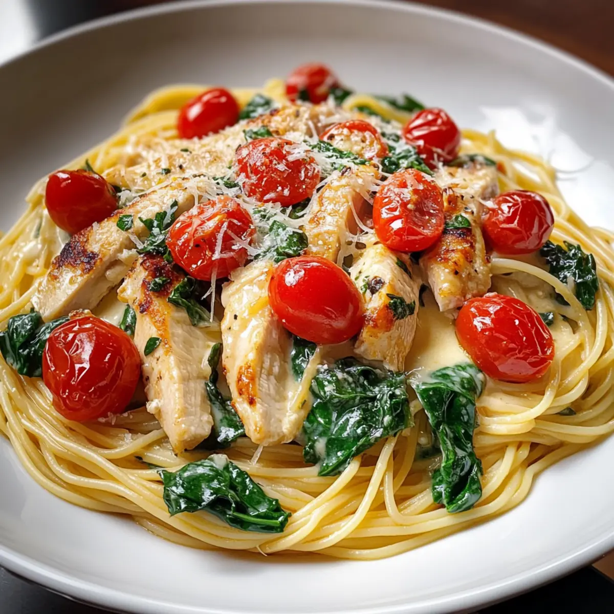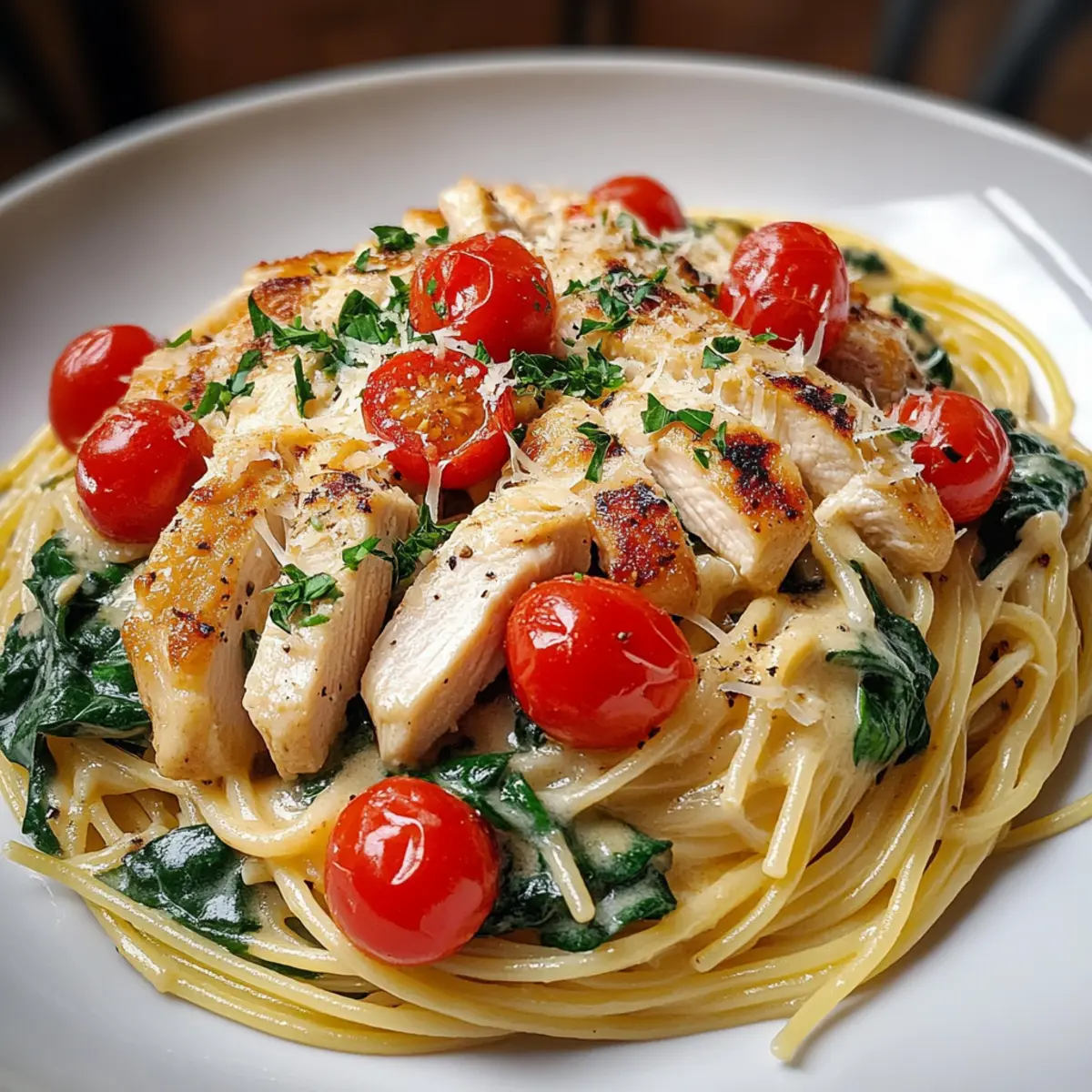 As I stirred the pot, the inviting aroma of sautéed garlic and fresh chicken filled my kitchen, instantly lifting my spirits after a long day. If you’re on the lookout for a cozy weeknight dinner, let me introduce you to my creamy Monterey Chicken Spaghetti, a dish that combines tender chicken with a rich Monterey Jack sauce and vibrant cherry tomatoes. This recipe is not only delicious but also perfect for beginners, making it an ideal choice for anyone tired of takeout. Plus, the quick prep time means you can whip it up in under thirty minutes, leaving you plenty of time to enjoy the little things in life. Curious to discover how this comforting meal comes together? Let’s dive in! Why is Monterey Chicken Spaghetti a Must-Try? **Comforting ** flavors: This creamy dish wraps you in a warm hug, making it an instant favorite for cozy dinners. **Quick ** prep: With under 30 minutes of cooking time, it’s perfect for busy weeknights when you crave homemade goodness without the fuss. **Beginner-friendly **: Ideal for novice chefs, this recipe walks you through each step with ease, ensuring success every time. **Endless ** versatility: Customize with your choice of vegetables or even swap chicken for tofu, creating a meal that suits every palate. **Crowd-pleaser **: Whether it’s a family dinner or a gathering with friends, everyone will love this delightful twist on a classic dish. For those looking for other delightful chicken recipes, consider trying Buffalo Chicken Tacos or Grilled BBQ Chicken Skewer Salad! Monterey Chicken Spaghetti Ingredients For the Chicken • Boneless, Skinless Chicken Breasts – Main protein source; for extra flavor, substitute with chicken thighs, adjusting cooking time as needed. • Olive Oil – Essential for cooking chicken and sautéing vegetables while enhancing flavors. For the Pasta • Spaghetti – Provides the perfect base for this creamy Monterey Chicken Spaghetti; feel free to use your favorite pasta shape. For the Sauce • Chicken Broth – Adds depth and moisture; can be replaced with vegetable broth for a vegetarian option. • Heavy Cream – Contributes to the rich, velvety texture; consider non-dairy alternatives for a lighter version. • Monterey Jack Cheese – The star of this creamy sauce; for a different taste, use cheddar or another melty cheese. • Onion – Offers aromatic flavor; yellow or white onion works best for this dish. • Garlic – Elevates the overall flavor profile; fresh minced garlic is recommended for optimal taste. For the Vegetables • Cherry Tomatoes – Adds a touch of sweetness and juiciness; feel free to substitute with other tomato varieties or omit them altogether. • Fresh Spinach – Provides vibrant color and nutrition; can be swapped with kale or other leafy greens for variety. For Seasoning and Garnish • Salt and Pepper – Essential seasonings to enhance flavors; adjust these to suit your taste. • Parmesan Cheese – Optional garnish that adds a salty richness; easily omitted if desired. • Fresh Parsley or Cilantro – For garnish, adds a pop of color and fresh flavor to finish the dish elegantly. Dive into this creamy Monterey Chicken Spaghetti and experience cozy comfort food at its finest! Step‑by‑Step Instructions for Monterey Chicken Spaghetti Step 1: Boil the Pasta Start by bringing a large pot of salted water to a rolling boil over high heat. Once boiling, add your spaghetti and cook according to package instructions until al dente, which typically takes about 8-10 minutes. When done, drain the pasta and set it aside while you prepare the rest of the Monterey Chicken Spaghetti. Step 2: Cook the Chicken In a large skillet, heat 2 tablespoons of olive oil over medium heat. Season your boneless, skinless chicken breasts with salt and pepper, then carefully place them in the skillet. Sauté for 5-7 minutes on each side, or until the chicken is golden brown and reaches an internal temperature of 165°F (74°C). Once cooked, transfer the chicken to a plate and slice into strips. Step 3: Sauté the Aromatics In the same skillet, add an additional drizzle of olive oil if needed, and toss in one diced onion and two cloves of minced garlic. Sauté over medium heat for 2-3 minutes until the onion becomes translucent and fragrant, making sure to stir occasionally to prevent burning. This aromatic base will enhance the flavor of your Monterey Chicken Spaghetti. Step 4: Create the Sauce Pour in 1 cup of chicken broth and bring it to a gentle simmer. Once it’s bubbling, whisk in 1 cup of heavy cream along with 2 cups of shredded Monterey Jack cheese. Stir the mixture continuously until the cheese is melted and the sauce is creamy and smooth. This richness will create the heart of your Monterey Chicken Spaghetti. Step 5: Add the Vegetables Next, introduce 1 cup of halved cherry tomatoes and 2 cups of fresh spinach to your skillet. Stir gently and cook for an additional 3-4 minutes until the spinach is wilted and the tomatoes are slightly softened. These vibrant veggies add both color and nutrition, making this Monterey Chicken Spaghetti even more delightful. Step 6: Combine Pasta and Chicken Return the sliced chicken back to the skillet, along with the drained spaghetti. Carefully toss everything together, ensuring the sauce coats the pasta and chicken evenly. Let all the ingredients simmer together for just a minute to meld the flavors beautifully, creating a comforting dish that’s ready to serve. Step 7: Season and Serve Taste your Monterey Chicken Spaghetti and adjust the seasoning with additional salt and pepper, if desired. Once seasoned to your liking, serve the dish hot, garnishing with grated Parmesan cheese and a sprinkle of fresh parsley or cilantro. This final touch adds a burst of freshness and makes each bowl irresistible. Make Ahead Options These Creamy Monterey Chicken Spaghetti dishes are perfect for meal prep enthusiasts! You can prepare the sauce, including the sautéed aro
