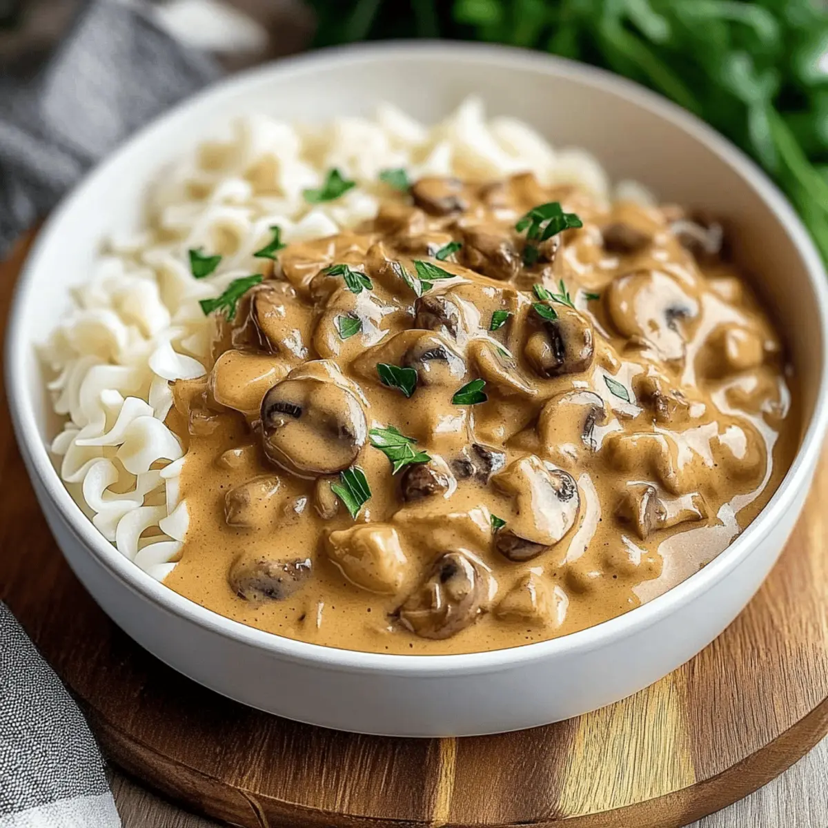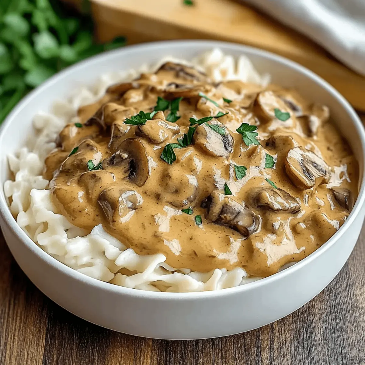 As I stood in my kitchen, the earthy aroma of sautéed mushrooms instantly transported me back to my grandmother’s table, where comfort food was the centerpiece of every family gathering. Today, I’m excited to share my Hearty Mushroom and Seitan Stroganoff, a dish that beautifully merges the rich flavors of mushrooms and chewy seitan, creating a delicious meal that’s both satisfying and vegetarian-friendly. Ready in under 45 minutes, this recipe is perfect for casual dinners or cozy get-togethers, proving that comfort food can be wholesome and delectable. It also slides seamlessly into any pantry, allowing for quick prep with a few staple ingredients. Ready to whip up this delightful twist on a classic? Let’s dive into the details! Why is Mushroom and Seitan Stroganoff Special? Rich, Comforting Flavors: This dish combines the umami of mushrooms and the hearty texture of seitan, making it a crowd-pleaser even among meat lovers. Quick and Easy: Ready in under 45 minutes, it’s perfect for busy weeknights when you crave something delicious without spending hours in the kitchen. Versatile Options: Whether you need a vegan alternative or wish to elevate the dish with added greens, this stroganoff is adaptable to your taste and dietary needs. Satisfying Texture: The creamy sauce envelops tender noodles, providing a luscious mouthfeel that mirrors traditional beef stroganoff without compromising on flavor. Best enjoyed alongside a crisp salad or even with crusty bread, this meal is a fantastic way to warm up your evenings. Don’t forget to check out my Garlic Butter Mushroom recipe for another quick filler for your kitchen! Mushroom and Seitan Stroganoff Ingredients • Perfect ingredients for this comforting dish. For the Sauce Olive Oil – Provides fat for sautéing and depth of flavor. Onion – Adds sweetness and aromatics to the base; shallots can offer a milder note. Garlic – Enhances overall flavor; fresh cloves are ideal, but pre-minced is fine if you’re in a rush. Mushrooms (10 ounces) – The star ingredient for umami and texture; cremini or button mushrooms work best for this Mushroom and Seitan Stroganoff. Seitan (8 ounces) – Acts as a protein-rich, chewy substitute for meat; consider tempeh for a gluten-free option. Flour (1 tablespoon) – Thickens the stroganoff sauce; gluten-free flour is a great substitute for those with dietary restrictions. Vegetable Broth (1 ½ cups) – Adds moisture and a flavorful backdrop; homemade broth enhances richness. Dairy-Free Sour Cream (1 cup) – Provides creaminess to the sauce; regular sour cream works as an alternative if preferred. Dijon Mustard (1 tablespoon) – Brings tang and depth; yellow mustard can work in a pinch. Soy Sauce or Tamari (1 tablespoon) – Imparts saltiness and umami; tamari is excellent for gluten-free diets. Smoked Paprika (1 teaspoon) – Adds a subtle smokiness; regular paprika can be used instead. Thyme (½ teaspoon) – Brings fresh herby notes to the dish; use fresh thyme for the best flavor. Salt and Pepper – Essential for seasoning to taste. For Serving Wide Egg Noodles or Pappardelle – The ideal base for this dish; swap for gluten-free pasta to cater to gluten sensitivities. Now that you’ve gathered all the necessary ingredients, let’s get cooking! This Mushroom and Seitan Stroganoff is sure to become a family favorite. Step‑by‑Step Instructions for Mushroom and Seitan Stroganoff Step 1: Prep Ingredients Start by finely chopping one onion and mincing two cloves of garlic. Clean and slice about 10 ounces of mushrooms, and slice 8 ounces of seitan into thin strips. This preparation sets the stage for your delicious Mushroom and Seitan Stroganoff, ensuring everything is ready for seamless cooking. Step 2: Sauté Onions In a large skillet, heat 2 tablespoons of olive oil over medium heat. Add the chopped onions and cook for 5-7 minutes until they become translucent and tender, stirring occasionally to prevent sticking. The softened onions will provide a sweet base for the stroganoff that follows. Step 3: Add Garlic Once the onions are translucent, stir in the minced garlic and sauté for an additional 1-2 minutes until fragrant. Be careful not to let the garlic burn, as it can become bitter. This step enhances the flavor profile of your Mushroom and Seitan Stroganoff beautifully. Step 4: Cook Mushrooms Next, increase the heat to medium-high, adding the sliced mushrooms to the skillet. Cook for 8-10 minutes, stirring often, until the mushrooms release their moisture and turn golden brown. This caramelization contributes rich umami flavors to your dish. Step 5: Brown Seitan Push the cooked mushrooms to one side of the skillet, creating space to add the seitan strips. Allow them to brown for 3-4 minutes on the other side, stirring occasionally. This will give your Mushroom and Seitan Stroganoff a hearty texture that mimics traditional beef stroganoff. Step 6: Make Sauce Sprinkle 1 tablespoon of flour evenly over the mushroom and seitan mixture, stirring well for about 2 minutes to cook off the raw flour. Then, gradually pour in 1 ½ cups of vegetable broth while stirring continuously until the mixture is smooth and begins to thicken, creating a rich sauce. Step 7: Add Remaining Ingredients Stir in 1 cup of dairy-free sour cream, 1 tablespoon each of Dijon mustard and soy sauce, 1 teaspoon of smoked paprika, and ½ teaspoon of thyme. Let the sauce simmer for 5-7 minutes, stirring often, until it thickens further and the flavors meld together perfectly in your Mushroom and Seitan Stroganoff. Step 8: Cook Pasta While the sauce simmers, bring a separate pot of salted water to a boil and cook your pasta (wide egg noodles or pappardelle) according to package instructions for al dente. Drain the pasta, but do not rinse, allowing it to retain some starch to help the sauce adhere. Step 9: Combine & Serve Finally, either combine the cooked pasta directly with the Mushroom and Seitan Stroganoff sauc