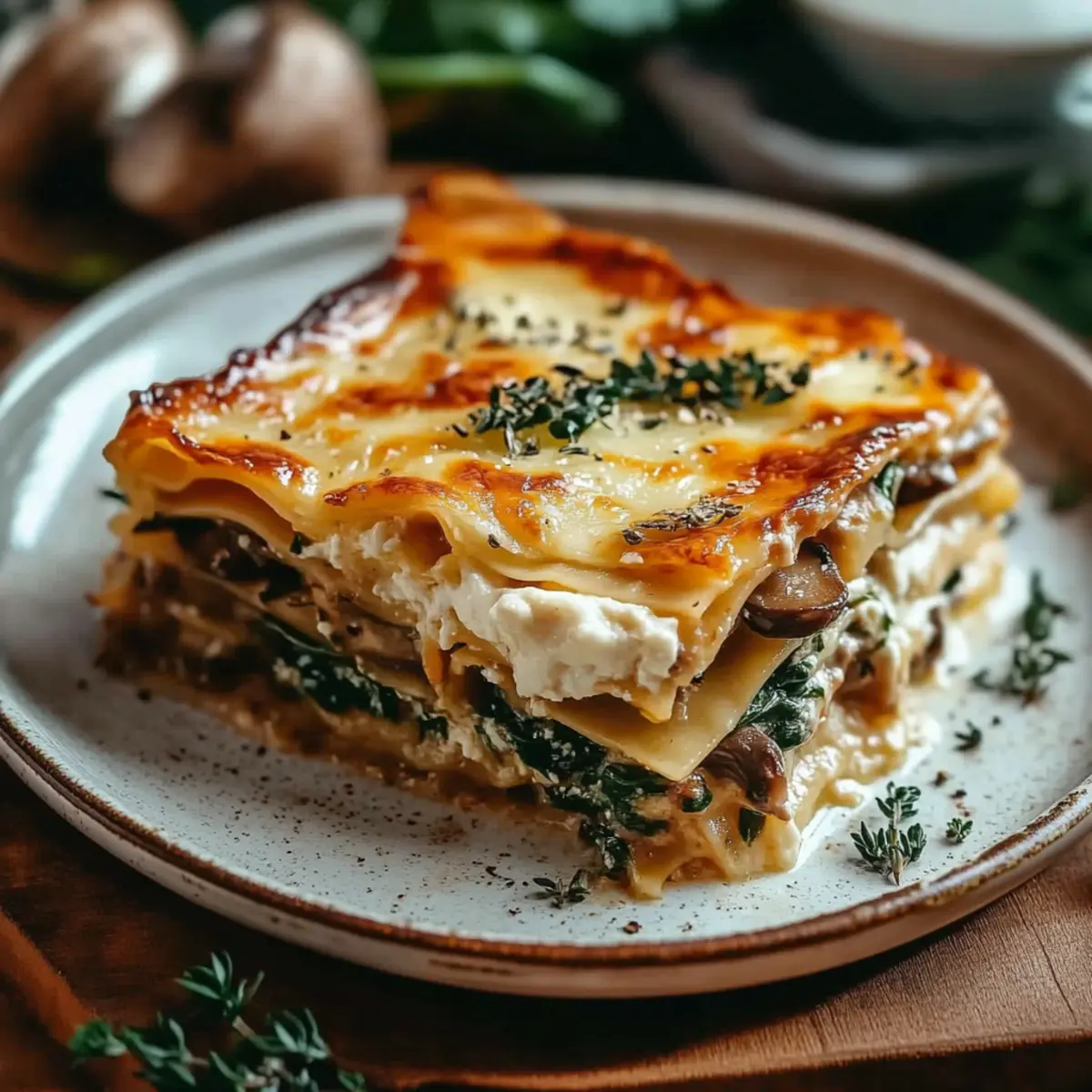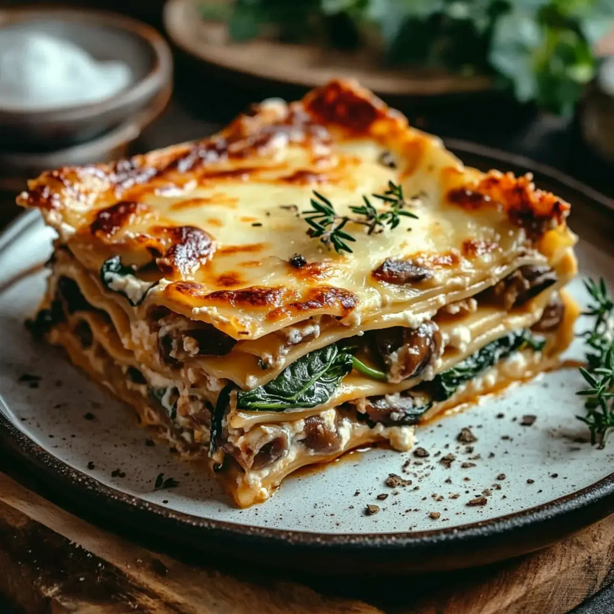 A creamy Mushroom and Spinach Lasagna packed with nutritious spinach and rich cheeses, perfect for busy weeknights.