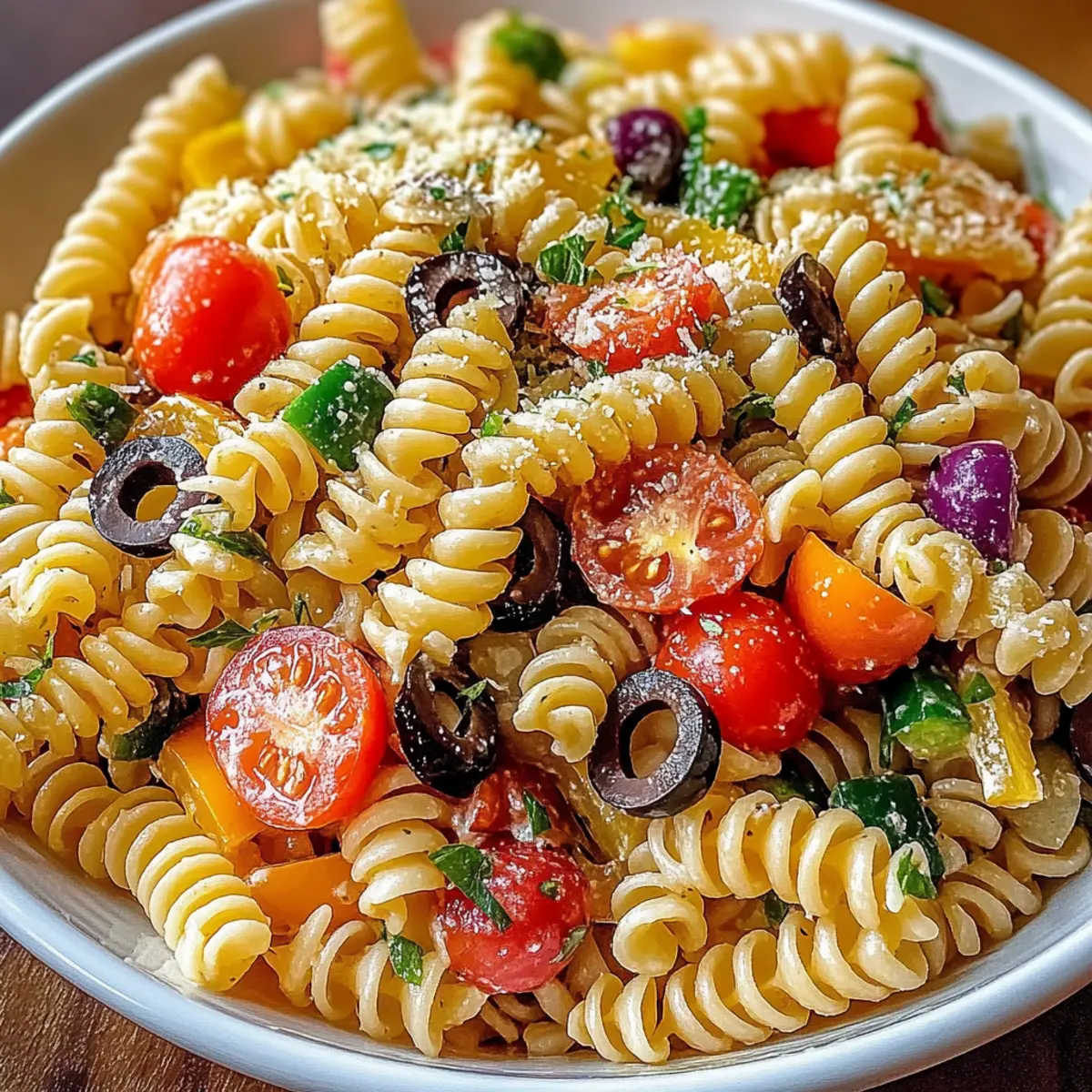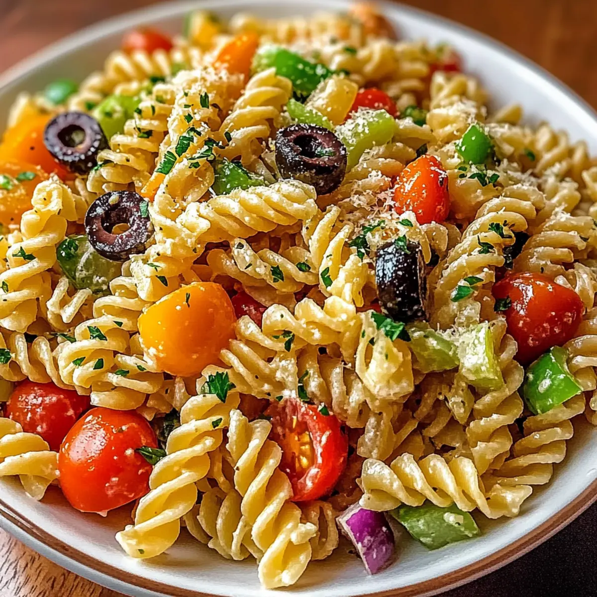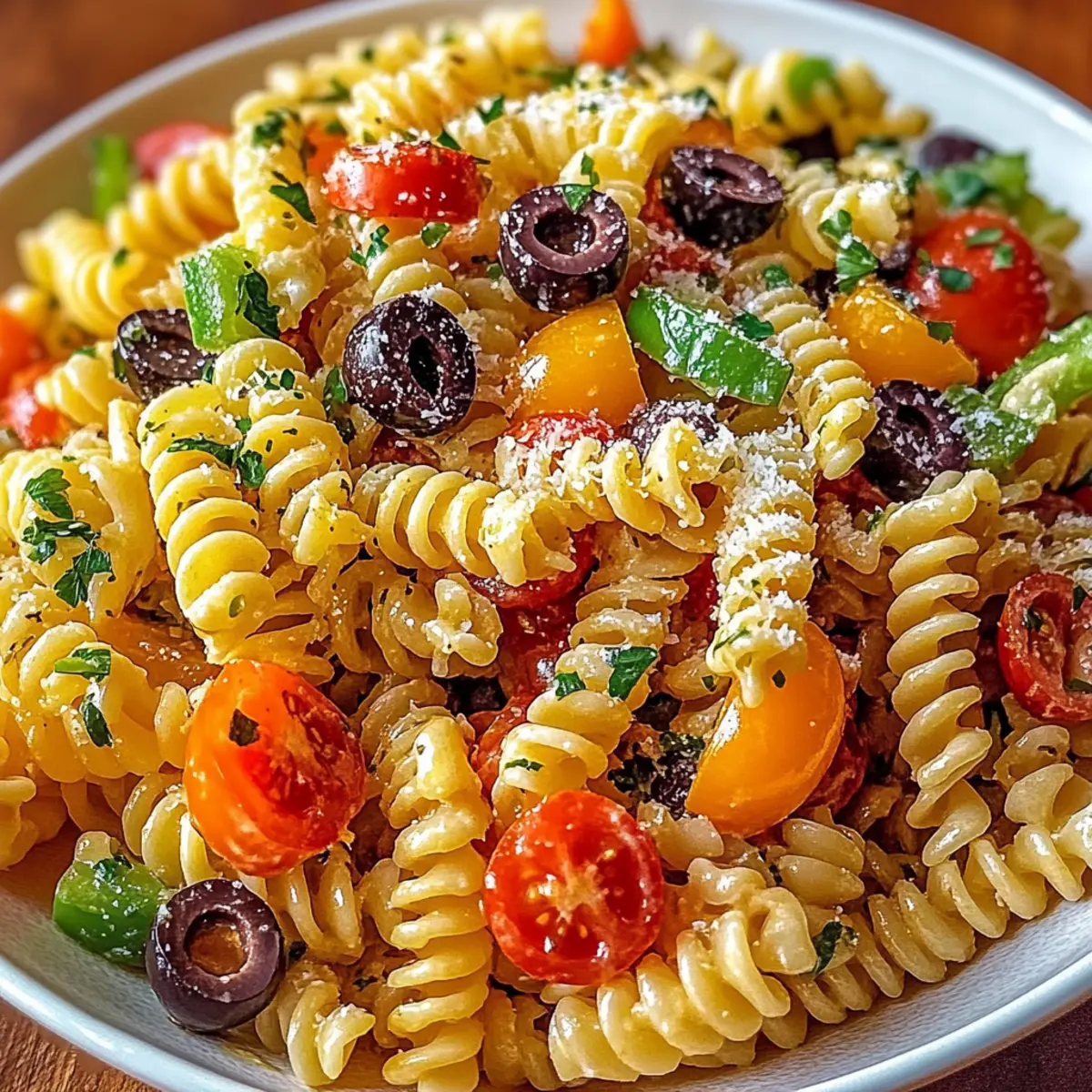 As the sun starts to shine brighter, the call for vibrant, fresh meals becomes impossible to ignore. Enter my Olive Garden Copycat Pasta Salad—an easy recipe that bursts with the spirit of summer! Featuring perfectly cooked rotini, crisp bell peppers, and juicy cherry tomatoes, this dish is a celebration of color and flavor that’s incredibly simple to prepare. Not only does it serve as a delightful side dish for gatherings or barbecues, but it also shines as a quick weekday meal, ideal for anyone looking to step away from fast food. With the perfect zesty Italian dressing holding it all together, every bite is a splash of happiness that transports you straight to an Italian trattoria. Curious about how you can make this dish your own with easy variations? Let’s dive in! Why Try This Pasta Salad Recipe? Vibrant Colors: The combination of fresh bell peppers, juicy cherry tomatoes, and creamy mozzarella make this dish a feast for the eyes. Effortless Prep: With just a handful of ingredients and easy steps, you’ll have a delightful salad ready in no time. Endless Variations: Customize it by adding grilled chicken, shrimp, or swapping veggies to match your taste—like trying the refreshing Mediterranean Chickpea Salad! Perfect for Any Occasion: This pasta salad shines as a side for summer barbecues or as a light and satisfying main dish during lunch. Crowd-Pleasing Flavor: The zesty Italian dressing ensures it’s a hit at any gathering, leaving guests coming back for more! Healthy and Fresh: Packed with nutritious ingredients, this recipe allows you to enjoy delicious bites guilt-free. Olive Garden Copycat Pasta Salad Ingredients • For anyone craving a refreshing dish! For the Pasta • Rotini Pasta – The perfect base for holding the zesty dressing; penne or fusilli can be great alternatives. For the Dressing • Italian Dressing – Essential for flavor; Olive Garden Signature brings out the best, but homemade works too! For the Veggies • Red Bell Pepper – Adds a sweet crunch; can substitute with yellow or orange for a twist. • Green Bell Pepper – Brings crunch and balances sweetness with slight bitterness. • Red Onion – Provides a sharp bite; slicing thinly helps to mellow the flavor. • Carrot – Sweetness and crunch add to the texture; grated for even distribution. • Cherry Tomatoes – Adds fresh acidity; halved to enhance juiciness. For the Sides • Black Olives – Complements flavors with a briny touch that ties everything together. • Mozzarella Cheese – Offers creaminess; cube it to maintain perfect texture. • Parmesan Cheese – Sprinkles umami magic; use grated for seamless mixing. For Seasoning • Italian Seasoning – Infuses the salad with aromatic flavors that elevate every bite. • Salt and Pepper – Essential for bringing all the flavors together; season to taste. • Fresh Parsley – A colorful garnish that adds a touch of freshness. This Olive Garden Copycat Pasta Salad not only stands out in flavor but also allows for easy modifications to suit your taste! Step‑by‑Step Instructions for Olive Garden Copycat Pasta Salad Step 1: Cook the Pasta Begin by bringing a large pot of salted water to a rolling boil. Once boiling, add the rotini pasta and cook according to the package instructions, usually about 8–10 minutes, until al dente. Drain the pasta and immediately rinse it under cold water to stop the cooking process and cool it down, creating the perfect base for the Olive Garden Copycat Pasta Salad. Step 2: Combine the Base In a large mixing bowl, add the cooled rotini pasta along with the Italian dressing and grated Parmesan cheese. Use a spatula to gently fold the ingredients together until the pasta is evenly coated with the dressing and cheese. This step is crucial as it sets the flavor foundation for your salad, so make sure each piece of pasta is deliciously dressed. Step 3: Add the Vegetables Next, incorporate the diced red bell pepper, green bell pepper, thinly sliced red onion, grated carrot, halved cherry tomatoes, and black olives into the pasta mixture. Use a gentle tossing motion to ensure that all the vegetables are evenly distributed throughout the salad, enhancing the colorful appearance and adding a crunchy texture that balances beautifully with the pasta. Step 4: Fold In the Cheese Now, it’s time to add the creamy mozzarella cheese. Take the cubed mozzarella and fold it into the salad carefully, being mindful not to crush the cheese. This step enhances the richness of the Olive Garden Copycat Pasta Salad and adds a delightful creaminess that complements the other ingredients without overwhelming them. Step 5: Season the Salad Sprinkle Italian seasoning, salt, and pepper over your pasta salad to taste. Toss the mixture lightly to incorporate the spices, ensuring every bite is seasoned just right. Seasoning at this stage allows the flavors to combine, creating a vibrant and well-rounded taste profile that makes this salad truly pop. Step 6: Chill the Salad Cover the bowl with plastic wrap or a lid and place it in the refrigerator for at least 1 hour. This chilling time is essential as it allows the flavors to meld together beautifully, creating a more cohesive and delicious Olive Garden Copycat Pasta Salad. If time permits, chilling for longer will make the salad even better. Step 7: Serve and Garnish Before serving, give the pasta salad a gentle toss to redistribute the ingredients. Transfer it to a serving dish and garnish with freshly chopped parsley for an added touch of color and freshness. This makes your Olive Garden Copycat Pasta Salad a stunning centerpiece, inviting your guests to dive into a flavorful and vibrant dish. Olive Garden Copycat Pasta Salad Variations Customize your Olive Garden Copycat Pasta Salad with these delightful twists that will invigorate your dining experience! Protein-Packed: Add grilled chicken or shrimp for a satisfying boost of protein, making it a heartier meal. It’s an ef