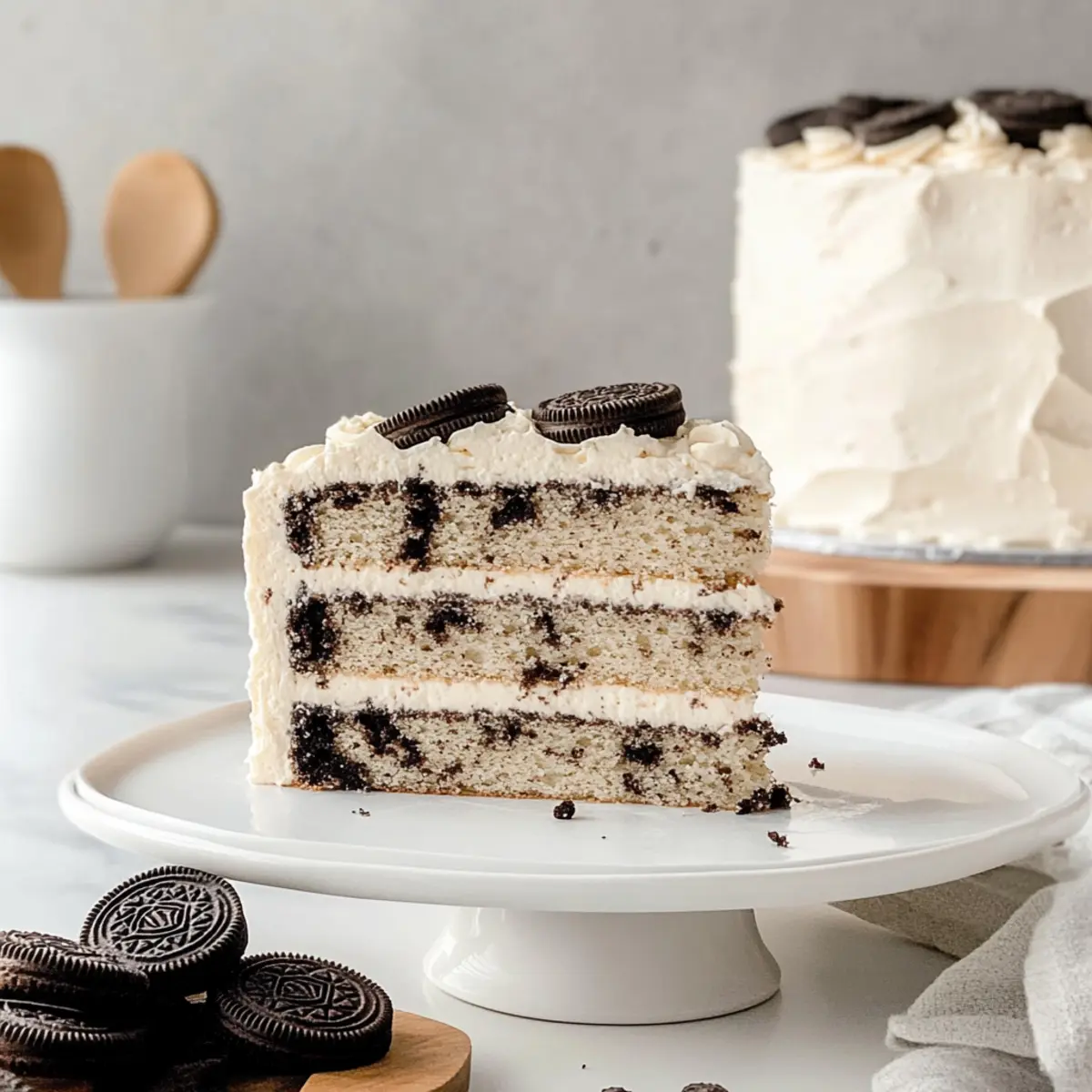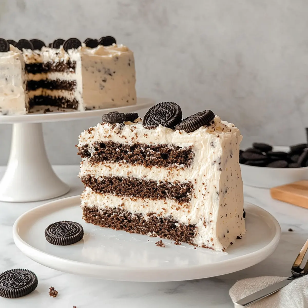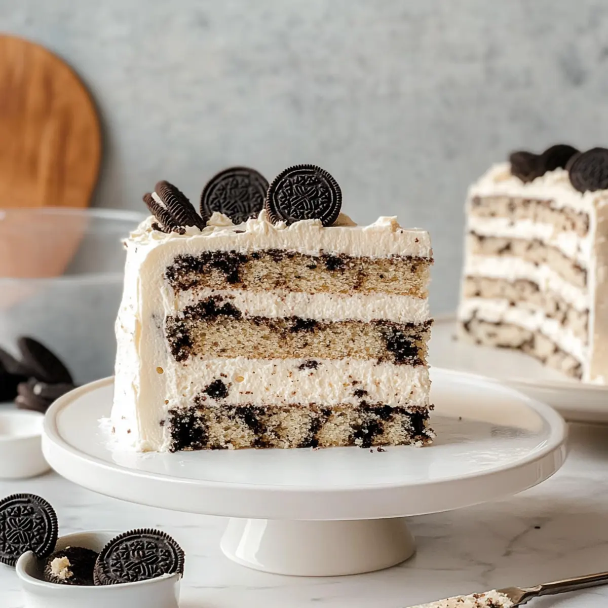 The scent of fresh cake wafting through the kitchen is pure bliss, isn’t it? As I stood there, gazing at my latest creation—the Oreo Layer Cake—I couldn’t help but smile. This cake is a true ode to the beloved Oreo cookie, featuring vanilla layers that are infused with crushed Oreos and topped with a tangy cream cheese frosting that perfectly complements the chocolatey goodness. Best of all, this recipe is not only simple to whip up, but it also has that wow factor that makes it a crowd-pleaser! Whether you’re celebrating a special occasion or just treating yourself on a Tuesday, this luscious dessert is sure to satisfy your sweet cravings. Ready to dive into the layers of nostalgia? Let’s get baking! Why Is This Oreo Layer Cake Irresistible? Decadent Flavor: Each slice of this Oreo Layer Cake offers rich chocolate and creamy vanilla flavor that will make your taste buds dance. Easy to Make: With simple ingredients and straightforward steps, this recipe is designed for anyone, even novice bakers. Visual Appeal: The layers of contrasting colors and crushed Oreo decorations make it as beautiful as it is delicious—perfect for impressing guests! Versatile Treat: Enjoy it as-is, or customize with unique frosting flavors, like a luscious chocolate or vanilla bean frosting, to cater to your guests’ tastes. Crowd-Pleaser: Whether at a birthday party or a cozy dinner, this cake is sure to be the star of the show, winning hearts just like my Bourbon Peach Cake! Indulge in this cake to reminisce about childhood treats while adding a delightful twist. Oreo Layer Cake Ingredients For the Cake Oreo Cookies – Flavor and texture; separate the filling for use in frosting—can substitute with any chocolate sandwich cookie. Butter – Adds fat and moisture; use unsalted for better control and shortcut by cutting into cubes beforehand. Vegetable Oil – Provides moisture and tenderness; can substitute with canola oil if needed. Granulated Sugar – Essential for sweetness and structure; no substitutions recommended for best results. Eggs – Act as a binding and leavening agent; ensure they are at room temperature for improved emulsion. All-Purpose Flour – Creates the cake’s structure; no substitutions recommended, but gluten-free options can use a 1:1 blend. Baking Powder – A leavening agent for the cake; ensure it’s fresh for optimal rise. Baking Soda – Provides additional leavening; balance with acidic components to enhance texture. Salt – Enhances flavor, balancing the cake’s sweetness. Buttermilk – Adds moisture and acidity; milk mixed with vinegar can substitute in a pinch. Vanilla Extract – Infuses flavor; pure vanilla is preferred for the best taste. For the Frosting Cream Cheese – Adds creaminess and tang; ensure it’s at room temperature for smoother blending. Powdered Sugar – Sweetens and provides structure to the frosting; sift if clumpy for better consistency. Extra Oreo Cookies for Decoration – Enhances visual appeal and adds flavor; crushed for garnish, optional but recommended. Feel inspired to create this delightful Oreo Layer Cake and enjoy the process of baking—each layer is a step back into your favorite cookie memories! Step‑by‑Step Instructions for Oreo Layer Cake Step 1: Preheat the Oven and Prepare Pans Begin by preheating your oven to 350ºF (175ºC). While it warms up, grab three 20 cm baking pans and line them with parchment paper, ensuring the bottoms are covered for easy cake removal later. This preparation will help your Oreo Layer Cake layers bake evenly. Step 2: Crush Oreos and Combine Dry Ingredients Take 8 Oreo cookies and crush them into fine crumbs, separating the filling for later use. In a large mixing bowl, whisk together these Oreo crumbs with all-purpose flour, baking powder, baking soda, and salt. This dry mixture sets the foundation for your cake, enhancing its delightful chocolate flavor. Step 3: Cream Butter, Oil, and Sugar In your stand mixer, combine the reserved Oreo filling, softened unsalted butter, vegetable oil, and granulated sugar. Beat the mixture on high for about 2 minutes until it becomes light and fluffy, signaling that it’s ready for the next ingredient. This step is crucial for ensuring a moist and rich Oreo Layer Cake. Step 4: Incorporate Eggs Gradually With the mixer on low, add eggs one at a time to the batter. Be sure to mix each egg in just until combined, preventing overmixing which could toughen the cake. This step allows for a uniform and fluffy texture throughout the layers of your Oreo cake. Step 5: Mix Dry Ingredients with Buttermilk Next, alternate adding your dry flour mixture with buttermilk to the batter. Start and finish with the dry ingredients, mixing on low speed until just combined. This method helps maintain the lightness of your Oreo Layer Cake while ensuring all flavors meld beautifully. Step 6: Divide Batter and Bake the Layers Once your batter is ready, evenly divide it among the three prepared pans. Smooth the tops with a spatula for an even bake. Place them in the preheated oven and bake for about 20-22 minutes, or until a cake tester inserted in the center comes out clean. Allow the cakes to cool in the pans on a wire rack. Step 7: Prepare the Cream Cheese Frosting While the cakes cool, make the delightful cream cheese frosting. In a clean mixing bowl, beat together softened butter and the reserved Oreo filling for about 5 minutes until fluffy. Gradually add in the cream cheese and sifted powdered sugar, mixing until smooth. Finally, fold in some finely crushed Oreo cookies for added texture. Step 8: Assemble the Oreo Layer Cake Begin assembling your Oreo Layer Cake by placing one layer on a serving plate. Spread a generous layer of frosting on top, then repeat with the second layer. For a professional finish, apply a thin crumb coat around the sides and top to seal in any crumbs, then chill for approximately 20 minutes. Step 9: Final Frosting and Decoration After chil