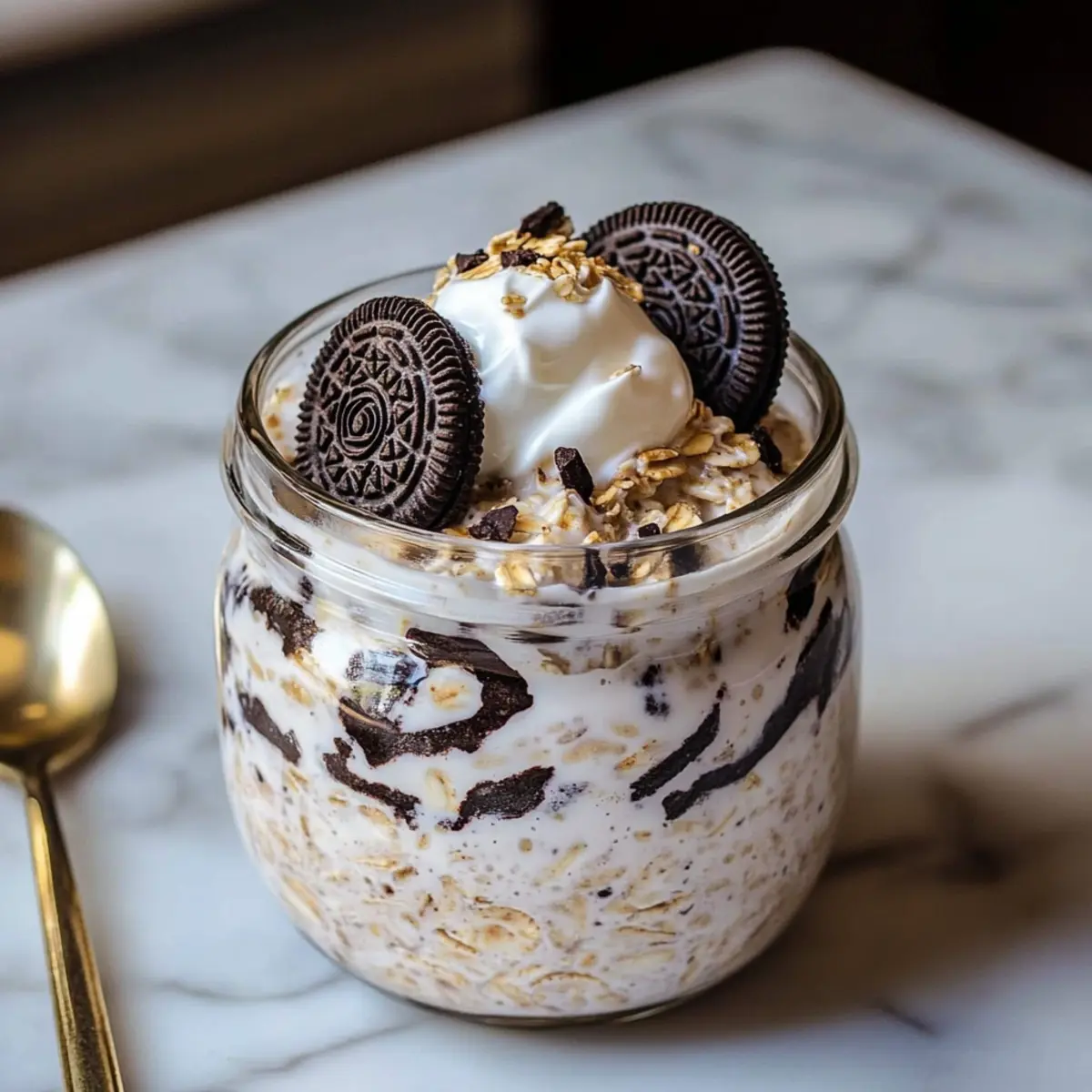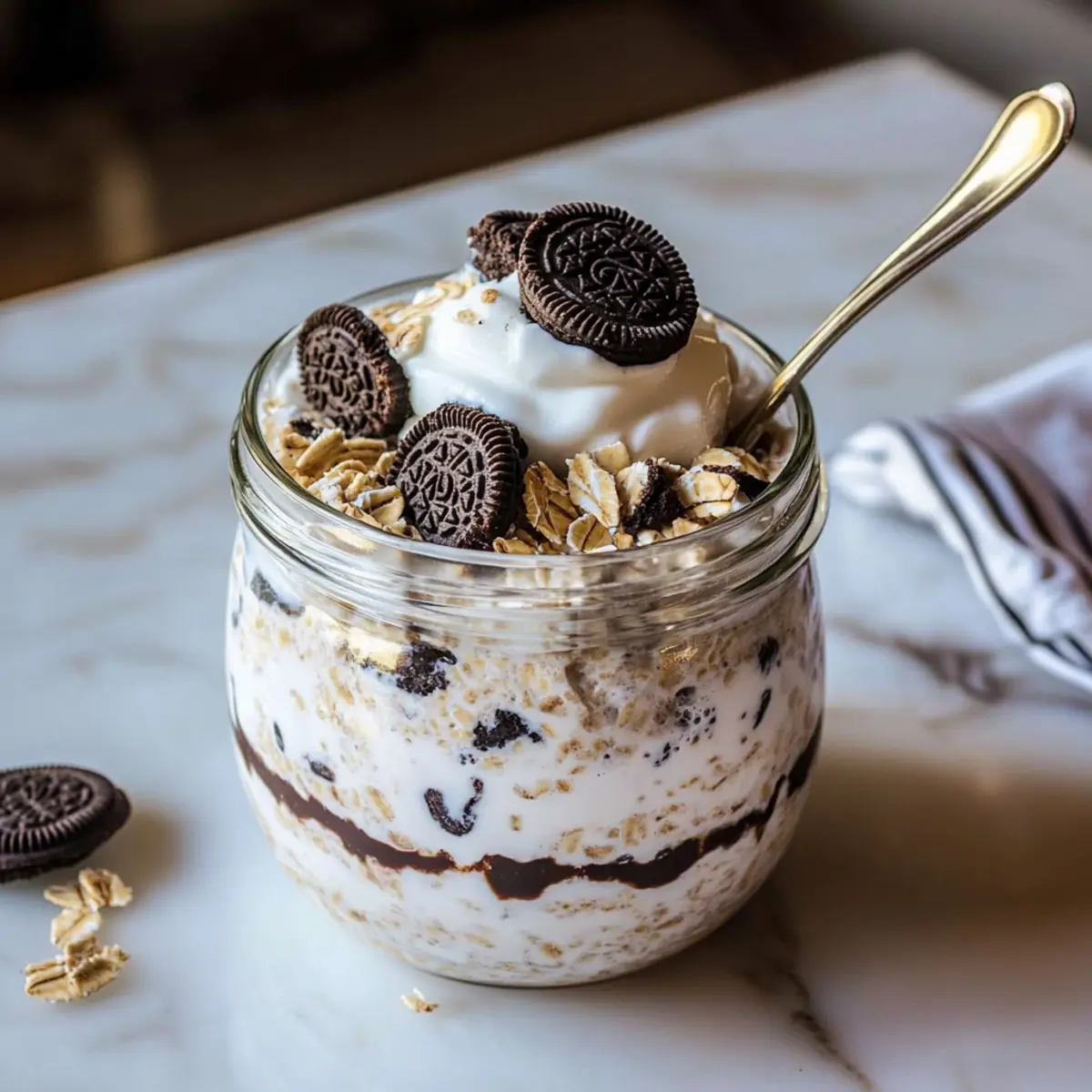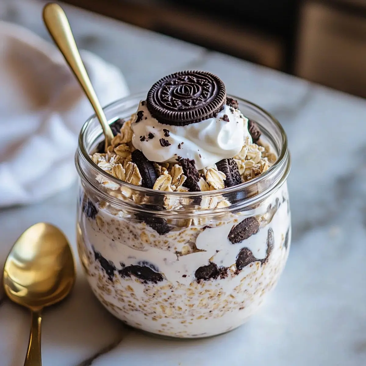 As I stood in my kitchen, contemplating breakfast options, the thought of traditional oats made me sigh. But then it hit me—why settle for bland when you can indulge? Enter Oreo Overnight Oats, the hero of my morning routine. This easy meal prep is a game-changer, combining rolled oats, creamy Greek yogurt, chia seeds, and a touch of cocoa for a delightful twist on dessert. Not only are these oats protein-rich and satisfying, but they’re also customizable to fit everyone’s taste—perfect for the whole family! Imagine waking up to a jar of chocolatey goodness that keeps you fuelled until lunch. So, are you ready to take your breakfast to the next level? Let’s dive in! Why Choose Oreo Overnight Oats? Nutritious and Delicious: Oreo Overnight Oats combine wholesome ingredients like rolled oats and chia seeds, ensuring every bite is packed with nutrients and flavor. Kid-Approved: The beloved taste of cookies-and-cream makes this breakfast a hit with kids, bridging the gap between health and happiness. Time-Saving: No cooking required! Prep it the night before and enjoy a hassle-free morning. Limitless Customization: Easily tweak ingredients to suit your preferences. Swap Greek yogurt with a dairy-free alternative or add fresh fruits for a unique twist. Healthy Indulgence: Enjoy the creamy deliciousness without guilt; these oats keep you satisfied without the sugar crash. For more fabulous breakfast ideas, check out these no-bake dessert recipes. Oreo Overnight Oats Ingredients • Get ready to whip up a delightful breakfast! For the Oats Rolled Oats – Serve as the hearty base and provide essential fiber for a satisfying meal. Chia Seeds – Boost the fiber and omega-3 content; feel free to swap in ground flaxseeds if that’s what you have on hand. Cocoa Powder – Adds a rich chocolate flavor that elevates the Oreo experience; stick with unsweetened for a healthy touch. Salt – A pinch enhances all the flavors beautifully. For the Creaminess Almond Milk – This serves as the liquid base; substitute with any milk you prefer, whether dairy or non-dairy. Greek Yogurt – Infuses protein and creaminess; switch to plant-based yogurt for a dairy-free option. For Sweetness Maple Syrup – Natural sweetness that ties the dish together; honey or agave syrup can be excellent alternatives. Vanilla Extract – Introduces warmth to the flavors; optional but recommended for depth. For the Crunch Chocolate Sandwich Cookies – The star of the show that provides the essential ‘Oreo’ vibe; if needed, go for gluten-free varieties. Step‑by‑Step Instructions for Oreo Overnight Oats Step 1: Combine the Dry Ingredients In a mason jar or medium bowl, add 1/2 cup of rolled oats, 1 tablespoon of chia seeds, 1 tablespoon of unsweetened cocoa powder, and a pinch of salt. Mix these dry ingredients thoroughly until well combined. This step lays the flavorful foundation for your Oreo Overnight Oats, giving it that chocolatey kick right from the start. Step 2: Add the Wet Ingredients Pour in 1 cup of almond milk, followed by 1/2 cup of Greek yogurt, 2 tablespoons of maple syrup, and 1 teaspoon of vanilla extract. Stir the mixture until everything is smooth and cohesive, creating a creamy texture. This combination ensures your oats are not only delicious but also protein-rich and satisfying, perfect for a wholesome breakfast. Step 3: Incorporate the Cookies Gently fold in 1-2 crushed chocolate sandwich cookies, reserving a few for later use. Use a spatula to carefully mix the cookie pieces throughout the oat mixture, allowing that lovely Oreo flavor to infuse every bite. The crushed cookies add delightful crunch and sweetness, making your Oreo Overnight Oats even more enticing. Step 4: Refrigerate Overnight Seal the mason jar or cover the bowl with plastic wrap, then place it in the refrigerator. Allow the oats to chill for at least 4 hours, or preferably overnight. This time allows the oats and chia seeds to absorb moisture, resulting in a creamy, thick texture that is ready to indulge in by morning. Step 5: Serve and Garnish In the morning, give the Oreo Overnight Oats a good stir to combine any settled ingredients. Optionally, top with extra crushed cookies, a dollop of yogurt, or a sprinkle of chocolate chips for an extra touch of sweetness. This is where you can personalize your breakfast to make it your own, ready to savor as a delightful morning treat. Oreo Overnight Oats Variations & Substitutions Experimenting with your Oreo Overnight Oats can take this delightful dish to new heights! Let your creativity shine through delicious tweaks and variations. Protein Boost: Add a scoop of your favorite protein powder to enhance the nutrition while keeping that indulgent flavor. Dairy-Free Delight: Swap Greek yogurt with a plant-based alternative like coconut or almond yogurt to make it completely dairy-free. Sweetener Swap: Use honey or agave syrup instead of maple syrup for a different sweet profile that still keeps your oats delicious. Cookie Fiesta: Try using different flavored sandwich cookies, like peanut butter or mint, for a unique twist on this classic recipe. Fruity Twist: Top your oats with sliced bananas, berries, or apples for a fresh burst of flavor and added nutrients. The contrast between creamy oats and juicy fruits is heavenly! Spicy Kick: Add a pinch of cinnamon or nutmeg for a warm spice note to complement the chocolate flavor, elevating each bite. Nutty Goodness: Stir in some chopped nuts or nut butter for added crunch and creaminess, which also boosts the healthy fats in your breakfast. Fun Layering: Create a parfait by layering your oats with yogurt and extra cookie crumbles in a clear glass; eating with a spoon just got more fun! For more indulgent recipes that promise easy prep and a burst of flavor, don’t miss out on these fantastic no-bake dessert recipes. Make Ahead Options These Oreo Overnight Oats are a fantastic choice for busy home cooks looking to save time! You can pr