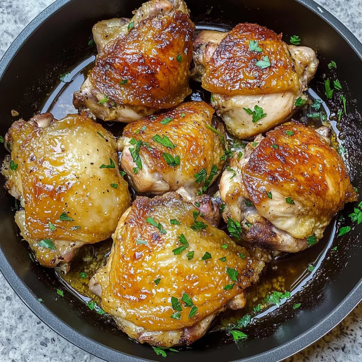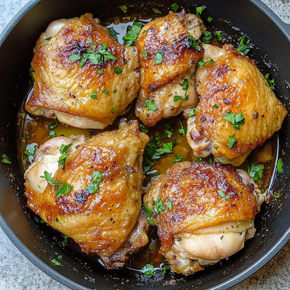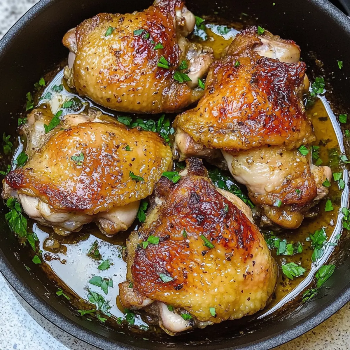 The sizzling sound of chicken hitting a hot skillet can turn an ordinary evening into something special. With my 30-Minute Juicy Pan-Seared Chicken Thighs, you’ll discover the delightful magic of a quick weeknight recipe that doesn’t skimp on flavor or satisfaction. These thighs are not only golden-brown and crispy on the outside but also juicy and tender on the inside, enveloped in a garlicky sauce that makes every bite a comforting experience. This dish is perfect for busy evenings, taking just half an hour from start to finish, and it’s meal prep-friendly, making it a fantastic option for those embracing keto or gluten-free diets. Whether you’re cooking for yourself or the whole family, these pan-seared chicken thighs will soon become a staple in your home. Intrigued by the burst of flavor packed in such a short time? Let’s get cooking! Why are Pan-Seared Chicken Thighs a Must Try? Quick Cooking: In just 30 minutes, whip up a meal that’s perfect for busy weeknights without sacrificing flavor. Simple Ingredients: This recipe uses accessible ingredients that enhance the dish’s savory goodness and allow you to create a restaurant-quality meal at home. Versatile Pairings: Pair them with your favorite sides, like a fresh garden salad or creamy mashed potatoes, for a complete and satisfying dinner. Meal Prep Heaven: Prep-friendly and easy to store, these chicken thighs are great for leftovers that taste just as good the next day. Keto and Gluten-Free Friendly: This dish is a wonderful choice for those on special diets, ensuring everyone can enjoy a delicious meal. With its mouthwatering flavor and ease of preparation, these pan-seared chicken thighs will be a go-to recipe for any home cook! Pan-Seared Chicken Thighs Ingredients For the Chicken • Chicken Thighs – Skin-on, bone-in recommended for optimal moisture and flavor. • Garlic Parsley Salt – A flavorful seasoning blend; can substitute with separate garlic, parsley, and salt. For Searing • Avocado Oil or Olive Oil – Ideal for high-heat cooking; use another high-heat oil if needed. • Paprika – Adds a vibrant color and a mild flavor boost to the chicken. For the Sauce • Chicken Broth – Enhances juiciness and flavor; opt for low-sodium for a healthier choice. • Garlic Cloves – Freshly pressed for a robust flavor; garlic powder can be used in a pinch. For Garnishing • Fresh Parsley – Provides a fresh touch and lovely color to the finished dish. Get ready to relish in the flavors of these pan-seared chicken thighs that promise to delight your palate! Step‑by‑Step Instructions for 30-Minute Juicy Pan-Seared Chicken Thighs with Garlicky Sauce Step 1: Prep the Chicken Begin by patting the chicken thighs dry with paper towels, ensuring a crispy finish when cooked. Season both sides generously with garlic parsley salt and paprika. This step not only enhances flavor but also helps achieve that golden, mouthwatering crust during searing. Step 2: Sear the Chicken In a large cast-iron skillet, heat 2 tablespoons of avocado oil over high heat until shimmering, about 1-2 minutes. Carefully place the chicken thighs skin-side down in the hot oil, allowing them to sear undisturbed for 2-4 minutes. Look for a deep golden-brown color on the skin before flipping the thighs to the other side. Step 3: Add Flavorful Broth Once both sides are nicely browned, lower the heat to medium-low. Pour in 1 cup of chicken broth and add 3 pressed garlic cloves to the skillet. This will create a savory sauce that infuses the chicken as it cooks. Allow the chicken to simmer gently for about 15-20 minutes, or until the internal temperature reaches 165°F, ensuring it’s cooked through and juicy. Step 4: Garnish and Serve After the chicken thighs are fully cooked, remove the skillet from heat. Transfer the chicken to a serving plate, drizzling the rich garlic-infused broth over the top. For a pop of freshness, sprinkle chopped fresh parsley over the chicken before serving. These pan-seared chicken thighs are now ready to delight with their irresistible crispy skin and tender interior! How to Store and Freeze Pan-Seared Chicken Thighs Fridge: Store any leftovers in an airtight container for up to 3 days. Reheat gently on the stovetop or in the microwave to maintain juiciness. Freezer: If you want to keep your pan-seared chicken thighs longer, freeze them in a freezer-safe bag for up to 3 months. Thaw overnight in the fridge before reheating for best results. Reheating: When ready to enjoy, reheat the thawed chicken in a skillet over low heat, adding a splash of chicken broth to keep it moist and flavorful. Meal Prep: This dish is perfect for meal prep; simply portion out servings in containers for easy grab-and-go lunches or dinners throughout the week. What to Serve with 30-Minute Juicy Pan-Seared Chicken Thighs? The magic of a crisp, savory chicken dish is amplified when thoughtfully paired with complementary sides that round out your meal beautifully. Creamy Mashed Potatoes: These buttery potatoes soak up the garlicky sauce, creating a comforting blend that melts in your mouth. Steamed Green Beans: Bright and crunchy, they add a fresh, vibrant contrast to the rich chicken flavors, enhancing the overall dining experience. Garden Salad: A light, fresh salad with mixed greens and a tangy vinaigrette balances the richness of the chicken while providing a refreshing crunch. Roasted Vegetables: Seasonal veggies, tossed with olive oil and herbs, bring in earthy flavors that harmonize perfectly with the savory note of the chicken. Quinoa Pilaf: This nutty grain offers a wholesome, textured base that pairs beautifully with the savory sauce, making each bite hearty and satisfying. Garlic Bread: Crisp, buttery slices of garlic bread are perfect for dipping into the luscious sauce, ensuring you don’t miss a single flavor-packed drop. Chardonnay: A chilled glass of chardonnay complements the richness of the chicken, bringing a touch of sop