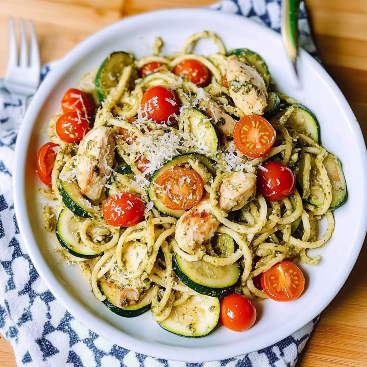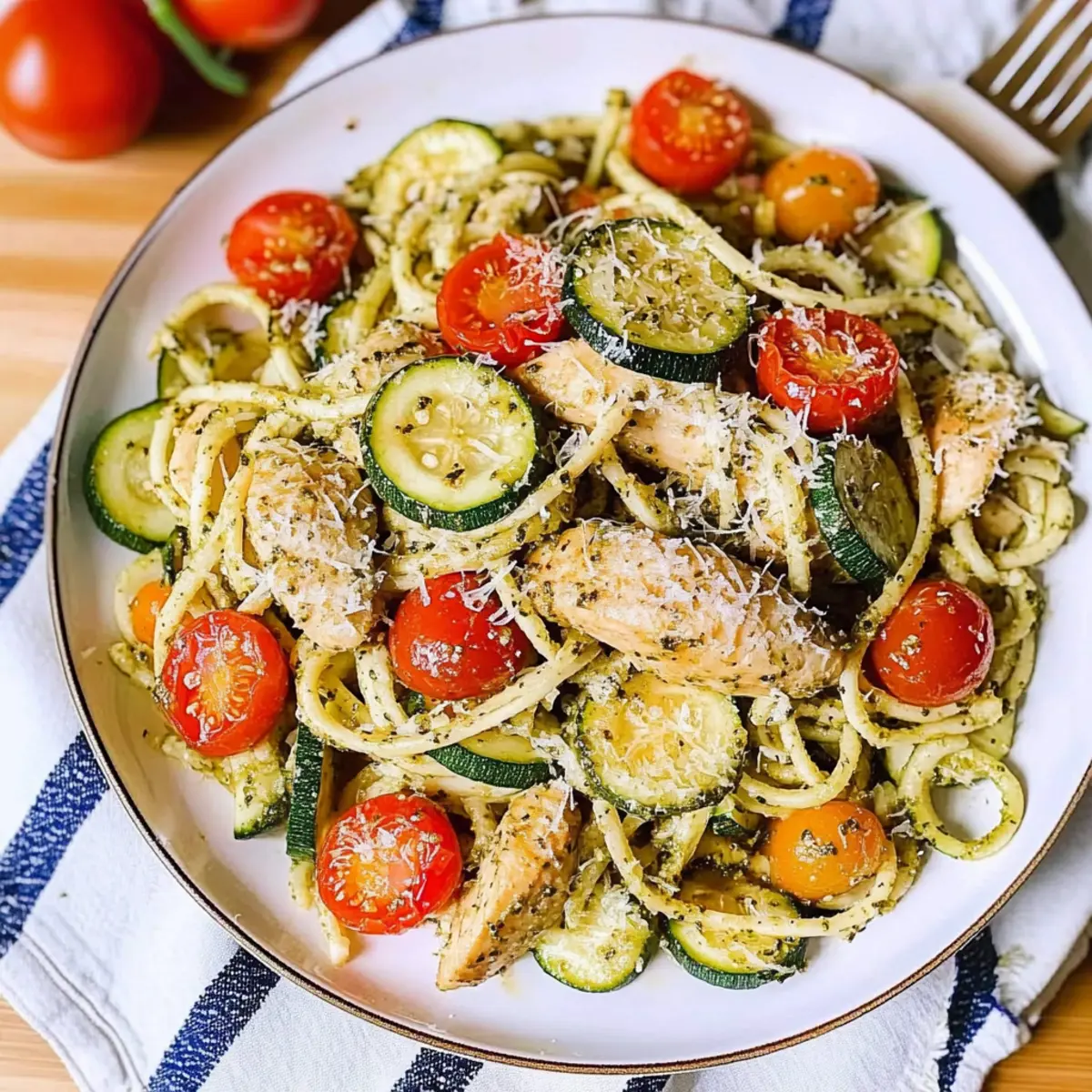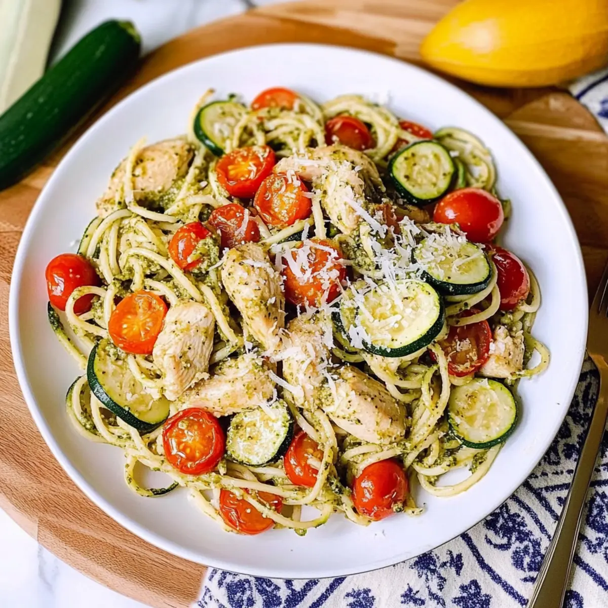As I poured the fragrant basil pesto over the tender chicken and vibrant zucchini, a wave of happiness washed over me. It reminded me that not all meals need to be time-consuming to be delicious. This Parmesan Zucchini Tomato Chicken Spaghetti is a perfect answer to those busy evenings when you crave Mediterranean flavors without the fuss. With quick prep and the flexibility to switch up proteins or pasta types—including a gluten-free option—it’s a dish that caters to everyone at the table. Bursting with healthy ingredients and a cozy, comforting feel, this recipe is sure to become your go-to. Ready to discover how to whip up this delightful dish and impress your loved ones? Let’s dive right in! Why is This Recipe a Must-Try? Quick and Easy: This Parmesan Zucchini Tomato Chicken Spaghetti comes together in no time, making it perfect for busy weeknights. Versatile Options: With choices for gluten-free pasta and different proteins like shrimp or tofu, there’s something for everyone! Healthy Ingredients: Packed with fresh zucchini and cherry tomatoes, it’s a nutritious meal that doesn’t skimp on flavor. Mediterranean Delight: The vibrant blend of basil pesto and Parmesan cheese captures the essence of Mediterranean cuisine in every bite. Crowd-Pleaser: Ideal for family dinners or casual gatherings, this recipe is sure to impress even the pickiest eaters. Once you’ve tried this dish, you might find it pairs perfectly with a light side salad or even with these Buffalo Chicken Tacos for a full flavor experience! Parmesan Zucchini Tomato Chicken Spaghetti Ingredients For the Chicken and Pasta Olive Oil – Essential for cooking and adds a rich flavor; opt for extra virgin for the best taste. Chicken Breast (1 lb, uncooked, sliced) – The main protein source; boneless chicken thighs can offer a richer taste. Spaghetti (8 oz, uncooked) – The primary carbohydrate; use gluten-free spaghetti if you prefer a gluten-free option. For the Vegetables Zucchini (1, sliced) – Adds moisture and a subtle crunch; feel free to substitute with yellow squash if you like. Cherry Tomatoes (1 cup red + 1 cup yellow, sliced in half) – Contributes sweetness and vibrant color; regular tomatoes work in a pinch. For Flavoring Basil Pesto (¼ cup + ¼ cup) – Infuses the dish with herby goodness; homemade or store-bought will do just fine. Salt (to taste) – Enhances the overall flavors; adjust according to your dietary needs. For Topping Grated Parmesan Cheese (⅓ cup) – Provides a creamy finish and depth of flavor; substitute with nutritional yeast for a dairy-free alternative. Step‑by‑Step Instructions for Parmesan Zucchini Tomato Chicken Spaghetti Step 1: Cook Zucchini In a large skillet, heat 1 tablespoon of olive oil over medium-high heat. Add the sliced zucchini with a pinch of salt, cooking for about 5 minutes until it’s tender and slightly browned. You want it to have a hint of crunch, adding a delightful texture to your Parmesan Zucchini Tomato Chicken Spaghetti. Once done, remove the zucchini from the skillet and set it aside. Step 2: Cook Chicken In the same skillet, drizzle in 1 teaspoon of olive oil, then add the sliced chicken breasts. Sauté for 5-7 minutes, flipping occasionally until the chicken is golden and no longer pink in the center. Once cooked through, stir in ¼ cup of basil pesto, allowing the flavors to meld together beautifully, creating a fragrant base for your dish. Step 3: Prepare Spaghetti While the chicken is cooking, bring a large pot of salted water to a boil. Add the uncooked spaghetti and cook according to the package instructions until al dente, usually around 8-10 minutes. Be sure to stir occasionally. Once perfectly cooked, drain the spaghetti, keeping it warm as you combine it with the other ingredients. Step 4: Combine Ingredients Return to the skillet with the cooked chicken and pour in the drained spaghetti. Incorporate the cooked zucchini and halved cherry tomatoes into the mix. Stir in another ¼ cup of basil pesto, ensuring that everything is well-coated and heated through. This step is crucial for blending the vibrant flavors of your Parmesan Zucchini Tomato Chicken Spaghetti. Step 5: Finish & Serve Taste the dish and adjust the seasoning with salt if needed. Once everything is evenly heated and combined, sprinkle with ⅓ cup of grated Parmesan cheese. Serve your vibrant and hearty Parmesan Zucchini Tomato Chicken Spaghetti immediately, and watch as your family enjoys every comforting bite of this Mediterranean delight. Expert Tips for Parmesan Zucchini Tomato Chicken Spaghetti Zucchini Perfection: Avoid overcooking the zucchini; it should be tender yet slightly crunchy for the best texture in your dish. Pasta Variations: While traditional spaghetti is great, feel free to experiment with other pasta shapes like penne or even gluten-free options for a delightful twist. Season Generously: Don’t be shy with the salt when seasoning; it truly elevates the flavor of your Parmesan Zucchini Tomato Chicken Spaghetti, making every bite pop. Add More Veggies: Feel free to boost the health factor by incorporating other colorful veggies like bell peppers or spinach; it adds nutrients and flavor! Garnish Wonders: Fresh herbs like basil or parsley sprinkled on top before serving can add a beautiful touch and enhance the Mediterranean flavors of your dish. Make Ahead Options Preparing your Parmesan Zucchini Tomato Chicken Spaghetti ahead of time is a game-changer for busy weeknights! You can slice the zucchini and chicken up to 24 hours in advance, storing them in airtight containers in the refrigerator to maintain freshness. The cherry tomatoes can also be halved beforehand. If you wish to cook the spaghetti, do so, but make sure to toss it with a bit of olive oil to prevent it from sticking together. When you’re ready to enjoy, simply sauté the chicken, combine everything in the skillet, and reheat gently on low heat. This prep method ensures your 