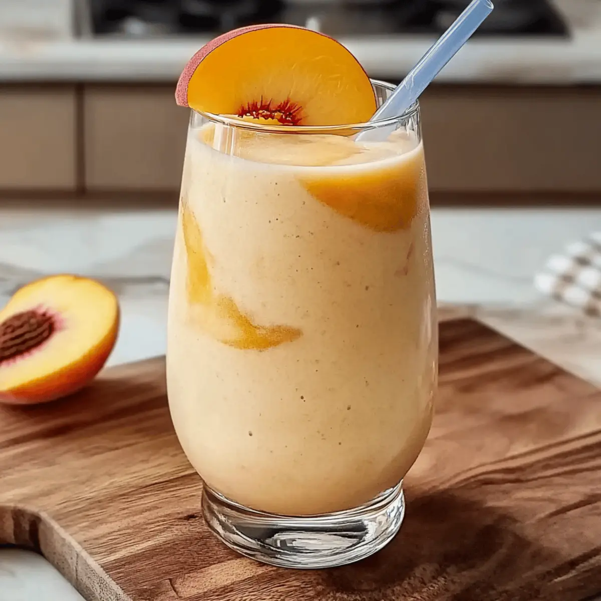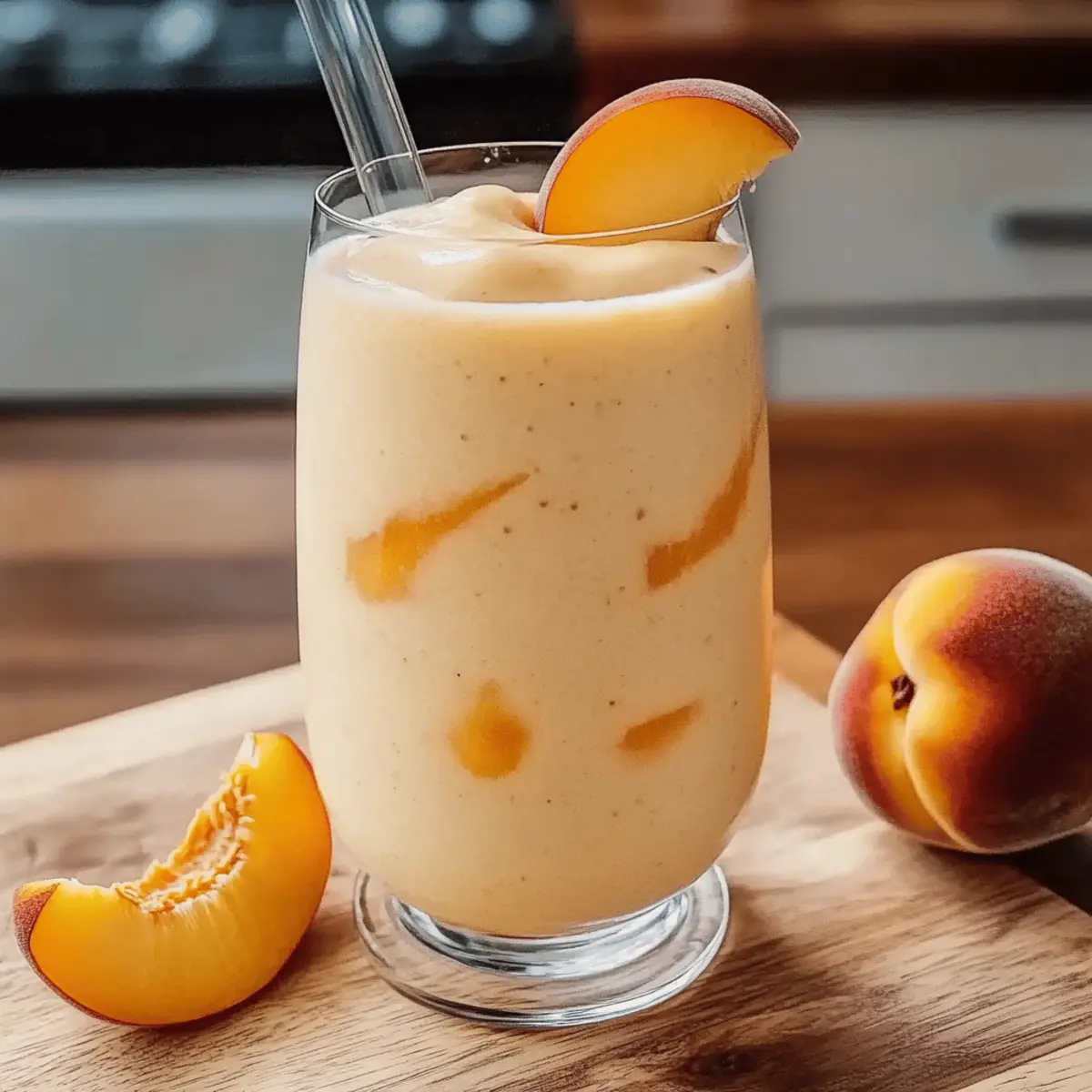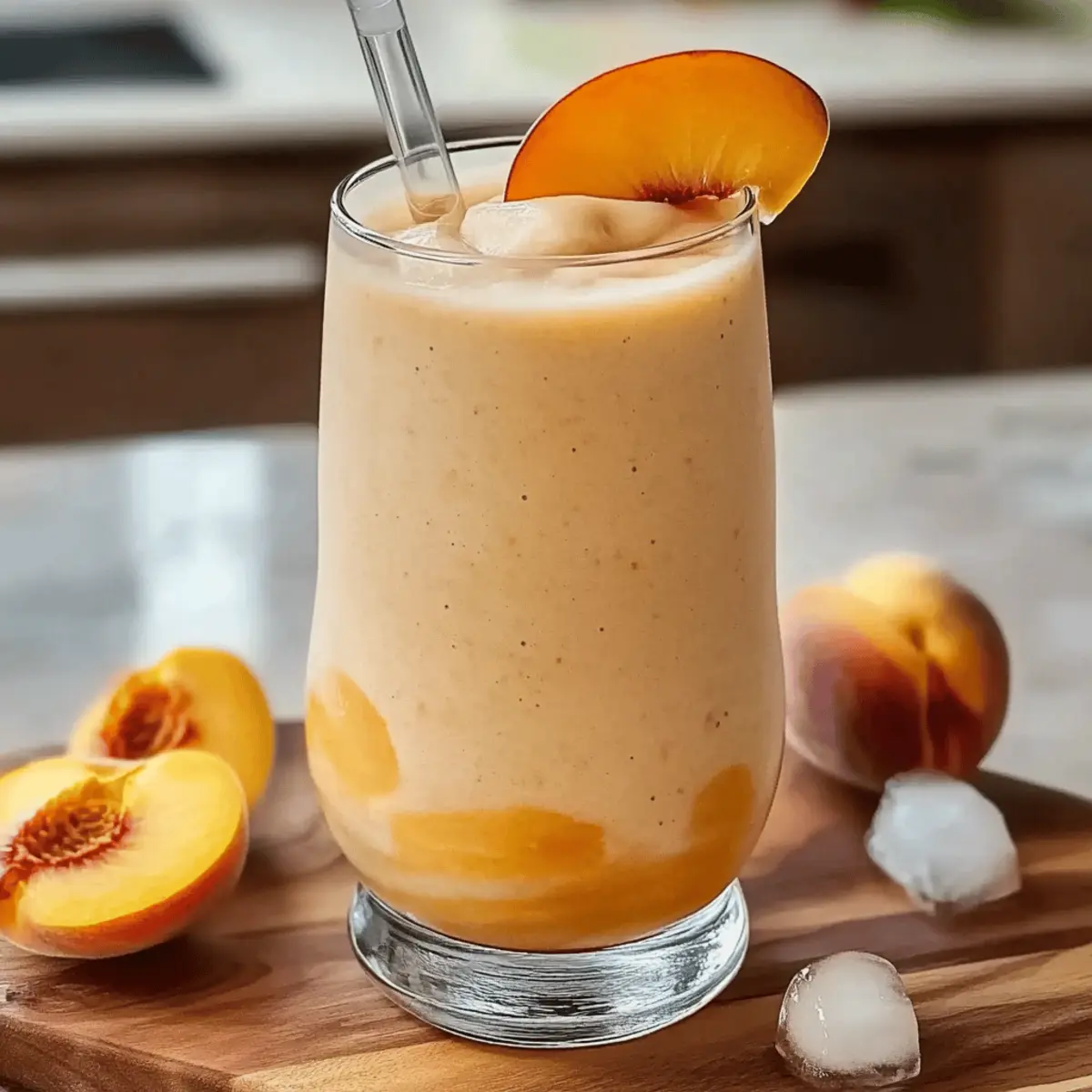 As I savored the last sip of my morning smoothie, the sun streamed through the kitchen window casting a warm glow on the day ahead. This Quick and Nutritious Peaches & Cream Smoothie has become my go-to pick-me-up, effortlessly blending the sweet, succulent essence of ripe peaches with the creamy goodness of yogurt. Not only is this smoothie a delightful escape from the mundane, but it’s also a quick, wholesome choice for busy mornings or post-workout snacks. Packed with vitamins and customizable to your preference, you can make it dairy-free or add a fun twist with your favorite fruits. What’s your favorite ingredient to toss into a smoothie? Let’s dive into the deliciousness! Why You’ll Love This Smoothie Nutritious and Wholesome: This Peaches & Cream Smoothie is loaded with vitamins, making it a perfect start to your day or a refreshing snack. Quick to Make: In just minutes, you can whip up this delicious treat, ideal for those busy mornings when time is tight. Versatile Options: Customize it to your liking! Add a scoop of peanut butter for protein or swap in some kale for a green boost—endless possibilities await! Crowd-Pleaser: Everyone will love this smoothie, from kids to adults. Serve it at brunch or after school—it’s sure to impress! Creamy Texture: With a blend of ripe peaches and yogurt, this smoothie offers a luxurious mouthfeel that’s truly satisfying. For those looking for more smoothie inspiration, be sure to check out my Garlic Butter Cream recipe for a refreshing twist! Peaches & Cream Smoothie Ingredients • Dive into the vibrant flavors with these fresh ingredients perfect for your Peaches & Cream Smoothie! For the Smoothie Ripe Peaches – Choose juicy, ripe peaches for the best natural sweetness and flavor. Vanilla Yogurt – This provides delightful creaminess; opt for dairy-free yogurt for a vegan option. Milk – Adds smoothness; you can replace it with almond milk or any preferred plant-based milk. Honey/Maple Syrup (optional) – Enhance sweetness if desired, but omitting it keeps the smoothie healthier. Ice Cubes – Create a chilled texture; for a frostier smoothie, consider using frozen peaches instead. Vanilla Extract (optional) – A splash of this brings out an extra layer of flavor. Get ready to blend up this delicious Peaches & Cream Smoothie and enjoy the refreshing taste of summer in every sip! Step‑by‑Step Instructions for Peaches & Cream Smoothie Step 1: Prepare Peaches Start by washing your ripe peaches thoroughly under cool running water. Next, carefully pit and slice the peaches, removing the skin if you prefer a smoother texture. Aim for about 1-2 peaches, as their natural sweetness is the star of your Peaches & Cream Smoothie. Set the peach slices aside, ready to blend! Step 2: Combine Ingredients In a high-speed blender, add the sliced peaches along with 1 cup of vanilla yogurt and ½ cup of milk. If you’re going dairy-free, feel free to substitute the yogurt with your favorite plant-based option. Toss in a handful of ice cubes for that refreshing chill. It’s all about blending those flavors harmoniously! Step 3: Add Sweetener If you like a touch of extra sweetness, drizzle in a tablespoon of honey or maple syrup at this stage. You can also add a splash of vanilla extract to deepen the flavor profile. Close the blender lid securely and prepare for the next step in your Peaches & Cream Smoothie adventure! Step 4: Blend Smoothly Blend the mixture on high speed for about 30 seconds to 1 minute, or until it reaches a smooth and creamy consistency. Keep an eye on it—if you see chunks or it’s not blending well, stop to scrape down the sides with a spatula and blend again. Your smoothie should be luscious! Step 5: Check Consistency Once blended, check the thickness of your smoothie. If it seems too thick for your liking, gradually pour in more milk, a tablespoon at a time, blending after each addition. Aim for a deliciously drinkable consistency that still holds its creamy integrity. This is all about tailoring your Peaches & Cream Smoothie to perfection! Step 6: Taste Test Take a moment to taste your smoothie. If you desire a bit more sweetness, add a slice or two of peaches or a touch more honey or syrup if needed. Blend briefly to incorporate and enhance the flavor. Remember, it should be your perfect blend of sweetness and creaminess! Step 7: Serve Immediately Pour your beautiful Peaches & Cream Smoothie into chilled glasses for an inviting presentation. You can optionally garnish with a slice of peach or a dollop of yogurt for a lovely touch. Sip and enjoy this refreshing summer treat right away—the flavors are best when fresh! Make Ahead Options These Peaches & Cream Smoothies are ideal for meal prep, allowing you to enjoy this delicious treat even on your busiest mornings! You can prepare the smoothie base (peaches, yogurt, milk, and optional sweeteners) up to 24 hours in advance. Simply blend together and store the mixture in an airtight container in the refrigerator. To maintain optimal flavor and texture, keep the ice cubes separate until you’re ready to blend and serve. When you’re set to enjoy your smoothie, just add the ice and blend until creamy again for that fresh taste. With these simple make-ahead steps, you can savor the goodness of your Peaches & Cream Smoothie while saving precious time! Expert Tips for Peaches & Cream Smoothie Use Ripe Peaches: Choosing juicy, ripe peaches is crucial for the best flavor in your Peaches & Cream Smoothie. Look for fruits that yield slightly when pressed. Control the Consistency: If your smoothie is too thick, simply add more milk gradually until you achieve your desired creaminess. Remember, you can always blend it more! Clean Blender Trick: To ensure a smooth texture, rinse your blender immediately after use. This prevents any stuck-on residue and keeps your next smoothie effortless. Frozen Alternatives: For an extra frosty treat, consider using frozen peaches in