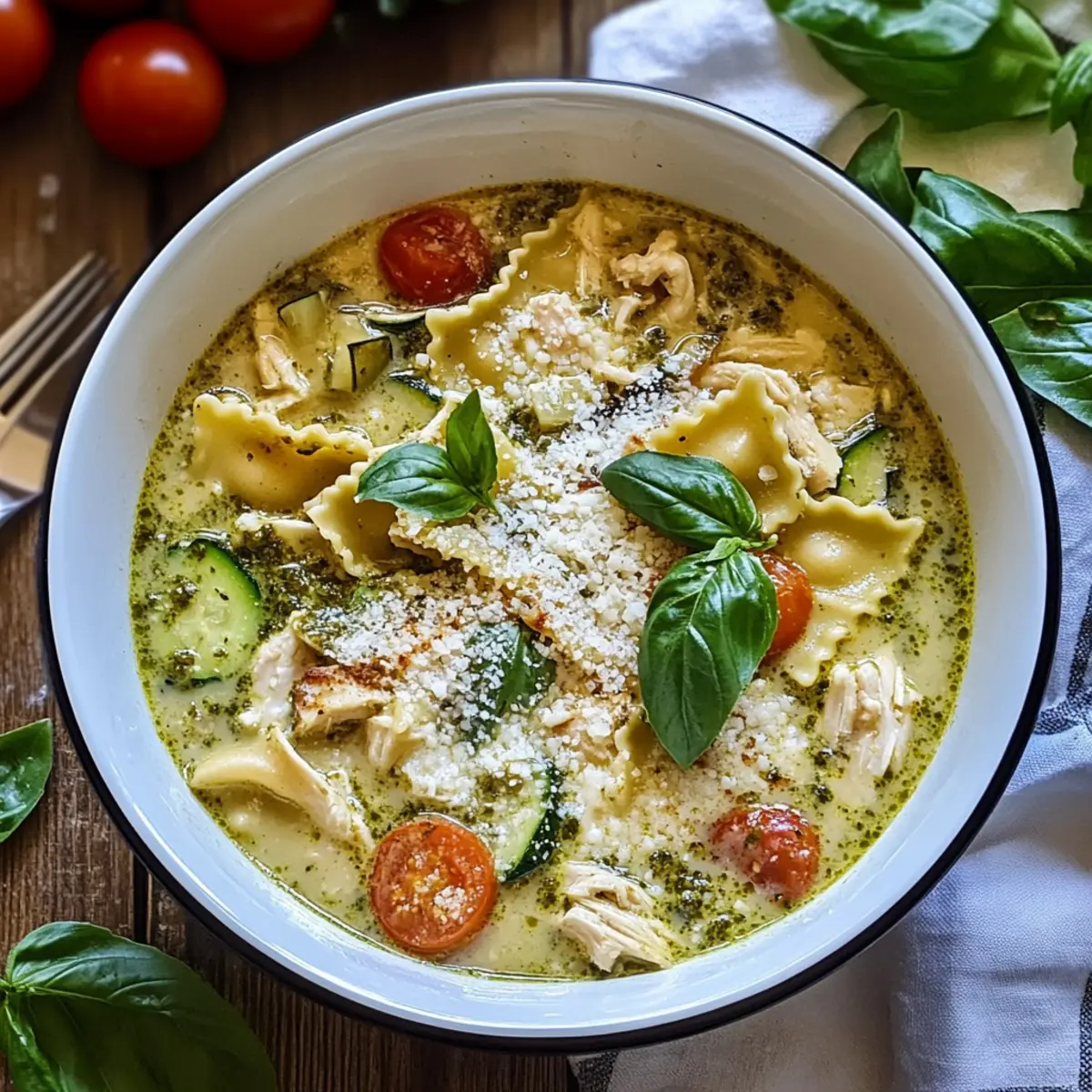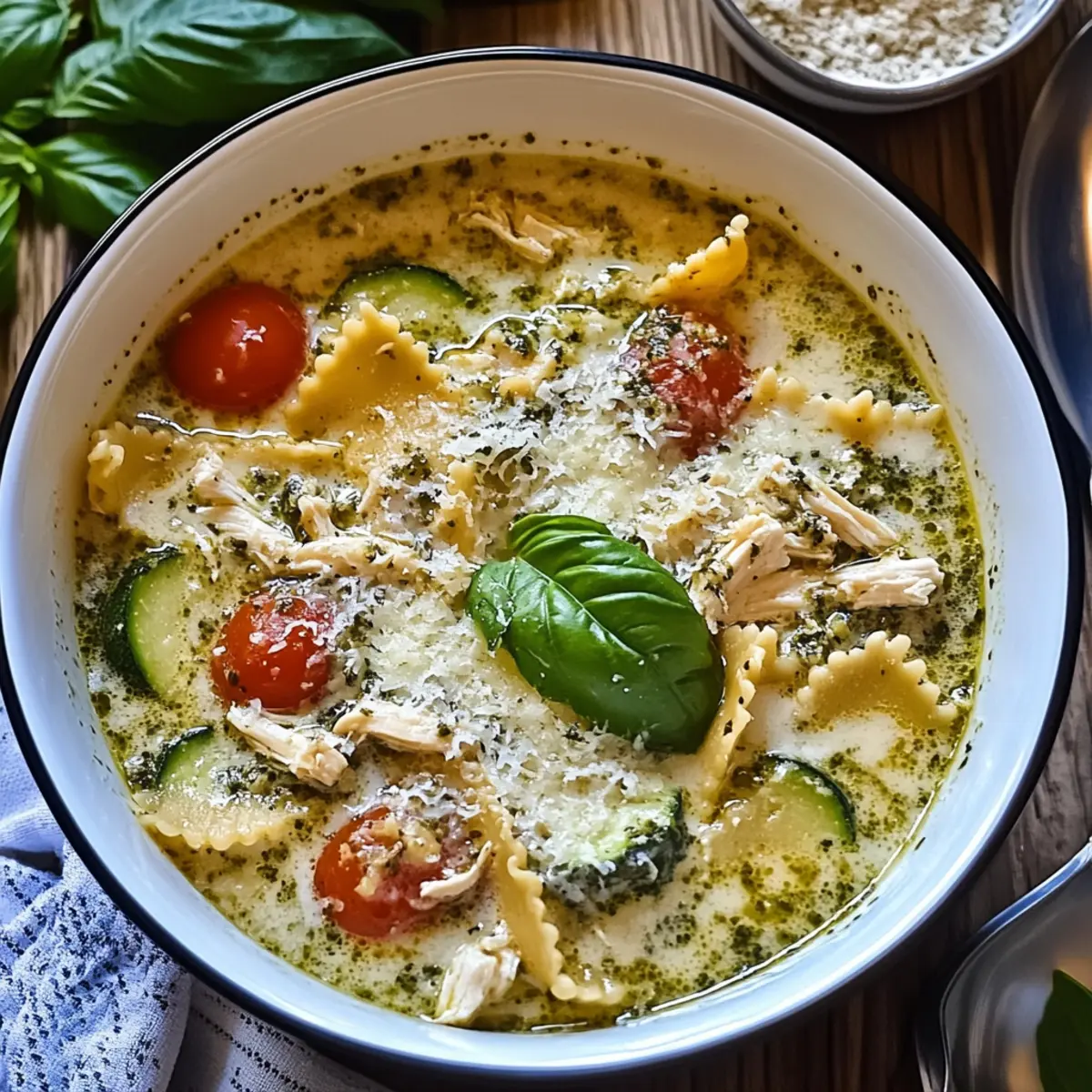 As I stood by the stove, the aroma of garlic and olive oil whisked me away to my favorite Italian trattoria. This Pesto Lasagna Soup is a revelation—a quick dinner that merges the essence of a beloved comfort food with the heartwarming experience of a homemade meal. In just 30 minutes, you can serve up a bowl filled with tender noodles, fresh basil pesto, and creamy cheese that warms both the body and soul. Not only is this recipe easy to make, but it also offers a delightful way to enjoy a cozy night without hours of preparation. Plus, with a vegetarian option available, it’s a meal anyone can savor. What’s your favorite twist on a classic dish? Why Will You Love Pesto Lasagna Soup? Quick and Easy: This soup comes together in just 30 minutes, making it the perfect go-to for busy weeknights. Comfort in a Bowl: Delight in creamy textures and rich flavors reminiscent of lasagna, all in a warm, cozy soup form. Versatile Ingredients: Customize with different pasta types or add extra vegetables like spinach or mushrooms. You can even explore variations like a Lemon Lentil Soup for more diverse options! Vegetarian-Friendly: Easily adapted for vegetarian diets by swapping chicken for additional veggies, proving everyone can enjoy this dish! Crowd-Pleasing: Whether it’s a family dinner or a gathering with friends, this Pesto Lasagna Soup is sure to impress with its delightful twist on comfort food. Pesto Lasagna Soup Ingredients For the Soup • Olive Oil – Adds rich flavor; can substitute with avocado oil for a lighter option. • Chicken Broth – The base of the soup; use homemade for best quality or vegetable broth for a vegetarian version. • Shredded Chicken – Provides protein and heartiness; rotisserie chicken is perfect for ease and flavor. • Lasagna Noodles – Essential for texture; break into small pieces or swap with fusilli or bowtie pasta. • Pesto – Key flavor component; store-bought is convenient, but homemade is a delightful option. • Ricotta Cheese – Contributes creaminess and richness to the soup. • Grated Parmesan Cheese – Enhances flavor; can be replaced with nutritional yeast for a dairy-free option. • Heavy Cream – Adds luxurious creaminess; substitute with half-and-half or coconut milk for a lighter version. • Cherry Tomatoes – Offers fresh flavor and sweetness, but can be omitted if necessary. • Zucchini – Provides nutrition and texture; swap with other vegetables like spinach or mushrooms for variety. • Fresh Basil Leaves – For garnish; boosts both presentation and flavor in your creamy Pesto Lasagna Soup. Step‑by‑Step Instructions for Pesto Lasagna Soup Step 1: Sauté Aromatics In a large pot, heat 2 tablespoons of olive oil over medium heat. Add 3 minced garlic cloves and 1 chopped onion, sautéing for about 3-4 minutes until fragrant and translucent. Enjoy the aroma as it fills your kitchen, signaling that it’s time to move to the next step in creating this comforting Pesto Lasagna Soup. Step 2: Add Broth Pour in 6 cups of chicken broth and bring the mixture to a gentle boil over high heat. As the broth heats, give it a good stir to incorporate the sautéed aromatics. Once boiling, reduce the heat to maintain a simmer and prepare for the noodles to join this delightful equation. Step 3: Cook the Noodles Carefully add the broken 8 lasagna noodles to the simmering broth. Cook according to package instructions, typically about 8-10 minutes, until al dente. Stir occasionally to prevent sticking, and enjoy watching the noodles swell into the pot, soaking up the rich flavors of the broth. Step 4: Incorporate Vegetables and Chicken Once the noodles are tender, stir in 2 cups of shredded rotisserie chicken, 1 cup of halved cherry tomatoes, and 1 diced zucchini. Allow the mixture to simmer for another 3-4 minutes, letting the vegetables soften and meld with the Pesto Lasagna Soup, enhancing its hearty texture. Step 5: Add the Creamy Ingredients Lower the heat to medium-low, then mix in 1 cup of basil pesto, 1 cup of ricotta cheese, 1/2 cup of grated Parmesan cheese, and 1/2 cup of heavy cream. Stir gently until everything is creamy and well combined, creating a smooth, inviting mixture that captures the essence of traditional lasagna comforts. Step 6: Season and Serve Taste the soup and season with salt and black pepper according to your preference. Once it’s just right, serve your Pesto Lasagna Soup hot, garnished with fresh basil leaves and an optional sprinkle of feta or extra Parmesan for that final touch. Enjoy with crusty bread for a cozy, satisfying meal! How to Store and Freeze Pesto Lasagna Soup Fridge: Store leftovers in an airtight container for up to 3 days. Keep the soup’s flavors fresh, and remember to stir before serving! Freezer: For longer storage, freeze the Pesto Lasagna Soup in portions using freezer-safe containers. It can last up to 3 months, but be mindful of the noodles’ texture upon reheating. Reheating: When ready to enjoy, thaw overnight in the fridge and reheat on the stovetop over low heat. Add a splash of broth or water to maintain the creamy consistency. Avoid Overcrowding: If freezing, make sure to leave space in the container as the soup will expand. This ensures your delicious creation retains its beautiful flavor when stored! What to Serve with Pesto Lasagna Soup Your delightful bowl of Pesto Lasagna Soup deserves some equally delicious companions to create a memorable meal experience. Crusty Bread: Perfect for dipping, this rustic bread adds a satisfying crunch that balances the creamy soup beautifully while soaking up every last drop. Garlic Knots: These buttery, garlicky treats are not only irresistible but also enhance the Italian flavors of your soup, making each bite feel like a warm hug. Caesar Salad: Crisp romaine, Parmesan, and creamy dressing offer a fresh, zesty contrast to the richness of the soup, providing a bright and hearty addition to your table. Roasted Vegetables: A med