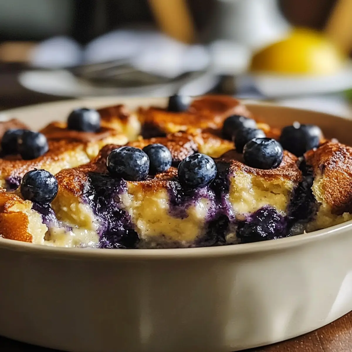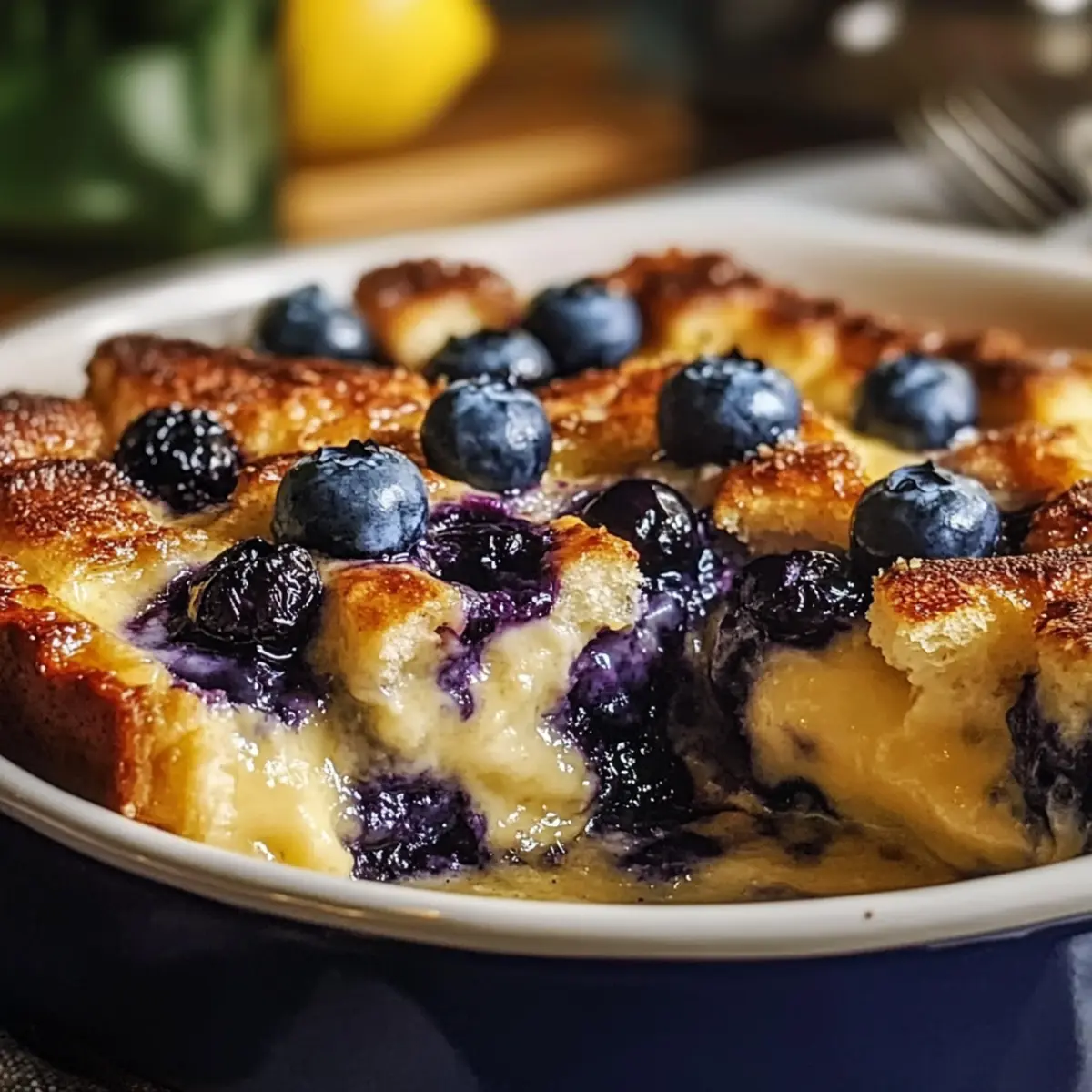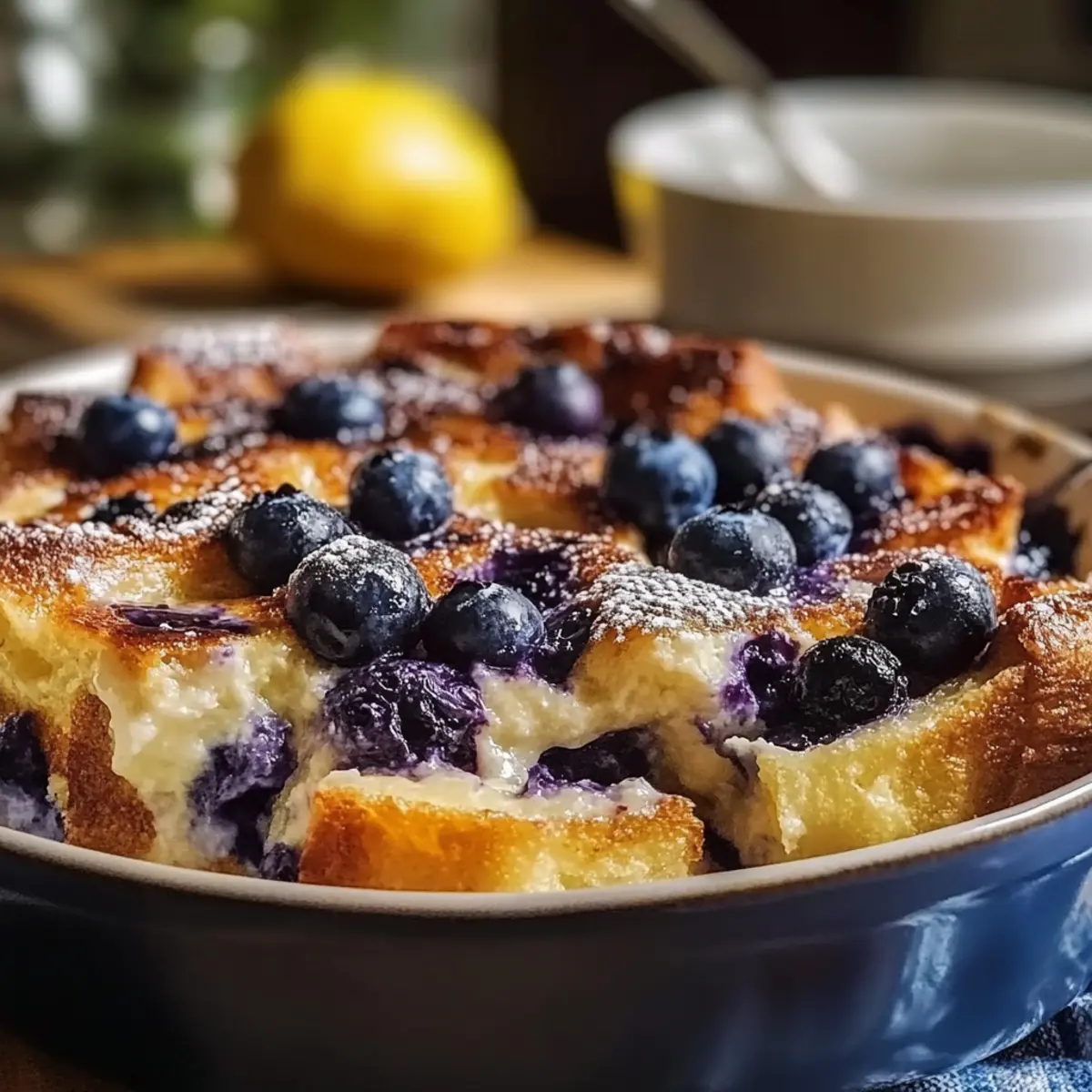 As I stepped into the kitchen this morning, the sun streamed through the windows, wrapping the space in a warm glow—a perfect setting for my latest obsession: Pioneer Woman’s Blueberry Lemon French Toast Casserole Overnight. This delightful dish balances the vibrant zest of lemon with the juicy sweetness of blueberries, creating a breakfast casserole that’s as bright as your morning sunshine. The best part? You can prep it the night before, making it a hassle-free option for busy weekends or brunch with friends. The overnight soaking not only deepens the flavors but also yields a soufflé-like texture that’s lightly crisp on top and wonderfully creamy inside. Ready to discover how to elevate your next breakfast? Let’s dive into this scrumptious recipe! Why is This Casserole Amazing? Ease of Preparation: This overnight casserole takes just a few simple steps, letting you enjoy a delicious brunch with minimal effort. Fresh Flavor: The bright zing from lemon curd combined with blueberries creates a refreshing dish that’s perfect for any season. Crowd-Pleasing: Impress your guests with a dish that’s both elegant and homey, perfect for brunch gatherings. Customization Options: Switch up the fruits or add cream cheese for extra richness—your creativity is the limit! Ready to make another delightful breakfast? Check out these Blueberry Pancakes Breakfast or consider a savory twist with a Savory Turkey Casserole. Pioneer Woman Blueberry Lemon French Toast Casserole Ingredients For the Casserole Brioche or French bread – A sturdy bread base provides the best texture; avoid using sandwich bread, which can become mushy. Fresh or frozen blueberries – For sweet bursts of flavor; frozen blueberries work wonderfully and don’t need to be thawed. Large eggs – They create a rich custard that binds everything together for the perfect breakfast casserole. Whole milk – Adds creaminess; feel free to swap it for full-fat coconut milk or oat milk if seeking a dairy-free alternative. Heavy cream – Optional for a luxurious touch; omit if you’re looking for a lighter dish. Granulated sugar – Adjust sweetness to your liking; this enhances the overall flavor profile. Lemon curd – An essential flavor enhancer that provides tangy depth; if you’re out, increase lemon zest or use a cream cheese blend as a substitute. Fresh lemon zest – Infuses a bright aroma; always use fresh for the most vibrant flavor. Vanilla extract – Enhances the overall flavor, making each bite more delightful. For Serving Powdered sugar – A light dusting elevates the presentation and adds a touch of sweetness. Lemon glaze – Drizzle made from powdered sugar and fresh lemon juice for an extra punch of flavor. Dive into prepping the Pioneer Woman Blueberry Lemon French Toast Casserole, and you’ll soon see why it’s a beloved overnight option for brunch gatherings! Enjoy this delicious breakfast experience any day of the week. Step‑by‑Step Instructions for Pioneer Woman Blueberry Lemon French Toast Casserole Overnight Step 1: Prepare the Baking Dish Start by greasing a 9×13 inch baking dish generously with butter to prevent sticking. This will ensure your Pioneer Woman Blueberry Lemon French Toast Casserole comes out perfectly golden and intact. Set the well-greased dish aside as you prepare the bread and blueberries. Step 2: Layer the Bread Evenly arrange half of the brioche or French bread cubes across the bottom of the greased baking dish. The key is to create an even, sturdy base to support the luscious custard and juicy blueberries. This foundational layer will soak up the custard beautifully overnight, so ensure it covers the base completely. Step 3: Add Blueberries and Lemon Curd Scatter half of the fresh or frozen blueberries over the bread layer, aiming for an even distribution for bursts of flavor. Next, dollop ¼ cup of lemon curd across the top of the blueberries, ensuring each slice will have a delightful tart flavor. This layer adds a refreshing zing to your casserole’s richness. Step 4: Complete the Layering Repeat the layering process by topping with the remaining bread cubes, creating an inviting second layer. Scatter the remaining blueberries on top, distributing them evenly. This final layer of bread ensures a balanced flavor throughout your Pioneer Woman Blueberry Lemon French Toast Casserole, with every bite delivering a taste of blueberry goodness. Step 5: Whisk the Custard Mixture In a large bowl, whisk together 6 large eggs, 2 cups of whole milk, ½ cup of heavy cream, ½ cup of granulated sugar, 1 teaspoon of vanilla extract, and 1 tablespoon of lemon zest. Aim for a smooth, well-combined custard that will soak into the layers. This mixture gives the casserole its rich custard texture and delightful flavor. Step 6: Pour the Custard Over the Layers Slowly pour the custard mixture evenly over the assembled bread, blueberries, and lemon curd. Use a spatula to gently press down to ensure that the bread absorbs the custard fully, particularly in any dry spots. This step is essential for achieving the soufflé-like texture you desire in your overnight casserole. Step 7: Refrigerate Overnight Cover the baking dish tightly with foil, then place it in the refrigerator overnight or for at least 4 hours. This soaking time allows the bread to absorb the custard mixture fully, enhancing the flavors of the Pioneer Woman Blueberry Lemon French Toast Casserole. If pressed for time, aim for the full soaking duration for the best results. Step 8: Preheat the Oven When you’re ready to bake, preheat your oven to 350°F (175°C). This will ensure the oven is perfectly heated, allowing your casserole to cook evenly and develop a lovely golden-brown crust as it bakes. Step 9: Bake Covered and Uncovered Place the covered casserole in the preheated oven and bake for 20 minutes. After this initial baking time, carefully remove the foil and continue baking for an additional 20-25 minutes. The top 