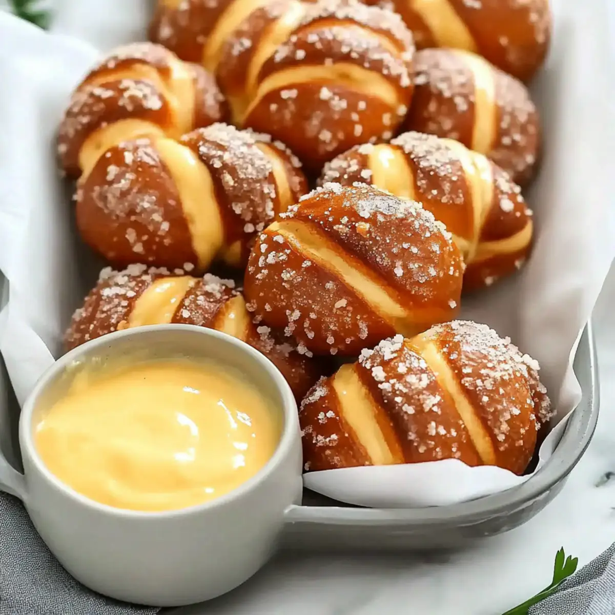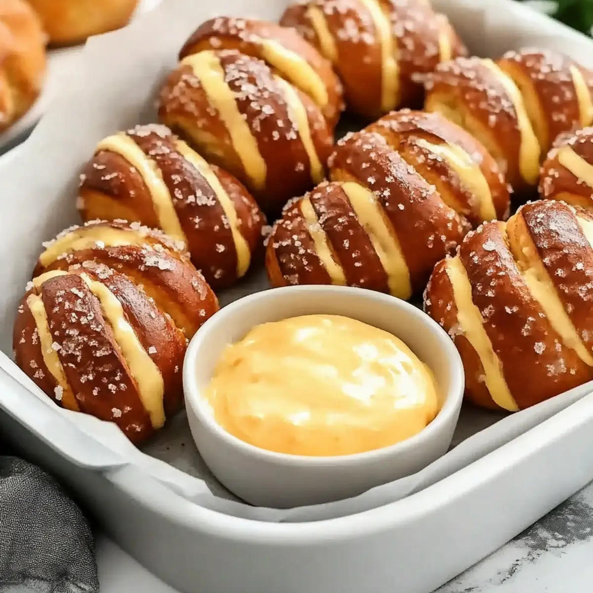 There’s something heartwarming about the tantalizing aroma of freshly baked pretzels wafting through the kitchen. As I roll out each piece of dough, I’m reminded of cozy gatherings, laughter, and shared moments with loved ones. Today, I’m excited to share my Homemade Soft Pretzels with Cheesy Dip—a comforting snack that effortlessly elevates any game day or casual get-together. The best part? This recipe is not only incredibly simple but also an absolute crowd-pleaser that will make even novice cooks shine. Whether you serve them straight-up or spice up the cheese dip with jalapeños, these pretzels are meant to be enjoyed together. Ready to impress your friends and family with this delightful duo? Let’s dive in! Why are these pretzels a must-try? Comforting Flavor: The combination of warm, soft pretzels and creamy cheese dip is irresistible, making this dish perfect for every gathering. Easy to Make: With simple ingredients and straightforward steps, even beginner cooks can master this recipe effortlessly. Versatile Options: Spice it up! You can customize your cheese dip with jalapeños or different cheeses like Gouda to kick things up a notch. Crowd-Pleaser: Perfect for game day or casual get-togethers, these pretzels are sure to steal the show and keep everyone coming back for more. Make-Ahead Friendly: Prepare in advance and enjoy fresh-tasting snacks by simply reheating the cheese dip when it’s time to serve. Pretzels and Cheese Dip Ingredients For the Pretzels • All-Purpose Flour – Provides structure and chewiness; you can substitute with bread flour for a different texture. • Instant Rise Yeast – Helps the dough rise quickly; ensure yeast is fresh for best results. • Brown Sugar – Adds a hint of sweetness and color; white sugar works too but may alter the flavor slightly. • Salt – Essential for enhancing the flavor of the pretzels. • Unsalted Butter – Adds richness and moisture; use salted butter if adjusting for extra saltiness. • Water – Activates the yeast; use lukewarm water (not over 110°F) to avoid killing the yeast. • Baking Soda – Crucial for the boiling bath; it develops a chewy texture and golden-brown color. • Egg (Beaten) – For brushing on pretzels to achieve a shiny crust. • Coarse Salt – For topping, enhances the savory flavor of the pretzels. For the Cheese Dip • Unsalted Butter – Adds a rich base; start with this for a creamy consistency. • All-Purpose Flour – Thickens the cheese dip, ensuring a smooth texture; use it to create a roux. • Warm Milk – Gradually added to create a creamy dip; warm it to help the butter and flour blend easily. • Shredded Cheese – Use your favorite cheese like Cheddar or Monterey Jack for a gooey dip; feel free to mix in different cheeses for variety. • Optional Add-ins – Add diced jalapeños or a splash of hot sauce for a spicy kick that really enhances your pretzels and cheese dip experience! Get ready to create a delightful snack that will surely be loved by all! Step‑by‑Step Instructions for Pretzels and Cheese Dip Step 1: Prep the Dough In a large mixing bowl, dissolve 2 teaspoons of instant rise yeast in 1 ½ cups of lukewarm water (about 110°F) along with 2 tablespoons of brown sugar and 1 teaspoon of salt. Then, mix in 4 cups of all-purpose flour and 4 tablespoons of melted unsalted butter. Combine until a dough forms, ensuring it’s slightly sticky but still manageable to handle. Step 2: Knead the Dough Dust a clean surface with flour and transfer the dough onto it. Knead the dough for about 2 minutes, adding flour if necessary until it’s smooth and elastic. After kneading, cover it with a kitchen towel and let it rest for 10 minutes. This resting period allows the dough to relax and makes shaping easier. Step 3: Shape the Pretzels After resting, divide the dough into 8 equal pieces, then roll each piece into a long rope about 1/2 inch thick. Cut each rope into 1.5-inch pieces for bite-sized pretzels. Ensure they are uniform for even baking. Arrange these pieces on a parchment-lined baking sheet, ready for the next step. Step 4: Create the Baking Soda Bath In a large pot, bring 4 cups of water to a boil and stir in ¼ cup of baking soda. This solution is essential for achieving that classic chewy texture and beautiful golden-brown color in your pretzels. Carefully place each pretzel piece into the boiling water for 20 seconds, using a slotted spoon to remove them afterwards. Step 5: Bake the Pretzels Preheat your oven to 425°F. Place the boiled pretzel pieces back onto the lined baking sheet, ensuring they have space between them. Brush each with a beaten egg for a shiny crust and sprinkle with coarse salt. Bake for 12-15 minutes until they’re golden and puffed up, filling your kitchen with an irresistible aroma. Step 6: Prepare the Cheese Dip In a saucepan over medium heat, melt 4 tablespoons of unsalted butter, then whisk in ¼ cup of all-purpose flour. Stir continuously for about 2 minutes until it turns light brown. Gradually add in 2 cups of warm milk, stirring until the mixture thickens. Slowly incorporate 2 cups of shredded cheese until melted and smooth, creating a creamy cheese dip to pair with your soft pretzels. What to Serve with Homemade Soft Pretzels and Cheesy Dip Enhance your gatherings with delightful pairings that complement the irresistible softness of pretzels and the creamy allure of cheese dip. Fresh Veggie Platter: Crisp celery, carrots, and bell peppers add a refreshing crunch that balances the warmth of the pretzels. Fruit Medley: Pair with sliced apples or juicy grapes for a sweet contrast that brightens every bite. The natural sweetness plays beautifully against the savory flavors. Spiced Nuts: Offer a bowl of mixed seasoned nuts for a satisfying crunch and varied flavor profile. The nuttiness pairs well with the cheese dip, elevating your snack table. Craft Beer: Go for a light lager or a smooth IPA that cuts through the r
