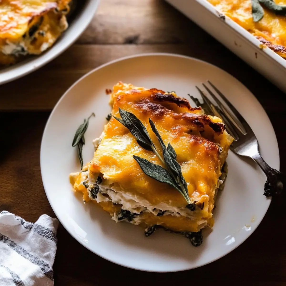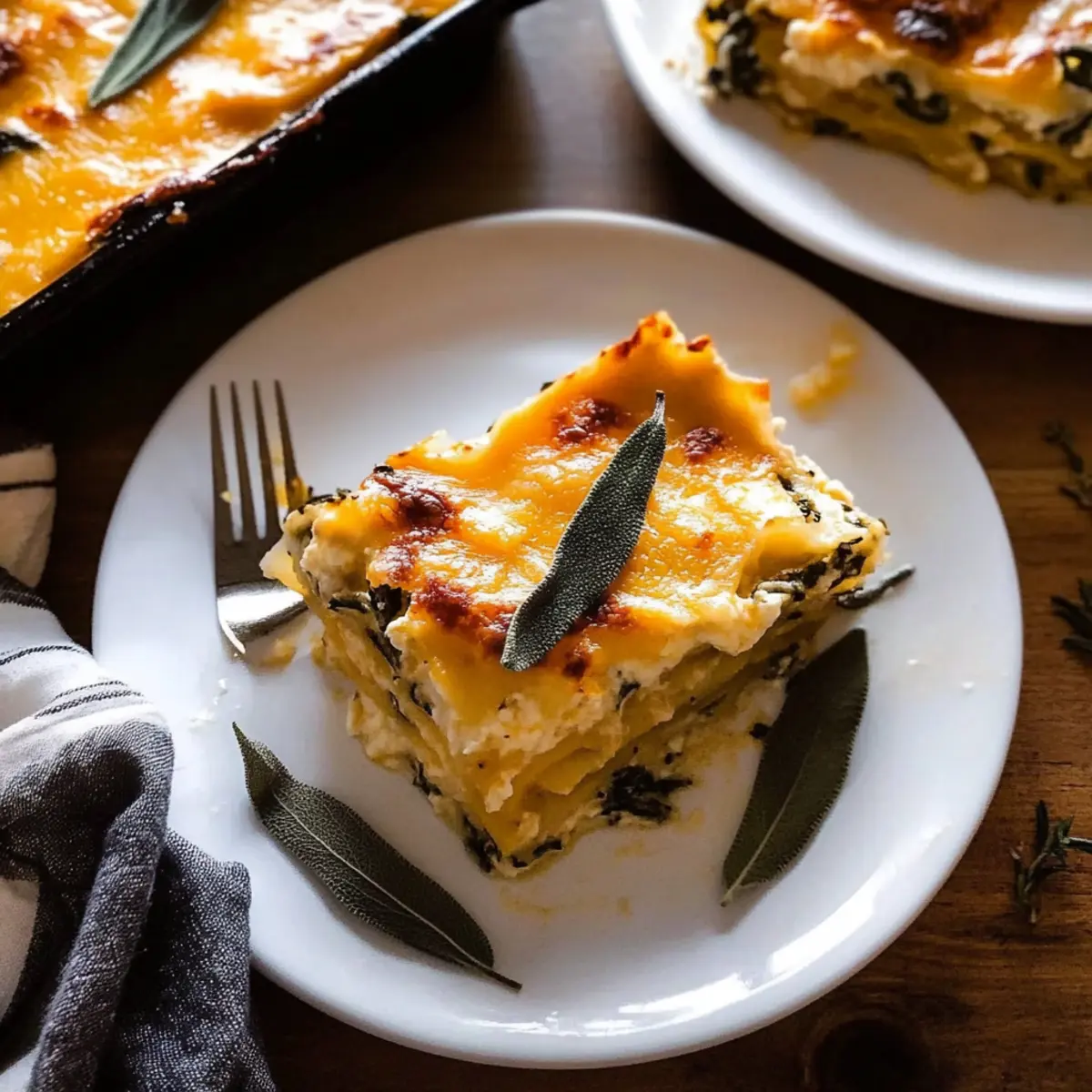 Steam rises from the bubbling casserole in the oven, filling the kitchen with the comforting aroma of fall. My first encounter with this Creamy Pumpkin Sage White Lasagna was a revelation—it’s not just a meal; it’s a celebration of harvest flavors that transforms any gathering. Combining layers of rich ricotta, velvety pumpkin puree, and fragrant sage, this dish is a true comfort food masterpiece that’s perfect for Thanksgiving dinner. One of the best parts? It can be prepped ahead of time, making your holiday hosting a breeze! Gather your loved ones around the table, and let the warm, creamy goodness do the talking. Curious to learn how to create this seasonal delight? Let’s dive into the recipe! Why is this lasagna a must-try? Comforting Flavors: Each bite embodies the essence of fall with creamy pumpkin, aromatic sage, and layers of cheese, making it irresistible. Make-Ahead Convenience: Prep it a day in advance for a stress-free Thanksgiving dinner—just pop it in the oven! Versatile Ingredient Swaps: Feel free to customize with spinach instead of kale or different cheeses, ensuring it’s tailored to your taste. Crowd-Pleasing Appeal: It’s a dish that unites everyone at the table. Pair it with a light salad or even a glass of white wine for the perfect finish! Rich, Creamy Texture: The silky bechamel sauce and rich ricotta create a luxurious mouthfeel, leaving you craving more. Dive into cozy comfort with this Pumpkin Sage White Lasagna! Pumpkin Sage White Lasagna Ingredients This Creamy Pumpkin Sage White Lasagna is crafted with delightful layers of flavor and comfort, ensuring each ingredient sings! For the Bechamel Sauce Salted Butter – Adds richness and flavor to the bechamel; unsalted works well too. Sage Leaves – Infuse the butter with aromatic flavor—fresh thyme is a great substitute. Rosemary Sprigs – Complements sage in the bechamel, but use dried rosemary in smaller amounts. Garlic (minced) – Provides depth and savoriness; any variety is good. Fresh Oregano (chopped) – Enhances the herb profile—dry oregano can also work (1 tsp). All-Purpose Flour – Thickens the bechamel; gluten-free flour is a suitable alternative. Whole Milk – Forms the base of the sauce; feel free to use low-fat or plant-based for a lighter option. Apple Cider (or Vegetable Broth) – Adds sweetness and depth; chicken broth works for a non-vegetarian twist. Fresh Kale (roughly chopped) – Boosts nutrition and texture; spinach can be swapped in easily. For the Filling Whole Milk Ricotta Cheese – Provides creamy richness; try cottage cheese or a vegan substitute in its place. Pumpkin Puree – The star of the dish, delivering color and creaminess—do not use pumpkin pie filling. Egg – Binds the filling together; a flax egg or applesauce works for a vegan option. Cinnamon – Adds warmth and a hint of spice; nutmeg can also stand alone if preferred. Nutmeg – Enhances flavor—can be left out if you don’t have it. Fresh Parmesan Cheese (grated) – Adds savory flavor and texture; Grana Padano or nutritional yeast is a great vegan alternative. Smoked Gouda (shredded) – Complements pumpkin with a smoky note; regular gouda or mozzarella is perfect too. For the Lasagna Assembly No-Boil Lasagna Noodles – Essential for easy preparation; traditional noodles require pre-cooking, which you can skip! With these ingredients, you are all set to create your very own Pumpkin Sage White Lasagna that will warm hearts and tummies alike. Let’s get into the fun part—cooking! Step‑by‑Step Instructions for pumpkin sage white lasagna Step 1: Preheat the Oven Start by preheating your oven to 375°F (190°C) and lightly grease a 9×13 inch baking dish with butter or cooking spray. This will ensure that your creamy pumpkin sage white lasagna slides out perfectly once it’s baked. While your oven is heating, gather your ingredients and equipment so you’re ready to move smoothly into the next steps. Step 2: Make the Bechamel Sauce In a medium saucepan over medium heat, melt salted butter, then add sage leaves and rosemary sprigs. Cook for about 2-3 minutes until the herbs are crispy and fragrant. Remove them, and stir in minced garlic and oregano, cooking for another minute. Whisk in all-purpose flour until smooth, then slowly pour in whole milk and apple cider, stirring continuously. Bring the mixture to a boil, letting it thicken for 4-5 minutes before folding in the roughly chopped kale. Step 3: Prepare the Pumpkin Filling While the bechamel sauce is thickening, prepare the pumpkin filling. In a large bowl, dab your pumpkin puree with paper towels to remove excess moisture for a better texture. Combine the dried pumpkin puree with whole milk ricotta cheese, egg, cinnamon, nutmeg, grated Parmesan cheese, salt, and pepper. Mix thoroughly until all ingredients are well blended, making a creamy, rich filling for your pumpkin sage white lasagna. Step 4: Assemble the Lasagna Begin layering your lasagna by pouring a quarter of the bechamel into the bottom of the greased baking dish. Next, place a layer of no-boil lasagna noodles, followed by one third of the ricotta mixture, and a sprinkle of smoked gouda cheese. Repeat these layers two more times, ensuring that you finish with a top layer of noodles covered with the remaining bechamel and extra gouda for that gooey, cheesy finish. Step 5: Bake the Lasagna Cover the assembled pumpkin sage white lasagna with aluminum foil to retain moisture, and place it in the preheated oven. Bake for 30 minutes, then carefully remove the foil and continue baking for an additional 15-20 minutes. You’ll know it’s done when the cheese on top is golden and bubbly, inviting you to dive in. Step 6: Rest Before Serving Once baked to perfection, remove the pumpkin sage white lasagna from the oven and allow it to rest for 10 minutes before slicing. This resting time helps the layers set up nicely, making it easier to serve, while the flavors meld even fu