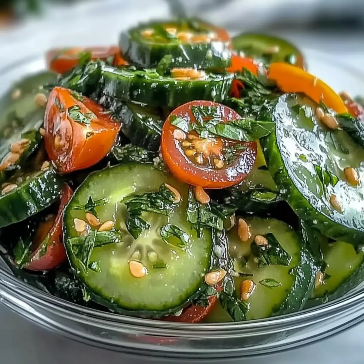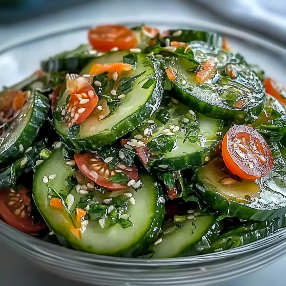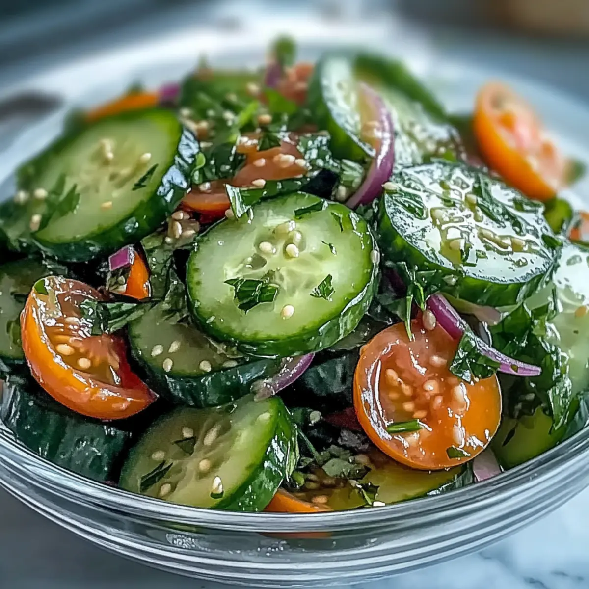 The first bite of summer is often found in the simplest of dishes, and this Refreshing Crunchy Cucumber Salad delivers just that. With a delightful crunch and an uplifting tang from the dressing, this salad is a staple I always turn to when the sun is shining. It’s quick and easy to whip up, making it a perfect last-minute addition to any outdoor gathering or cozy dinner at home. As a versatile dish, it pairs wonderfully with grilled meats or spicy tacos, ensuring you satisfy every palate at the table. Plus, it’s vegan-friendly and gluten-free—ideal for those seeking light yet satisfying summer fare. Are you ready to elevate your next meal with this refreshing twist on a classic? Why Is This Cucumber Salad So Special? Vibrant, Crunchy Freshness: Each bite is a delightful explosion of crisp cucumber, making it the ultimate summer refresher. Easily Customizable: Whether you want to add sweet cherry tomatoes or spicy jicama, the options are endless! Quick Preparation: Whip it up in under 30 minutes—perfect for those busy days when you crave something light. Vegan & Gluten-Free: Everyone can enjoy this salad, making it a great side for gatherings. Perfect Pairing: It complements grilled meats beautifully or can enhance your favorite spicy noodles like in a Cucumber Strawberry Salad or a Fruit Salad Refreshing. Healthful Indulgence: Low in calories yet rich in vitamins, it’s the ideal guilt-free side dish for warm weather meals! Refreshing Crunchy Cucumber Ingredients • Perfect for a summer side dish! For the Salad English or Persian Cucumbers – These provide the best crunch; if using regular cucumbers, peel and remove seeds to avoid excess water. Red Onion – Adds sharpness and vibrant color. Carrot (optional) – Offers a sweet crunch; a great way to enhance texture. Cherry Tomatoes (optional) – Introduces juiciness, making each bite unforgettable. Thinly Sliced Jicama or Watermelon Radish (optional) – These contribute a delightful crunch and mild sweetness. Chopped Fresh Dill or Mint – Elevates flavor; choose dill for a fresh note or mint for an aromatic twist. For the Dressing Rice Vinegar or Apple Cider Vinegar – Provides the essential tang; lime juice can be used for a zesty update. Extra-Virgin Olive Oil or Toasted Sesame Oil – Creates a rich dressing; toasted sesame oil adds an Asian flair. Granulated Sugar or Honey – Balances the acidity; adjust quantity to suit your taste. Kosher Salt – Essential for seasoning and drawing out moisture from the cucumbers. Freshly Ground Black Pepper – Adds depth and spice to the salad. For the Garnish Toasted Sesame Seeds or Chopped Almonds (optional) – These add a flavorful crunch and visual appeal to the dish. This salad isn’t just delicious—it’s also an opportunity for creativity! So, gather these ingredients and bring a refreshing crunch to your table with this Refreshing Crunchy Cucumber Salad. Step‑by‑Step Instructions for Refreshing Crunchy Cucumber Salad Step 1: Prepare Cucumbers Start by washing 2 to 3 English or Persian cucumbers under cold running water. Slice them into 1/8-inch rounds using a sharp knife, ensuring even thickness for a uniform crunch. If you’re opting for standard cucumbers, peel them first and scoop out the seeds to prevent excess moisture in your refreshing crunchy cucumber salad. Step 2: Salt Cucumbers Place the cucumber slices into a colander and sprinkle them with ¼ teaspoon of kosher salt. Allow the salted cucumbers to sit for about 10 minutes, which will draw out excess moisture, enhancing the crisp texture and flavor profile of your refreshing crunchy cucumber salad. You’ll notice the slices start to glisten as they release water. Step 3: Rinse and Dry After the cucumbers have drained, rinse them under cold water to remove the surface salt. This step prevents your salad from becoming overly salty. Then, gently pat the cucumber slices dry with a clean kitchen towel or paper towels, ensuring they are moisture-free, which is key for achieving that delightful crunch in the final dish. Step 4: Make Dressing In a medium bowl, whisk together 3 tablespoons of rice vinegar, 2 tablespoons of extra-virgin olive oil, 1 teaspoon of granulated sugar or honey, and ¼ teaspoon of black pepper. Mix until smooth, combining these ingredients thoroughly to marry the tangy and sweet flavors that will elevate your refreshing crunchy cucumber salad to new heights. Step 5: Combine Ingredients In a large mixing bowl, combine the dried cucumber slices with ½ of a thinly sliced red onion and any optional ingredients like diced carrots or cherry tomatoes. Sprinkle in a generous handful of freshly chopped dill or mint for that aromatic touch. Gently toss everything together to evenly distribute the ingredients before adding the dressing. Step 6: Add Dressing Pour the dressing over the cucumber mixture, then toss again until all the ingredients are well coated. Ensure every piece of cucumber and onion has a lovely sheen from the dressing, making your refreshing crunchy cucumber salad not only flavorful but visually appealing. Step 7: Chill & Serve Cover the salad with plastic wrap or a lid and refrigerate for at least 20 minutes to let the flavors meld and the salad chill. This short wait enhances the overall taste experience. Aim to serve your refreshing crunchy cucumber salad within 2 hours for the best texture and flavor, garnishing with extra herbs and toasted sesame seeds right before serving. Storage Tips for Refreshing Crunchy Cucumber Salad Fridge: Store your refreshing crunchy cucumber salad in an airtight container in the refrigerator for up to 24 hours to maintain its crispness. Best Served Fresh: For the ultimate experience, aim to serve the salad fresh. If prepared ahead, add the dressing just before serving to prevent sogginess. Reheating: This salad is best enjoyed cold; avoid reheating as it can alter the texture and freshness of the ingredients. Leftover Ideas: If you have extra 