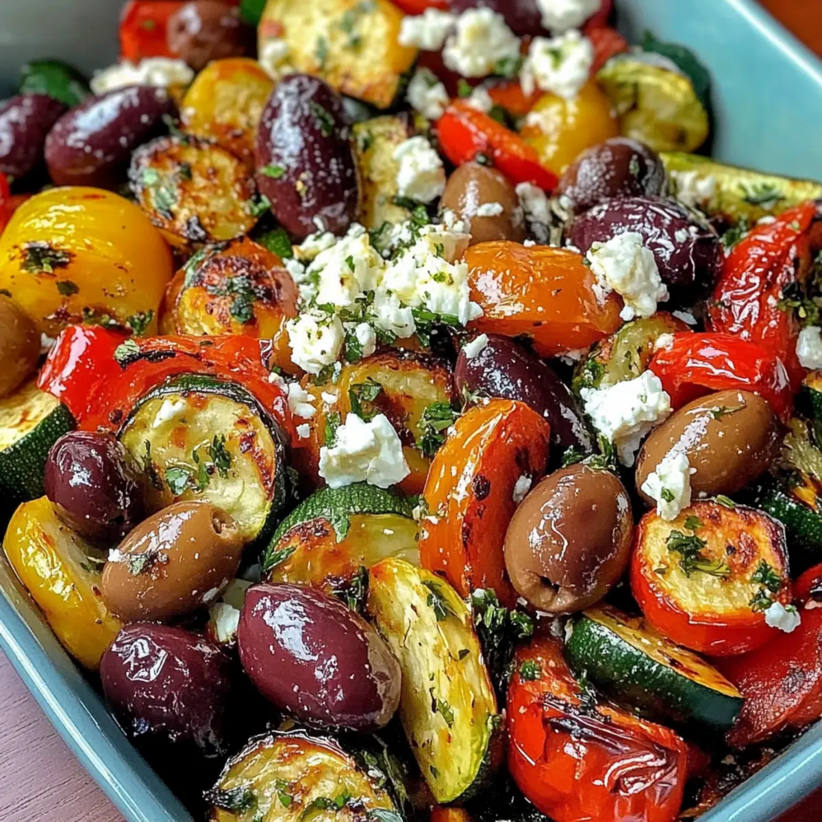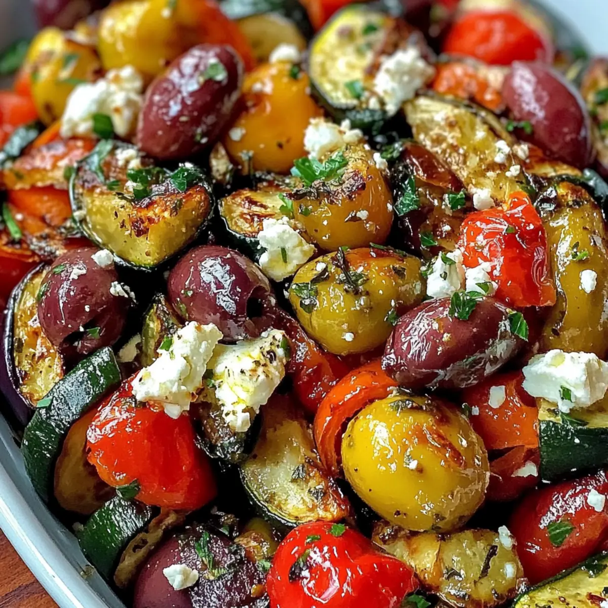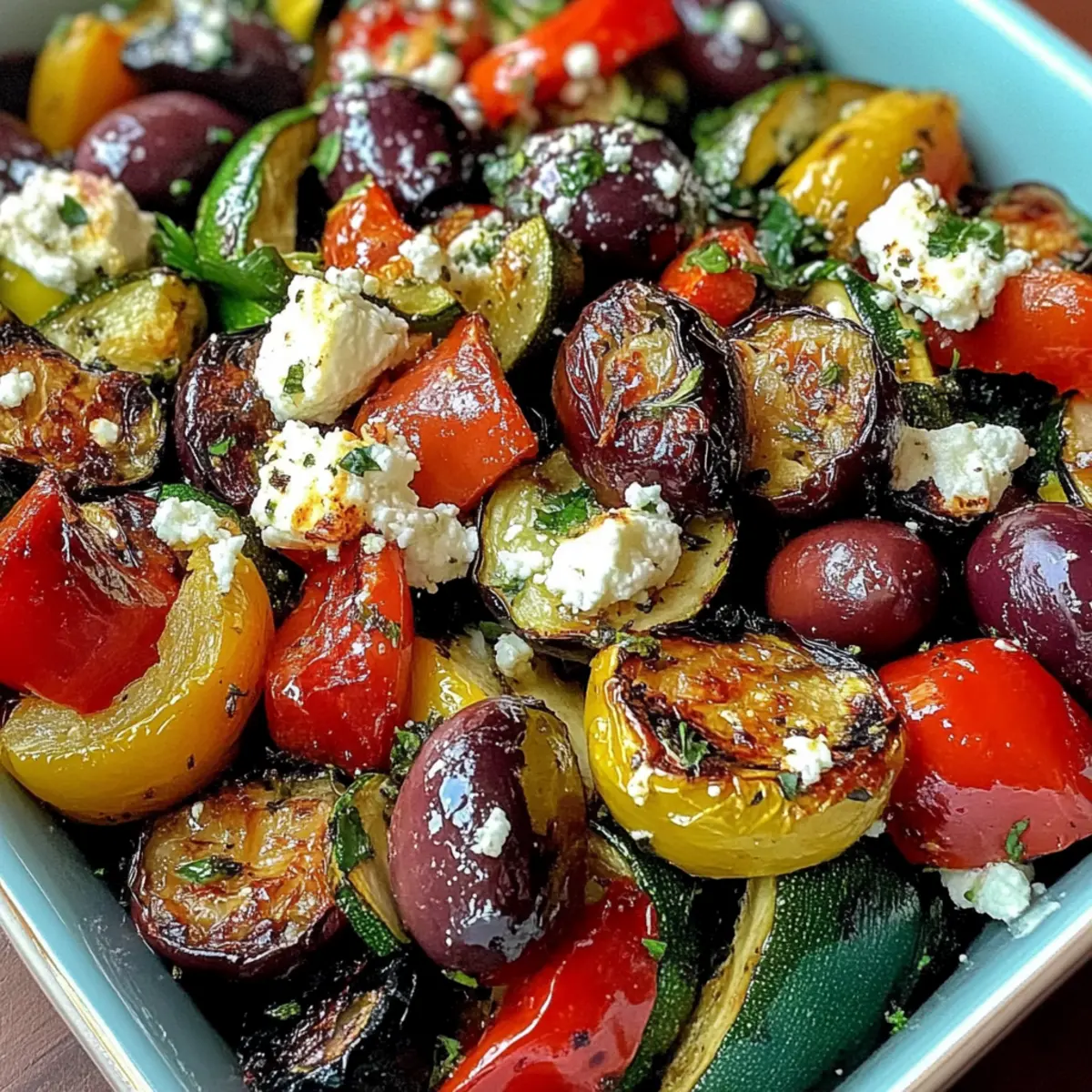 As I stand in my kitchen, the fragrant aroma of roasted Mediterranean Greek vegetables wafts through the air, instantly transporting me to sun-soaked coastlines dotted with olive groves. This dish is my go-to for casual gatherings or cozy family dinners, effortlessly blending tender veggies with the savory touch of Kalamata olives and the creamy delight of feta cheese. Roasted Mediterranean Greek Vegetables shine not just for their vibrant colors and wholesome ingredients, but also for their easy preparation and versatility as a healthy side dish—or even a light main. Imagine serving this at your next meal, where each bite bursts with the essence of the Mediterranean! Curious about how to make this delicious dish a staple in your kitchen? Let’s dive into the recipe together! Why Are Roasted Mediterranean Vegetables A Must-Try? Simplicity makes this dish a favorite; with just a few steps, you can whip up a colorful array that elevates any meal. Versatile, it pairs excellently with grilled meats or can stand alone as a hearty main. Bursting with flavors from fresh herbs, garlic, and a drizzle of lemon, each bite is a taste of the Mediterranean. Healthy and low in calories, these roasted veggies are packed with nutrients, making them a guilt-free indulgence. For even more Mediterranean inspiration, try making a Mediterranean Chickpea Salad alongside or enjoy them with a slice of crusty bread for a complete meal. Roasted Mediterranean Greek Vegetables Ingredients For the Vegetables • Eggplant – Adds texture and a meaty quality; cut into 1-inch cubes for even roasting. • Zucchini – Provides softness and balance; slice medium-sized zucchinis into 1/2-inch rounds. • Red Bell Pepper – Contributes sweetness and vibrant color; seed and cut into 1-inch pieces. • Yellow Bell Pepper – Adds a pop of color and mild flavor; prepare similarly to red pepper. • Red Onion – Introduces a mild sweetness when roasted; cut into wedges for easy cooking. • Cherry Tomatoes – Provide bursts of juiciness and freshness; use a pint whole for added flavor. For Flavor • Garlic – Enhances flavor with depth; mince for better distribution throughout the dish. • Extra-Virgin Olive Oil – Used for roasting and adding flavor; about 3 tablespoons is recommended. • Dried Oregano – Infuses the dish with Mediterranean herbs; one teaspoon recommended for a fragrant taste. • Dried Thyme & Rosemary – Adds aromatic depth; use half a teaspoon each, crushed for best results. • Salt & Black Pepper – Enhances overall flavor; adjust to taste for the perfect seasoning. For the Finish • Lemon Juice – Brightens and balances flavors; use the juice of 1/2 lemon for a zesty touch. • Kalamata Olives – Provides a salty, tangy contrast; optional, but 1/2 cup pitted adds great flavor. • Feta Cheese – Adds creaminess and tang; crumbled, it’s optional but highly recommend (100 grams). • Fresh Parsley – Freshness and color; chop for garnish before serving the roasted Mediterranean Greek vegetables. Step‑by‑Step Instructions for Roasted Mediterranean Greek Vegetables Step 1: Preheat the Oven Begin your culinary adventure by preheating your oven to 400°F (200°C). This temperature is vital for achieving that golden-roasted perfection in your Mediterranean Greek vegetables. Make sure your oven rack is positioned in the middle for even cooking. While the oven warms up, gather your fresh produce and get ready to chop those vibrant veggies! Step 2: Prepare the Vegetables In a large mixing bowl, combine eggplant, zucchini, red and yellow bell peppers, and red onion. Cut the eggplant into 1-inch cubes, zucchinis into 1/2-inch rounds, and the bell peppers into 1-inch pieces. Use the onion in wedges for even roasting. The assortment of colors and textures will create a feast for the eyes as you prepare the Roasted Mediterranean Greek Vegetables. Step 3: Add Seasonings and Coat Drizzle about 3 tablespoons of extra-virgin olive oil over the vegetables in the bowl. Sprinkle in dried oregano, thyme, rosemary, salt, and black pepper to enhance the dish’s Mediterranean flavors. With your hands or a large spoon, toss the veggies well to ensure they are evenly coated in the oil and seasonings, enveloping them in aromatic goodness. Step 4: Arrange on Baking Sheet Take a large rimmed baking sheet and spread the seasoned vegetables in a single layer. This step is crucial; overcrowding might lead to steaming instead of roasting. Use a spatula to arrange the veggies to allow maximum surface area for browning. This way, your Roasted Mediterranean Greek Vegetables will crisp nicely on the edges. Step 5: First Roasting Place the baking sheet in the preheated oven and roast the vegetables for 20 minutes. This initial phase allows them to soften and develop caramelized edges. Keep an eye out for that lovely golden-brown hue forming on the edges, which signifies they are nearly done. This will provide a great base for the next roasting phase. Step 6: Flip for Even Cooking After 20 minutes, carefully remove the baking sheet and use a spatula to mix or flip the vegetables gently. This movement ensures every piece gets equal exposure to the heat, promoting an even roasting process. Return the baking sheet to the oven and let it roast for a few more minutes, letting those flavors come together beautifully. Step 7: Add Cherry Tomatoes and Garlic Next, it’s time to introduce the cherry tomatoes and minced garlic to your vibrant medley. Add them directly to the pan, gently tossing them among the other vegetables. The cherry tomatoes will burst with juices, marrying perfectly with the garlic’s aromatic punch. This step is an essential part of preparing your Roasted Mediterranean Greek Vegetables! Step 8: Final Roasting Phase Put the baking sheet back in the oven and roast for an additional 10 to 12 minutes. Keep an eye on the vegetables; they should be tender and nicely caramelized. The garlic will develop a swee
