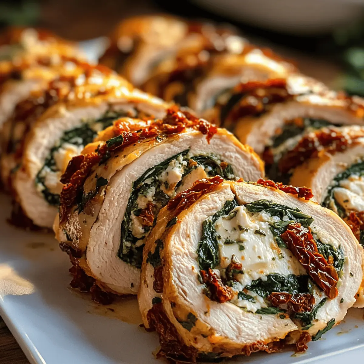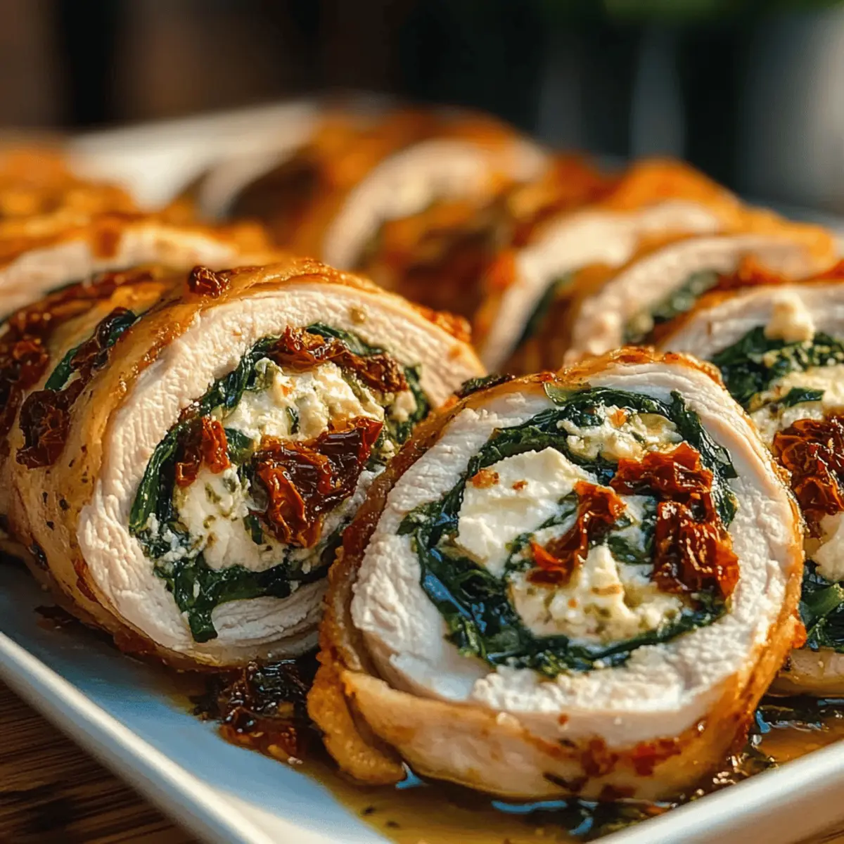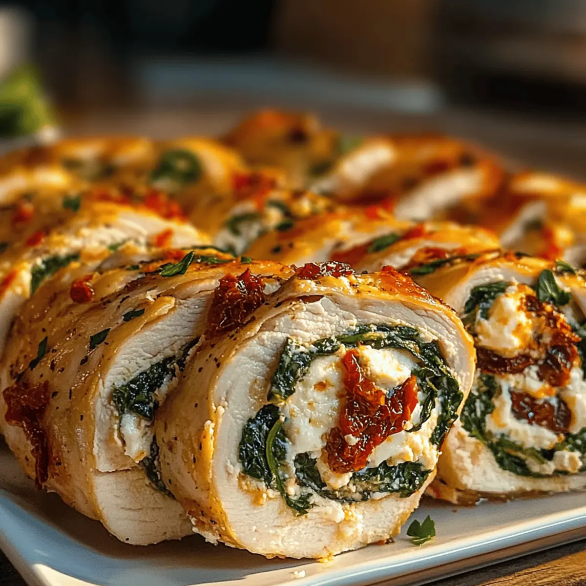 As I grabbed my trusty frying pan one hectic weeknight, I wished for a meal that could whisk me away to the sun-soaked shores of the Mediterranean, leaving the chaos of the day behind. That’s when I stumbled upon this Rolled Up Chicken with Feta, Spinach, and Sun-Dried Tomatoes. This dish is not only a feast for the eyes, but it’s also a quick-prep wonder that takes just 15 minutes of your time, making it the ultimate dinner recipe for busy evenings. The layers of creamy feta, vibrant spinach, and sweet sun-dried tomatoes create a symphony of flavors that will delight everyone at your table. Plus, it’s extremely adaptable for meal prep, allowing you to savor gourmet flavors without the fuss. Are you ready to roll up your sleeves and dive into a Mediterranean-inspired meal that will have your taste buds dancing? Why is this chicken recipe a must-try? Simplicity: With just a 15-minute prep time and only a few ingredients, whipping up this dish is a breeze. Flavor Explosion: The combination of creamy feta, fresh spinach, and sweet sun-dried tomatoes creates a deliciously vibrant taste that transports you to the Mediterranean. Weeknight Friendly: Perfect for busy evenings, this meal cooks in under an hour, making it a go-to for satisfying dinners. Versatile Ingredients: Easily swap in your favorites—try goat cheese or add olives for an extra twist that can match your palate. Meal Prep Hero: Prepare the filling ahead of time and keep your week organized. Plus, check out other delicious options like Cilantro Lime Chicken for a fun variety! Your family will love the presentation and flavor, making this dish a surefire crowd-pleaser at your table. Rolled Up Chicken Ingredients • Let’s gather everything for our Rolled Up Chicken with Feta, Spinach, and Sun-Dried Tomatoes! For the Filling Boneless, Skinless Chicken Breasts – A juicy main protein source; turkey can be a lean alternative. Fresh Spinach – Provides a pop of color and nutrition; Swiss chard or kale work well as substitutes. Feta Cheese, Crumbled – The creamy, tangy flavor that elevates your dish; goat cheese offers a different yet delightful taste. Sun-Dried Tomatoes, Chopped – Adds sweetness and a unique texture; fresh tomatoes can be used but may alter the dish’s moisture. Garlic, Minced – Elevates the overall flavor profile; garlic powder can fill in if you’re short (1 teaspoon). Dried Oregano – The Mediterranean aroma brings everything together; feel free to swap it for Italian seasoning. Salt and Pepper, to Taste – Essential for enhancing flavors. For Cooking Olive Oil – Adds richness while cooking; consider avocado oil or butter as alternatives. Chicken Broth – Keeps the chicken moist during baking; vegetable broth works wonderfully for a vegetarian option. Step‑by‑Step Instructions for Rolled Up Chicken with Feta, Spinach, and Sun-Dried Tomatoes Step 1: Preheat Oven Begin by preheating your oven to 375°F (190°C) while you prepare your workspace. This step ensures that your Rolled Up Chicken with Feta, Spinach, and Sun-Dried Tomatoes cooks evenly and develops a lovely golden-brown crust. While the oven heats, gather your ingredients and equipment for a smooth cooking process. Step 2: Prepare Filling In a mixing bowl, combine fresh spinach, crumbled feta cheese, chopped sun-dried tomatoes, minced garlic, dried oregano, salt, and pepper. Mix well to ensure that every bite of your filling has the perfect balance of flavors. This vibrant mixture is the star of your rolled chicken, providing that Mediterranean-inspired taste you’re after. Step 3: Flatten Chicken Take the boneless, skinless chicken breasts and place them between two sheets of plastic wrap. Using a meat mallet or rolling pin, gently pound the chicken to about 1/2 inch thickness. This step not only helps the chicken cook evenly but also makes it easier to roll. Aim for a uniform thickness to ensure tenderness throughout. Step 4: Assemble Rolls Lay out each flattened chicken breast on your workspace. Spoon a generous amount of the spinach filling along one edge of each breast. Carefully roll the chicken tightly around the filling and secure the roll using toothpicks or kitchen twine to keep everything cozy inside. These beautifully rolled pieces are the essence of your Rolled Up Chicken dish. Step 5: Sear Chicken Heat a splash of olive oil in an oven-safe skillet over medium-high heat. Once the oil is shimmering, place the chicken rolls seam-side down in the skillet. Sear each roll for 3-4 minutes until they turn a delightful golden brown on all sides, ensuring a delicious crust that seals in the flavors. Step 6: Bake Chicken Once the chicken is nicely seared, pour in the chicken broth around the rolls, which helps keep them moist during baking. Carefully transfer the skillet to your preheated oven and bake for 25-30 minutes. Keep an eye on them; you’ll know they’re ready when the internal temperature reaches 165°F (74°C), ensuring juicy and perfectly cooked chicken. Step 7: Rest & Serve Remove the skillet from the oven and allow the Rolled Up Chicken to rest for about 5 minutes. This step is crucial for juicy chicken! After resting, slice each roll into bite-sized pieces to reveal the colorful filling. Serve and enjoy the burst of Mediterranean flavors at your dining table! What to Serve with Rolled Up Chicken with Feta, Spinach, and Sun-Dried Tomatoes There’s nothing quite like a delightful meal that makes your taste buds dance, and this chicken dish can be beautifully complemented with the right sides. Creamy Mashed Potatoes: Their buttery texture pairs perfectly with the juicy chicken, soaking up any delicious juices from the dish. Garlic Roasted Broccoli: The savory crunch of roasted broccoli adds a vibrant green contrast and balances your plate beautifully. Couscous Salad with Lemon Vinaigrette: This light and fluffy salad uplifts the Mediterranean flavors, offering a zesty, refreshing twist that matches the chicken