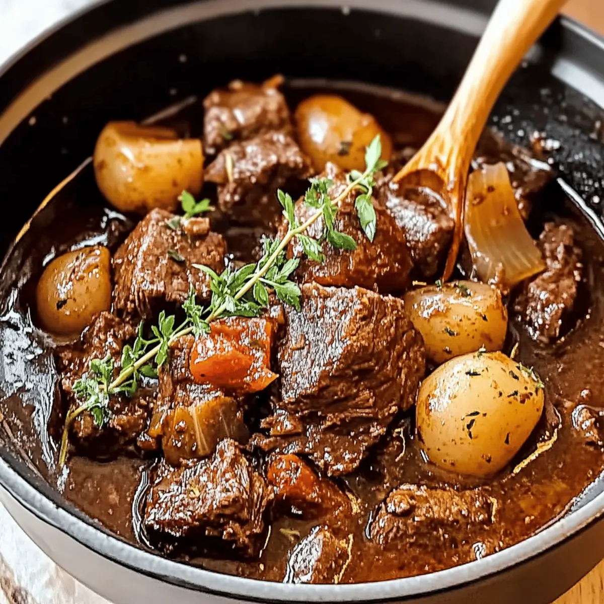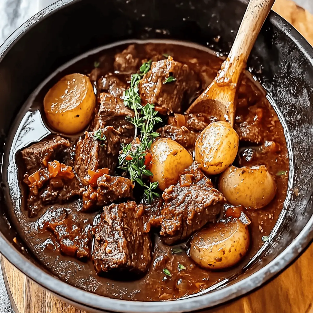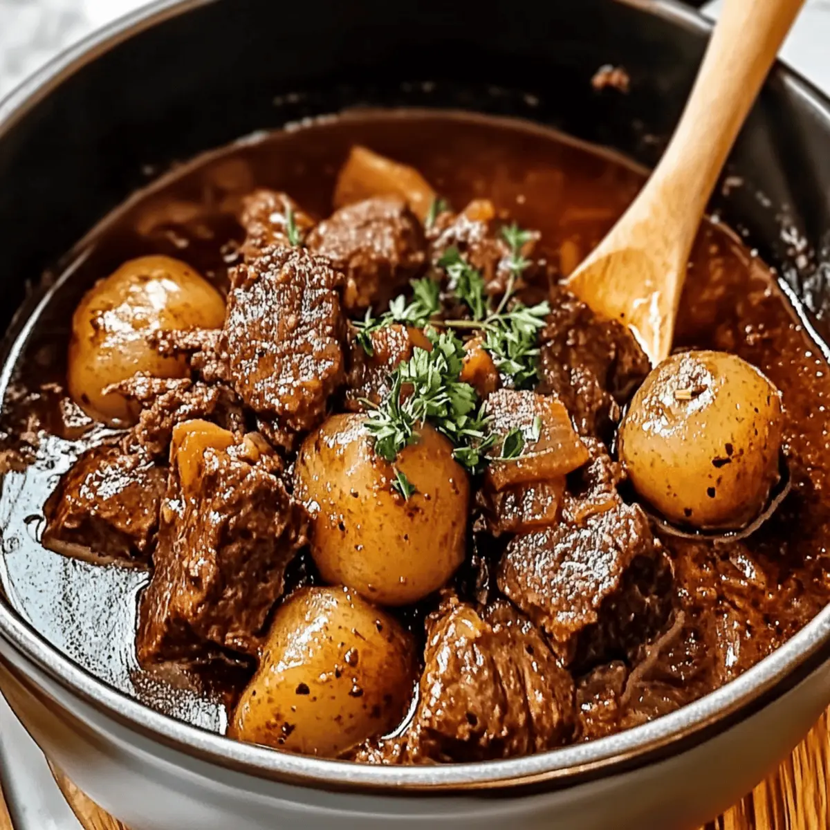 The rich aroma of cinnamon and tender beef brings me back to sun-soaked Mediterranean afternoons, where hearty meals are a way of life. For anyone who seeks the warmth and comfort of home cooking, this Savory Beef Stifado recipe is a must-try. With its luscious tomato base and melt-in-your-mouth meat, it’s not just a stew—it’s a celebration of flavors and memories. This dish is perfect for cozy family dinners and gatherings, offering a delicious escape from the hustle of everyday life. Plus, it’s make-ahead friendly, giving you the ultimate stress-free dinner solution while still impressing your guests. Are you ready to discover how to create your own comforting hug from the Mediterranean? Why is Beef Stifado so special? Comforting Aroma: The warm scent of cinnamon wafts through your kitchen, inviting loved ones to gather around the table. Tender Perfection: Each bite features melt-in-your-mouth beef, slowly cooked to absolute tenderness. Versatile Ingredients: Swap in lamb or add sweet potatoes for a personal touch! Make-Ahead Magic: Perfect for prepping in advance—just reheat for quick, hearty dinners. Crowd-Pleasing Delight: Impress your guests with this Mediterranean classic, served alongside a refreshing Greek salad. Hearty Satisfaction: This stew offers not just a meal, but a moment to savor, turning family dinners into cherished memories. Savory Beef Stifado Ingredients For the Stew Beef Chuck – Well-marbled for tenderness; shoulder can be used as a substitute. Olive Oil – Essential for browning and sautéing; light oil can be substituted. Onions – Adds sweetness and depth; pearl onions or shallots can also be used. Garlic – Enhances flavor; fresh is recommended for the best results. Red Wine – Introduces acidity and depth; can substitute with beef broth and a splash of red wine vinegar. Crushed Tomatoes – Forms the stew base; whole tomatoes can be crushed manually. Cinnamon Stick – Provides warmth; ground cinnamon is a quick substitute. Bay Leaves – Infuses flavor; remember to remove before serving. Dried Oregano – Adds herbal notes; fresh oregano elevates flavor beautifully. Red Wine Vinegar – Brightens flavors; can substitute with lemon juice. Honey – Balances acidity; sugar is an alternative if honey is not available. For Serving Fresh Parsley – Adds color and freshness; other fresh herbs can also be used. Crusty Bread, Rice, or Mashed Potatoes – Perfect sides for soaking up the Savory Beef Stifado sauce. Step‑by‑Step Instructions for Savory Beef Stifado Step 1: Brown the Beef In a large pot, heat 2 tablespoons of olive oil over medium-high heat. Once hot, add the beef chunks, searing them for about 5-7 minutes. Ensure the pieces are nicely browned on all sides, enhancing the flavor of your Savory Beef Stifado. Once browned, transfer the beef to a plate and set aside. Step 2: Sauté Onions and Garlic In the same pot, add another tablespoon of olive oil if needed, and toss in the chopped onions. Sauté them over medium heat for about 5 minutes until they become translucent and fragrant. Next, add minced garlic and continue to cook for an additional minute, stirring constantly to prevent burning. The aroma will fill your kitchen and lay the foundation for your savory stew. Step 3: Deglaze with Red Wine Pour in 1 cup of red wine, using a wooden spoon to scrape up those flavorful browned bits stuck to the bottom of the pot. This deglazing process should take about 3-4 minutes. Allow the wine to simmer, enhancing the depth of flavor in your Savory Beef Stifado, while the alcohol evaporates and the sauce thickens slightly. Step 4: Add Tomatoes and Herbs Stir in 2 cans of crushed tomatoes along with a cinnamon stick, bay leaves, and 1 teaspoon of dried oregano. Let the mixture simmer for 1 minute, allowing the flavors to meld together beautifully. This step is crucial as it creates a rich, aromatic base for your stew that will envelop the tender beef. Step 5: Slow-Cook the Beef Return the browned beef along with any juices back to the pot. Next, stir in 2 tablespoons of red wine vinegar and 1 tablespoon of honey for a touch of sweetness. Cover the pot and reduce the heat to low, letting the stew simmer for 1.5 to 2 hours. You’ll know it’s ready when the beef is fork-tender and infused with all those delicious flavors. Step 6: Adjust Seasoning After the slow-cooking process, taste the stew and adjust seasoning as needed. Remember to remove the cinnamon stick and bay leaves before serving. This step is essential to ensure the perfect balance of flavors, allowing the Savory Beef Stifado to shine. Step 7: Serve Serve the hearty stew hot, ideally with crusty bread, fluffy rice, or creamy mashed potatoes to soak up the delicious sauce. Garnish with freshly chopped parsley to add a pop of color and freshness to your dish. Enjoy the comforting aromas and savor each bite of your homemade Savory Beef Stifado! Expert Tips for Savory Beef Stifado Batch Browning: Always brown the beef in batches to prevent steaming, ensuring each piece develops a rich flavor essential for your Savory Beef Stifado. Prep Ahead: You can chop the onions and garlic up to 24 hours in advance to save time on busy days. Perfect for Freezing: This stew is a make-ahead dream! Refrigerate for up to 3 days or freeze for up to 3 months for an easy meal. Taming the Saltiness: If your stew turns out too salty, simmering it with a peeled potato can help absorb excess saltiness. Taste Before Serving: Always taste and adjust the seasoning just before serving to ensure the flavors of the Savory Beef Stifado are balanced and robust. Savory Beef Stifado Variations Feel free to make this dish your own with these delightful twists that enhance the comforting flavors! Lamb Swap: Substitute beef with lamb for an even richer and more aromatic stew. Vegetarian Delight: Replace beef with hearty mushrooms or eggplant for a delicious plant-based version that’s still comforting. Sweet Potato Additi
