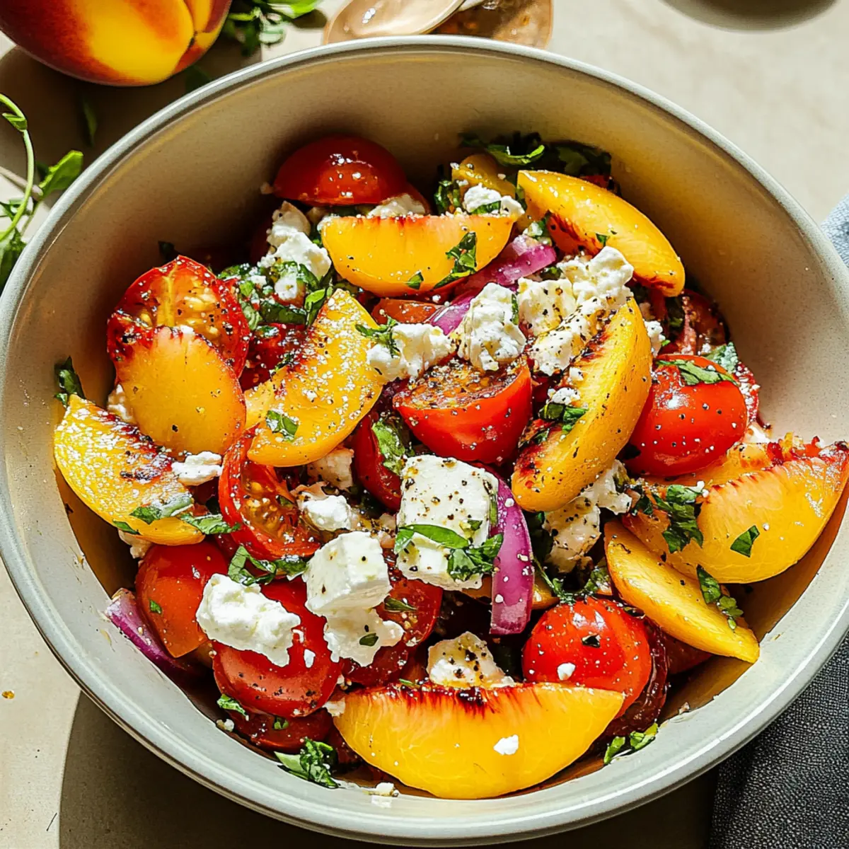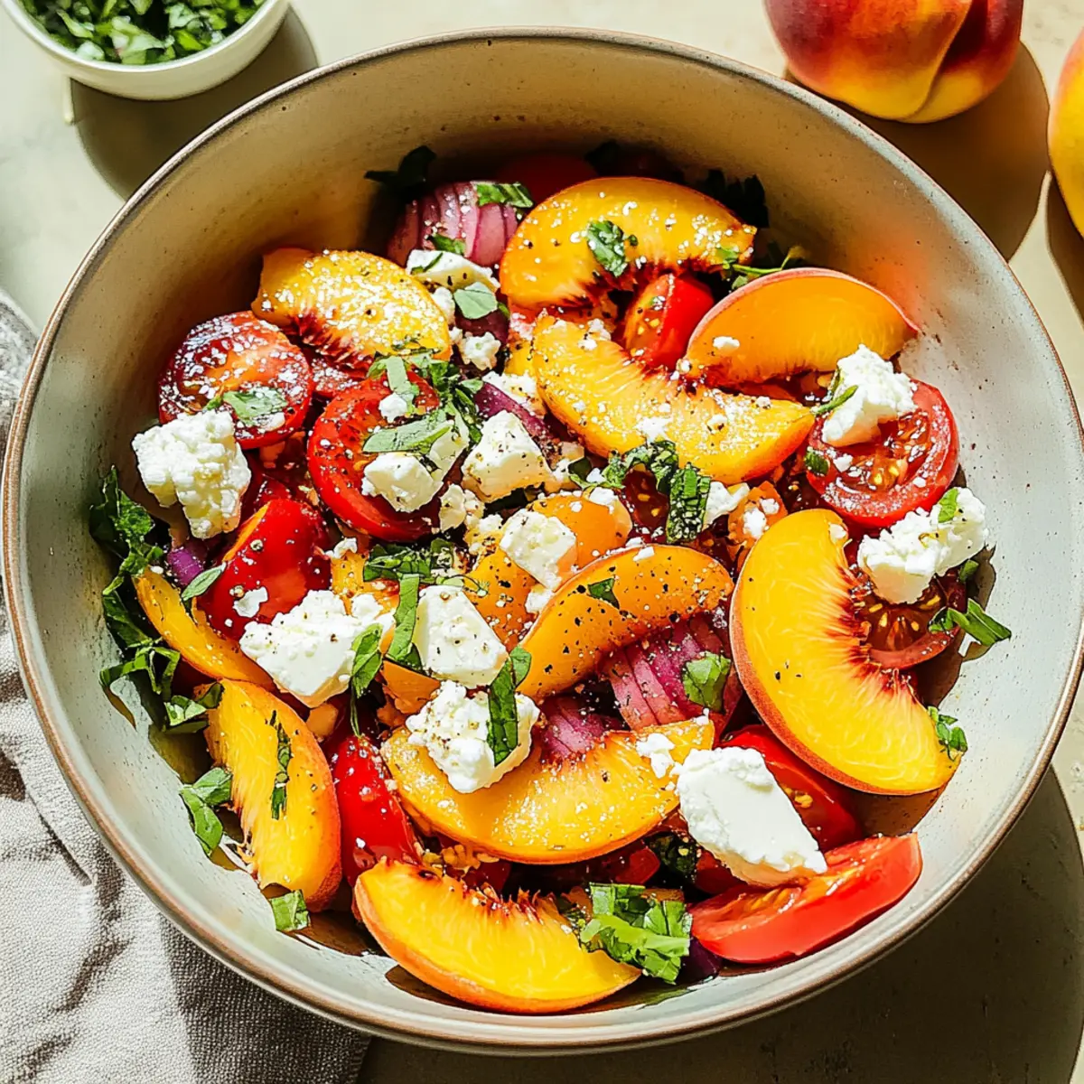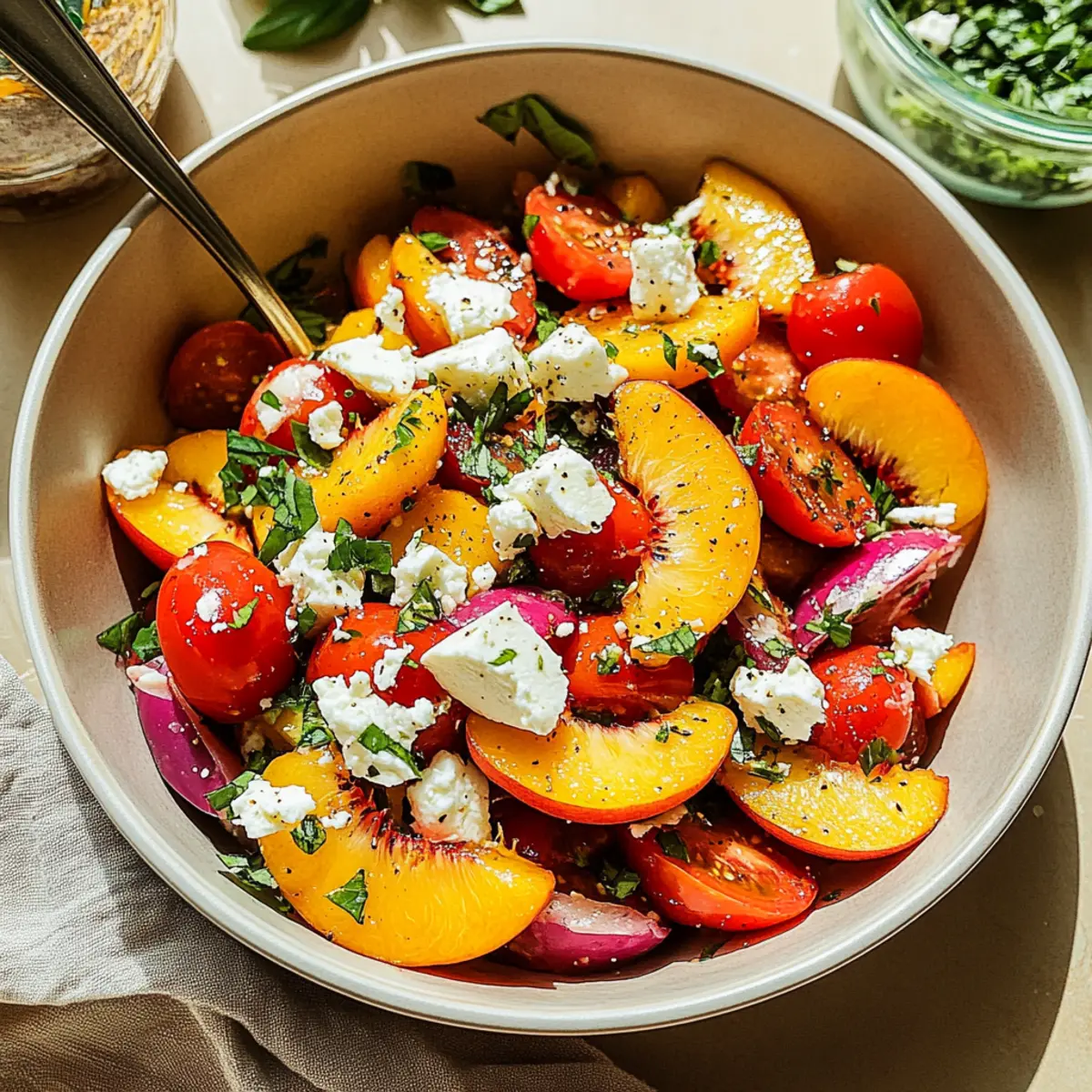 A stroll through the farmer’s market on a sun-kissed morning revealed an enticing bounty of ripe peaches glowing in the display. Inspired by their sweet allure, I decided to whip up a Simple Peach Feta Salad that perfectly captures summer’s essence. This effortless dish melds juicy peaches with the tangy creaminess of feta, topped off with the crunch of shallots and a hint of fresh herbs. Ready in just 25 minutes, it’s the ideal recipe for those seeking a nutritious yet vibrant option that even the busiest home chefs can master. Not only is it gluten-free and vegetarian, but it also serves as a refreshing side for any gathering or a satisfying solo dish. Curious how to bring this delightful salad to your table? Let’s dive into the recipe! Why is this Peach Feta Salad a Must-Try? Simplicity shines in every bite with this quick recipe, perfect for those busy summer days. Flavor explosion: The sweet peaches combined with salty feta create a delightful contrast that’s incredibly satisfying. Versatile enough to adapt to your tastes, swap peaches for nectarines, or add quinoa for extra protein. Nutrient-rich and gluten-free, this salad promotes health without sacrificing taste. For more enjoyable summer salads, check out the refreshing Cucumber Strawberry Salad or the vibrant Mediterranean Chickpea Salad. Simple Peach Feta Salad Ingredients Here’s everything you need to create this delightful summer salad! For the Salad • Peaches – Provides natural sweetness; substitute with ripe nectarines for a delicious twist. • Cherry Tomatoes – Adds juicy acidity; feel free to use multicolored varieties for visual appeal. • Shallots – Imparts mild onion flavor and crunch; red onion can be used for a bolder taste. • Feta Cheese – Gives a creamy, salty touch; opt for dairy-free feta for a vegan version. • Fresh Basil – Enhances the salad’s aromatic freshness; parsley works as an alternative if needed. • Fresh Mint – Adds a refreshing contrast; it’s optional but highly recommended for depth. For the Dressing • Olive Oil – Serves as the dressing base; avocado oil is a great mild substitute. • Red Wine Vinegar – Offers tanginess; white wine vinegar can replace it for varied flavor. • Lemon Juice – Brightens the salad’s overall taste; always choose fresh for the best result. • Honey – Provides a natural sweetness; use agave syrup for a fully plant-based option. • Garlic Powder – Adds a subtle depth of flavor; fresh minced garlic also works well if preferred. • Salt & Pepper – Essential seasonings; adjust to your taste for perfect flavor balance. Step‑by‑Step Instructions for Simple Peach Feta Salad Step 1: Prepare the Dressing In a small bowl or glass jar, combine ¼ cup of olive oil, 2 tablespoons of red wine vinegar, the juice of one lemon, 1 tablespoon of honey, ½ teaspoon of garlic powder, and a pinch of salt and pepper. Whisk or shake vigorously for about 30 seconds until the mixture is well blended and emulsified, creating a tangy dressing that will perfectly complement your Simple Peach Feta Salad. Step 2: Chop the Vegetables In a large mixing bowl, slice 2 ripe peaches and halve a cup of cherry tomatoes to ensure the sweetness is release. Additionally, finely chop one shallot to add a mild onion crunch. As you prepare the ingredients, enjoy their vibrant colors and fresh aromas that evoke a sense of summer, creating a delightful base for your salad. Step 3: Add the Fresh Ingredients To the bowl of peaches and tomatoes, crumble ½ cup of feta cheese, and toss in a handful of fresh basil leaves and mint for an aromatic lift. Gently mix everything until combined, allowing the herbs to infuse their delightful fragrances throughout the salad while complementing the sweetness of the peaches and the tanginess of the feta. Step 4: Combine and Toss Pour the prepared dressing over the peach and feta mixture in the large bowl. With a gentle touch, toss the salad to coat all the ingredients evenly with the dressing for about 1 minute, ensuring that every bite of your Simple Peach Feta Salad is bursting with flavor and richness from the dressing, while preserving the integrity of the delicate peaches. Step 5: Serve or Chill Serve the salad immediately for the freshest taste, or refrigerate for about 30 minutes to allow the flavors to meld beautifully. If you choose to chill, the salad will become even more refreshing, making it perfect for hot summer days when you crave something light yet satisfying. Storage Tips for Simple Peach Feta Salad Fridge: Store any leftovers in an airtight container for up to 1 day. To enjoy, reheat gently or serve cold for a refreshing experience. Make-Ahead: Prepare the dressing up to 1 day in advance and keep it refrigerated. Combine the salad ingredients just before serving for optimal freshness. Freezer: This salad is best enjoyed fresh, but if you must freeze, keep only the feta dressing to avoid sogginess. Frozen dressing lasts for up to 3 months. Ingredient Separation: If you anticipate leftovers, store the salad components separately to maintain texture and crunch until ready to enjoy your Simple Peach Feta Salad. Simple Peach Feta Salad Variations Feel free to get creative and customize your salad to suit your taste buds! Nectarines: Swap peaches for ripe nectarines for a similar sweetness and a slightly different flavor twist. Grain Boost: Add cooked quinoa or chickpeas to make the salad heartier and increase its protein content. Herb Switch: Experiment with herbs like dill or cilantro. Each brings its own unique aroma to elevate your dish further. Seasonal Twist: Substitute stone fruits like plums or apricots for a colorful, fruity mix that embraces summer’s bounty. Nutty Add: Add a handful of toasted walnuts or almonds for a delightful crunch and a boost of healthy fats. Spicy Kick: Toss in some sliced jalapeños or red pepper flakes for an unexpected heat that contrasts beautifully with the sweet peache