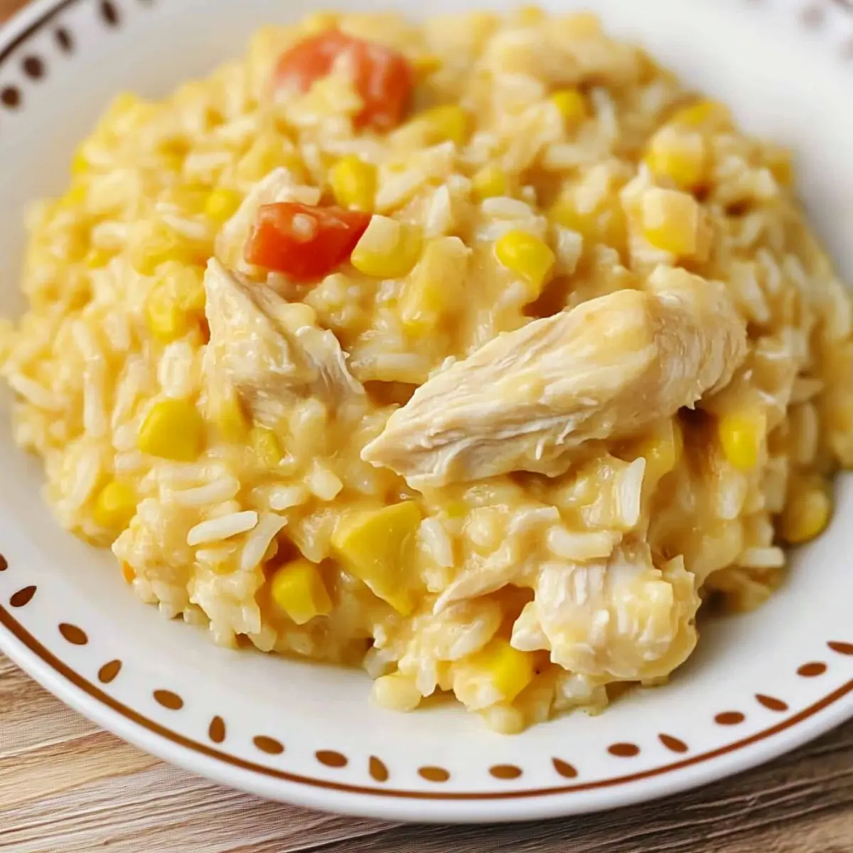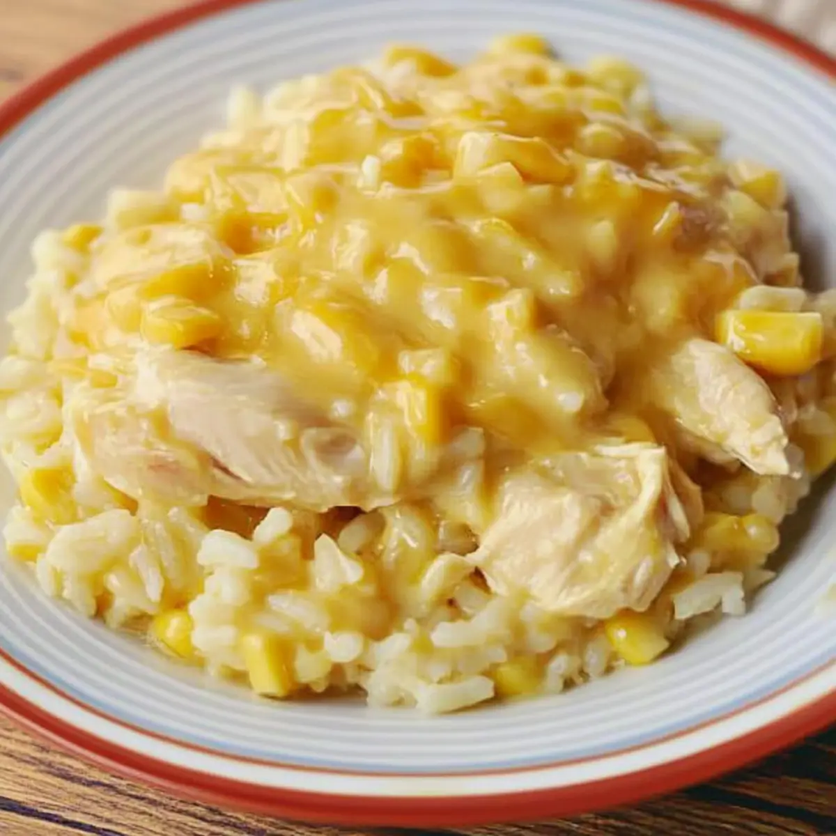 Nothing beats the convenience of a meal that practically cooks itself while you go about your day—unless it’s one that’s also melted cheese-infused and utterly comforting! My Slow Cooker Cheesy Chicken and Rice combines tender chicken, fluffy rice, and sweet corn all wrapped up in a creamy sauce, creating a one-pot wonder that welcomes you home after a long day. It’s culinary magic, especially for those busy weeknights when you crave something hearty yet hassle-free. With minimal prep, this dish allows you to savor that classic comfort without the guilt of fast food. Wondering how to make your kitchen smell divine while indulging in a simple, satisfying meal? Keep scrolling, and let’s dive into this cheesy goodness together! Why is Cheesy Chicken and Rice a Must-Try? Convenience at its Finest: This Slow Cooker Cheesy Chicken and Rice allows you to set it and forget it. Just toss in the ingredients, and let the slow cooker do the heavy lifting while you tackle your day. Irresistible Creaminess: The combination of creamy chicken soup and melted cheese creates a rich, indulgent texture that will have everyone coming back for seconds. Versatile and Customizable: Feel free to swap the chicken for thighs for extra moisture, or add frozen mixed vegetables for a pop of color and nutrients. Perfect for Family Gatherings: This dish is sure to please both kids and adults alike, making it a go-to for potlucks or family dinners. Easy Leftovers: Not only can you enjoy this dish fresh, but it also stores beautifully for up to three days. Perfect for a busy week ahead! For another comforting dish, check out my Cheesy Hamburger Rice. It’s a great way to satisfy those cravings! Ingredients for Slow Cooker Cheesy Chicken and Rice For the Chicken • 1 pound boneless, skinless chicken breasts – This is your main protein; using thighs enhances flavor and moisture. • 1 large onion, chopped – Adds aromatic sweetness; swap with shallots for a milder note. For the Creamy Sauce • 1 10.5 ounce can cream of chicken soup – Serves as a creamy base; consider a homemade version for a lighter meal. For the Rice • 1 8 ounce box Zatarain’s Yellow Rice Mix – Provides base texture and flavor; plain rice can be used; just adjust seasonings. For the Cheesy Goodness • 1 cup shredded cheddar cheese – Delivers rich, cheesy flavor; swap for Monterey Jack or Colby for a twist. For Added Sweetness and Texture • 1 15 ounce can whole kernel corn, drained – Incorporates sweetness; frozen corn can be a great substitute. This delightful group of ingredients comes together to create the comforting essence of Slow Cooker Cheesy Chicken and Rice. Enjoy the ease and satisfaction this dish brings to your table! Step‑by‑Step Instructions for Slow Cooker Cheesy Chicken and Rice Step 1: Prepare the Chicken and Onions Begin by placing 1 pound of boneless, skinless chicken breasts at the bottom of your slow cooker. Top the chicken with the chopped large onion, allowing its sweet aroma to meld with the meat. Next, pour in the 10.5-ounce can of cream of chicken soup, ensuring the chicken is well-coated. Secure the lid and set your slow cooker to low for 7 hours or high for 3 hours. Step 2: Cook the Rice Approximately 30 minutes before your Slow Cooker Cheesy Chicken and Rice is done, cook the 8-ounce box of Zatarain’s Yellow Rice Mix according to the package instructions. Bring water to a simmer, add the rice, and cover it until tender. This timing ensures the rice is freshly cooked and fluffy, ready to absorb all the cheesy goodness from the slow cooker. Step 3: Shred the Chicken When your slow cooker has finished cooking, carefully remove the chicken using tongs. Place it on a cutting board and shred it with two forks, creating bite-sized pieces. Return the shredded chicken to the slow cooker, mixing it well with the creamy sauce to ensure every morsel is coated with flavor. Step 4: Mix in Cheese and Corn Now, stir in 1 cup of shredded cheddar cheese and the drained 15-ounce can of whole kernel corn into the slow cooker. The mixture should start to come together beautifully, infused with the cheese’s rich flavor and the corn’s sweetness. Replace the lid and let it cook on low for an additional 10-15 minutes, allowing the cheese to melt thoroughly. Step 5: Serve Your Comfort Dish Once the cheese has melted into a creamy delight, it’s time to serve your Slow Cooker Cheesy Chicken and Rice. Ladle generous portions onto plates, savoring the combination of tender chicken, fluffy rice, and a luscious cheesy sauce. This dish is perfect for cozy evenings, and you can pair it with your favorite biscuits to soak up the creamy goodness. How to Store and Freeze Slow Cooker Cheesy Chicken and Rice Fridge: Store leftovers in an airtight container for up to 3 days. This keeps your Slow Cooker Cheesy Chicken and Rice fresh and ready for quick meals. Freezer: Portion out the dish into freezer-safe containers for up to 3 months. Make sure to label them and use airtight wraps to prevent freezer burn. Reheating: Thaw overnight in the fridge, then reheat in the microwave or on the stovetop. Add a splash of chicken broth if needed to restore creaminess while reheating. Make-Ahead Tip: Prep all ingredients the night before, then simply assemble and cook the next day for a hassle-free dinner! Tips for the Best Slow Cooker Cheesy Chicken and Rice Mind the Chicken: Ensure your chicken reaches an internal temperature of 165°F to maintain safety. This ensures it’s fully cooked and tender. Avoid Mushy Rice: Cook the rice according to package instructions and time it well; it’ll maintain a perfect fluffy texture when mixed in. Choose the Right Cheese: Use freshly shredded cheese instead of pre-packaged for better melting and flavor. Try Monterey Jack for a twist! Flavor Boost: Add herbs like garlic powder or paprika to elevate flavors. A pinch of salt can balance the dish with other ingredients. Healthy Choices: Opt for low
