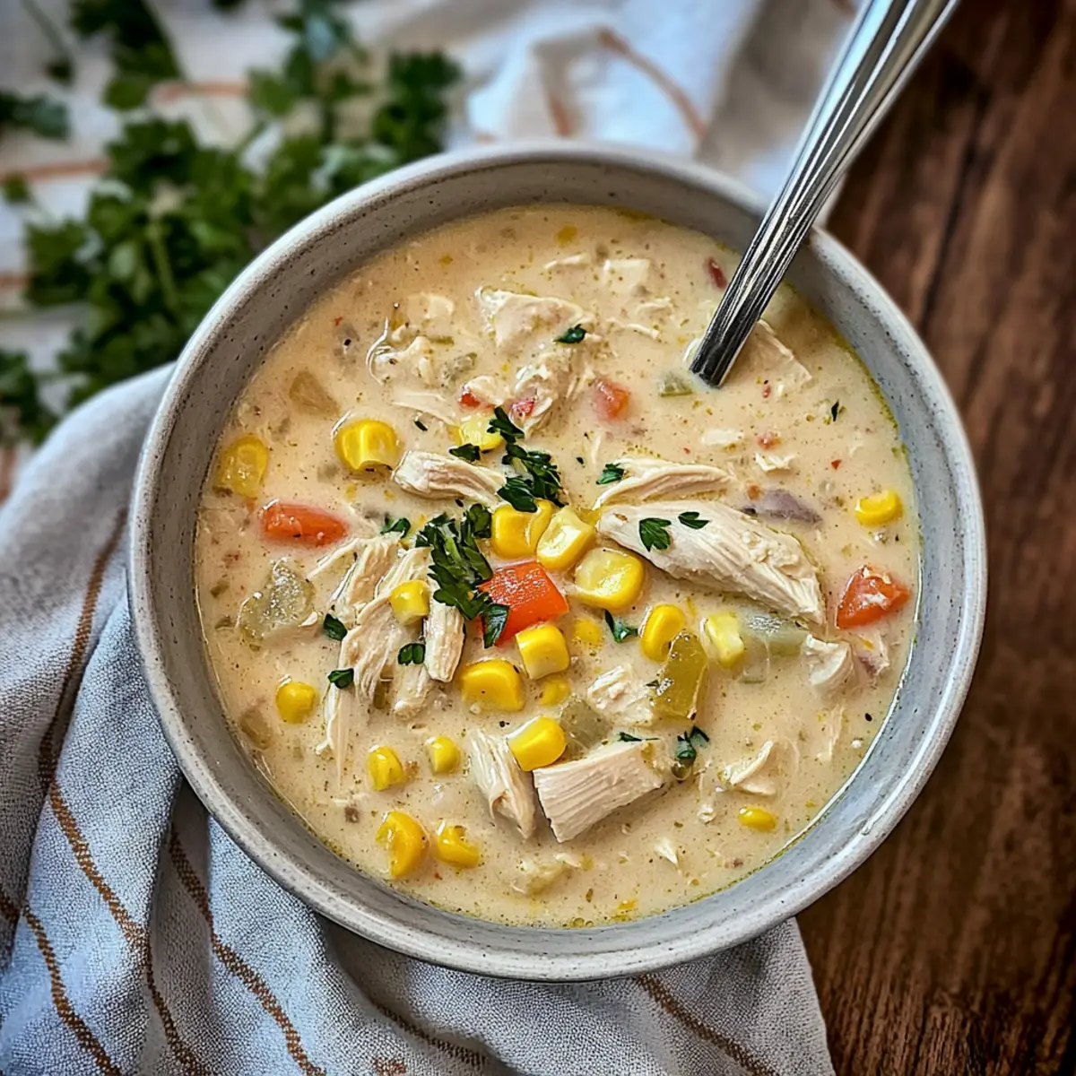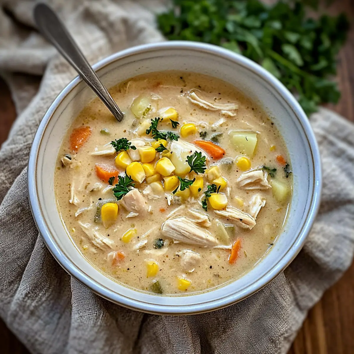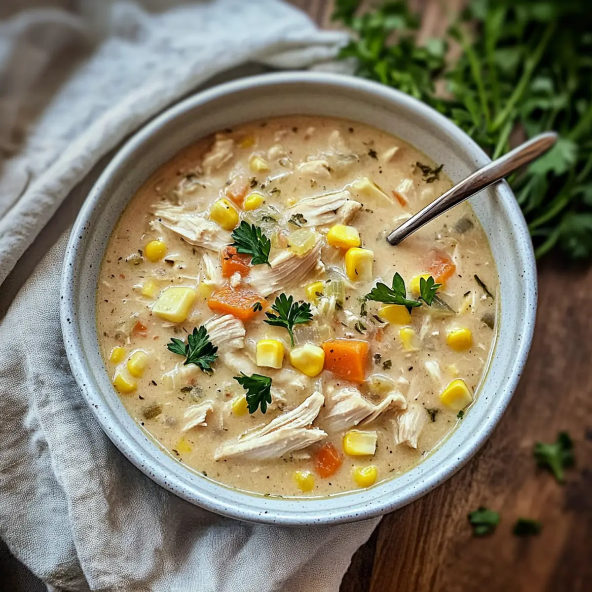 As I watched the snowflakes softly dance outside, I couldn’t shake the feeling that a hearty bowl of soup was just what I needed to warm my spirit. Enter my Slow Cooker Creamy Chicken and Corn Soup—an effortless concoction of tender chicken, sweet corn, and velvety potatoes simmered to perfection. Not only is this dish a dreamy comfort food ideal for chilly days, but it’s also a lifesaver for busy weeks, allowing you to prep a wholesome meal in advance. Plus, being gluten-free and egg-free, it caters to various dietary needs without compromising on taste. Curious how this cozy masterpiece comes together? Let’s dive into the details! Why is This Soup So Comforting? Creamy Delight: This soup boasts a rich, velvety texture that wraps you in warmth, making it the ultimate comfort food on cold days. Time-Saving: With a slow cooker, you can set it and forget it—perfect for busy schedules or meal prep! Flavor Explosion: The blend of fresh veggies, tender chicken, and sweet corn creates a delightful harmony in every spoonful. Diet-Friendly: Being gluten-free and egg-free makes it a versatile option for various dietary preferences, ensuring everyone can enjoy this dish. Crowd-Pleaser: Whether it’s a family dinner or a casual gathering, this soup is sure to impress and satisfy with its hearty appeal! If you love comforting meals, check out my Ravioli Soup Cozy for another delightful option! Slow Cooker Creamy Chicken and Corn Soup Ingredients Here’s everything you need to create this cozy masterpiece in your kitchen! For the Soup Base Carrots – Adds sweetness and texture; feel free to swap with frozen mixed vegetables for convenience. Celery – Provides an aromatic flavor base; make sure to dice it fresh for the best taste. Onion – Enhances savory depth; dice it to ensure even cooking and blending of flavors. Garlic – Adds robust flavor; mince for maximum potency in your soup. Frozen Corn – Contributes sweetness and texture; a 10 oz bag works perfectly. Yukon Gold Potatoes – Adds heartiness and creaminess; chop into bite-sized pieces with skin on for added nutrients. Raw Chicken Breast – Main protein source; opt for skinless for a lighter version For the Seasoning Garlic Powder – Intensifies garlic flavor effortlessly; can substitute with fresh if you prefer a natural taste. Onion Powder – Complements fresh onions beautifully; it’s optional but recommended to amp up the flavor. Paprika – Adds warmth and vibrant color; smoked paprika can enhance the flavor profile even more. Kosher Salt – Essential for balancing flavors; sea salt is a great alternative if you like that. Dried Bay Leaf – Infuses aromatic depth during cooking; remember to remove it before serving. Dried Thyme and Oregano – Introduces herbal notes; if you have fresh herbs on hand, they can add even more flavor! Cayenne Pepper – Adds a nice touch of heat; adjust according to your spice preference. For the Broth and Creaminess Chicken Stock – The flavorful base for the soup; avoid low sodium to help balance your seasonings. Half and Half – Adds richness and creaminess; you can use heavy cream or unsweetened almond milk as a substitute. Reduced Fat Cream Cheese – Enhances creaminess and thickens the soup; full-fat or dairy-free options like cashew cream work too. Corn Starch – Thicken your soup for that chowder-like consistency; mix with water before adding to avoid clumps. For Garnish Fresh Parsley – Brings a pop of freshness to your dish; other herbs like chives or cilantro can work as alternatives. This Slow Cooker Creamy Chicken and Corn Soup is your ticket to a warm and delightful meal, perfect for any occasion! Feel free to explore variations and substitutions to make it your own! Step‑by‑Step Instructions for Slow Cooker Creamy Chicken and Corn Soup Step 1: Prep Vegetables Begin by creating a colorful base for your Slow Cooker Creamy Chicken and Corn Soup. Dice the carrots, celery, and onion into small, even pieces, and mince the garlic finely. For the Yukon Gold potatoes, chop them into bite-sized chunks with the skin on for added nutrition. This step should take about 10 minutes, and you’ll have a lovely array of fresh veggies ready for your slow cooker. Step 2: Combine Ingredients In the slow cooker, combine the prepped vegetables with the raw chicken breast, frozen corn, garlic powder, onion powder, paprika, kosher salt, thyme, oregano, cayenne pepper, and the dried bay leaf. Next, pour in the chicken stock, ensuring everything is covered evenly. Give it a gentle stir to distribute the flavors throughout the mixture. This step sets the foundation for a deliciously comforting soup. Step 3: Cook Cover the slow cooker with a lid and set it to HIGH for 3 hours or LOW for 6 hours, depending on your schedule. As the soup simmers, the chicken will become tender and flavors will meld beautifully, filling your kitchen with enticing aromas. You’ll know it’s ready when the chicken is fully cooked and easily shred-able, making for a hearty base in your soup. Step 4: Shred Chicken Once the cooking time is complete, carefully remove the chicken breast from the slow cooker and place it on a cutting board. Using two forks, shred the chicken into bite-sized pieces, ensuring it remains juicy. Return the shredded chicken to the slow cooker, mixing it gently back into the soup to combine with all the delicious ingredients. Step 5: Add Creaminess To achieve that rich and creamy texture, stir in the half and half and reduced fat cream cheese into your soup. This will provide a velvety finish that makes your Slow Cooker Creamy Chicken and Corn Soup truly comforting. It helps to add it at this stage so it can blend with warmth without boiling, preserving its creaminess. Step 6: Thicken To achieve a chowder-like consistency, mix the corn starch with a small amount of cold water in a separate bowl until smooth. Then, add this mix to your soup in the slow cooker, stirring thoroughly to avoid