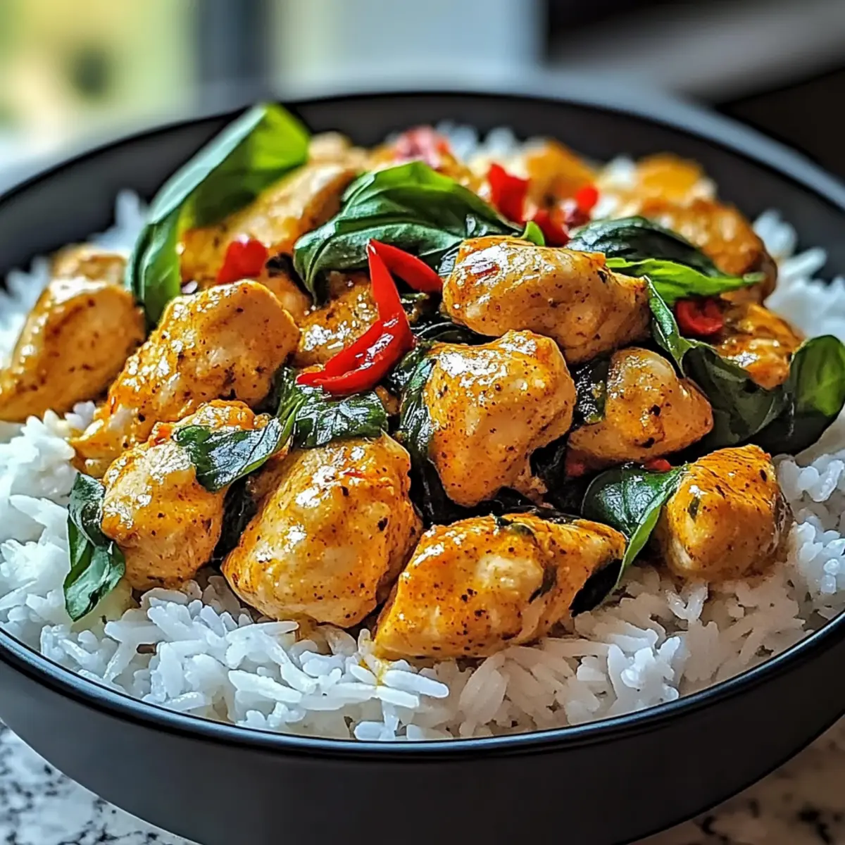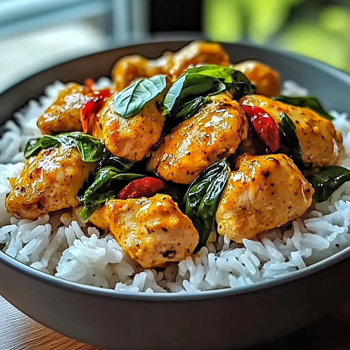 A burst of tropical sunshine is just a spoonful away with my Spiced Coconut Basil Chicken with Rice. This dish is a vibrant melody of tender chicken simmered in a creamy coconut milk sauce, infused with fresh basil and warming spices that will fill your kitchen with enticing aromas. It’s not only a quick and elegant solution for busy weeknights, but it can also be tailored to accommodate your spice preferences and dietary needs—whether you’re keeping it classic or experimenting with a vegetarian option. Every bite offers comfort and satisfaction, transforming any meal into a delightful experience. Curious how to make this tantalizing dish your own? Let’s dive in! Why is this recipe so versatile? Versatile Cooking: The Spiced Coconut Basil Chicken with Rice is easily adaptable to suit your taste. Customize Spice Levels: Whether you like it mild or fiery, you can control the heat by adjusting chili powder. Vegetarian-Friendly: Swap chicken for chickpeas or tofu, making it a delightful meal for non-meat eaters. Quick Preparation: From stove to table in under 30 minutes, perfect for busy weeknights. Flavor Fusion: The tropical essence of coconut milk combined with fresh basil creates an unforgettable taste experience. Perfect alongside a refreshing green salad or Marry Chicken Pasta for a cozy dinner! Spiced Coconut Basil Chicken with Rice Ingredients For the Chicken • Boneless, Skinless Chicken Breasts – The main protein source; offers tenderness. Substitute with chicken thighs for more flavor. • Olive Oil – Cooking fat that adds richness. Can be replaced with coconut oil for more coconut flavor. For the Sauce • Onion – Adds sweetness and depth of flavor. Use shallots for a milder flavor. • Garlic – Enhances the savory profile of the dish. Fresh garlic is preferred for maximum flavor. • Ginger – Contributes warmth and a slight spice. Can substitute with ground ginger in a pinch. • Ground Cumin – Adds earthiness; a staple spice in many cuisines. Replace with coriander for a different flavor note. • Ground Coriander – Enhances the dish’s aromatic quality. Can omit if unavailable. • Turmeric – Provides a warm color and subtle flavor. Ground ginger is a good alternative in a small quantity. • Chili Powder – Adds heat; adjust to your spice preference. Use cayenne for more heat or paprika for milder flavor. • Coconut Milk – The star of the sauce, adding creaminess. Full-fat is recommended for optimal richness. • Chicken Broth – Used to enhance flavor and adjust sauce consistency. Substitute with vegetable broth for a vegetarian option. For the Finish • Fresh Basil – Essential for authentic flavor and aroma; use Thai basil for a different twist or omit dried basil if fresh isn’t available. • Lime Juice – Brightens flavors; can replace with lemon juice if needed. • Cooked Rice (white, brown, or jasmine) – Base for the dish; can swap for cauliflower rice for a low-carb version. Step‑by‑Step Instructions for Spiced Coconut Basil Chicken with Rice Step 1: Prepare the Rice Start by cooking your rice according to package instructions. In a saucepan, bring water to a boil, add the rice, and cover. Reduce heat to low, simmer for about 15-20 minutes until the water is absorbed and the rice is fluffy. Once cooked, remove from heat and set aside, allowing it to stay warm while you prepare the Spiced Coconut Basil Chicken. Step 2: Cook the Chicken In a large skillet, heat 2 tablespoons of olive oil over medium heat. Season the boneless, skinless chicken breasts with salt and pepper. Cook the chicken for 6-7 minutes on each side until it’s golden brown and cooked through, reaching an internal temperature of 165°F (75°C). Once done, carefully remove the chicken from the skillet and set it aside to rest. Step 3: Prepare the Sauce Using the same skillet, add the chopped onion and sauté for about 3-4 minutes until softened and translucent. Introduce minced garlic and ginger, cooking for an additional minute until fragrant. Stir in ground cumin, coriander, turmeric, and chili powder, letting the spices bloom in the heat, which should take about 30 seconds. Step 4: Add Liquids Next, pour in the coconut milk and chicken broth, scraping the bottom of the skillet to release any flavorful browned bits. Stir everything well to combine and bring the mixture to a gentle simmer over medium heat. Allow it to cook for about 5 minutes, thickening slightly while the flavors meld beautifully together. Step 5: Combine Chicken & Sauce Return the cooked chicken to the skillet, nestling it into the sauce. Reduce the heat to low and let it simmer for about 5 minutes, ensuring the chicken absorbs the rich flavors of the spiced coconut sauce. Keep an eye on it to avoid drying out while it warms through. Step 6: Finish the Dish Stir in a generous handful of fresh basil leaves and lime juice into the sauce just before serving. Taste and adjust seasoning with salt and pepper if necessary, allowing the vibrant aromas of the basil to infuse the dish. This final touch will elevate your Spiced Coconut Basil Chicken into a truly delightful experience. Step 7: Serve To serve, spoon the warm rice onto plates, then generously ladle the spiced coconut chicken and sauce over the top. If desired, garnish with extra fresh basil for a pop of color and flavor. Enjoy this comforting dish, which brings a tropical twist to your weeknight meals! Variations & Substitutions for Spiced Coconut Basil Chicken Feel free to make this dish your own by experimenting with different flavors and ingredients! Vegetarian Option: Substitute chicken with tofu or chickpeas for a plant-based alternative that packs a protein punch. This way, everyone can indulge in the delightful coconut sauce without missing out. Add Heat: Feeling adventurous? Incorporate fresh chili peppers or increase the chili powder for a spicy kick. Tailoring the heat level allows each bite to become a personalized experience.
