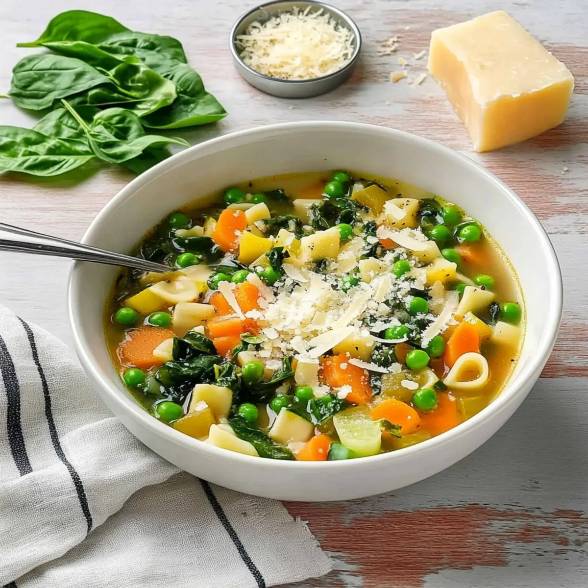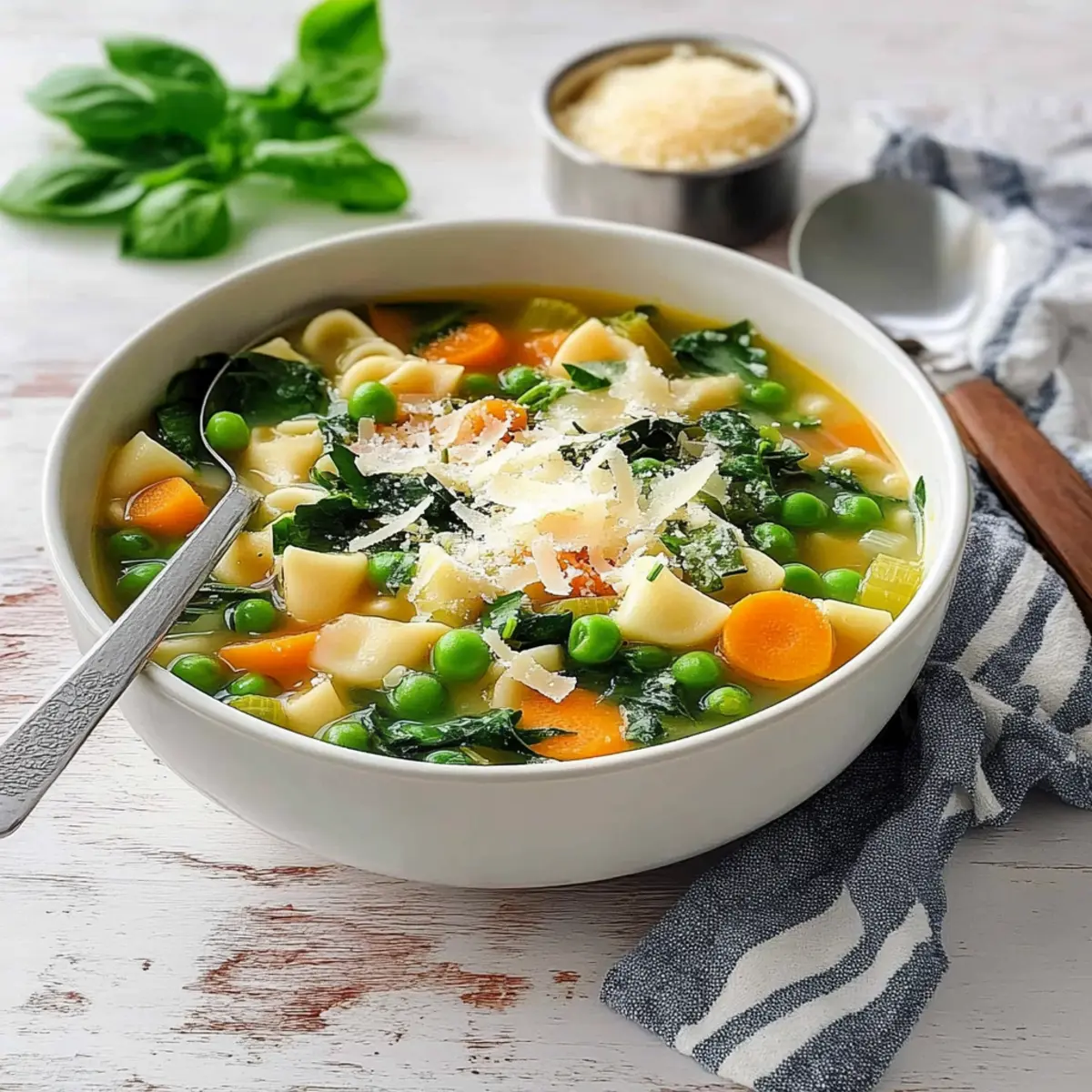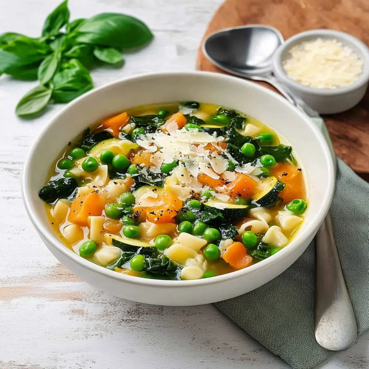 As I stirred the pot, the aroma of fresh herbs and vibrant vegetables filled my kitchen, instantly transporting me to a sun-drenched Italian market. Today, I’m excited to share my Spring Minestrone Soup, a delightful blend of seasonal produce that’s not only easy to whip up in just 30 minutes but also a meaningful way to embrace the season’s bounty. This healthy soup brims with colorful veggies, making it a crowd-pleaser while keeping dinner light and refreshing. Whether you’re looking to impress during a family gathering or simply want a comforting yet nutritious meal prep option, this recipe has got you covered. So, what seasonal twists will you add to your own version of this delicious minestrone? Why is Spring Minestrone a Must-Make? Bursting with flavor, this Spring Minestrone Soup is a celebration of fresh, seasonal ingredients that make every bite feel like a mini-vacation in Italy. Quick and Easy to prepare in just 30 minutes, it’s perfect for busy weeknights or leisurely family gatherings. Customizable, you can swap in your favorite veggies or proteins, ensuring each batch is uniquely yours. Healthy and satisfying, it’s packed with nutrients without compromising on taste. Perfect for Meal Prep, you can store leftovers for quick lunches all week long. Don’t forget to serve it with crusty bread for the ultimate comfort meal! Spring Minestrone Ingredients For the Soup Base • Olive Oil – Adds richness and depth to the soup; use extra virgin for the best flavor. • Onion – Provides the aromatics and base flavor; substitute with shallots for a milder taste. • Garlic – Enhances flavor with a fragrant profile; freshly minced is ideal. • Carrots – Adds natural sweetness and texture; substitute with parsnips for a different flavor. • Celery – Adds aromatic depth and provides a crunch; no direct substitutes, but additional carrots or bell peppers work. • Zucchini – Contributes a mild flavor and softness; use yellow squash as a substitute. • Vegetable Broth – Forms the soup base; choose homemade or high-quality store-bought for best results. Chicken broth can be used for non-vegetarians. For the Protein and Green Goodness • Cannellini Beans – Offers creaminess and protein; substitute with chickpeas or another bean variety as desired. • Frozen Peas – Adds sweetness and color; fresh peas are excellent if in season, but frozen works well for convenience. • Baby Spinach – Provides color and nutrients; add at the end to retain texture. Kale is a heartier substitution. For the Pasta and Brightness • Small Pasta (like ditalini) – Adds substance; cook separately to keep texture. Any small pasta can be used. • Lemon Juice – Brightens flavor and balances the soup’s richness; lime can work in a pinch. • Fresh Basil – Adds fragrance and a fresh finishing touch; substitute with thyme or parsley if unavailable. For the Finishing Touches • Salt and Pepper – Essential for flavor enhancement; adjust to personal taste. • Grated Parmesan – Used as a garnish for added richness and flavor; nutritional yeast is a great dairy-free option. Embrace the vibrant essence of Spring Minestrone with these wonderful ingredients that ensure a delightful culinary experience! Step‑by‑Step Instructions for Spring Minestrone Step 1: Pasta Prep Begin by bringing a large pot of salted water to a boil. Once boiling, add your small pasta, cooking it for one minute less than the package instructions recommend. Drain the pasta in a colander, rinse under cold water to stop the cooking process, and set aside while you prepare the rest of your Spring Minestrone. Step 2: Sauté Aromatics In a large stockpot, heat 2 tablespoons of olive oil over medium heat until shimmering. Add the chopped onion, carrots, and celery, sautéing for 4-5 minutes until softened and fragrant. Next, add the minced garlic, cooking for an additional minute until it becomes aromatic, stirring constantly to avoid burning. Step 3: Simmer Broth Pour 6 cups of vegetable broth into the pot with the sautéed vegetables, and increase the heat to bring it to a gentle simmer. Cover the pot with a lid and let it simmer for about 10 minutes, allowing the flavors to meld and the vegetables to soften, while you prepare the next ingredients. Step 4: Add Veggies Uncover the pot and stir in the rinsed cannellini beans, diced zucchini, and frozen peas. Continue to simmer these ingredients for 2-3 minutes, or until the zucchini is tender but not mushy, contributing to the lovely textures in your Spring Minestrone Soup. Step 5: Finish Soup Lower the heat and add the baby spinach just until it wilts, which should take under a minute. Stir in the fresh lemon juice and basil, then season with salt and pepper to taste, letting the vibrant flavors of the Spring Minestrone shine. Step 6: Serve Ladle the hot soup into bowls, and garnish each serving with freshly grated Parmesan for an added richness. You can either stir the cooked pasta directly into the soup or keep it on the side, ensuring every bite of your delicious Spring Minestrone is as satisfying as the last. How to Store and Freeze Spring Minestrone Fridge: Store any leftover Spring Minestrone in an airtight container for up to 4 days, ensuring it stays fresh and delicious for quick meals. Freezer: Allow the soup to cool completely before transferring it to a freezer-safe container. It can be stored for up to 3 months; just thaw in the fridge before reheating. Reheating: For best results, reheat the soup gently on the stove over low heat, adding a splash of vegetable broth or water to revive its original texture before enjoying. Pasta Storage: Keep the cooked pasta separate from the soup to prevent sogginess. Combine them right before serving or reheating for optimal texture. Expert Tips for Spring Minestrone Store Pasta Separately: Keep cooked pasta aside from the soup to prevent it from becoming soggy. Add it when reheating for the best texture. Fre