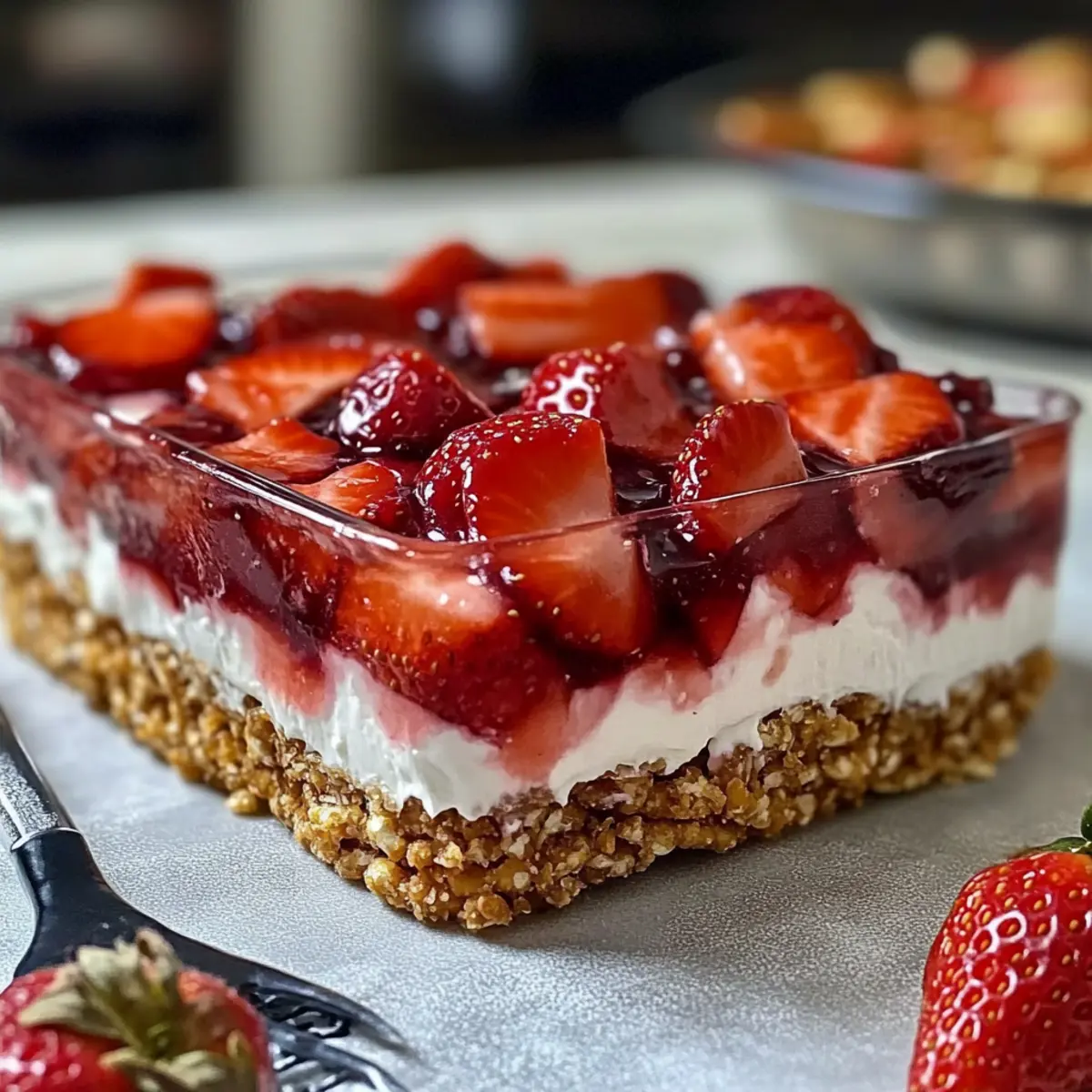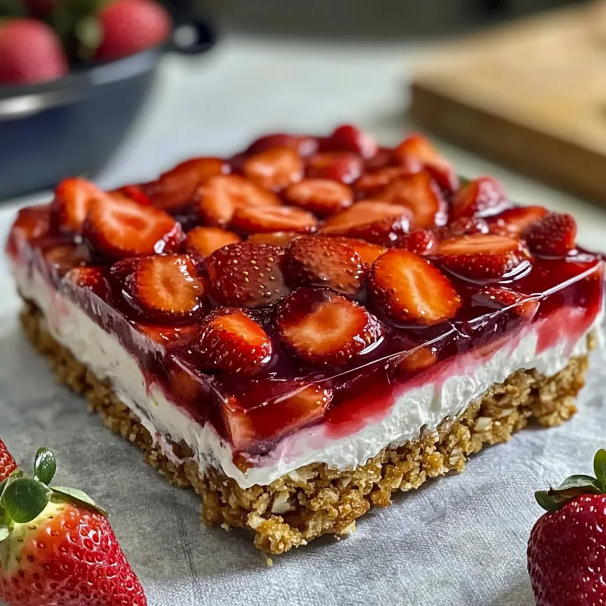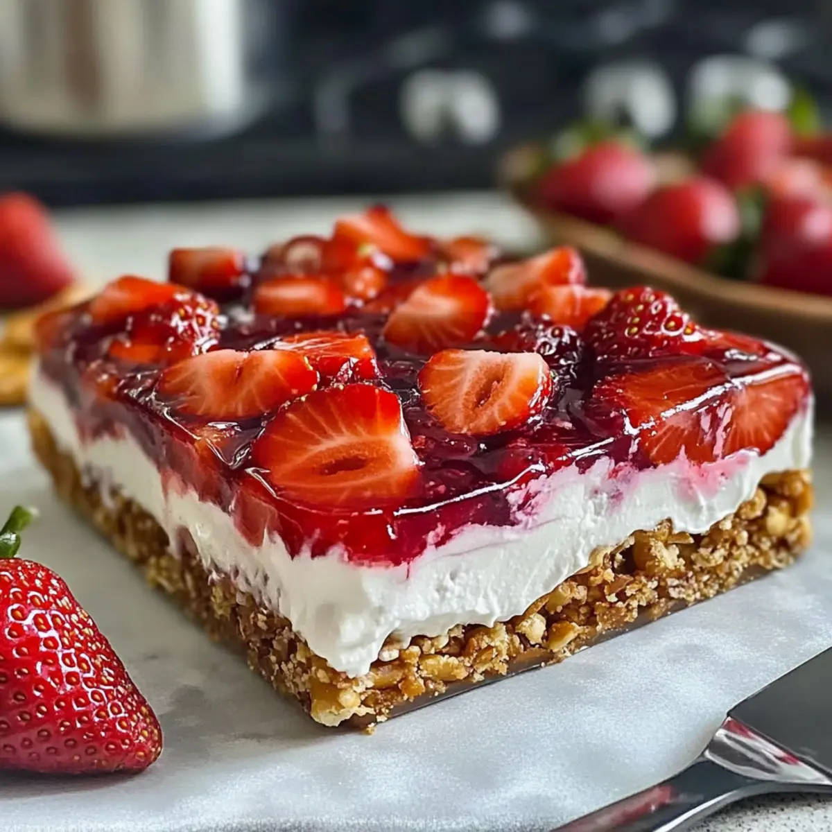 As the first blooms of spring begin to greet us, I find myself craving a dessert that truly captures the season’s spirit. Enter the Easy Spring Strawberry Pretzel Salad—a delightful fusion of crunchy pretzel crust, creamy filling, and luscious strawberry topping that’s become a staple at my summer gatherings. This charming dish not only tickles the taste buds with its sweet and salty contrast, but it also proudly boasts a no-fuss preparation that makes it a favorite among both seasoned home-chefs and those simply looking to ditch fast food. With vibrant colors that brighten any table, it’s the kind of dessert that invites smiles and conversation, making it a wonderful centerpiece for summer parties. Tempted to give it a try? Let’s explore how to whip up this nostalgic treat together! Why is Spring Strawberry Pretzel Salad a Must-Try? Irresistible Crunch: The salty pretzel crust forms a perfect contrast with the creamy filling, creating a delightful texture that keeps everyone coming back for more. Effortless Preparation: This recipe takes no culinary wizardry. All you need are a few simple ingredients and minimal time to impress your guests with this crowd-pleaser. Versatile Delight: Feel free to mix and match fruits! Whether you swap in fresh blueberries for a twist or opt for a tropical peach version, the possibilities are endless. Refreshingly Light: As a summer party dessert, the refreshing flavors of strawberries and creamy layers make it feel indulgent yet light, perfect for warm evenings. Time-Saving Wonder: It’s all about the chill time! Set it in the fridge and enjoy your summer gathering without stress. For additional ideas on how to elevate your dessert table, check out our Cucumber Strawberry Salad or Cheesecake Fruit Salad. Each slice of this delightful dish will surely spark joy and smiles among family and friends! Spring Strawberry Pretzel Salad Ingredients For the Crust Crushed Pretzels – Provides the salty, crunchy base; use crunchy, salted pretzels for the best flavor. Unsalted Butter – Binds the crust together, adding richness; melt gently to avoid burning. Granulated Sugar – Balances the saltiness of the pretzels; coconut sugar can be a great alternative for a deeper flavor. For the Cream Cheese Layer Cream Cheese – The smooth and tangy filling that gives the salad its lush texture; be sure it’s softened to room temperature for easy mixing. Whipped Topping – Lightens the filling for a fluffy texture; consider homemade whipped cream for a fresher taste. For the Strawberry Layer Fresh Strawberries – The star topping that adds sweetness and color; choose fresh for the best texture. Strawberry Jello – Sets the strawberry layer and adds sweetness; avoid sugar-free versions as they may change the texture. Step‑by‑Step Instructions for Spring Strawberry Pretzel Salad Step 1: Prepare the Crust Preheat your oven to 350°F (175°C). In a large bowl, mix 2 cups of crushed pretzels with ½ cup of melted unsalted butter and ¼ cup of granulated sugar until fully combined. Press this mixture firmly into the bottom of a 9×13-inch baking dish. Bake for 10 minutes or until lightly golden and fragrant. Remove from the oven and let the crust cool completely before adding the next layer. Step 2: Make the Cream Cheese Layer In a mixing bowl, beat 8 ounces of softened cream cheese with an electric mixer until smooth and creamy, about 2 minutes. Gradually fold in 8 ounces of whipped topping until well integrated, ensuring no lumps remain. Gently spread the cream cheese mixture over the cooled pretzel crust, creating an even layer. This creamy delight is the heart of your Spring Strawberry Pretzel Salad! Step 3: Prepare the Strawberry Layer In a separate bowl, dissolve one package of strawberry Jello in 2 cups of boiling water and stir until completely dissolved, about 2 minutes. Mix in 1 cup of cold water and allow the mixture to cool slightly, about 10 minutes. This is crucial for ensuring the fresh strawberries maintain their shape when layered on top, adding both flavor and texture to your dessert. Step 4: Assemble & Chill Once the Jello mixture has cooled, evenly arrange 2 cups of sliced fresh strawberries over the cream cheese layer in the baking dish. Gently pour the cooled Jello mixture over the strawberries, ensuring they are fully covered. Cover the dish with plastic wrap and refrigerate for at least 4 hours, or overnight for the best results. This chilling time allows the Jello to set perfectly, creating a beautiful and refreshing Spring Strawberry Pretzel Salad. Storage Tips for Spring Strawberry Pretzel Salad Fridge: Store your Spring Strawberry Pretzel Salad covered tightly in the refrigerator for up to 3-4 days to maintain freshness. Crust Maintenance: The pretzel crust will stay crispy for the first 2 days after assembly. After that, it may soften slightly, but the flavors will still be delightful! Avoid Freezing: For the best texture and flavor, avoid freezing the salad, as the Jello can change consistency and affect the creamy layers upon thawing. Reheating: This dessert is best enjoyed chilled and doesn’t require reheating. Simply slice and serve directly from the fridge to keep it refreshing. What to Serve with Easy Spring Strawberry Pretzel Salad Whether you’re hosting a sun-filled picnic or a backyard barbecue, this delightful dish complements your summer spread perfectly. Refreshing Iced Tea: The crisp flavors of iced tea, especially peach or mint-infused, enhance the sweetness of the strawberries while keeping you cool. Grilled Chicken Skewers: Juicy grilled chicken brings smoky notes that harmonize with the dessert’s sweet and salty profile, offering a satisfying meal balance. Fresh Garden Salad: A vibrant salad filled with mixed greens, cucumbers, and a tangy vinaigrette adds a crunch that contrasts beautifully with the creamy layers of the salad. Fruit Platter: An assortment of seasonal fruits like blueberries, kiwi, and water