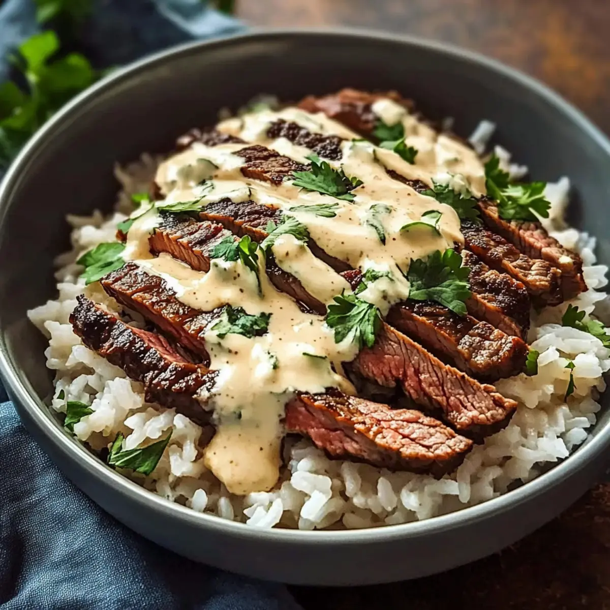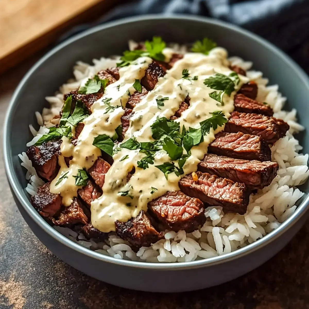 The sizzle of juicy steak hitting a hot skillet transports me straight to summer barbecues where family, laughter, and tantalizing aromas mingle in the air. Today, I’m excited to share my favorite Steak and Queso Rice recipe, a delightful twist on comforting Tex-Mex flavors. This dish is a hearty crowd-pleaser that combines tender steak strips with creamy queso and seasoned rice, delivering a satisfying meal that’s perfect for a cozy night in or casual gatherings with friends. Not only is it quick to prepare, but it also lends itself to countless variations, allowing you to customize it to your taste. Are you ready to dive into a bowl that feels like a warm hug on a plate? Let’s get cooking! Why Choose Steak and Queso Rice? Comforting Flavors: With its perfect blend of juicy steak and creamy queso, this dish embodies the essence of Tex-Mex comfort food. Quick Preparation: Ready in under 30 minutes, it’s ideal for busy weeknights or last-minute gatherings. Versatility: Whether served with cauliflower rice for a low-carb option or topped with fresh jalapeños, you can easily adapt it to suit your cravings. Pair it alongside crispy tortilla chips for that extra crunch or enjoy it as a delightful main dish. Crowd-Pleaser: Impress your family and friends with this indulgent meal that will have everyone coming back for seconds. Check out Savory Onion Steak for another delicious steak dish! Hearty Satisfaction: Each bowl is a satisfying experience, ensuring you feel full and content, making it the perfect centerpiece for any dinner table. Steak and Queso Rice Ingredients For the Steak Steak (sirloin or flank) – Provides a robust and savory flavor; you can substitute with ribeye for enhanced tenderness. Olive oil – Used for marinating steak to enhance flavor and prevent sticking during cooking. Chili powder – Adds a mild heat and depth of flavor to the steak. Garlic powder – Enhances overall taste; can also be replaced with fresh minced garlic for a more vibrant flavor. Lime – Offers acidity that balances the richness; essential for marinating the steak. For the Rice Base Cooked white rice (jasmine or long-grain) – Acts as the dish’s base, absorbing flavors beautifully; substitute with brown or cauliflower rice for a healthier option. For the Queso Queso cheese sauce – Adds creaminess and richness; whether homemade or store-bought, adjust thickness with cream if needed for the perfect pour. For Garnish Fresh cilantro – Brings brightness and freshness as a garnish; this is optional and can be swapped with green onions or parsley for a different twist. Step‑by‑Step Instructions for Steak and Queso Rice Step 1: Marinate the Steak In a mixing bowl, whisk together the juice of one lime, 1 tablespoon olive oil, 1 teaspoon chili powder, and 1 teaspoon garlic powder. Cut your sirloin or flank steak into strips, then add to the marinade. Let it sit for at least 10 minutes to absorb the flavors while you prepare the rest of the dish. Step 2: Cook the Steak Heat a large skillet over medium-high heat, ensuring it gets nice and hot for about 3 minutes. Add the marinated steak strips to the skillet, searing them for 4–6 minutes until they’re nicely browned and cooked through, stirring occasionally to prevent sticking. Once done, transfer the steak to a plate and cover it to keep warm. Step 3: Prepare the Queso In a separate saucepan, warm the queso cheese sauce over low heat, stirring occasionally for about 5 minutes until it’s smooth and creamy. If your queso is too thick, you can add a splash of cream to achieve your desired consistency. Keep it on low while you assemble the steak and queso rice. Step 4: Assemble the Bowls Start by layering cooked white rice in each bowl, creating a generous base. Next, top the rice with the sizzling steak strips, allowing the juices to mingle with the rice. Drizzle warm queso generously over the steak, creating a creamy layer over your hearty base, turning your meal into an enticing Steak and Queso Rice bowl. Step 5: Garnish and Serve Finish off your dish by sprinkling fresh cilantro on top for added brightness and flavor. If desired, you can also add a squeeze of lime for a tangy kick. Serve immediately, inviting everyone to dig into their comforting bowls of Steak and Queso Rice while the flavors still mingle delightfully warm. Expert Tips for Steak and Queso Rice Marination Matters: Always marinate your steak for at least 10 minutes. This enhances the flavor, ensuring each bite is juicy and satisfying. Perfect Searing: Use a hot skillet to sear the steak. This creates a flavorful crust, bringing out robust flavors that elevate your steak rice bowl. Avoid Overcrowding: Cook steak strips in batches if needed. Overcrowding leads to steaming instead of searing, which can result in a less flavorful dish. Fluff and Layer Rice: Gently fluff the cooked rice before assembling. This maintains a light texture, allowing the queso and steak to blend perfectly in your bowl. Customize Your Queso: Feel free to experiment with various cheese blends for your queso. Adding ingredients like jalapeños or green chilies can introduce an extra kick to your Steak and Queso Rice! Variations & Substitutions for Steak and Queso Rice Ready to make your Steak and Queso Rice uniquely yours? Let’s sprinkle some creativity into this comforting bowl. Low-Carb Rice: Swap traditional rice for brown rice or cauliflower rice to lighten up the dish without losing the comforting flavor. Add Veggies: Mix in roasted peppers, black beans, or sweet corn. These additions enhance texture and provide extra layers of flavor, making every bite more delightful. Spicy Kick: Top with jalapeños or salsa verde for an extra kick of heat and a pop of color that will tantalize your taste buds. Cheese Variety: Experiment with different cheese blends for the queso. Adding green chiles creates a zesty twist, ensuring your bowl is bursting with flavor. Herby Substitutes: If cilantro isn’t