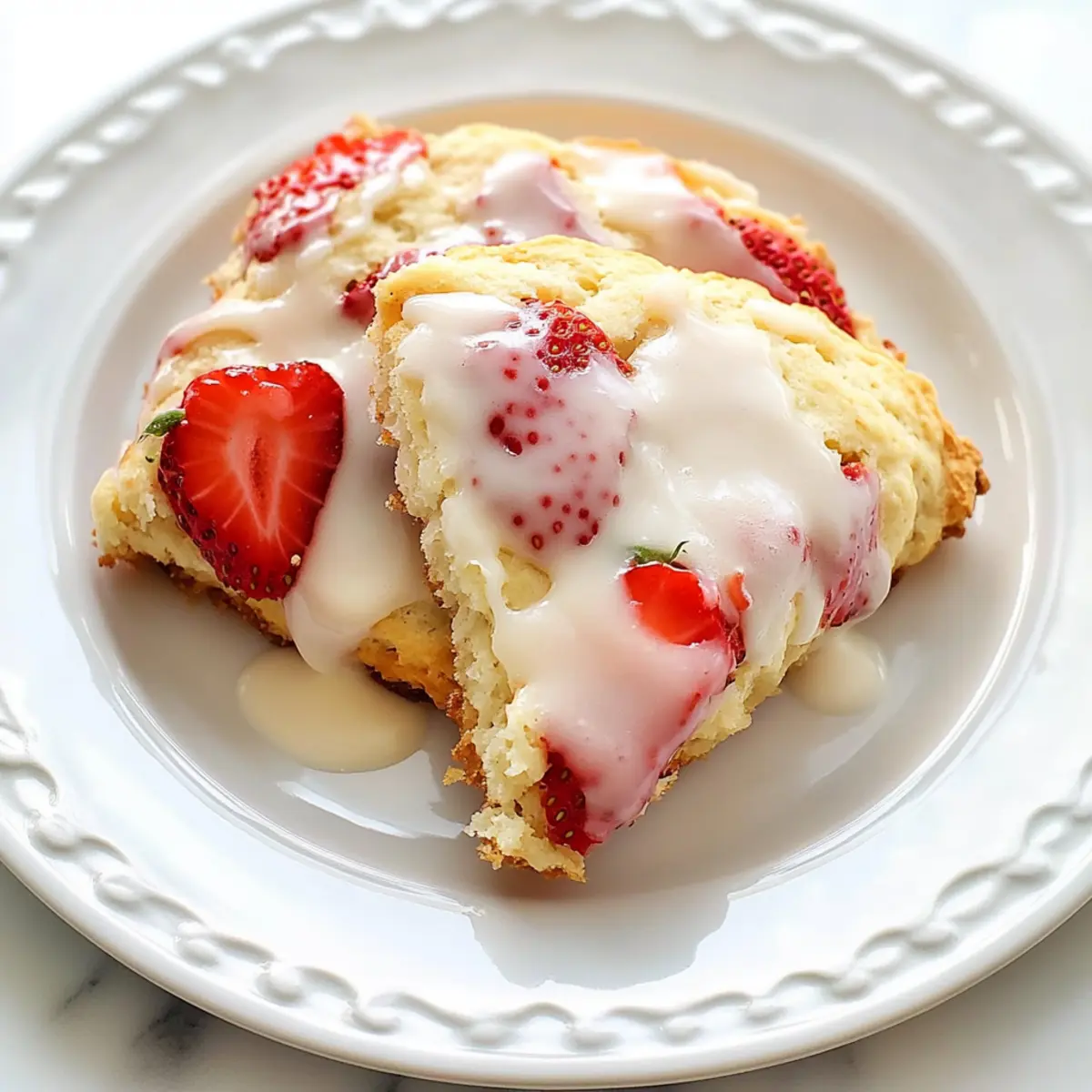 As I stood by the kitchen counter this morning, the scent of freshly baked goodies wafted through the air, bringing back fond memories of weekends spent savoring sweet moments. These Strawberries and Cream Scones are my go-to breakfast treat that captures that enchanting experience in every bite. Imagine starting your day with the buttery, soft texture of warm scones, complemented by the vibrant sweetness of fresh strawberries and topped with a creamy vanilla glaze. Not only are they quick to whip up, making them perfect for busy mornings, but they’re also freezer-friendly, allowing you to enjoy a homemade delight anytime. If you’re ready to elevate your breakfast game, let’s dive into this simple, yet delicious recipe that’s sure to impress both family and friends. What will you pair these delightful scones with? Why are Strawberries and Cream Scones irresistible? Delightful sweetness: Bursting with fresh strawberries, every bite offers a juicy surprise that enhances your morning. Quick and easy: This recipe is perfect for both novice and experienced bakers, making it stress-free for busy mornings. Versatile: Feel free to swap the strawberries for blueberries or raspberries for a new twist! Want to keep the scones warm longer? Creamy Ravioli Soup Cozy pairs well for a cozy brunch experience. Freezer-friendly: Bake a batch and freeze them for up to two months, ensuring that a delightful treat is always within arm’s reach. Perfect with coffee: Enjoy them with a cup of your favorite brew or tea, creating a blissful starting point for your day. Strawberries and Cream Scones Ingredients For the Scones • All-purpose flour – Provides structure for the scones; whole wheat flour can be used for added nutrition. • Salt – Enhances flavor to make your scones stand out. • Baking powder – A leavening agent that helps scones rise to their fluffy glory. • Baking soda – Works with acidity to provide the necessary lift. • Granulated sugar – Adds sweetness and contributes to a golden crust. • Unsalted butter (very cold) – Essential for flakiness and richness; coconut oil is a viable alternative with different texture. • Large egg – Binds ingredients together and adds a touch of moisture. • Whole milk – Contributes richness; feel free to swap for non-dairy milk if preferred. • Heavy cream – Adds to both the scone richness and the glaze. • Fresh strawberries (hulled and quartered) – The star of this recipe, delivering sweetness and moisture in every bite. • Egg wash (beaten egg + water) – Creates that irresistible golden crust during baking. • Sugar (for sprinkling) – Adds a sweet, crunchy texture on top of the scones. For the Glaze • Heavy cream (for glaze) – Needed for a creamy vanilla glaze that enhances the scone’s flavor. • Confectioners’ sugar – Adds sweetness and body to the glaze, making it simply delightful. • Vanilla extract – Infuses the glaze with a wonderful flavor. • Pinch of salt – Balances out the sweetness in the glaze perfectly. This list of ingredients will guide you in creating the most delightful Strawberries and Cream Scones that can make any breakfast special! Step‑by‑Step Instructions for Strawberries and Cream Scones Step 1: Preheat the Oven Start by preheating your oven to 400°F (204°C) while you prepare your ingredients. Meanwhile, line a large baking sheet with parchment paper to prevent sticking. This ensures that your scones bake evenly and don’t lose their lovely golden crust when ready to enjoy. Step 2: Mix Dry Ingredients In a large mixing bowl, combine the all-purpose flour, salt, baking powder, baking soda, and granulated sugar. Use a whisk to blend these dry ingredients thoroughly, ensuring they’re evenly distributed. This step is crucial for the right texture in your Strawberries and Cream Scones, giving them that perfectly fluffy rise. Step 3: Incorporate Butter Next, add very cold, diced unsalted butter to the flour mixture. Using your fingertips or a pastry cutter, work the butter into the flour until the mixture resembles coarse crumbs, with some small pea-sized pieces of butter remaining. This will create the desired flaky texture in your scones once baked. Step 4: Combine Wet Ingredients In a separate bowl, whisk together the large egg, whole milk, and heavy cream until well combined. Gently pour this mixture into the dry ingredients, stirring with a spatula until just combined. Be careful not to over-mix; a shaggy dough is perfect for your Strawberries and Cream Scones. Step 5: Fold in Strawberries Carefully fold in the hulled and quartered fresh strawberries into the dough, ensuring even distribution without overly compressing the mixture. This helps maintain the delicate texture and allows the juicy bursts of strawberries to shine through in every bite of your delicious scones. Step 6: Shape the Dough Transfer the dough onto a lightly floured surface and gently shape it into an 8-inch circle, about 1-inch thick. Using a sharp knife, cut the circle into 8 wedges, being careful not to handle them too much to keep the layers intact. This will ensure beautifully shaped and fluffy Strawberries and Cream Scones. Step 7: Prepare for Baking Place the scone wedges on the prepared baking sheet, ensuring they are spaced slightly apart. Brush the tops with the egg wash and sprinkle a bit of sugar on top for a delightful crunch. This step not only adds flavor but also gives your scones an appealing, golden-brown finish when baked. Step 8: Bake the Scones Bake your scones in the preheated oven for about 18 minutes, or until they turn a lovely golden brown. Keep an eye on them, as the aroma wafting through your kitchen will be irresistible! Once baked, remove them from the oven and let them cool on the baking sheet for about 10 minutes. Step 9: Prepare the Glaze While the scones cool, whisk together heavy cream, confectioners’ sugar, vanilla extract, and a pinch of salt in a small bowl un