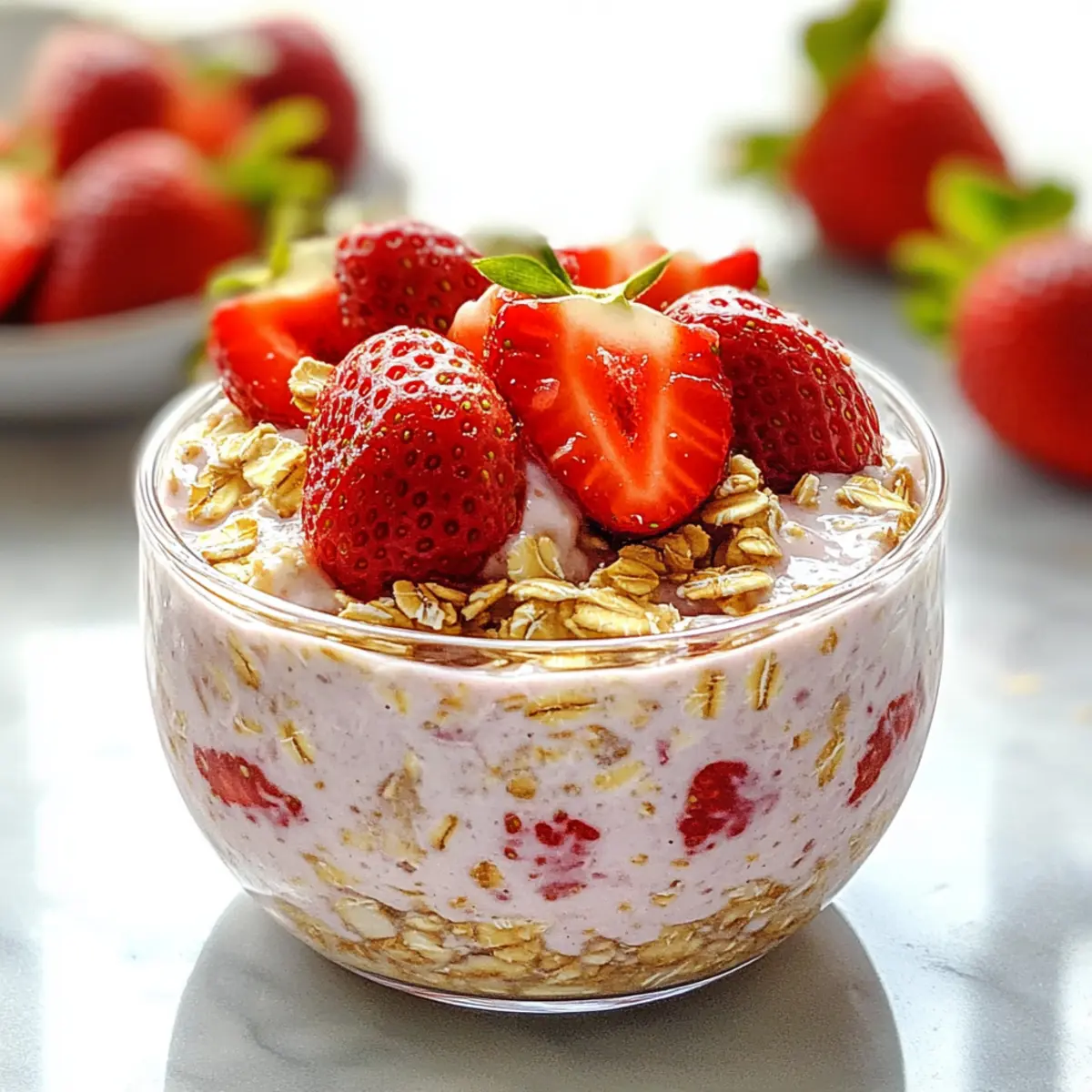 As I flipped through my favorite recipes, I stumbled upon a delightful twist on breakfast that had me grinning from ear to ear: Strawberry Cheesecake Overnight Oats. This scrumptious dish combines the creamy goodness of Greek yogurt with the natural sweetness of fresh strawberries, creating a breakfast that feels like a dessert—but without the guilt! With its no-cook, make-ahead convenience, this recipe is not only a time-saver for busy mornings but also packs a powerful protein punch to fuel your day. Whether you’re busy with work, school, or just making the most of your time, these oats provide a nourishing and satisfying start. Are you ready to indulge your morning routine in a delicious way? Let’s dive into this wonderful recipe! Why are overnight oats so popular? Convenience: Preparing strawberry cheesecake overnight oats is a breeze! Simply mix everything the night before and grab it in the morning. Dessert-like Delight: Enjoy the creamy, sweet flavor reminiscent of cheesecake, making breakfast feel like a treat. Healthy Choices: Packed with protein from Greek yogurt, these oats are gluten-free and offer nutritious options for everyone. Versatility: Try different variations, like Chocolate Strawberry Cheesecake or Strawberry Banana Cheesecake Oats, to keep things exciting! Time-Saving: These oats can be prepped in advance, giving you more time in the morning for what truly matters—like enjoying a Cucumber Strawberry Salad on the side. Crowd Pleaser: Your family (and even guests) will adore this twist on breakfast; it’s sure to become a favorite! Strawberry Cheesecake Overnight Oats Ingredients For the Oats Mixture Old-Fashioned Oats – The base ingredient providing structure and fiber; avoid quick oats for best texture. Greek Yogurt – Adds creaminess and protein; substitute with dairy-free yogurt for a vegan option. Cream Cheese – Provides that cheesecake flavor; ensure it’s smoothly blended to avoid lumps, or use dairy-free cream cheese. Vanilla Extract – Enhances the overall flavor; try almond extract for a different twist if desired. Milk – Used for soaking the oats; adjust the liquid for your preferred consistency, using dairy-free milk for a vegan version. For the Sweetness Maple Syrup (optional) – Adds a touch of sweetness; substitute with stevia or mashed banana for a lower-sugar option. For the Fruit Fresh Strawberries – Provide natural sweetness and flavor; you can substitute with mixed berries for a fun variation. Now, gather all these delightful ingredients and prepare yourself for an incredible breakfast experience that will leave you asking for more of those Strawberry Cheesecake Overnight Oats! Step‑by‑Step Instructions for Strawberry Cheesecake Overnight Oats Step 1: Combine the Base Ingredients In a mixing bowl, add 1 cup of old-fashioned oats, ½ cup of Greek yogurt, and ½ cup of milk. Stir these ingredients together thoroughly with a spatula until the oats are evenly coated in the creamy yogurt and milk mixture. For the best texture, ensure there are no clumps of dry oats. Step 2: Incorporate the Cream Cheese Next, blend in ¼ cup of softened cream cheese until it’s fully incorporated, creating a lush, creamy texture. Use a whisk or a hand mixer on low speed for about 1-2 minutes to ensure there are no lumps, and everything is smooth. This step is crucial for achieving the delightful cheesecake flavor in your Strawberry Cheesecake Overnight Oats. Step 3: Add Sweetness and Flavor Stir in 1 teaspoon of vanilla extract and, if you like it a bit sweeter, 1 tablespoon of maple syrup. Mix well until both ingredients are fully integrated into the mixture. The vanilla enhances the overall flavor profile and further brings out the cheesecake essence in the oats. Step 4: Fold in the Strawberries Gently fold in 1 cup of chopped fresh strawberries. Use a spatula to carefully mix them without over-mixing, so the strawberries remain somewhat intact, adding bursts of fresh flavor and color to your Strawberry Cheesecake Overnight Oats. Step 5: Portion into Jars Divide the mixture evenly among mason jars or airtight containers. Depending on your preferred serving size, this should yield about 2-4 servings. Seal the jars tightly with lids, ensuring that each one is well-contained for maximum freshness during refrigeration. Step 6: Refrigerate Place your jars in the refrigerator and let them chill for at least 4 hours, or preferably overnight. This soaking time allows the oats to soften and absorb the flavors, creating a creamy, luscious texture that resembles a cheesecake—perfect for an easy grab-and-go breakfast. Step 7: Serve and Enjoy In the morning, give your Strawberry Cheesecake Overnight Oats a good stir before serving. Enjoy them straight from the jar or top with additional strawberries or a sprinkle of nuts for added crunch. This breakfast is not only nutritious but indulgent, making it perfect for any busy morning! Make Ahead Options These Strawberry Cheesecake Overnight Oats are perfect for meal prep enthusiasts! You can mix all the ingredients—old-fashioned oats, Greek yogurt, cream cheese, and milk—up to 24 hours in advance and refrigerate them in jars. The key is to fold in the strawberries right before serving to maintain their freshness and vibrant flavor. You can store the prepared oats in the fridge for up to 3 days, ensuring you keep them sealed tightly in airtight containers to maintain quality. When you’re ready to enjoy, simply give the jars a stir and add any extra toppings like fresh fruit or nuts to elevate your breakfast experience effortlessly! Expert Tips for Strawberry Cheesecake Overnight Oats Achieve Creaminess: Make sure to blend the cream cheese thoroughly into the oat mixture to avoid any lumps; a smooth texture is key! Right Liquid Ratio: Stick to the ½ cup milk to ½ cup oats ratio for the perfect consistency; too much liquid can lead to a soupy mess. Customize Sweetness: If you prefer a sweeter breakfast,