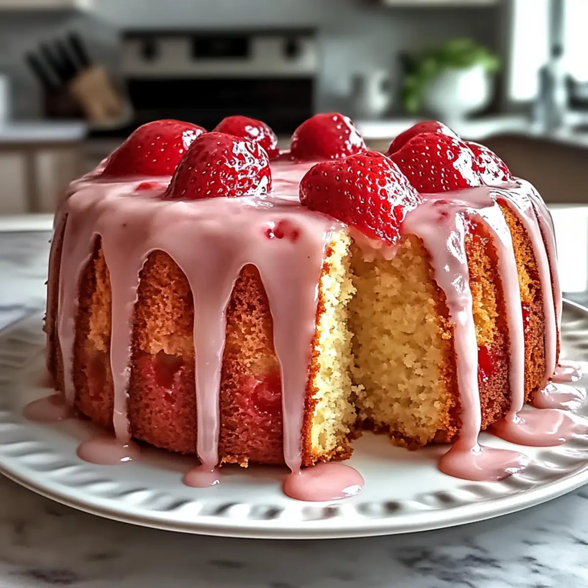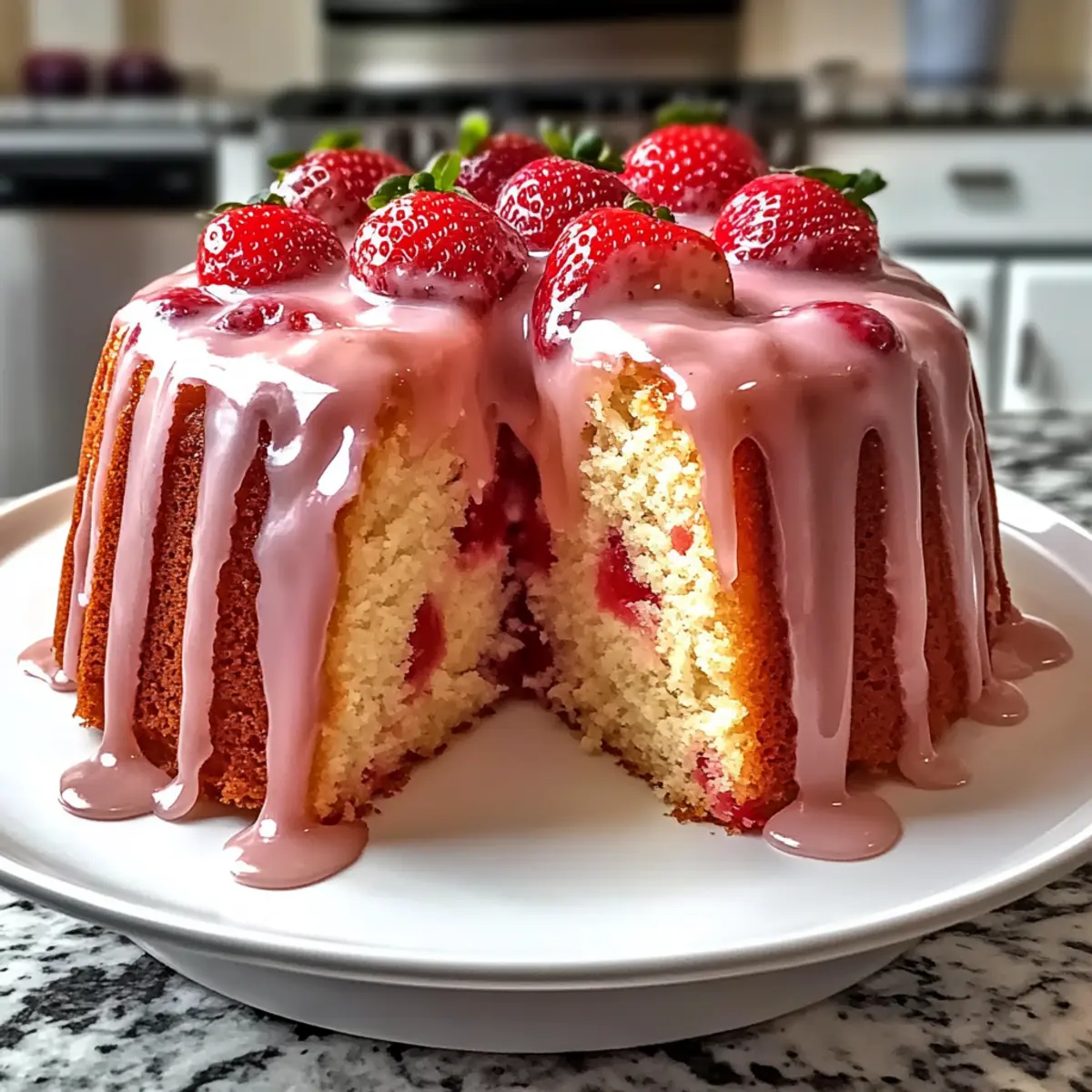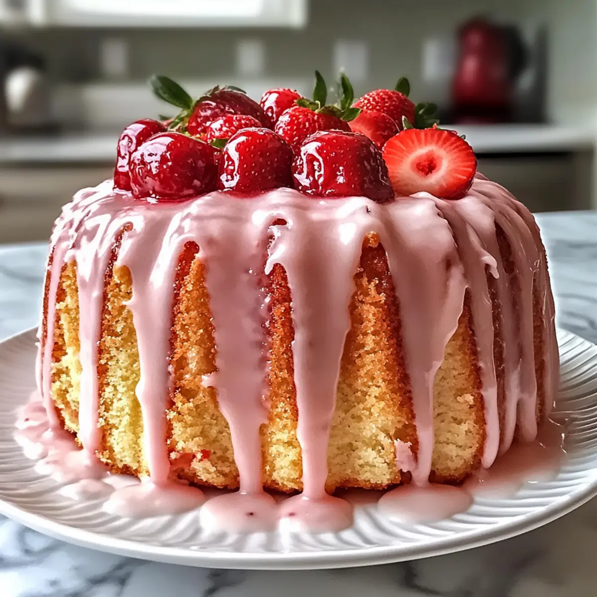 As I stood in my kitchen, the aroma of fresh strawberries filled the air, instantly transporting me to sunny picnics and blissful summer afternoons. Today, I’m thrilled to share my recipe for a Moist Strawberry Cream Cheese Pound Cake with Luscious Strawberry Glaze that holidays and special celebrations cry out for! This cake not only boasts a velvety texture that simply melts in your mouth, but it also brings a delightful fruity punch that makes every slice a little piece of joy. Perfect for brunches or as a centerpiece for gatherings, the easy-to-follow steps mean you can impress your guests without breaking a sweat. How could anything so delicious be so effortless? Let’s dive into the sweet symphony of flavors and create something beautiful together! Why is This Cake a Must-Bake? Delightful flavor fusion: The juicy strawberries combined with creamy cheese create an irresistible taste sensation that’s perfect for any occasion. Simple to make: No complicated techniques here—just straightforward steps ensure even novice bakers can achieve success. Moist and soft texture: The cream cheese ensures a tender crumb that stays moist, making it perfect for sharing. Eye-catching presentation: With its luscious strawberry glaze, this cake is sure to be a standout at brunch or festive events. For a different twist, try serving it alongside a refreshing Cucumber Strawberry Salad for a contrast of flavors. Versatile for celebrations: Whether it’s Easter brunch or a bridal shower, this cake pairs beautifully with any gathering. You won’t want to miss out on this delicious treat! Strawberry Cream Cheese Pound Cake Ingredients For the Cake Unsalted Butter – Provides richness and moisture; use it at room temperature for easy creaming. Cream Cheese – Adds tangy flavor and tenderness to the cake; make sure it’s softened for smooth mixing. Granulated Sugar – Sweetens the cake and contributes to its moist texture, ensuring that every bite is delightful. Eggs – Bind the ingredients and create structure; opt for room temperature eggs for better incorporation. All-Purpose Flour – The main structure-building ingredient that gives the cake its form; use high-quality flour for best results. Baking Powder – Acts as a leavening agent to give the cake lift and a delightful lightness. Vanilla Extract – Enhances flavor depth; feel free to substitute with almond extract for a unique twist. Fresh Strawberries – Provides delicious flavor bursts and texture; chop finely and coat in flour to prevent sinking. For the Strawberry Glaze Powdered Sugar – A sweet component that yields a smooth finish in the glaze when creamed together. Strawberry Puree – Delivers bright fresh flavor in the glaze; can be swapped with other fruit purees if you’re feeling adventurous. Milk or Cream – Used to achieve the desired glaze consistency; adjust for thickness as needed. With these ingredients, you’ll create a delightful Strawberry Cream Cheese Pound Cake with Strawberry Glaze that your friends and family will rave about! Step‑by‑Step Instructions for Strawberry Cream Cheese Pound Cake with Strawberry Glaze Step 1: Preheat Oven Begin by preheating your oven to 325°F (160°C). While your oven warms, prepare a Bundt pan by greasing it with unsalted butter and dusting it lightly with flour. This ensures the cake will slide out effortlessly once baked, giving you a beautifully shaped Strawberry Cream Cheese Pound Cake. Step 2: Mix Wet Ingredients In a large mixing bowl, use a hand mixer to beat the softened unsalted butter and cream cheese together until the mixture is light and fluffy, taking about 2-3 minutes. Gradually add granulated sugar, continuing to mix until you have a creamy texture that should look pale and airy, which will contribute to the cake’s moistness. Step 3: Incorporate Eggs Next, add the room temperature eggs one at a time, mixing well after each addition to ensure complete incorporation. Stir in the vanilla extract once all the eggs are added. The mixture should become even smoother, and you’ll notice a wonderful aroma filling your kitchen as you prepare your Strawberry Cream Cheese Pound Cake batter. Step 4: Prepare Dry Ingredients In a separate bowl, whisk together the all-purpose flour and baking powder until well combined. This step is crucial for evenly distributing the leavening agent throughout the flour, ensuring an even rise. Set the dry mixture aside while you complete the wet mixture. Step 5: Combine Mixtures Gradually add the flour mixture into the wet ingredients, mixing on low speed until just combined. Avoid overmixing at this stage; you want the batter to be thick and slightly lumpy, which is the key to a moist cake. Your lovely batter for the Strawberry Cream Cheese Pound Cake is now ready. Step 6: Fold in Strawberries Prepare your fresh strawberries by chopping them finely and tossing them in a small amount of flour. This helps keep them from sinking during baking. Gently fold the floured strawberries into the batter with a spatula; be careful not to crush them as you want those delightful bursts of fruit flavor in every slice. Step 7: Bake Pour the prepared batter into the greased Bundt pan, smoothing out the top with a spatula. Bake in the preheated oven for 65-75 minutes, or until a toothpick inserted into the center comes out clean with just a few moist crumbs clinging to it. The lovely smell will fill your home as it bakes! Step 8: Cool Once baked, allow the cake to cool in the pan for 15 minutes. After that, carefully invert the cake onto a wire rack to cool completely. This is a vital step as cooling properly helps the cake retain its moist texture and flavor, making your Strawberry Cream Cheese Pound Cake even more enjoyable. Step 9: Prepare Glaze In a mixing bowl, beat softened cream cheese until smooth, then gradually mix in powdered sugar until well combined. Next, add strawberry puree and a splash of milk or cream until you reach a pourable consi