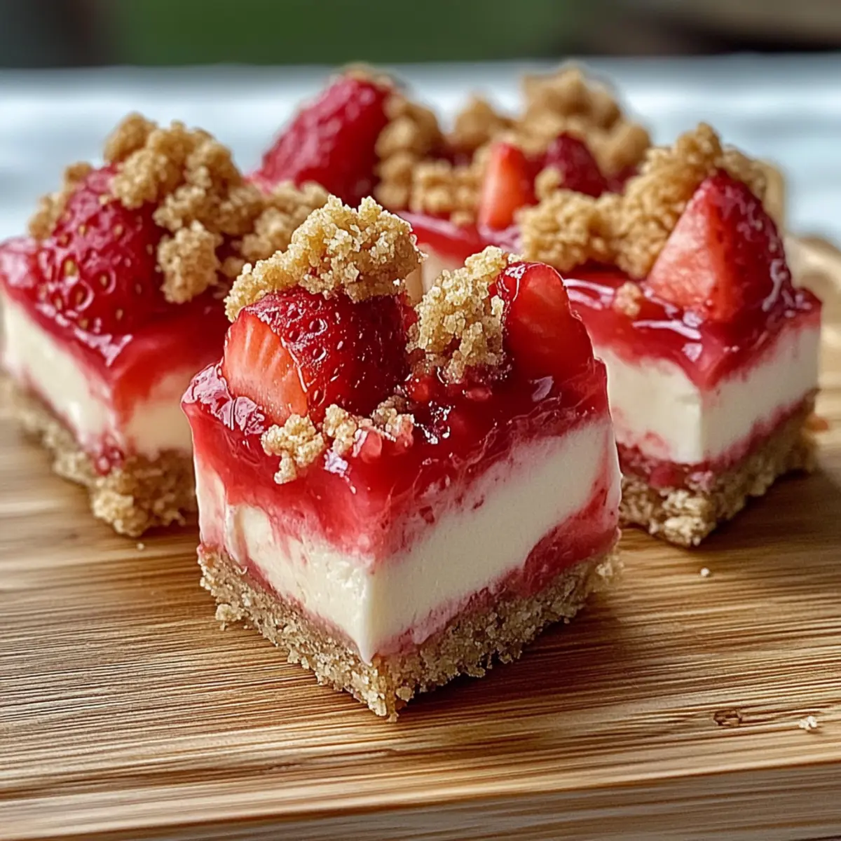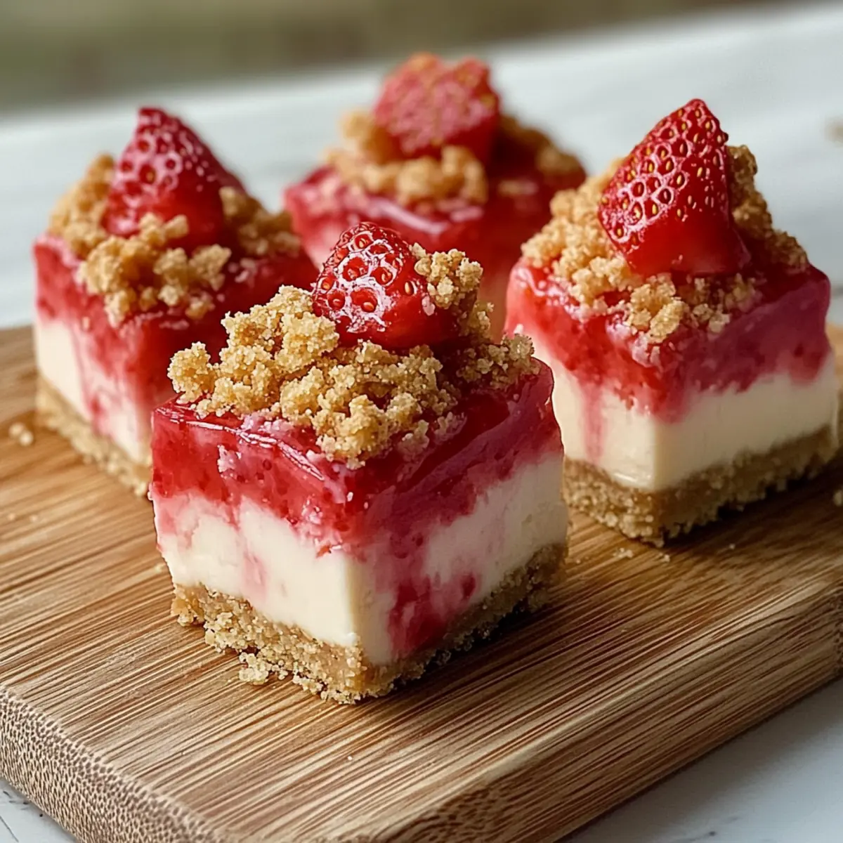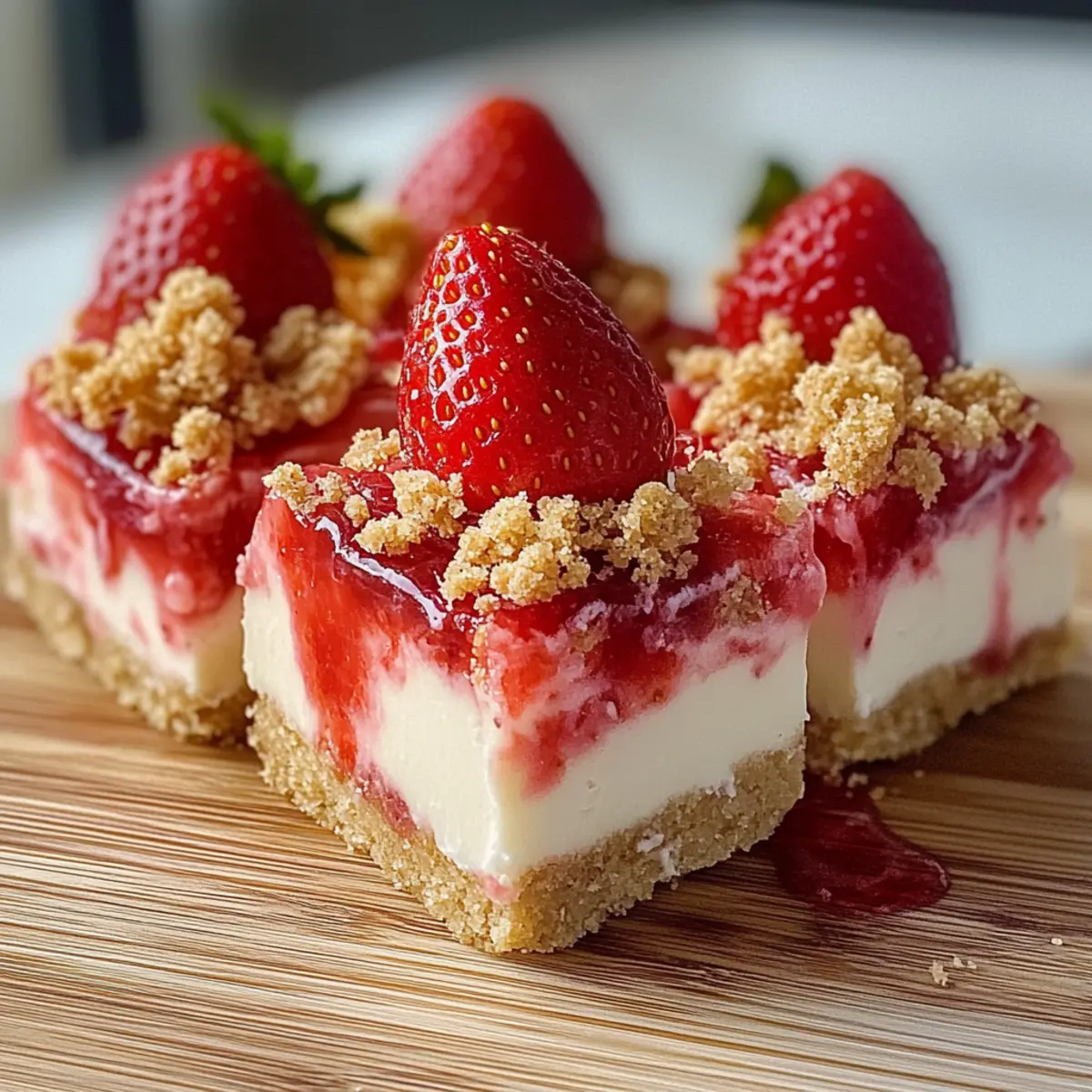 The sun was shining, and I found myself craving something that perfectly blended nostalgia and modern flair. That’s when I whipped up a batch of Strawberry Crunch Cheesecake Chunks! These delightful treats are an irresistible fusion of creamy cheesecake and crunchy strawberry goodness, making them ideal for summer gatherings or a delightful treat just for you. With a no-bake option that keeps prep time to a minimum, these bites are a breeze to make ahead. Plus, they’re customizable—think gluten-free or sugar-free possibilities—to fit anyone’s dietary preferences! Trust me, once you take that first satisfying bite, you’ll be hooked. Are you ready to impress your friends and family with this sweet creation? Let’s dive in! Why You’ll Love Strawberry Crunch Cheesecake Chunks Irresistible Treats: These Strawberry Crunch Cheesecake Chunks deliver a perfect balance of creamy and crunchy in every bite. Customizable Options: With no-bake variations and the ability to easily make them gluten-free or sugar-free, they’ve got something for everyone. Quick and Easy: A simple recipe that allows you to prepare delicious treats without spending hours in the kitchen. Crowd-Pleasing Flavor: The classic combination of strawberry and cheesecake is always a hit at gatherings. Aesthetic Appeal: Their vibrant red and white layers make them not just tasty but visually stunning, perfect for sharing on social media! You’re going to want to serve these alongside your favorite summer dishes like Cucumber Strawberry Salad for an all-out dessert spread! Strawberry Crunch Cheesecake Chunks Ingredients Get ready to whip up these delightful Strawberry Crunch Cheesecake Chunks with this easy-to-follow ingredient list! For the Crust Graham Cracker Crumbs (or Golden Oreo Crumbs) – Forms the crust; substitute with gluten-free cookies for a gluten-free version. Unsalted Butter – Binds the crust together; ensure it’s melted for ease of mixing. Granulated Sugar – Sweetens the crust and cheesecake filling; can be swapped for alternative sweeteners like monk fruit for low-carb diets. For the Cheesecake Filling Cream Cheese – Provides rich, creamy texture in the filling; use softened at room temperature for best mixing. Eggs – Adds structure and helps set the filling; for the no-bake version, substitute with whipped cream. Sour Cream – Adds tanginess and creaminess; optional but recommended for enhancing texture. Vanilla Extract – Enhances overall flavor and complements the strawberries. Strawberry Puree or Jam – Infuses fruity flavor into the filling; fresh puree yields a natural taste, while jam offers convenience. For the Topping Golden Oreos or Vanilla Wafers – Creates the crunchy topping layer; crush them for a textured finish. Freeze-Dried Strawberries – Delivers intense strawberry flavor and crunch; ideal for preventing sogginess in the topping. Optional Toppings White Chocolate – Perfect for drizzling; elevates both aesthetics and flavor. Fresh Sliced Strawberries – Great for garnishing; adds a pop of freshness and color. Now that you have the ingredients handy, let’s get ready to create some unforgettable Strawberry Crunch Cheesecake Chunks! Step‑by‑Step Instructions for Strawberry Crunch Cheesecake Chunks Step 1: Prepare the Crust Preheat your oven to 325°F (160°C). In a mixing bowl, combine graham cracker crumbs, granulated sugar, and melted unsalted butter until the mixture resembles wet sand. Press this mixture firmly into the bottom of a parchment-lined 9×9 inch baking pan, creating an even layer. Bake in the preheated oven for about 10 minutes, or until lightly golden, then allow it to cool completely. Step 2: Make Cheesecake Filling In a large mixing bowl, beat softened cream cheese with granulated sugar until the mixture is smooth and free of lumps. Add the eggs one at a time, ensuring each is fully incorporated before adding the next. Mix in sour cream, vanilla extract, and strawberry puree until everything is well-blended. Pour this delicious cheesecake filling over the cooled crust, making sure it’s evenly spread for consistent texture. Step 3: Bake & Chill Bake the cheesecake in your preheated oven at 325°F (160°C) for 35-40 minutes. It should look set at the edges but still slightly jiggly in the center, indicating perfect doneness. Once done, remove it from the oven and let it cool at room temperature. After it cools completely, refrigerate for at least 4 hours or preferably overnight to ensure it’s thoroughly chilled and firm. Step 4: Prepare Topping While the cheesecake chills, prepare the crunchy topping. In a bowl, combine crushed Golden Oreos (or vanilla wafers) and freeze-dried strawberries with melted butter. Mix until you achieve a crumbly texture that resembles damp sand. This topping will add the perfect crunch to your Strawberry Crunch Cheesecake Chunks, providing a delightful contrast to the creamy filling. Step 5: Assemble the Chunks Once the cheesecake has fully chilled, remove it from the fridge and carefully cut it into squares using a sharp knife. For a cleaner cut, dip the knife in hot water and wipe it dry. Take each square and gently coat it with the crunchy topping, pressing it on lightly to ensure it adheres. If desired, drizzle melted white chocolate over the top for an extra touch of sweetness and elegance. Step 6: Serve & Enjoy Finally, garnish each piece of your Strawberry Crunch Cheesecake Chunks with fresh sliced strawberries for a beautiful presentation. Keep these delightful treats refrigerated until you’re ready to serve them to friends and family. Their vibrant colors and irresistible flavors are sure to make them a hit at your next gathering! Storage Tips for Strawberry Crunch Cheesecake Chunks Fridge: Store your Strawberry Crunch Cheesecake Chunks in an airtight container for up to 5 days to maintain freshness and flavor. Freezer: For longer storage, freeze the chunks for up to 2 months. Wrap each piece individua