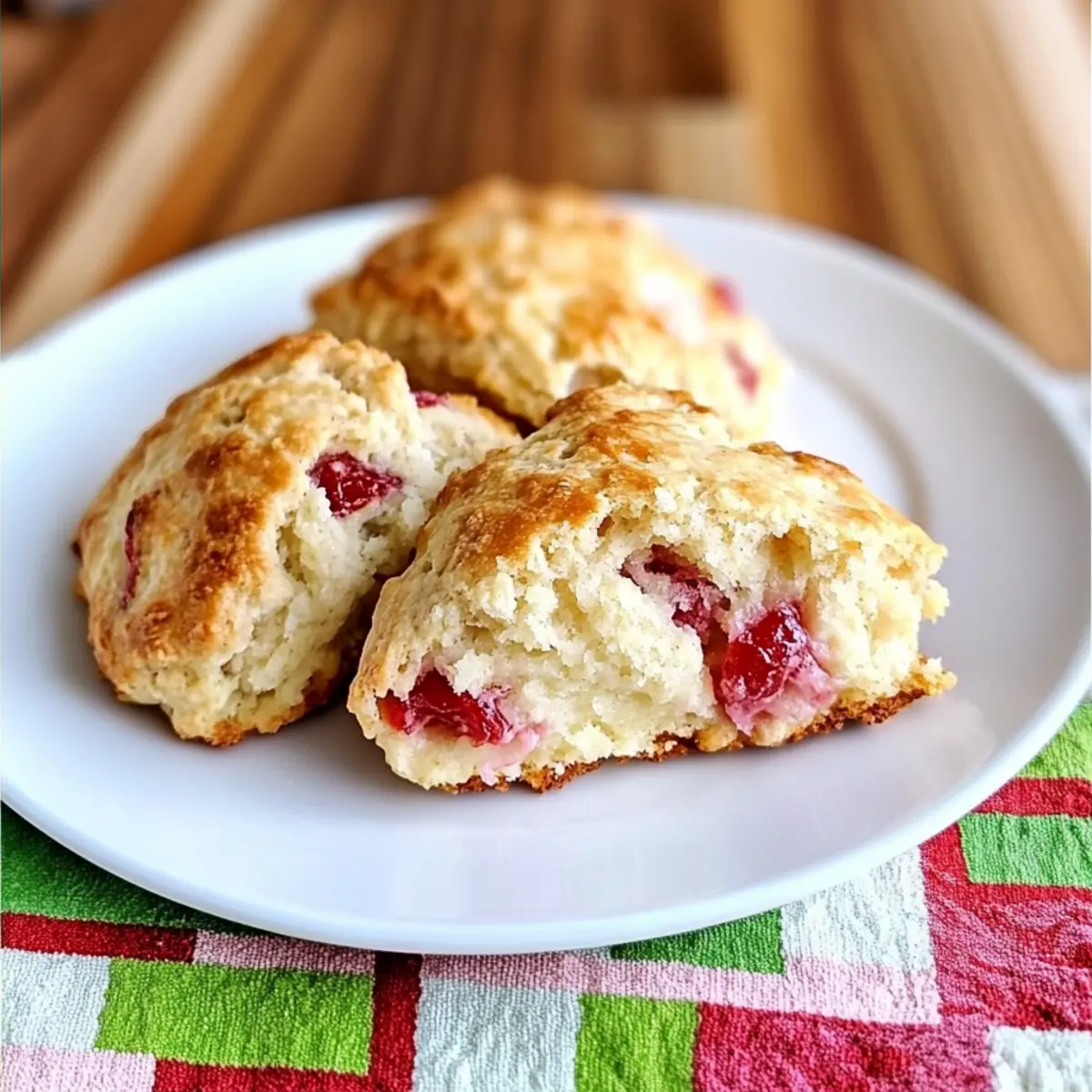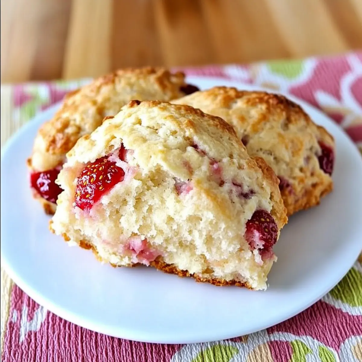 Delicious Strawberry-Rhubarb Drop Scones that combine sweet strawberries and tangy rhubarb for a delightful treat.