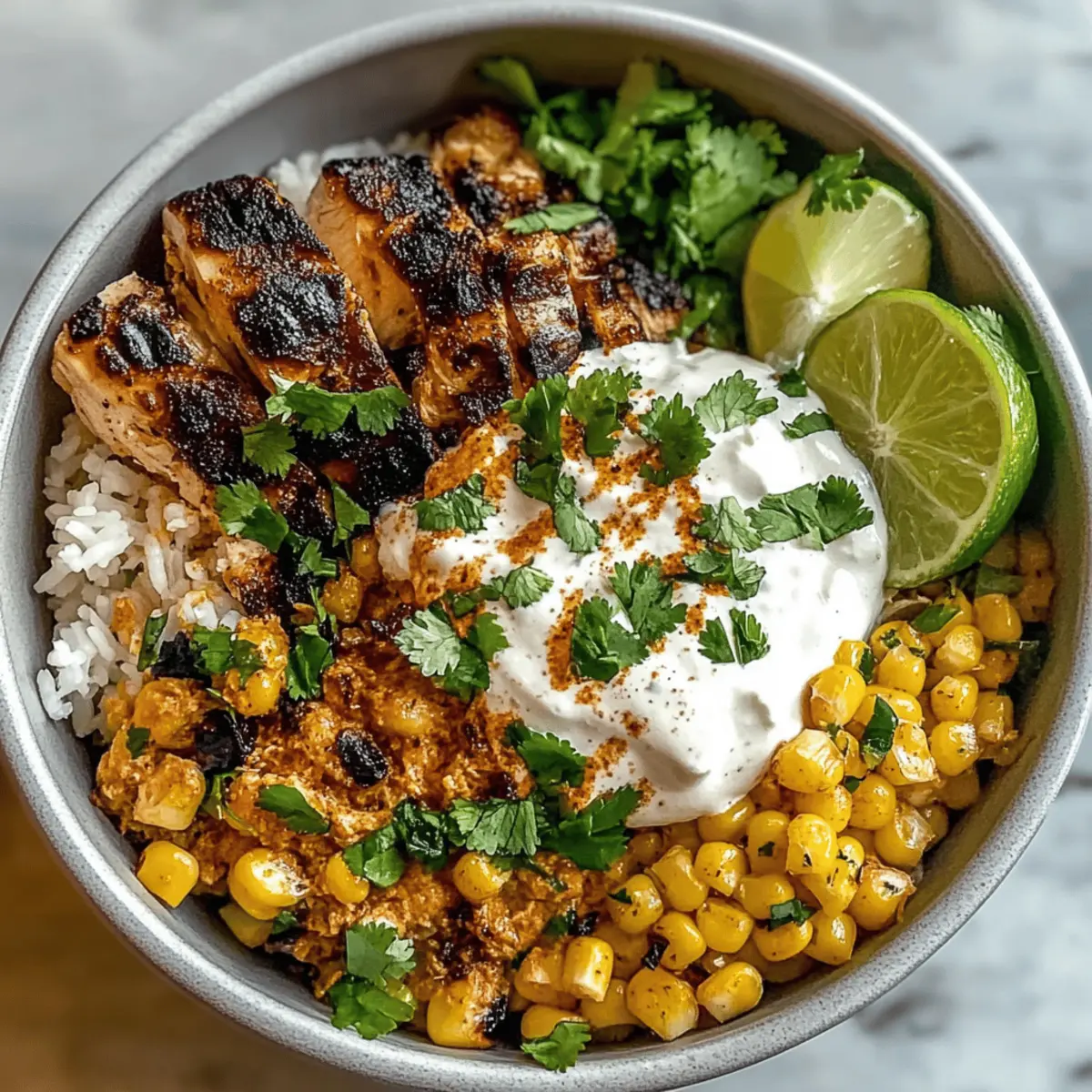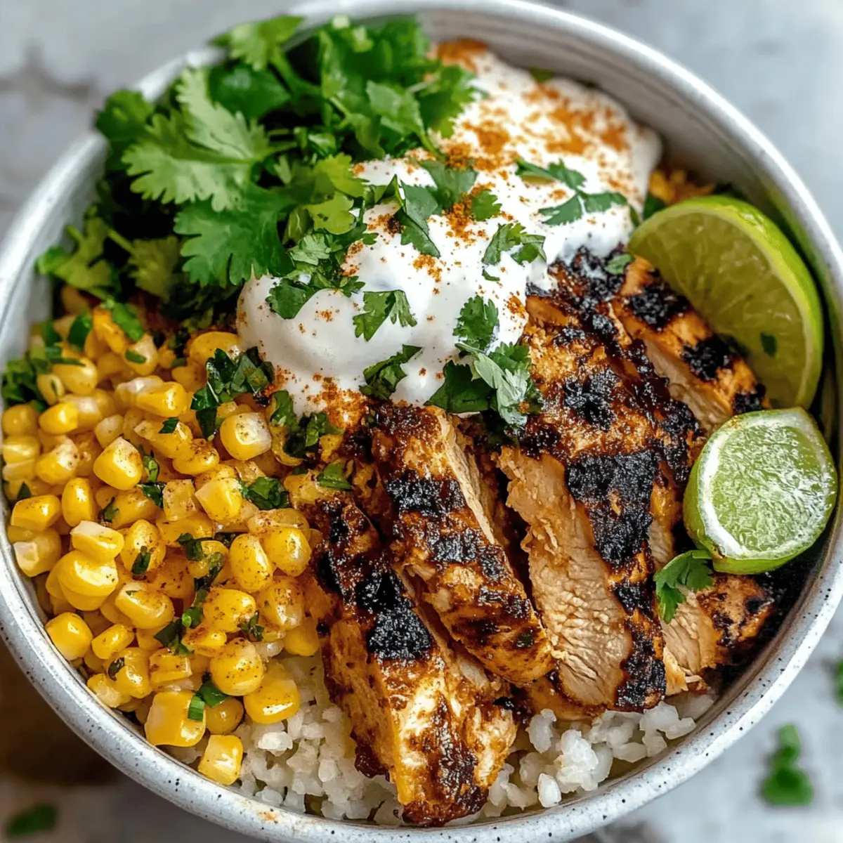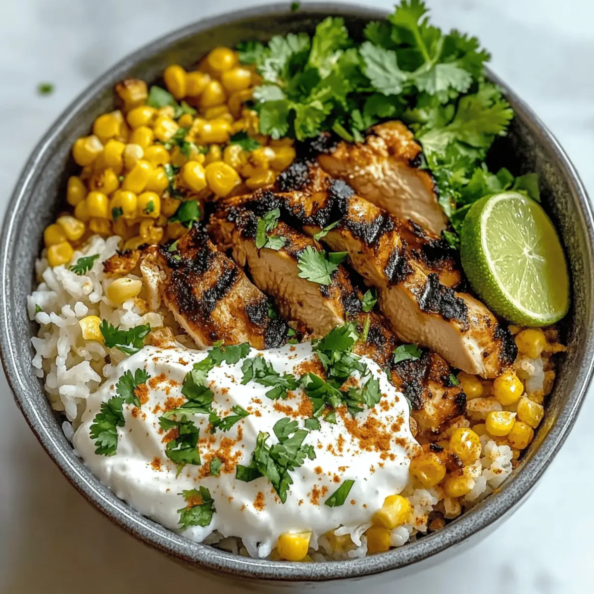 As I stood in my kitchen, the tantalizing aroma of smoky grilled chicken mingling with sweet, charred corn filled the air, transporting me straight to the bustling streets of Mexico. This Smoky Mexican Street Corn Chicken Rice Bowl is my go-to comfort food, bringing vibrant street food flavors right to my dinner table. What I adore about this recipe is not just its quick prep time, perfect for those busy weeknights, but also the joy of customization it offers—each bowl can be tailored to highlight your favorite toppings and ingredients! A delightful blend of creamy, smoky, and zesty flavors awaits you, so are you ready to experience the magic of this comforting dish? What makes this bowl irresistible? Vibrant Colors: Each bite of this Street Corn Chicken Rice Bowl bursts with color, making it as delightful to look at as it is to eat. Quick and Easy: Perfect for busy weeknights, this recipe is simple to prepare and requires minimal effort without compromising on flavor! Customizable Goodness: A unique feature of this dish is its versatility—mix and match toppings or switch proteins, like trying shrimp or grilled veggies. Crowd-Pleasing Flavor: Smoky, creamy, and tangy, the flavors will remind you of authentic street food, enchanting both family and friends alike. Healthful Delight: Packed with fresh ingredients, it’s not only delicious but also offers a great balance of protein and nutrients, making it a wholesome meal option. Try serving it alongside a refreshing side of Mexican Street Corn or some crispy tortilla chips for extra crunch! Street Corn Chicken Rice Bowl Ingredients • Here’s everything you need to create this delicious Mexican-inspired dish! For the Chicken Boneless Chicken Thighs – A juicy, flavorful protein that keeps each bite tender; use chicken breasts for a leaner option. Olive Oil – Helps the spices stick for maximum flavor; avocado oil is a great substitute. Chili Powder – Brings heat and depth; if you prefer a smokier profile, try using smoked paprika. Cumin – An essential spice that adds warmth and earthiness to the dish. Paprika – Offers subtle sweetness and vibrant color; smoked paprika lends an extra depth of flavor. Garlic – Freshly minced for a robust taste; garlic powder can work in a pinch. Lime – Provides brightness and acidity; lemon juice can serve as an alternative. For the Rice Jasmine Rice – The perfect base grain, fluffy and aromatic; swap for brown rice for added nutrients. Chicken Broth – Enhances the rice’s flavor profile; vegetable broth is an excellent option for vegetarians. For the Corn Topping Fresh Corn – A key ingredient for the dish, bringing sweetness and texture; frozen corn can be used as a backup, but fresh is best. Mayonnaise – Adds creaminess to the corn mixture; consider Greek yogurt for a lighter version. Cotija Cheese – Delivers a salty, creamy note to the bowl; feta cheese makes for a suitable substitute. For the Garnish Mexican Crema or Sour Cream – Contributes a rich, creamy texture; plain yogurt can blend well too. Fresh Cilantro – Adds freshness; if cilantro isn’t your favorite, parsley can be used instead. Preparing your Street Corn Chicken Rice Bowl with these ingredients will surely transport you to the street corners of Mexico with every flavorful bite! Step‑by‑Step Instructions for Street Corn Chicken Rice Bowl Step 1: Marinate Chicken In a mixing bowl, combine the boneless chicken thighs, olive oil, chili powder, cumin, paprika, minced garlic, lime juice, salt, and pepper. Ensure each piece of chicken is fully coated in the marinade. Let it sit for at least 30 minutes to absorb the flavors, or longer if time allows for a more robust taste. Step 2: Cook Rice In a medium pot, combine jasmine rice and chicken broth, then bring to a boil over medium-high heat. Once boiling, reduce to a simmer, cover, and cook for about 15-18 minutes until the liquid is absorbed and rice is fluffy. Stir in chopped cilantro and lime zest/juice for a fresh touch before serving. Step 3: Prepare Corn Preheat your grill or skillet over medium-high heat. Once hot, grill the fresh corn for about 10-12 minutes, turning occasionally until it’s charred and golden. After grilling, carefully cut the kernels off the cob and mix them in a bowl with mayonnaise and half of the chili powder, creating a creamy, flavorful topping. Step 4: Grill Chicken Transfer the marinated chicken to the preheated grill or skillet. Cook each thigh for approximately 6-7 minutes per side, or until golden brown and the internal temperature reaches 165°F (74°C). Once done, remove the chicken from the heat and let it rest for 5 minutes before slicing it into strips. Step 5: Make Lime Crema In a small bowl, combine Mexican crema or sour cream with lime juice and a pinch of salt. Whisk until smooth and creamy, adjusting the flavor to your preference. This zesty crema will add a deliciously rich element to the Street Corn Chicken Rice Bowl. Step 6: Assemble Bowls To serve, ladle a generous scoop of cilantro-lime rice into each bowl as the base. Layer sliced grilled chicken on top, followed by the charred corn mixture. Crumble cotija cheese over the top, add a drizzle of lime crema, and finish with fresh cilantro and lime wedges for garnish. Street Corn Chicken Rice Bowl Variations Feel free to customize your Street Corn Chicken Rice Bowl with these delightful twists and substitutions that take it to the next level! Dairy-Free: Replace cotija cheese and crema with nutritional yeast and coconut yogurt for a creamy vegan alternative. Spicy Kick: Add diced jalapeños to the corn mixture or drizzle with hot sauce for heat. The spice will ignite your taste buds and elevate the flavors! Grain Swap: Use quinoa or cauliflower rice as a base for a wholesome spin. This adds a nutritious punch while keeping the dish light and fresh. Veggie Delight: Swap grilled chicken for marinated grilled portobello mushrooms or a medley of seasonal veggies for