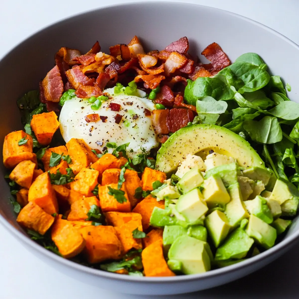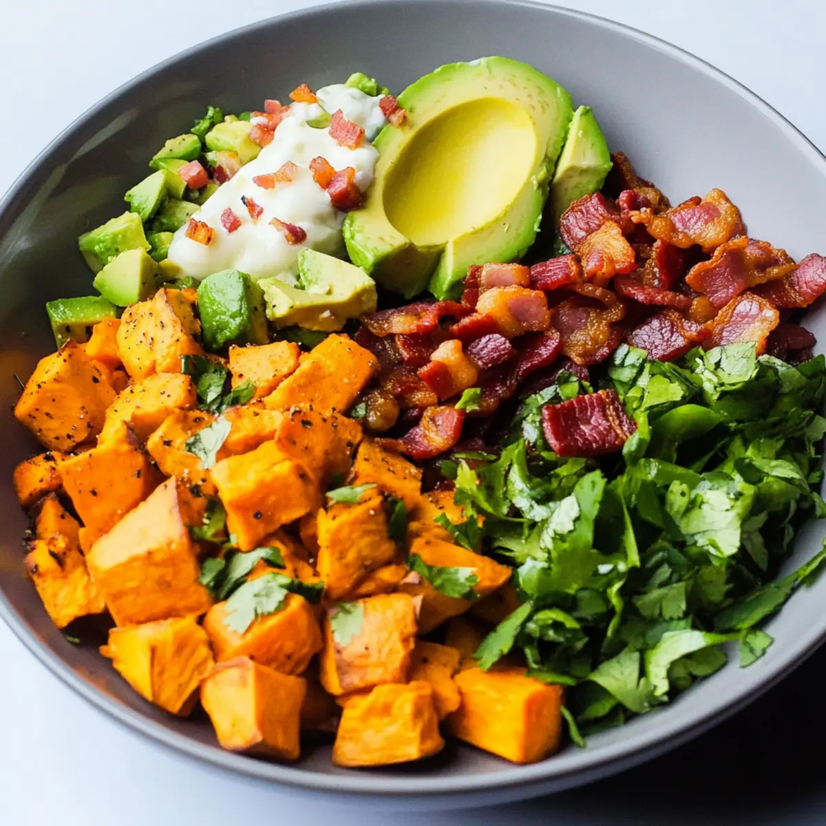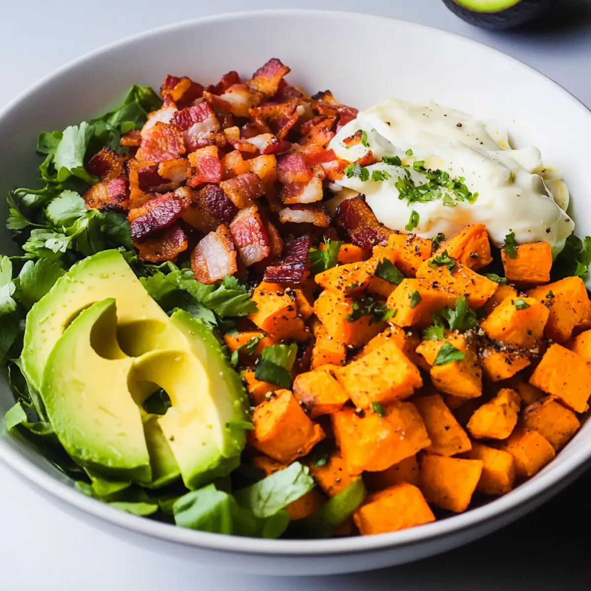 Flavor Explosion: Enjoy the rich combination of crisp bacon, velvety avocado, and sweet potatoes, drizzled with a zesty sauce that brings everything together.