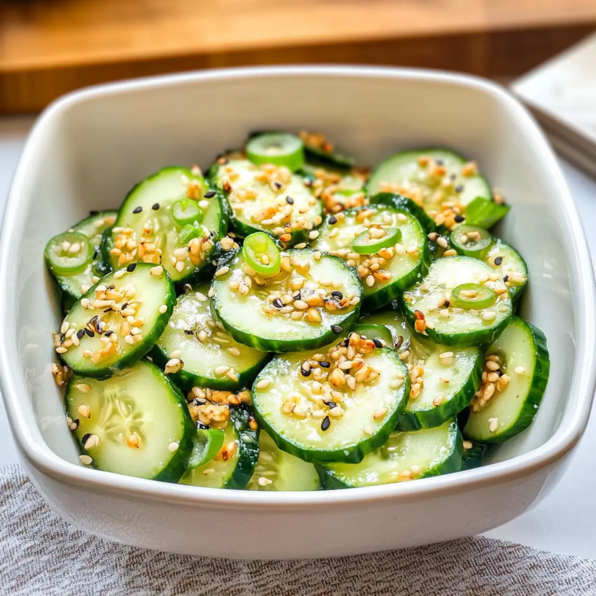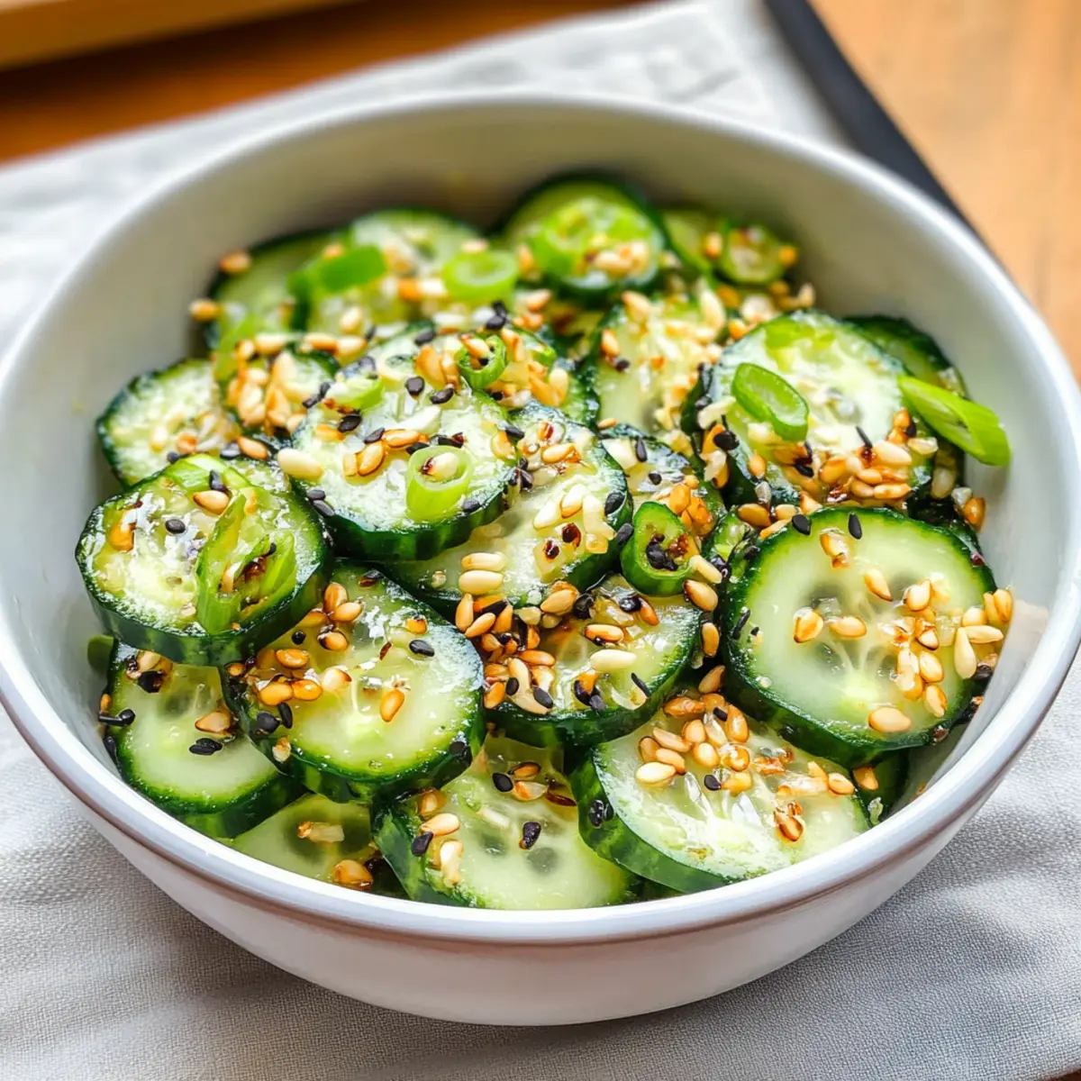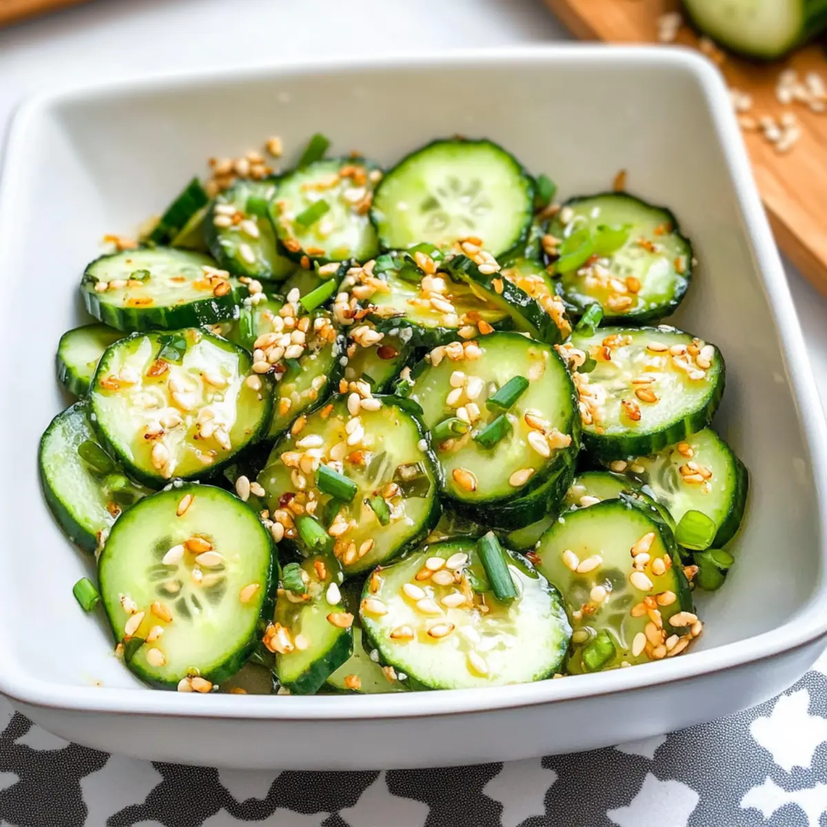 As I poured the vibrant dressing over the crisp cucumbers, I felt a wave of excitement wash over me—it was time to create my go-to Tangy Sesame Cucumber Salad. Perfect for hot summer days or as a refreshing side dish at your next BBQ, this salad is a delightful mix of sweet honey and tangy apple cider vinegar that keeps you coming back for more. Not only is it low in calories, making it a smart choice for clean eating, but the crunchy textures from peanuts and sesame seeds also ensure it’s anything but boring. Whether you’re a seasoned chef or just craving something light and hydrating, this dish will enrich your culinary repertoire. What unique twist will you add to your salad today? Why is Tangy Sesame Cucumber Salad a Must-Try? Bright, Refreshing Flavors: The combination of sweet honey and tangy apple cider vinegar creates a dressing that’s both zesty and invigorating. Crisp and Crunchy: With fresh cucumbers and roasted peanuts, every bite delivers a satisfying crunch that keeps your taste buds excited. Simple Preparation: This salad comes together in just a few minutes, making it perfect for busy weeknights or last-minute BBQs. Versatile Delight: Serve it as a side dish with grilled chicken or toss it on a bed of greens for a light lunch. Low-Calorie Goodness: Ideal for clean eating, this salad is hydrating and packed with nutrients that leave you feeling light and energized. Crowd-Pleasing Appeal: Bring it to your next gathering, and watch as it vanishes from the table—everyone loves this refreshing treat! Consider pairing it with some homemade Cucumber Strawberry Salad or complementing it with a hearty Sesame Chicken Salad for a well-rounded meal. Tangy Sesame Cucumber Salad Ingredients For the Salad • Large English Cucumbers – The main ingredient providing crunch and hydration; remember to leave the peel on for added nutrients. • Green Onions – Adds a mild onion flavor and a fresh crunch; red onions are a great substitution for a sharper taste. • Sesame Seeds – Introduces a nutty flavor and texture; toasted sunflower seeds can be a nice alternative for similar crunchiness. • Raw Peanuts – Provides structure and richness; you can swap in chopped cashews for a different nutty character. For the Dressing • Apple Cider Vinegar – Gives tanginess to the dressing; white wine vinegar can be used if necessary. • Water – Used to slightly dilute the dressing for balance. • Sesame Oil – Adds depth and aromatic quality; use light olive oil if sesame oil is unavailable. • Raw Honey – Offers sweetness to counterbalance the vinegar; maple syrup is an excellent vegan option. • Red Pepper Flakes – Adds just the right touch of heat; adjust the quantity to match your heat preference. • Sea Salt – Enhances the overall flavors of the Tangy Sesame Cucumber Salad. Step‑by‑Step Instructions for Tangy Sesame Cucumber Salad Step 1: Prepare the Dressing In a small bowl, whisk together ¼ cup of apple cider vinegar, 2 tablespoons of water, 2 tablespoons of sesame oil, 1 tablespoon of raw honey, ½ teaspoon of red pepper flakes, and ½ teaspoon of sea salt. Make sure the honey is fully dissolved, creating a smooth, tangy dressing. Once combined, cover the bowl with plastic wrap and refrigerate for at least 10 minutes to let the flavors meld together. Step 2: Slice the Cucumbers While the dressing is chilling, take 2 large English cucumbers and wash them thoroughly. Using a sharp knife, slice the cucumbers thinly—about ¼ inch thick—keeping the peel on for added nutrients and crunch. Place the sliced cucumbers in a large mixing bowl to prepare for the salad assembly, admiring their vibrant green color and crisp texture. Step 3: Add the Crunchy Ingredients Next, finely slice 2 green onions and add them to the bowl with the cucumbers. Then, sprinkle in 2 tablespoons of sesame seeds and ¼ cup of raw peanuts, enhancing the salad with additional crunch and flavor. Toss these ingredients gently with your hands or a spatula, allowing the cucumbers to blend with green onions and nuts beautifully. Step 4: Combine with the Dressing Just before serving your Tangy Sesame Cucumber Salad, pour the chilled dressing over the cucumber mixture. Use a gentle upward folding motion to coat the salad evenly without bruising the cucumbers. The dressing should glisten on the vegetables, creating an inviting appearance, while ensuring each bite is packed with flavor. Step 5: Serve Immediately Transfer the salad to a serving dish or individual bowls, and enjoy it fresh for the best taste and texture. The vibrant colors and delightful crunch make this Tangy Sesame Cucumber Salad a refreshing addition to any meal—perfect for summer BBQs or as a light side dish. Step 6: Store Leftovers (Optional) If you have any leftover salad, place it in an airtight container, making sure there’s minimal air exposure to maintain freshness. While best enjoyed immediately, it can be stored in the refrigerator for up to one day. Just keep in mind that the cucumbers may soften slightly over time. What to Serve with Tangy Sesame Cucumber Salad As you prepare your vibrant and refreshing salad, consider pairing it with other delicious sides to create a delightful meal experience. Grilled Chicken Skewers: These juicy skewers add protein and a slightly charred flavor, complementing the salad’s fresh crunch beautifully. Steamed Jasmine Rice: This soft and fluffy rice serves as a perfect base, absorbing the tangy dressing’s essence while balancing flavors. It’s comforting and enhances the meal’s heartiness. Chilled Sliced Avocado: Creamy avocado offers a rich texture that contrasts deftly with the cucumber’s crunch, making each bite a harmonious experience. Roasted Sweet Potatoes: The natural sweetness of caramelized sweet potatoes pairs perfectly with the tangy salad, bringing a lovely depth of flavor to your plate. Refreshing Mint Lemonade: This cool and zesty beverage is an excellent choice