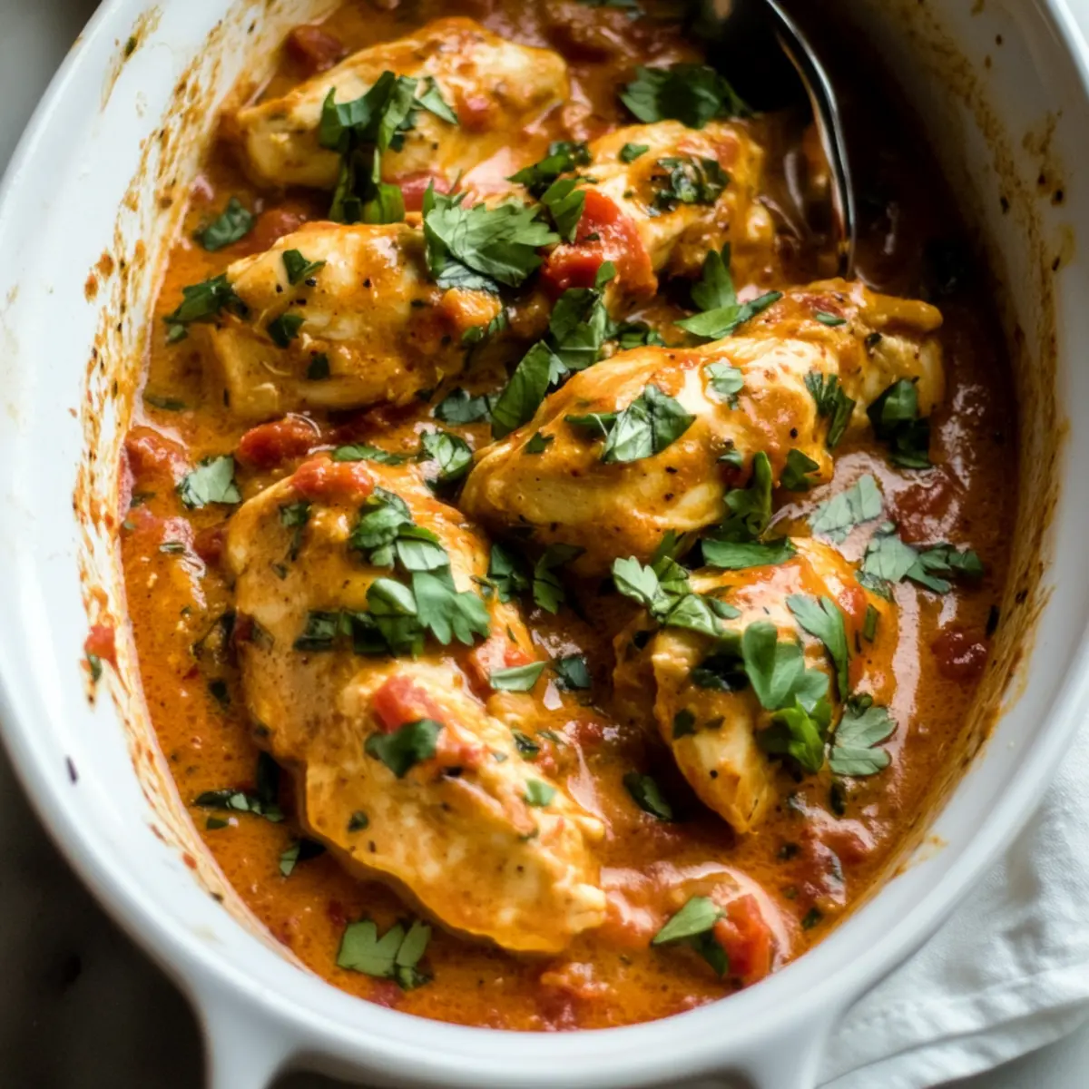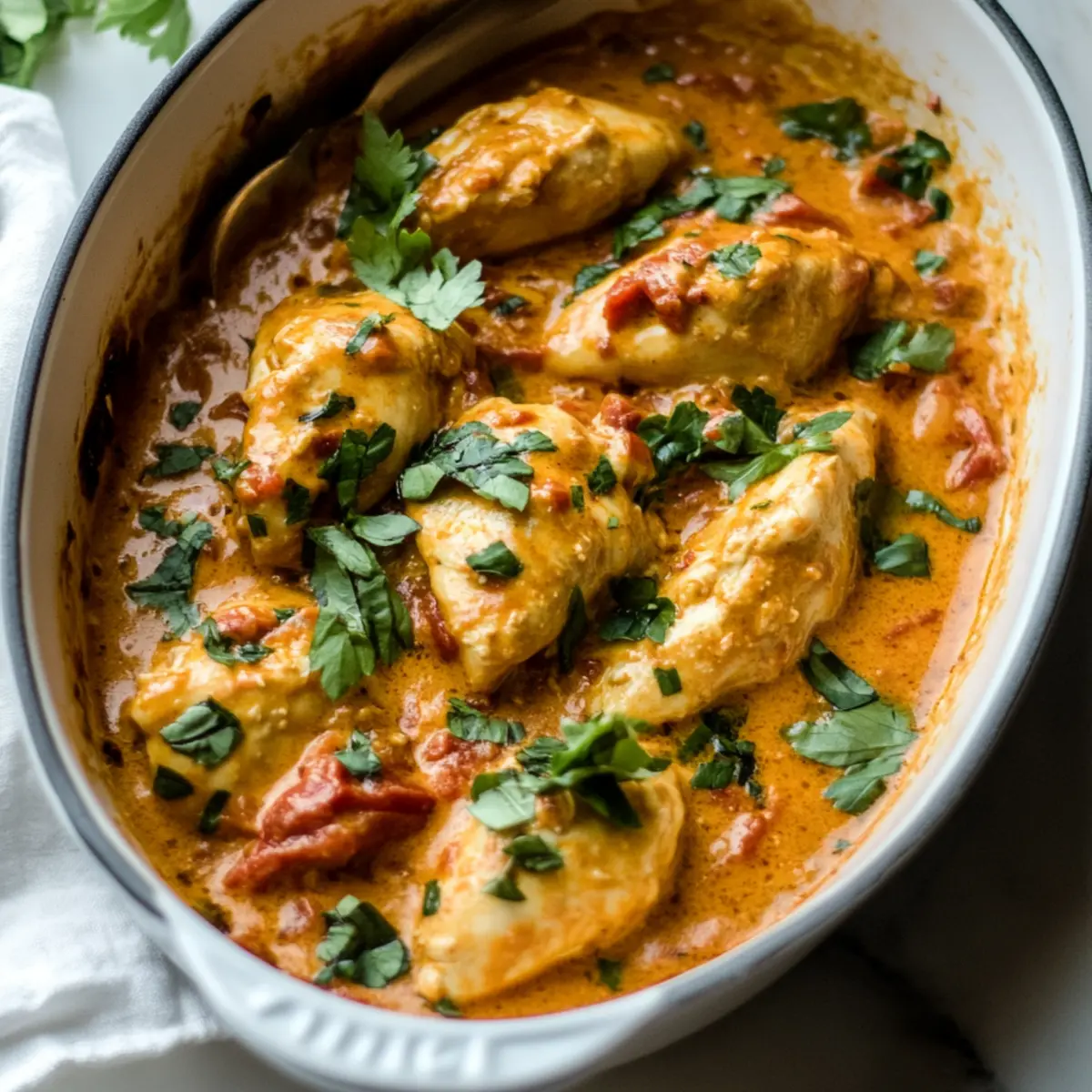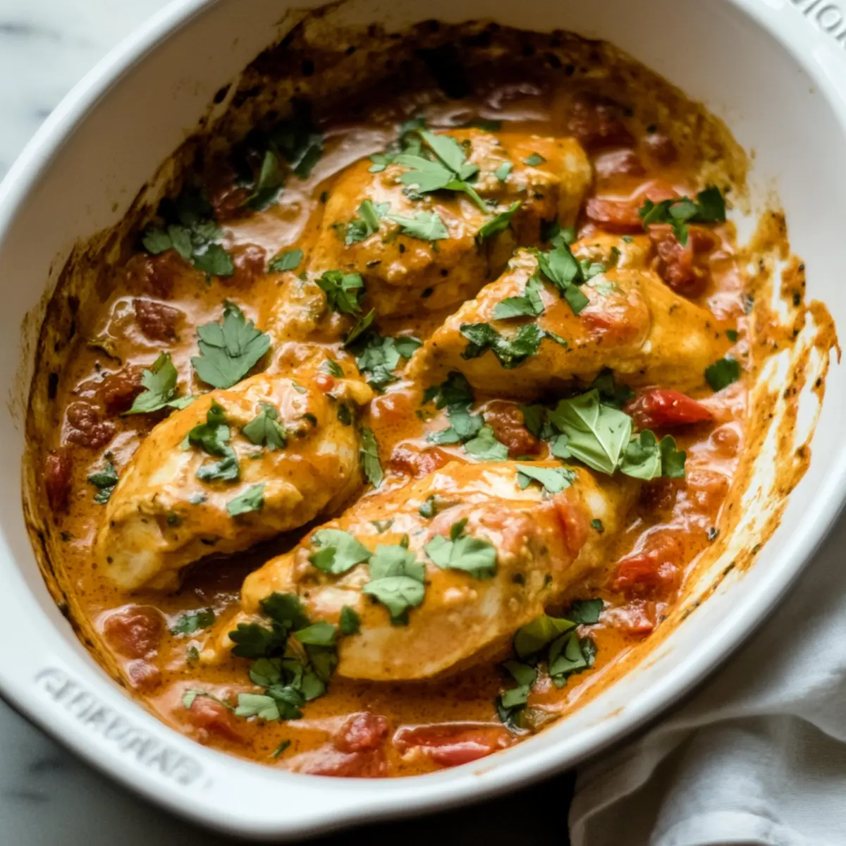 There’s something truly magical about a dish that wraps you in a cozy embrace, and that’s exactly what my Creamy Tomato Chicken delivers. This comforting recipe transforms simple ingredients into a rich, creamy tomato sauce loaded with tender chicken, making it an ideal choice for both busy weeknights and special gatherings. Not only is it quick to throw together, but it’s also endlessly versatile—perfect for pairing with rice, pasta, or even your favorite bread. If you’re on the lookout for a heartwarming meal that can easily adapt to your pantry staples or dietary preferences, this Tomato Chicken will become a staple in your kitchen. Curious about how to elevate your dinner routine with this creamy delight? Let’s dive into the recipe! Why is Tomato Chicken a Must-Try? Comforting and Creamy: This recipe envelops tender chicken in a lavish, creamy tomato sauce, making each bite a warm hug. Quick Prep Time: Ready in just about 30 minutes, it’s perfect for a weeknight dinner. Versatile Ingredients: Easily swap with what you have on hand—think tofu or turkey for protein, or add veggies for extra nutrition! Crowd-Pleasing Flavor: Its rich blend of herbs makes it a hit at any gathering, just like my delightful Buffalo Chicken Tacos. Pantry-Friendly: Utilizing basic, familiar ingredients ensures you can whip this up anytime; no last-minute trips to the store necessary! Tomato Chicken Ingredients • Here’s everything you need to create this creamy delight. For the Chicken Chicken (1 lb) – The star of the dish, providing a hearty base; substitute with chicken thighs for extra juiciness. For the Sauce Tomato Sauce (1/2 cup) – This rich base gives the dish its luscious flavor; opt for gluten-free varieties if needed. Heavy Cream (1/2 cup) – Adds the signature creaminess to the sauce; you can use cashew or oat cream for a dairy-free twist. Dried Oregano (1 tsp) – Elevates the tomato flavor; fresh oregano (2 tsp) can be a vibrant alternative. Dried Basil (1/2 tsp) – Complements the sauce beautifully; if running low, an Italian seasoning blend works wonderfully. For the Aromatics Onion (1, chopped) – Brings sweetness; shallots provide a milder flavor if preferred. Garlic (3 cloves, minced) – Infuses the dish with aromatic richness; use garlic powder if fresh isn’t on hand. For Cooking Olive Oil (2 tbsp) – Perfect for sautéing and adds depth to flavors; any neutral oil can be substituted. Salt & Pepper (to taste) – These staples will enhance the dish, allowing you to adjust according to your flavor preferences. This lineup of ingredients promises a delectable Tomato Chicken dish that feels like a warm blanket on a chilly evening! Step‑by‑Step Instructions for Tomato Chicken Step 1: Heat the Oil Begin by heating 2 tablespoons of olive oil in a large skillet over medium heat. Wait for about 1-2 minutes until the oil shimmers, indicating it’s hot enough for sautéing. This step sets the stage for a delicious Tomato Chicken, as the oil will enhance the flavors of the aromatic ingredients to come. Step 2: Sauté Onion and Garlic Add one chopped onion to the skillet and sauté for about 3-4 minutes until translucent and slightly golden. Stir in 3 minced garlic cloves and cook for an additional 30 seconds until fragrant. The aromatics will fill your kitchen, creating an inviting atmosphere as a flavorful base for your creamy tomato sauce. Step 3: Cook the Chicken Next, introduce 1 pound of chicken pieces into the skillet. Cook for approximately 6-8 minutes, turning occasionally, until each piece is browned and no longer pink in the center. This step ensures the chicken is juicy and tender, absorbing the delicious flavors of the sautéed aromatics before being enveloped in the creamy tomato sauce. Step 4: Add Tomato Sauce and Herbs With the chicken cooked through, stir in ½ cup of tomato sauce along with 1 teaspoon of dried oregano, ½ teaspoon of dried basil, and salt and pepper to taste. Allow the mixture to simmer for 5 minutes, stirring occasionally. This allows the flavors to meld beautifully, creating a rich and aromatic sauce for your Tomato Chicken. Step 5: Incorporate the Cream Reduce the heat to low, and gently mix in ½ cup of heavy cream. Stir well to combine and heat through, taking care not to let it boil. This step transforms your Tomato Chicken into a creamy delight, casting a velvety texture over the chicken and sauce that will surely satisfy your comfort food cravings. Step 6: Serve the Dish Remove the skillet from heat and serve your Tomato Chicken immediately. Pair it with fluffy rice, comforting pasta, or warm naan for a complete meal. Each bite of this creamy tomato sauce and tender chicken offers a deeply satisfying experience, making it a must-try dish for your next dinner. Tomato Chicken Variations & Substitutions Feel free to make this comforting Tomato Chicken your own with these delightful twists and substitutions! Dairy-Free: Replace the heavy cream with cashew or oat cream for a rich yet dairy-free version. This way, everyone can enjoy its creamy goodness without worries! Gluten-Free: Ensure your tomato sauce is gluten-free or make your own using canned tomatoes and spices. It’ll keep the flavors just as vibrant while catering to dietary needs. Protein Swap: Use turkey or even chickpeas for a vegetarian option, providing a lovely flavor while keeping the dish hearty and fulfilling. The chickpeas will create a wonderful texture that pairs beautifully with the creamy sauce. Veggie Boost: Toss in some fresh spinach or bell peppers for added nutrition and color. They’ll not only enhance the dish’s visual appeal but also infuse it with healthy goodness. Herb Medley: Experiment with fresh herbs like basil and parsley instead of dried spices for a fresher flavor profile. Freshness always makes a significant difference! Spice It Up: For a touch of heat, add crushed red pepper flakes or a few dashes of hot sauce. This can turn up the fl