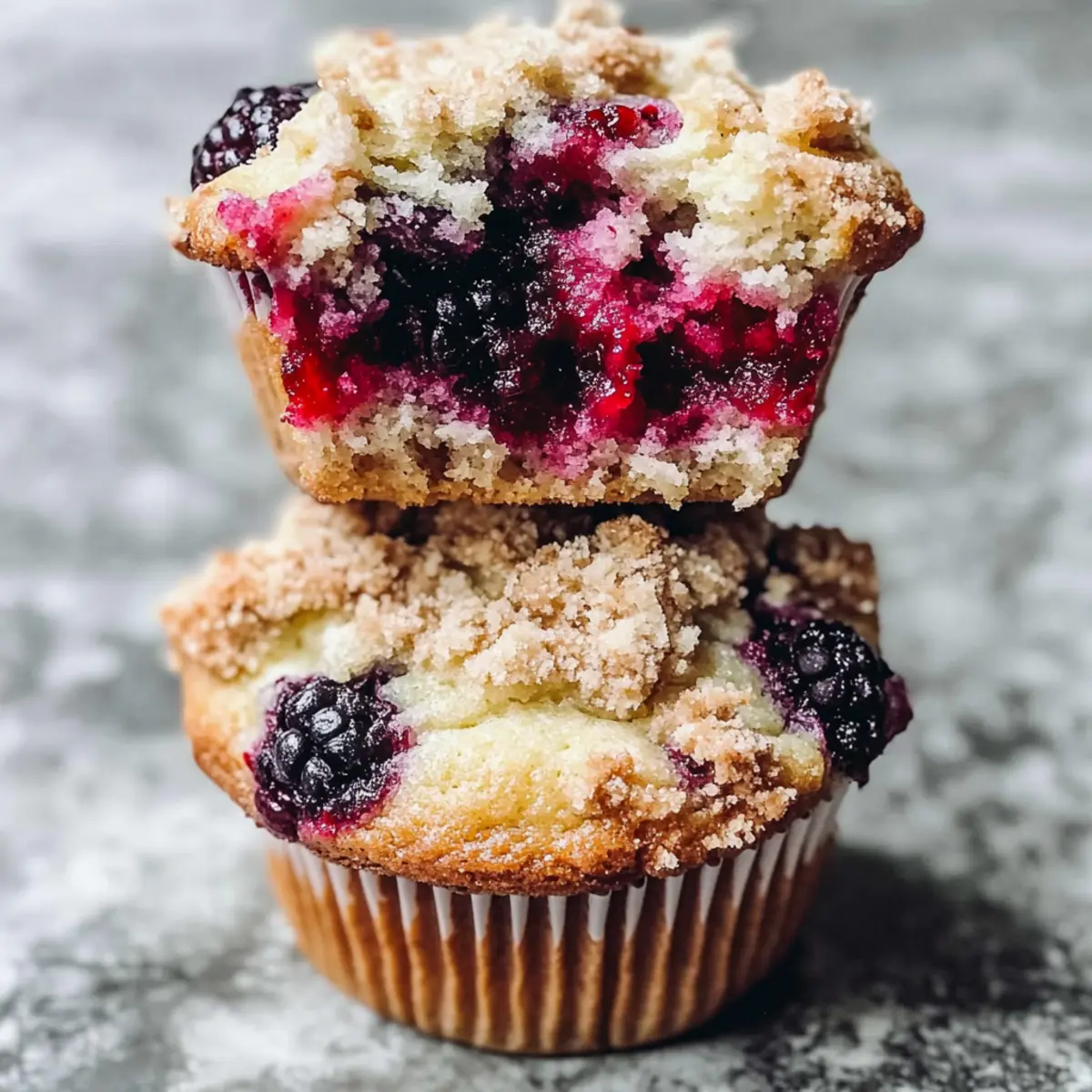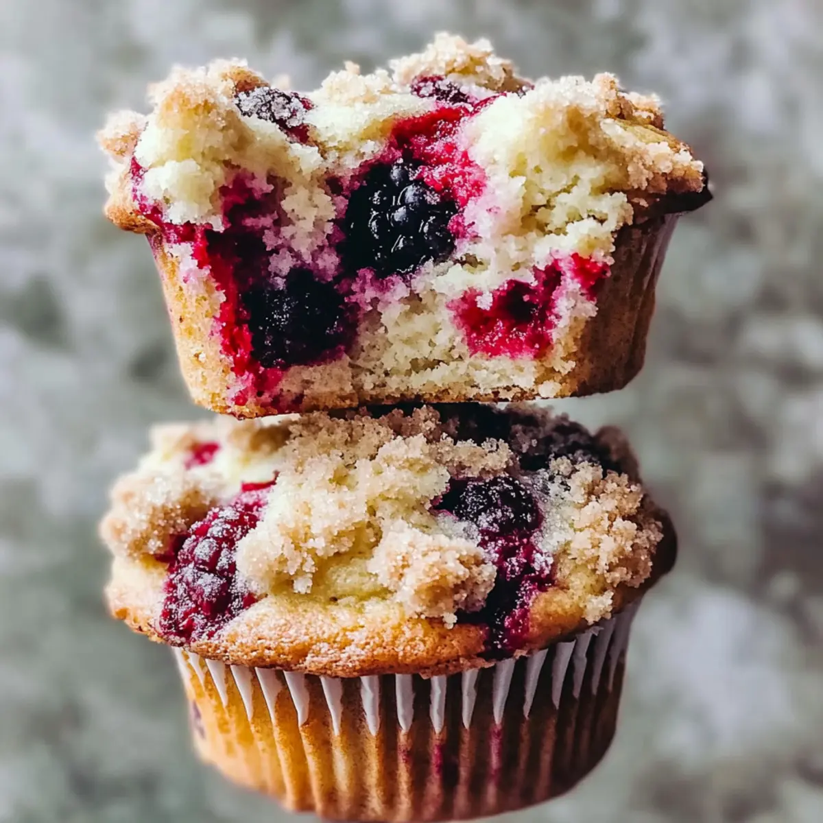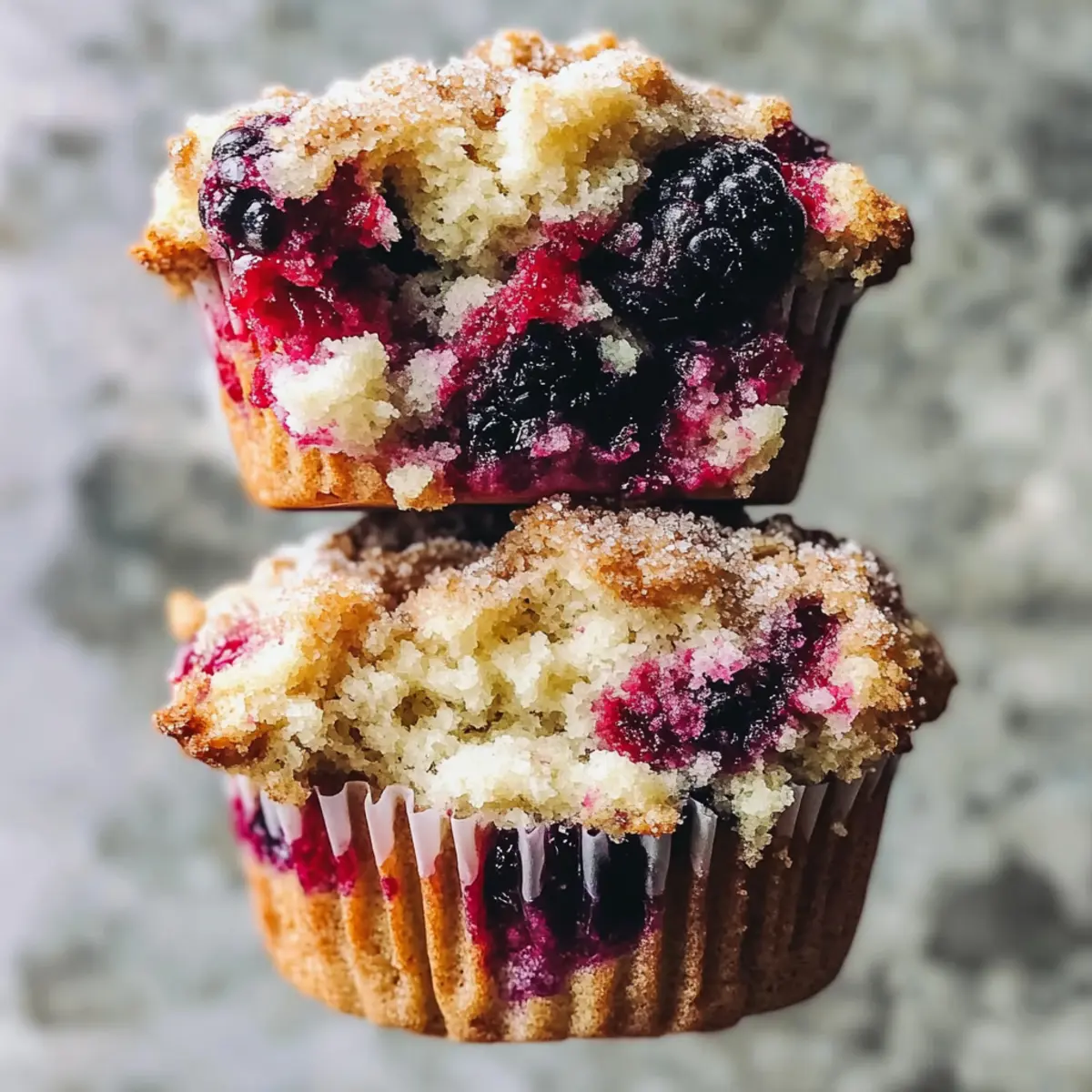 As I opened the oven door, a waft of sweet, berry-infused aroma filled my kitchen, instantly lifting my spirits. There’s something magical about creating Triple Berry Cheesecake Muffins, with their soft, moist texture and creamy cheesecake center topped with a crumbly streusel. These muffins are a delightful fusion of breakfast and dessert—perfect for those mornings when you crave something special or a sweet treat to share with friends. In just 40 minutes, you can savor the perfect balance of juicy berries and rich cheesecake, making them a quick yet indulgent option. Plus, they’re easily adaptable to be dairy-free with a few simple substitutions! Who wouldn’t want to enjoy a warm muffin with a hint of creaminess any time of the day? Are you ready to whip up a batch that’ll impress everyone at the breakfast table? Why are these muffins a must-try? Unforgettable Flavor: The incredible combination of sweet mixed berries and rich cheesecake creates a mouthwatering taste explosion in every bite. Quick to Make: Whip these up in just 40 minutes, making them an ideal option for busy mornings or surprise guests. Versatile Recipe: Easily transform them into a dairy-free delight by swapping out a few ingredients—perfect for any dietary preference. Enticing Aroma: The delightful scent wafting from the oven will make your kitchen feel like a cozy café, inviting everyone to indulge. Timeless Appeal: These muffins are a fusion of breakfast and dessert, perfect for satisfying sweet cravings any time of the day, reminiscent of a classic treat, like a Mixed Berry Crumble. Triple Berry Cheesecake Muffin Ingredients Here’s everything you need to get started on your delicious Triple Berry Cheesecake Muffins! For the Streusel • Butter – Provides richness and a crisp topping; use dairy-free alternatives for a vegan version. • Brown Sugar – Adds sweetness and moisture, enhancing the streusel texture. • All-Purpose Flour – Provides structure for the streusel; gluten-free alternatives may be used. • Pinch of Salt – Enhances flavor by balancing sweetness. For the Cheesecake Layer • Cream Cheese – Creates a rich and creamy center; substitute with dairy-free cream cheese for a vegan option. • Egg Yolk – Adds richness and helps bind the cheesecake filling. • Granulated Sugar – Sweetens the cheesecake layer. For the Muffin Batter • Softened Butter – Contributes to the muffin’s moisture and flavor; dairy-free options work well too. • Eggs – Essential for leavening and binding the muffin batter. • Plain Yogurt – Adds moisture and tang; substitute with plant-based yogurt for dairy-free variant. • Vanilla Extract – Enhances overall flavor. • All-Purpose Flour – Main structure for the muffins; gluten-free flour can be substituted if needed. • Baking Soda & Baking Powder – Leavening agents to help the muffins rise. • Salt – Enhances flavor. • Heaping Cup Frozen Mixed Berries – Provides bursts of flavor and texture; do not thaw before use to prevent excess moisture. Gather these ingredients, and get ready to impress your friends and family with your homemade Triple Berry Cheesecake Muffins! Step‑by‑Step Instructions for Triple Berry Cheesecake Muffins Step 1: Prepare Streusel In a medium bowl, combine softened butter, brown sugar, all-purpose flour, and a pinch of salt. Use a fork or pastry cutter to mix until the mixture resembles pebble-like clumps. Set aside the streusel mixture while you prepare the other components for the Triple Berry Cheesecake Muffins. Step 2: Make Cheesecake Layer In a separate bowl, beat the cream cheese until smooth and creamy, about 1-2 minutes. Then, add the egg yolk and granulated sugar, mixing until well combined and fluffy. The cheesecake filling should be rich and spreadable, perfect for adding a delightful twist to your muffins. Step 3: Preheat Oven Preheat your oven to 425°F (220°C). This initial high temperature will help create a nice dome on your muffins. Prepare a muffin tin by lining it with paper liners or greasing it with non-stick spray to ensure your Triple Berry Cheesecake Muffins come out easily after baking. Step 4: Prepare Muffin Batter In a large mixing bowl, cream softened butter with granulated and brown sugars until the mixture is light and fluffy, approximately 3 minutes. Add in the eggs, plain yogurt, and vanilla extract, mixing until just combined. The batter should be smooth and well-blended, creating the perfect base for your muffins. Step 5: Combine Dry Ingredients In another bowl, whisk together the all-purpose flour, baking soda, baking powder, and salt. Gradually fold this dry mixture into the wet ingredients in your large mixing bowl, stirring gently until just combined. Be careful not to overmix; a few lumps are perfectly fine for your Triple Berry Cheesecake Muffins. Step 6: Fold in Berries Retrieve your frozen mixed berries and add them directly to the batter. Gently fold the berries into the mixture with a spatula, ensuring even distribution without breaking them apart. The frozen berries will maintain their shape and provide delicious bursts of flavor in each muffin. Step 7: Assemble Muffins Line your prepared muffin tin with the batter by filling each cup about 1-2 tablespoons high. Add a spoonful of the cheesecake mixture on top, followed by another layer of muffin batter to cover the cheesecake. Finally, sprinkle the prepared streusel on top of each muffin to create a lovely crunchy topping. Step 8: Bake Place the muffin tin in the preheated oven at 425°F for the first 5 minutes. Then reduce the temperature to 350°F (175°C) and continue baking for an additional 15-18 minutes. The muffins are done when they turn golden brown and a toothpick inserted in the center comes out clean—this indicates a perfectly baked Triple Berry Cheesecake Muffin. What to Serve with Triple Berry Cheesecake Muffins Imagine enjoying these scrumptious muffins alongside delightful pairings tha